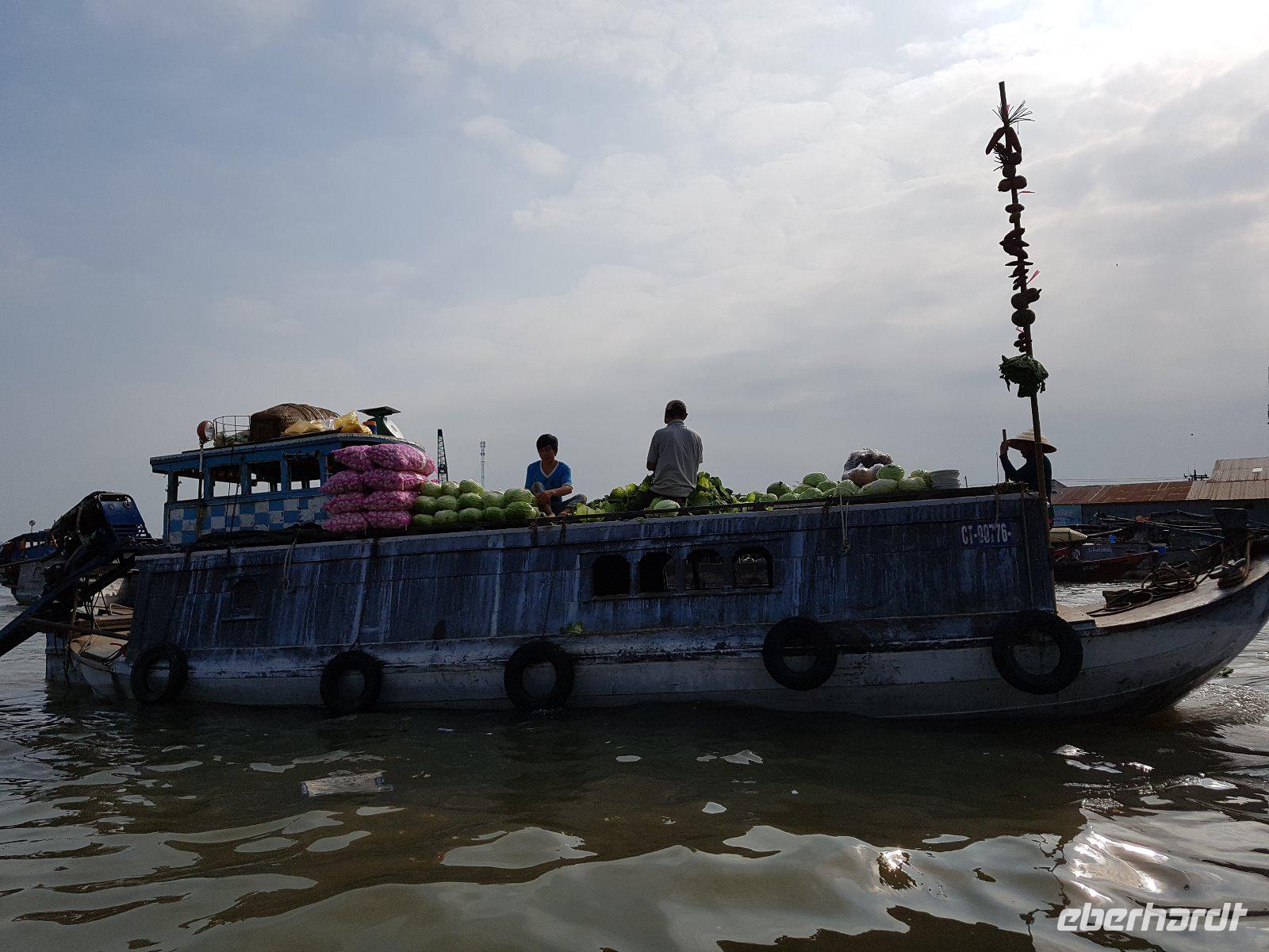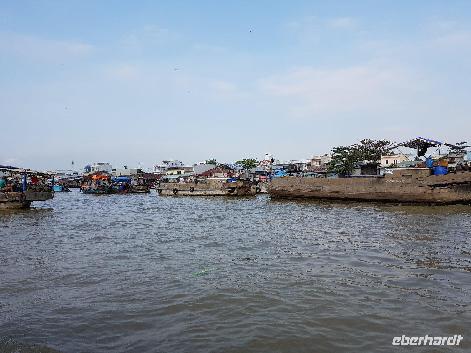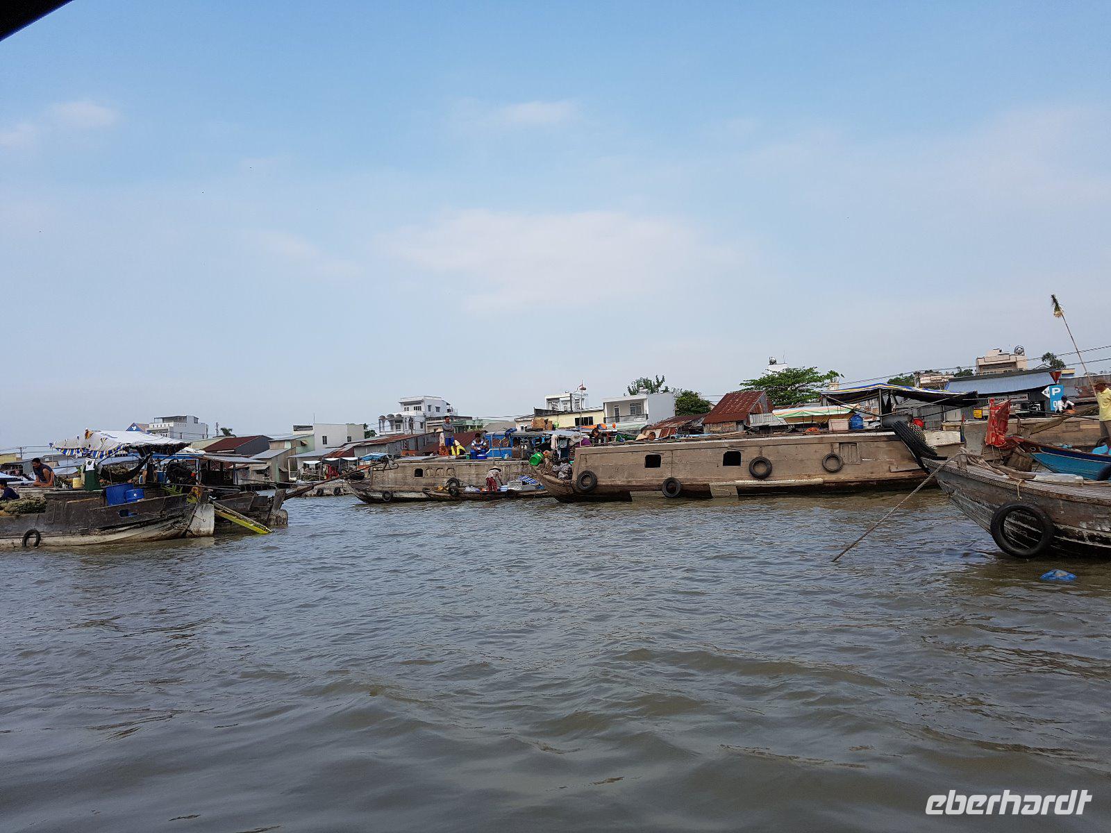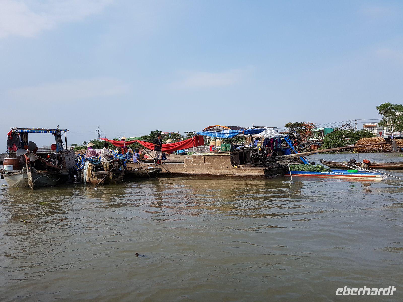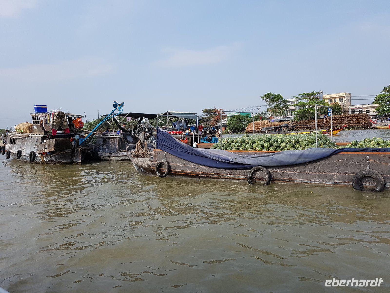 Nach dem Frühstück check out und wir steigen wieder auf das Boot und erleben auf die Faszination der Schwimmenden Märkte. Der Markt von Cai Rang ist der größte seiner Art. Reges Treiben auf dem Wasser und dichtes Gewusel von kleinen Booten bis zu großen Schiffen, die alle voll beladen mit den unterschiedlichsten Lebensmitteln sind. Berge an Obst, Gemüse und Fleisch transportieren die Händler auf ihren Holzbooten. Auch wandelnde Heiß-Küchen gibt es hier und dort auf dem Wasser, selbst die Haare kann man sich hier schneiden lassen - eine herrliche Szenerie!