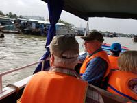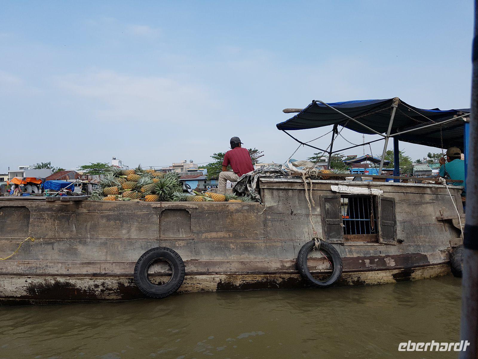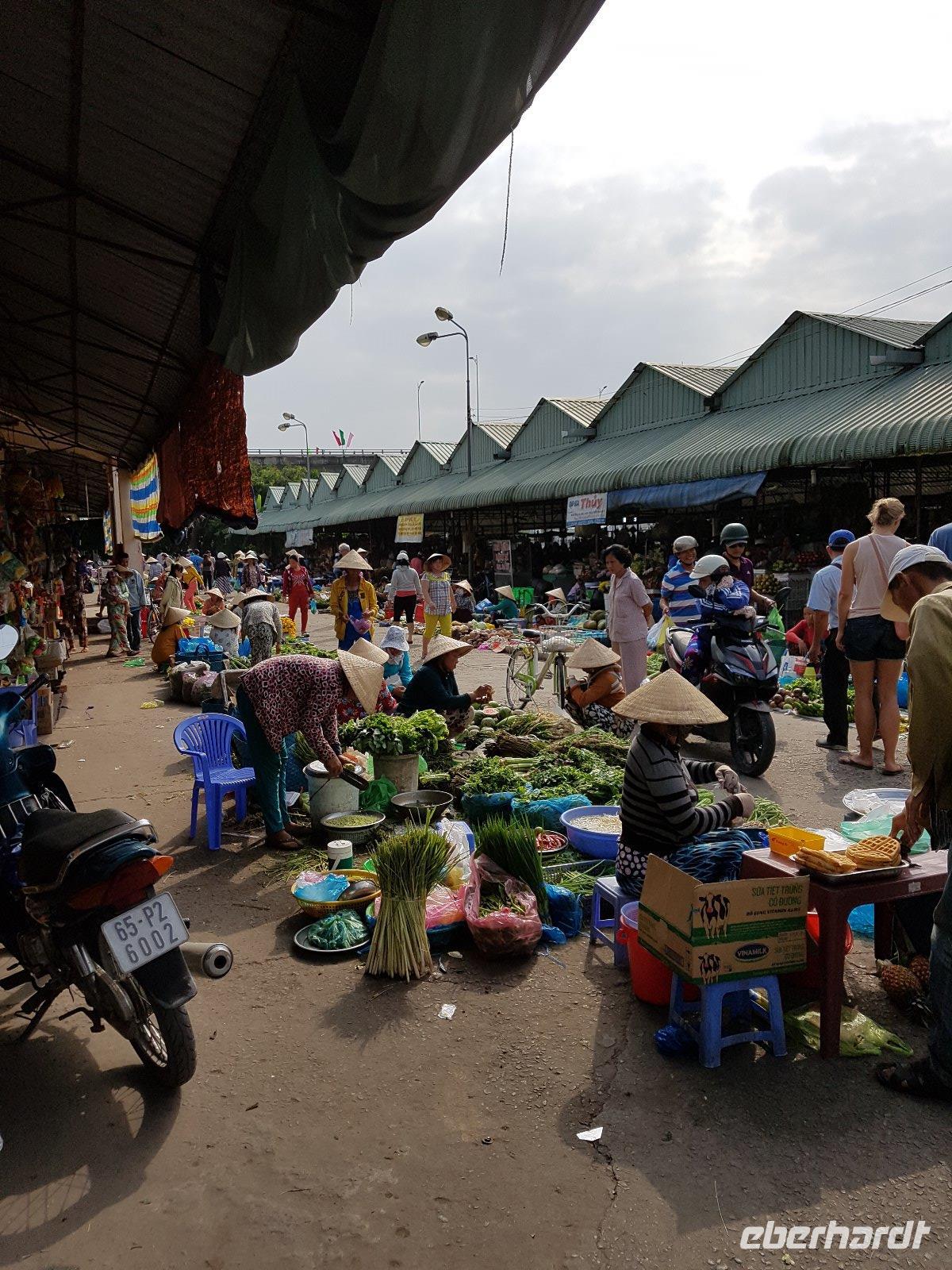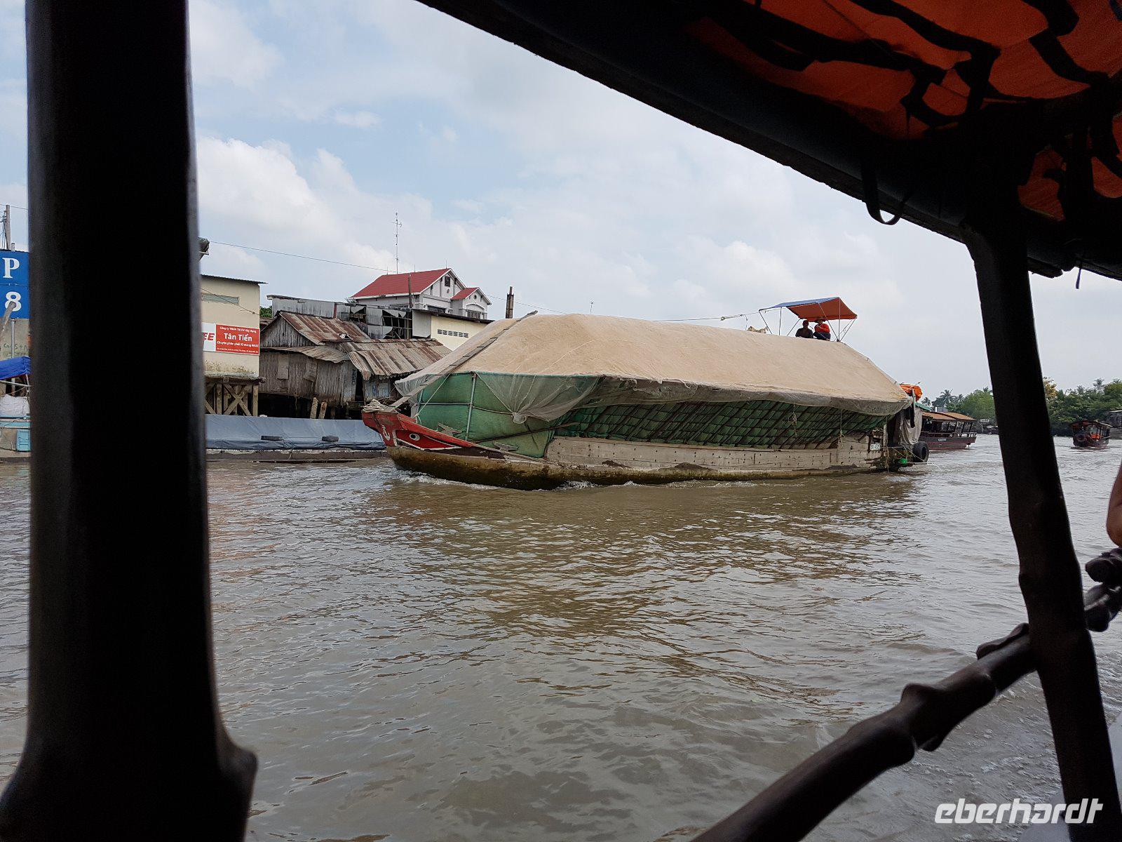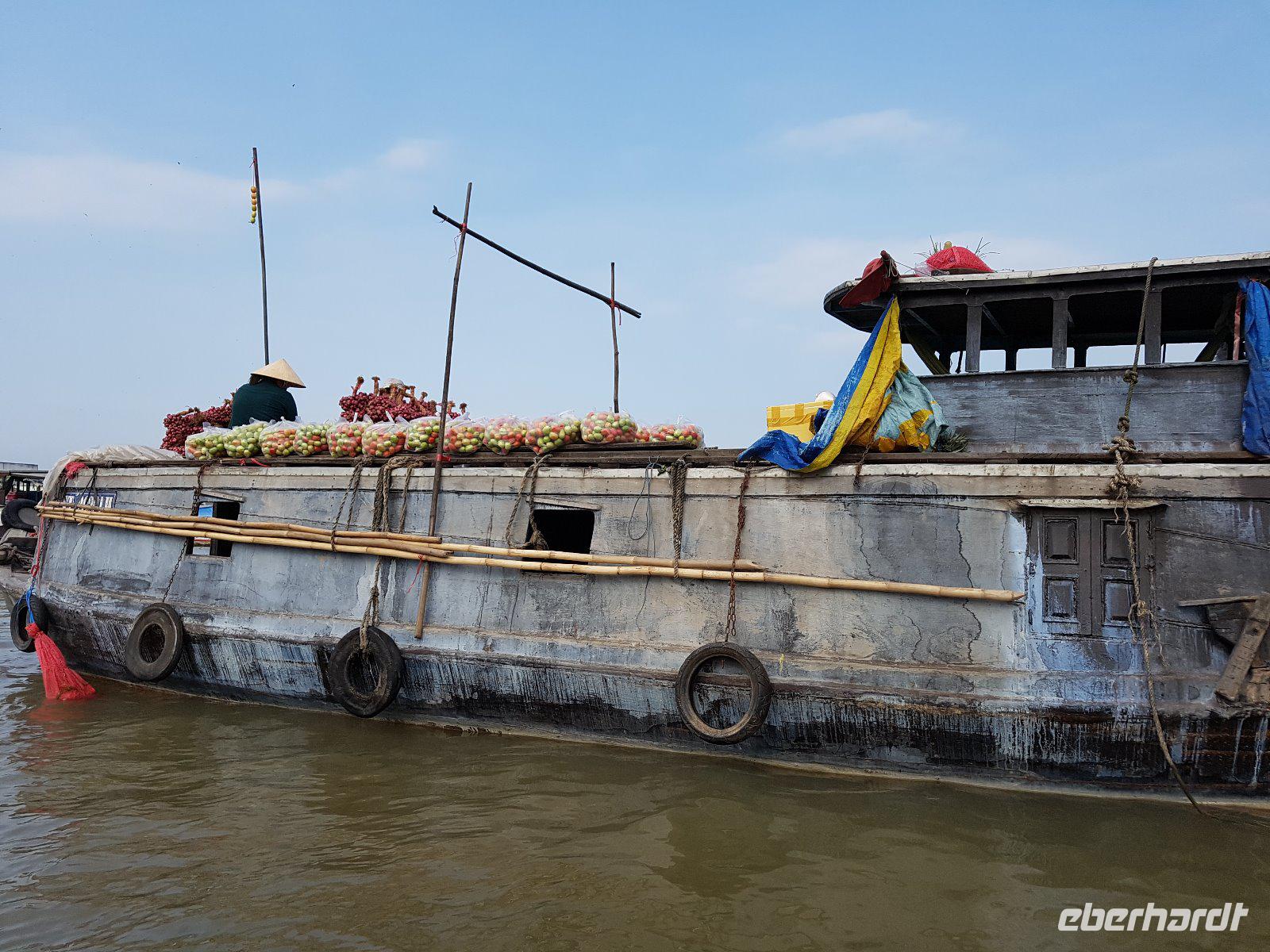 Nach dem Frühstück check out und wir steigen wieder auf das Boot und erleben auf die Faszination der Schwimmenden Märkte. Der Markt von Cai Rang ist der größte seiner Art. Reges Treiben auf dem Wasser und dichtes Gewusel von kleinen Booten bis zu großen Schiffen, die alle voll beladen mit den unterschiedlichsten Lebensmitteln sind. Berge an Obst, Gemüse und Fleisch transportieren die Händler auf ihren Holzbooten. Auch wandelnde Heiß-Küchen gibt es hier und dort auf dem Wasser, selbst die Haare kann man sich hier schneiden lassen - eine herrliche Szenerie!