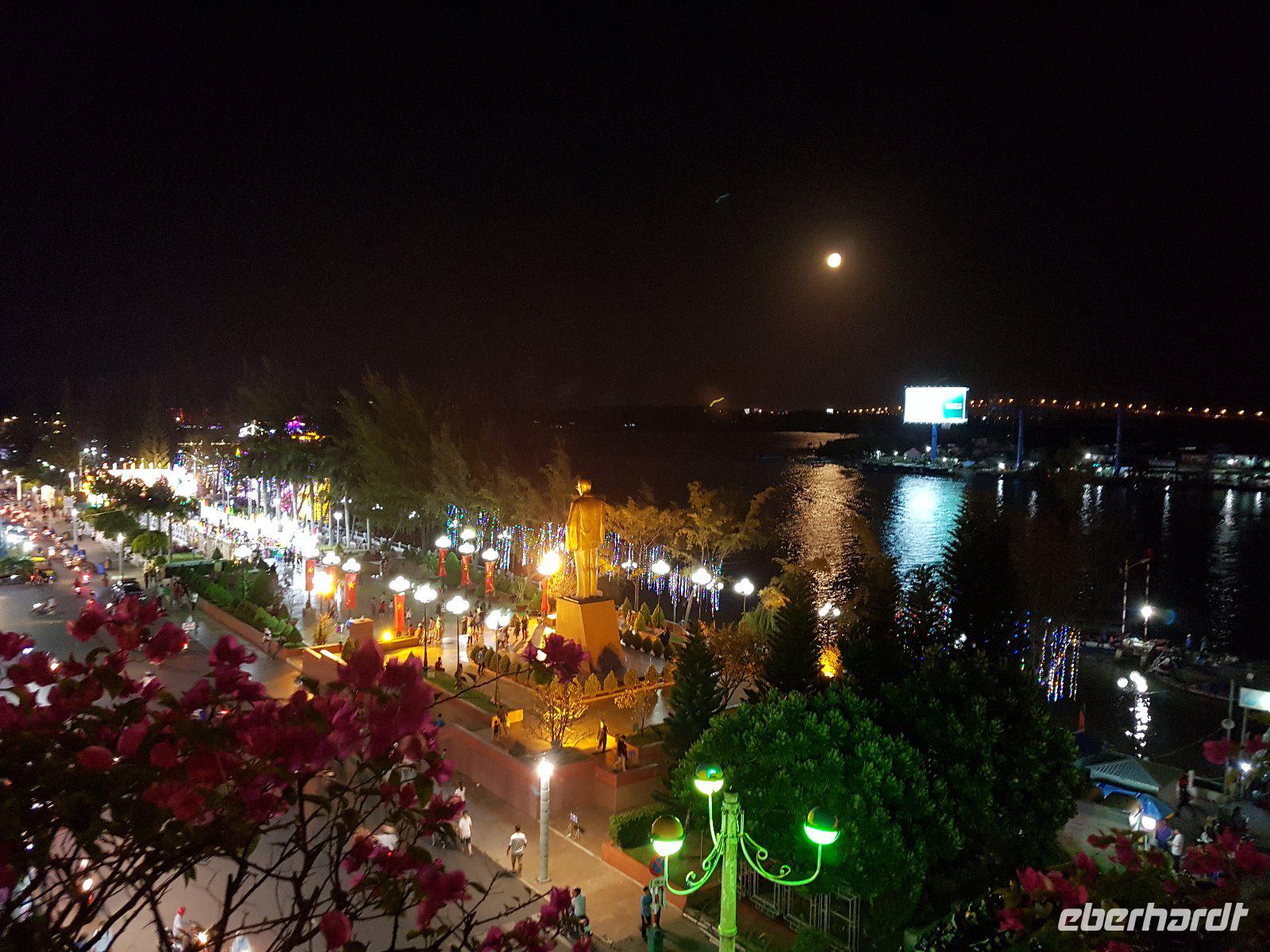 Vom Ninh Ki?u 2 Hotel sind es am Abend dann nur wenige Gehminuten zum L'Escale Restaurant. Schon im Vorfeld der Reise reservierte Eberhardt Travel hier einen der wenigen und entsprechend beliebten Tische auf der Dachterrasse. So erwartet uns nicht nur ein wiederum hervorragendes Essen sondern auch ein schöner Blick über den mächtigen Fluss und die lebhafte Uferpromenade.
