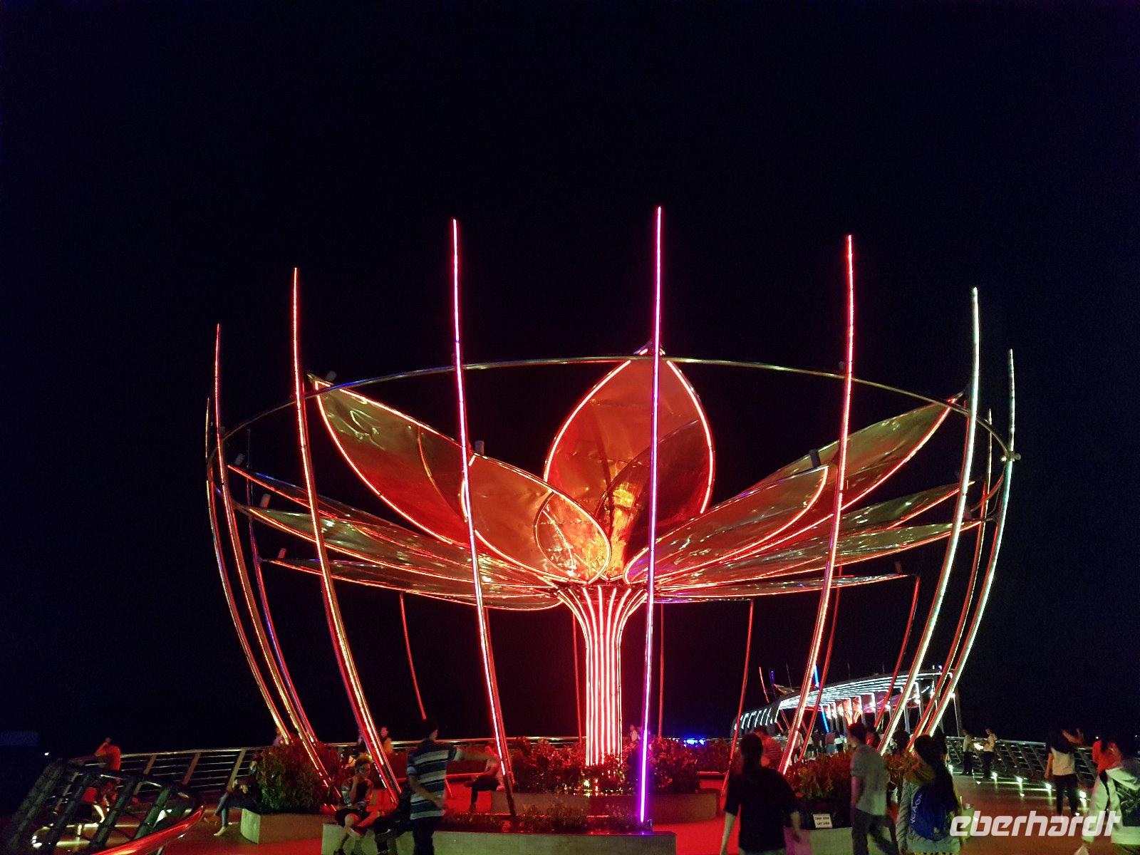 Vorbei am gigantischen Ho Chi Minh Denkmal zur imposanten, von großen illuminierten Lotusskulpturen verzierten Fußgängerbrücke hin.
