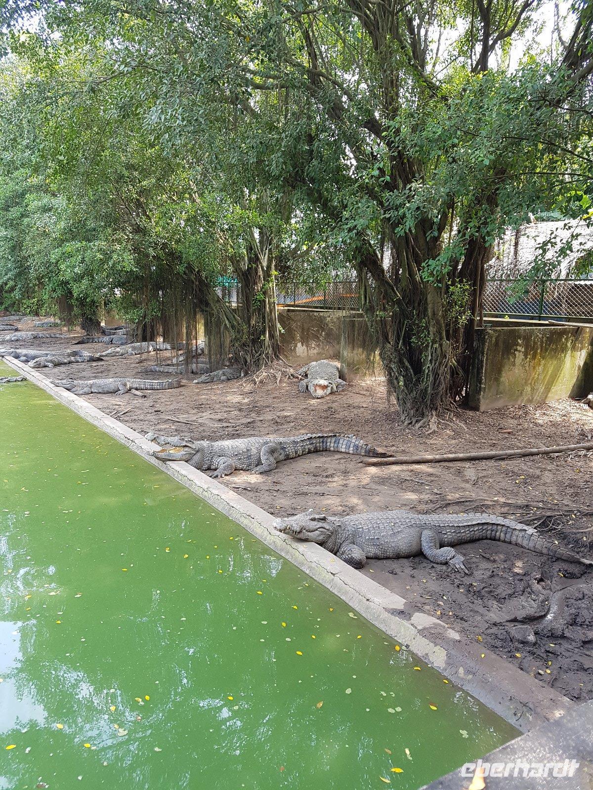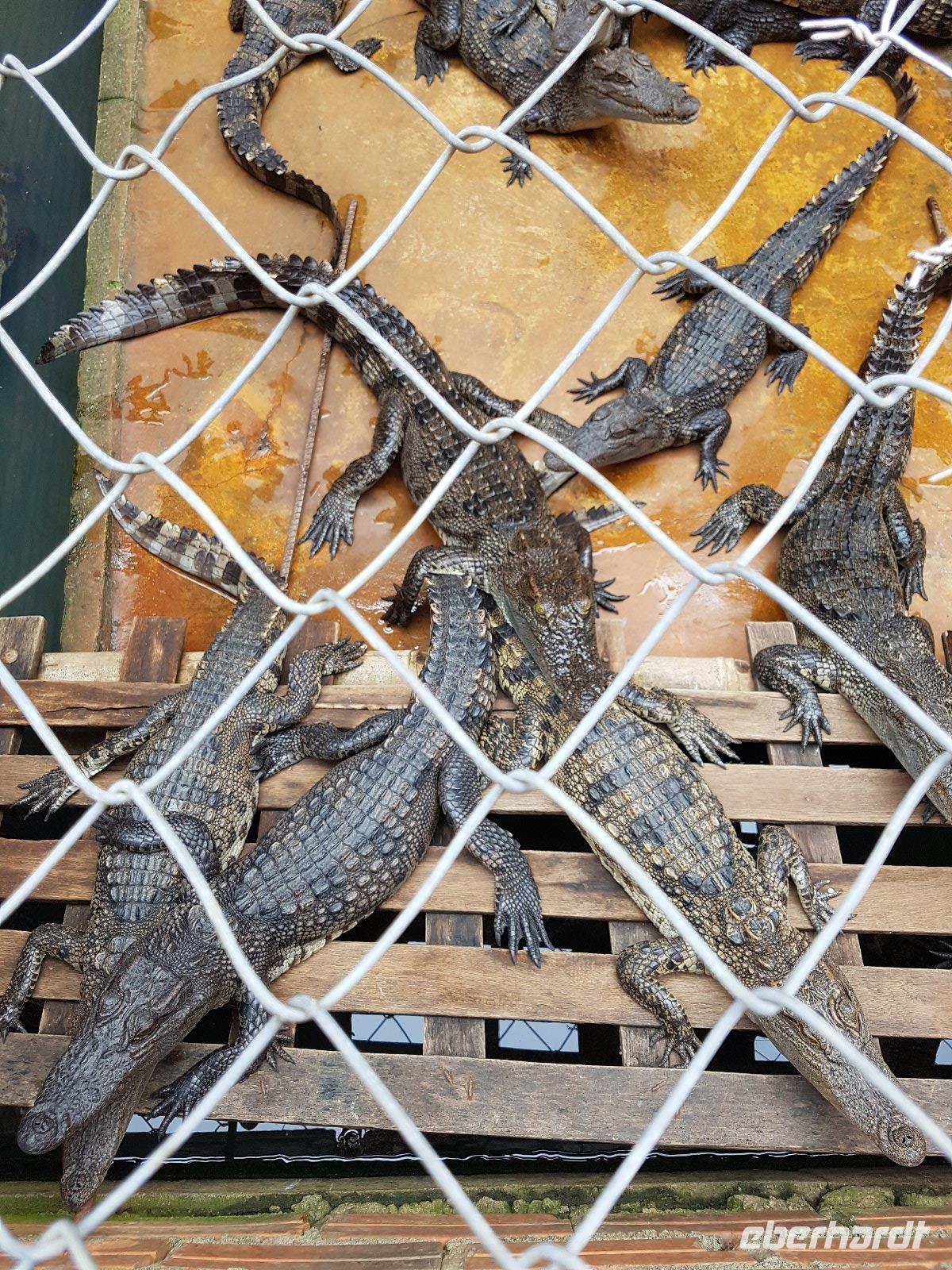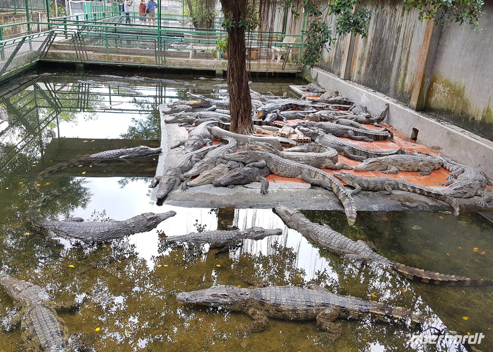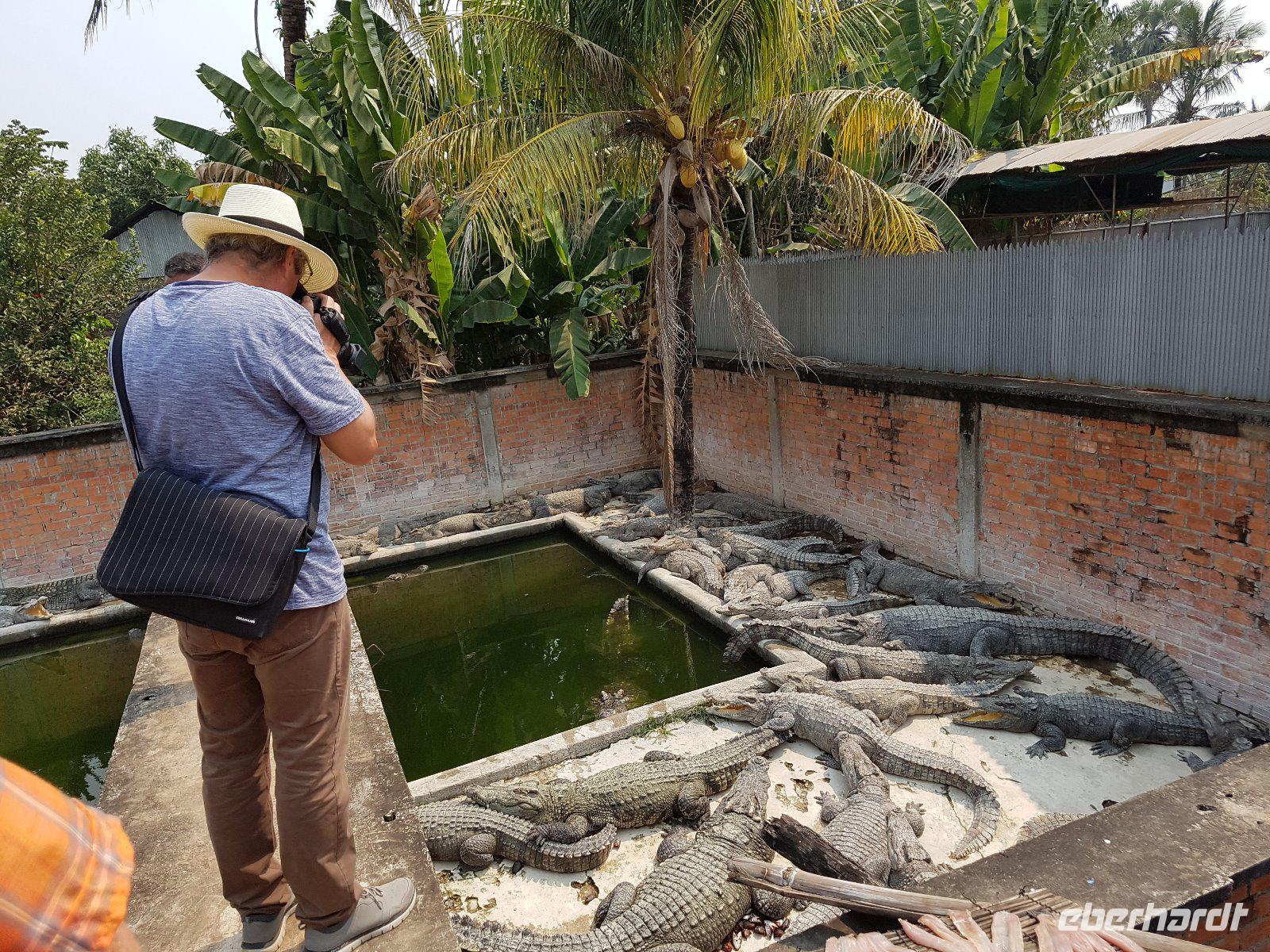 In Long Xuyen pausieren wir um eine Krokodilfarm zu besichtigen. Nach dem kurzen Rundgang meldet sich dann auch der mittägliche Appetit, den wir dann mit Gerichten aus Krokodilfleisch stillen; interessante kulinarische Erfahrung: „schmeckt nach Huhn", „nein eher wie Kalb", - oder eben nach Krokodil.