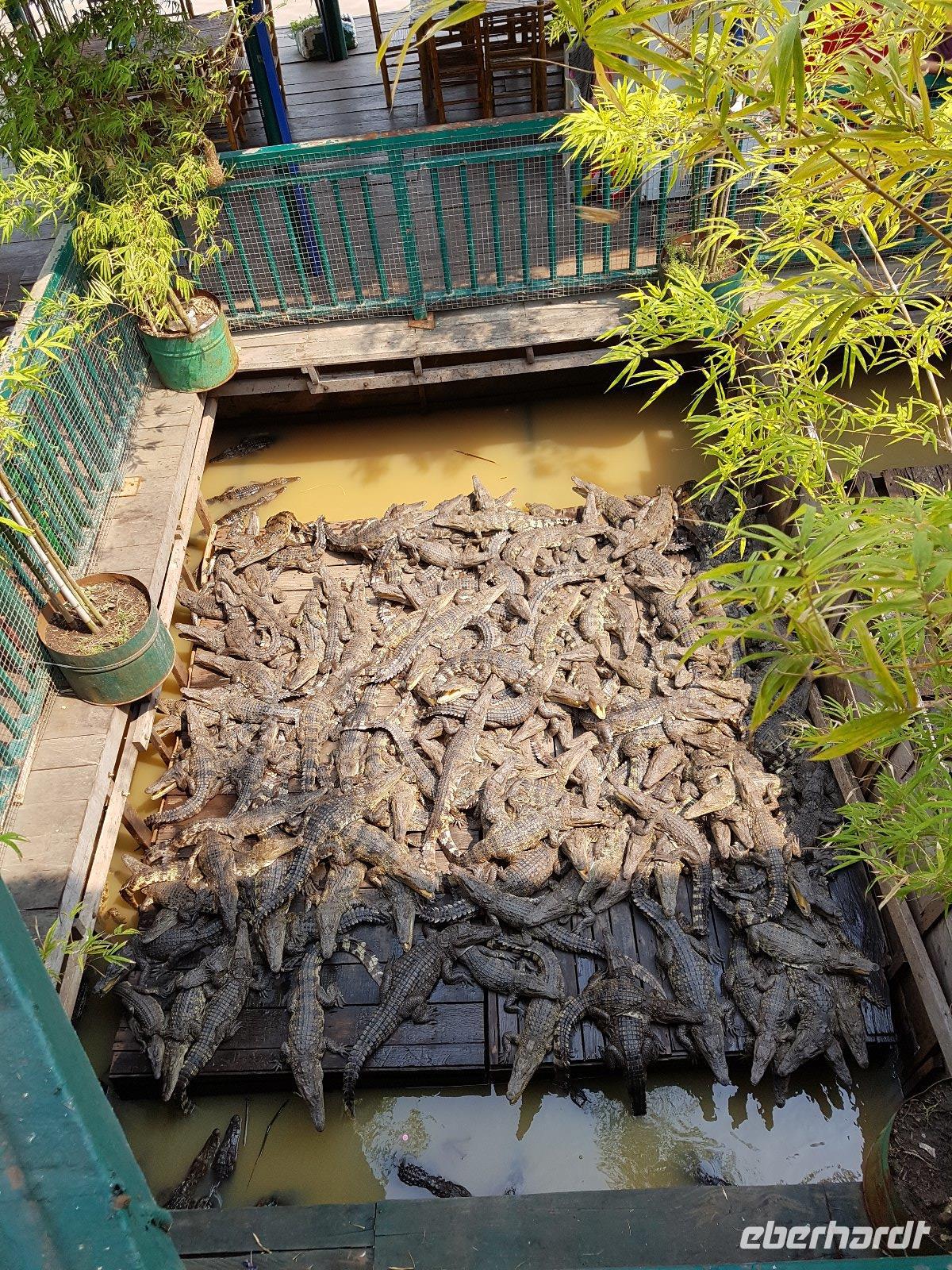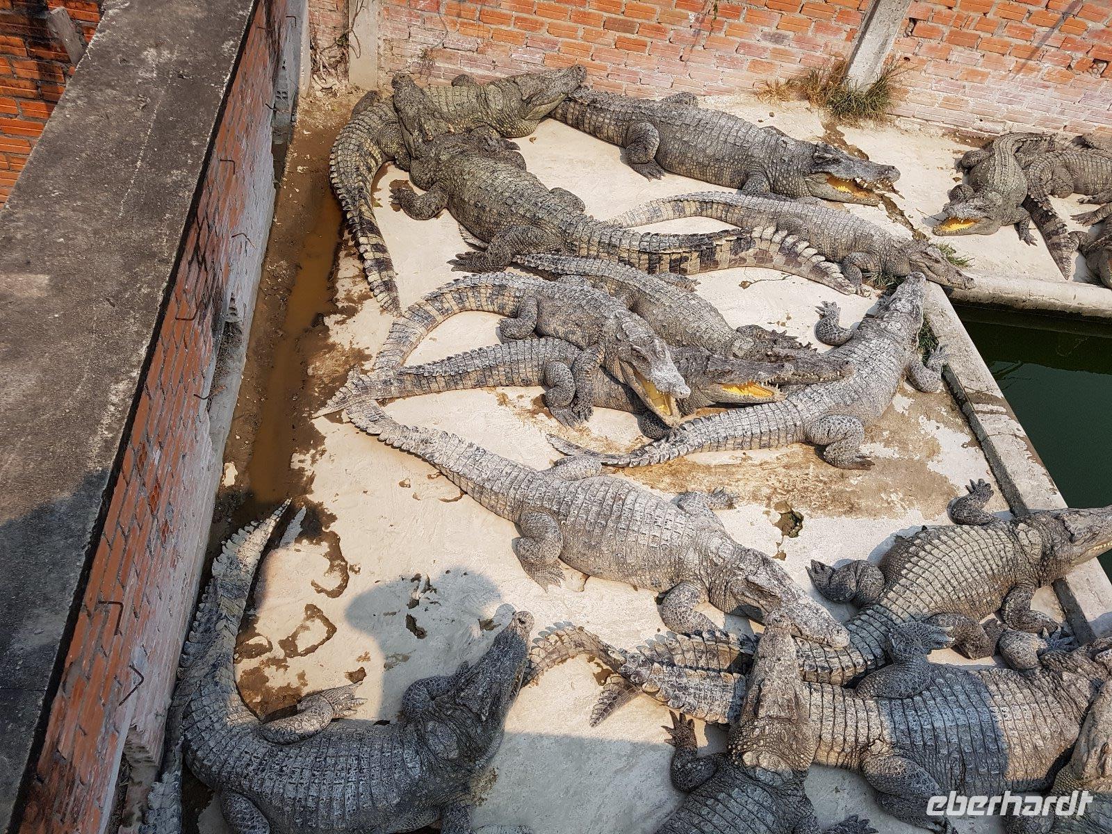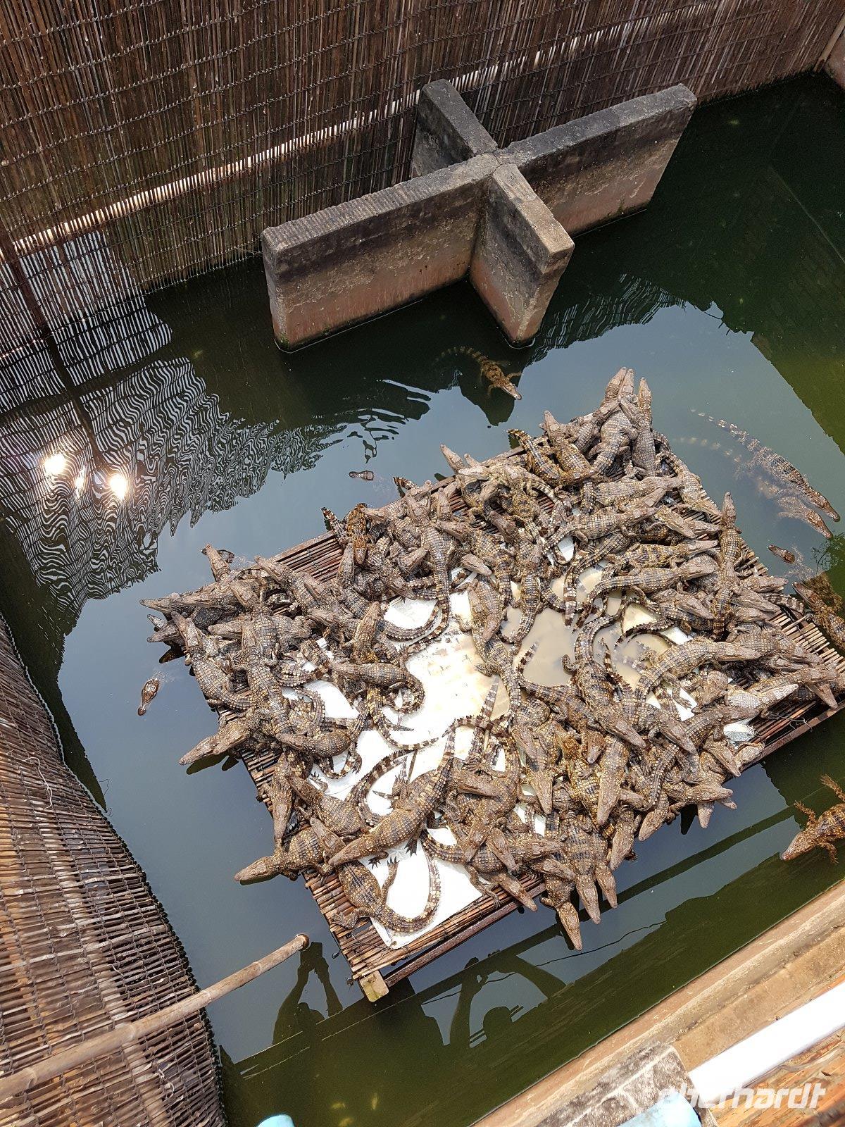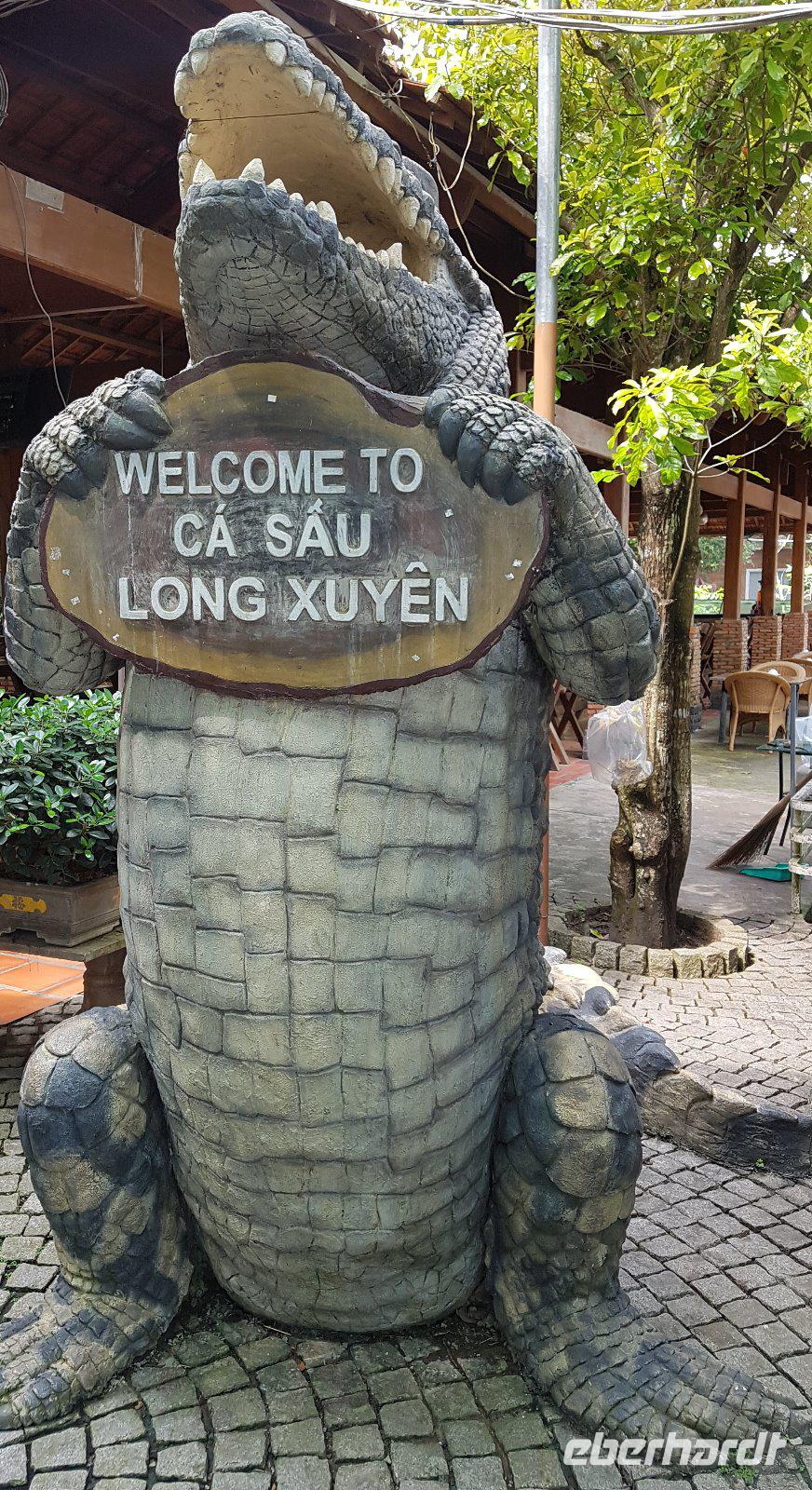 In Long Xuyen pausieren wir um eine Krokodilfarm zu besichtigen. Nach dem kurzen Rundgang meldet sich dann auch der mittägliche Appetit, den wir dann mit Gerichten aus Krokodilfleisch stillen; interessante kulinarische Erfahrung: „schmeckt nach Huhn", „nein eher wie Kalb", - oder eben nach Krokodil.