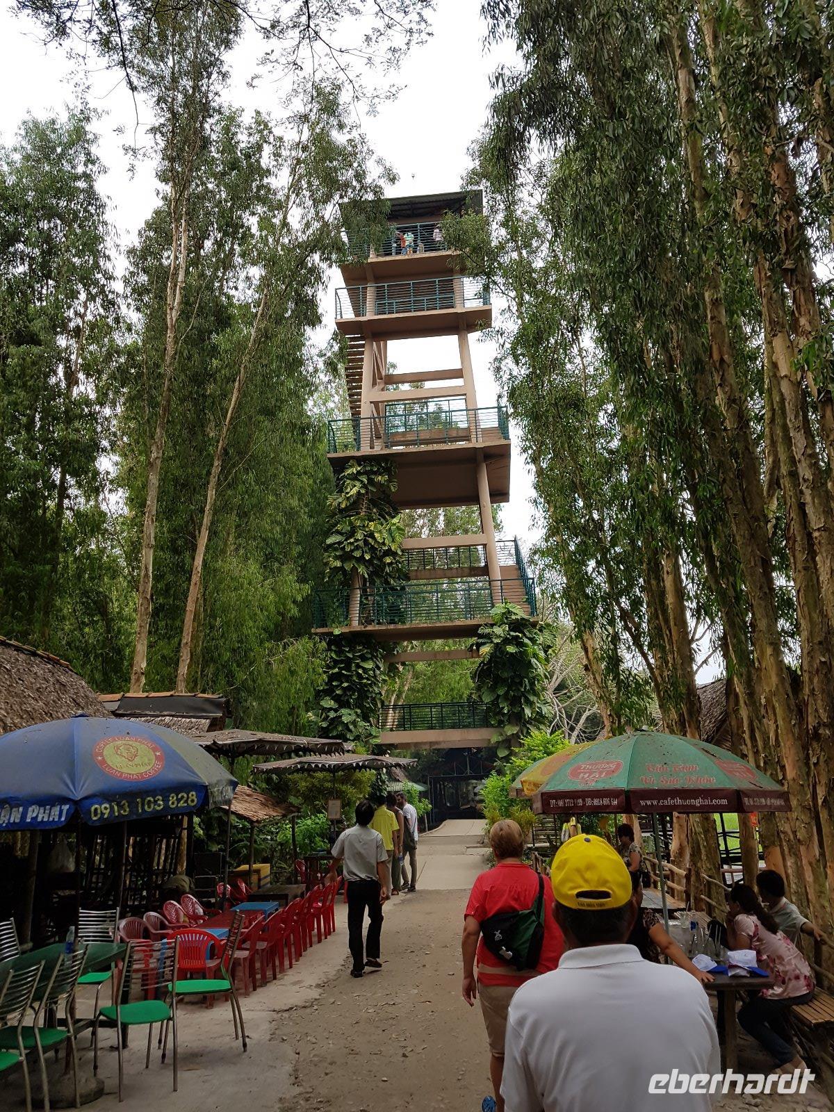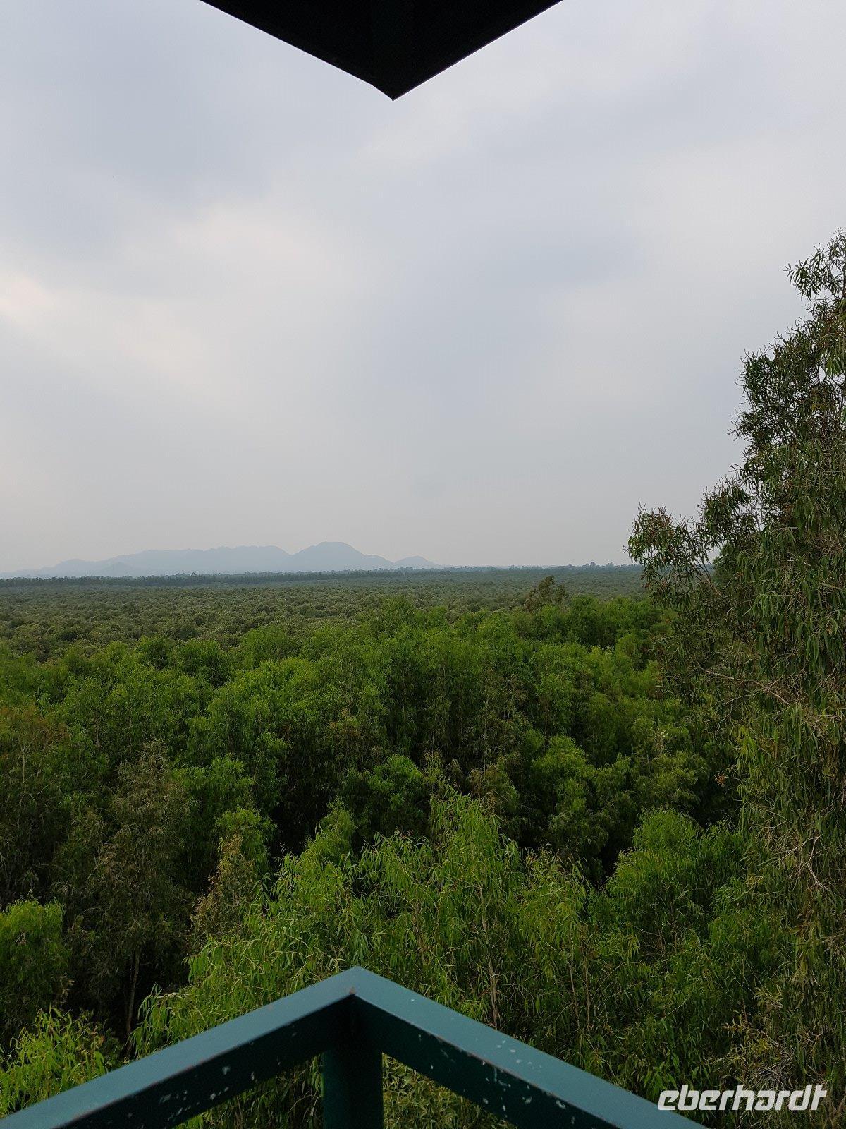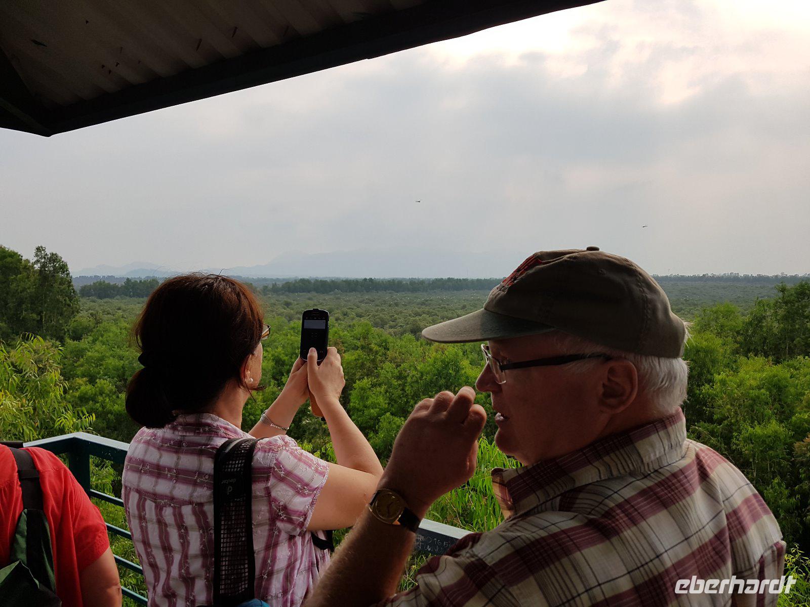 Zunächst geht es mit Motorboot durch die Eukalyptus-Mangroven-Landschaft, dann erfolgt der Umstieg in Sampas. Auf dem folgenden ruhigen Abschnitt hat man dann Muse die reiche Vielfalt an Vögeln zu beobachten; selbst Eisvögel können wir entdecken. Spaziergang zum und Aufstieg auf einen Aussichtsturm erlauben uns dann noch die erhabene Landschaft von oben zu betrachten, ehe es mit dem Motorboot zurück zum Ausgangspunkt dieser Exkursion geht. In Chau Doc ist das Chau Pho Hotel das erste Haus am Platz. Wenngleich nicht so sternenreich dekoriert wie manch vorheriges Hotel unserer Reise, so dennoch ein angenehmes Haus in dessen Restaurant wir dann auch zu Abend essen.