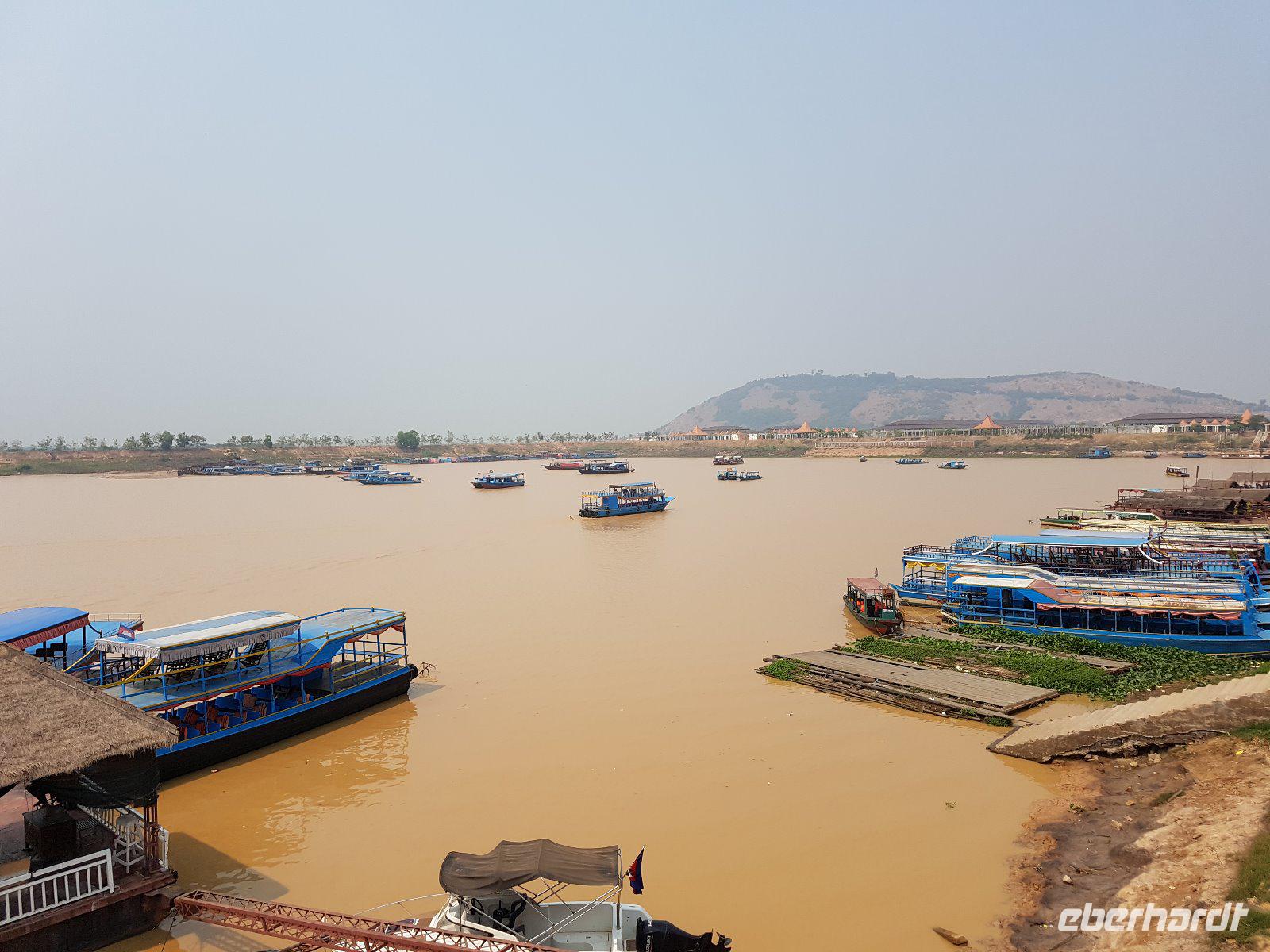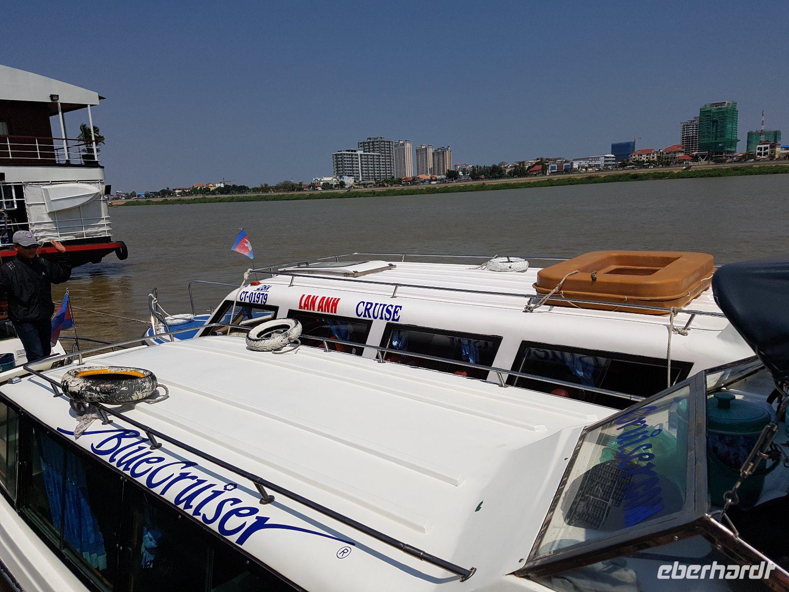 Die Grenze zwischen Vietnam und Kambodscha passieren wir Dank der resoluten Bordreiseleiterin die alle Formalitäten für uns erledigt völlig entspannt und erreichen Phnom Penh gegen Mittag.