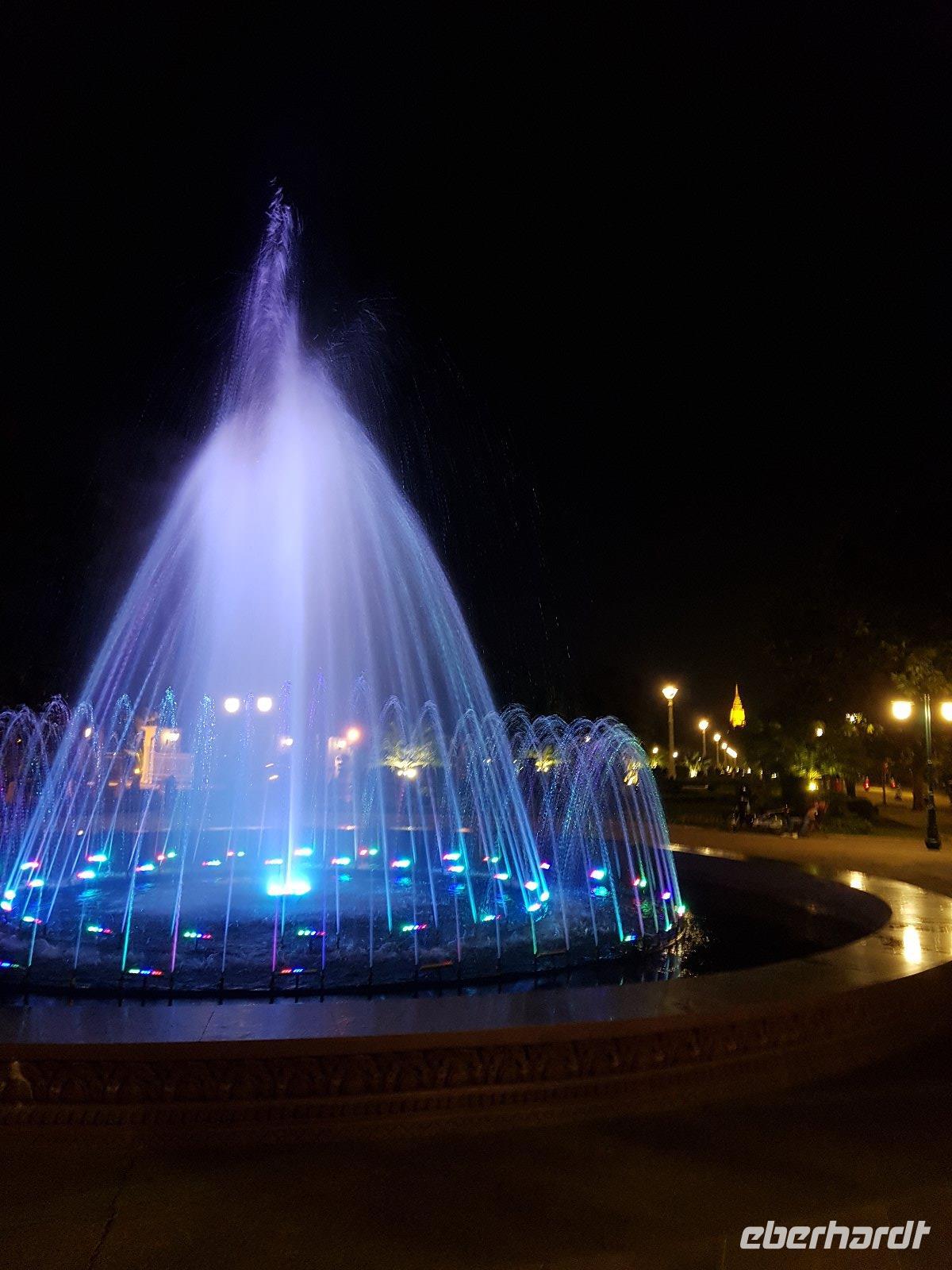 Die abendliche Fahrt mit dem Bus zum und vom Khmer Surin Restaurant präsentiert uns nochmals das moderne, intensiv beleuchtete Phnom Penh.