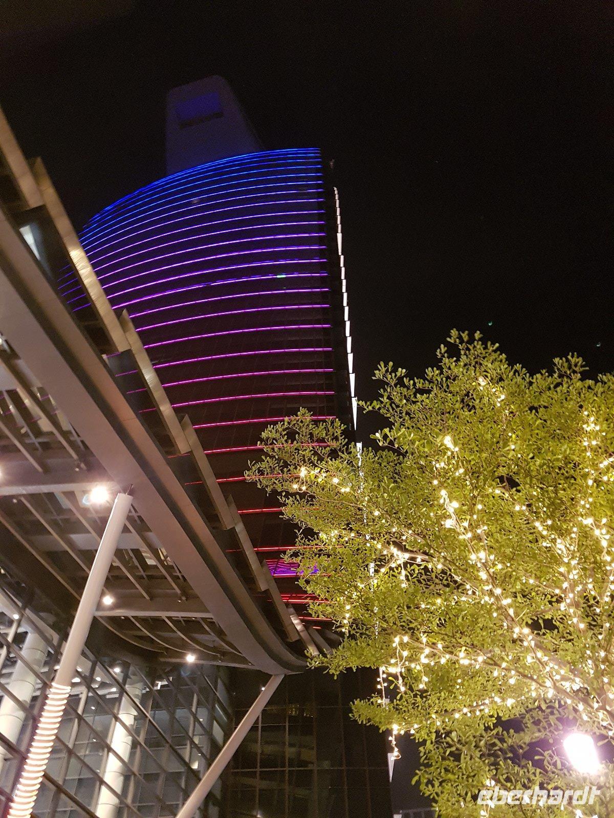 Auf dem Rückweg zum Hotel, vorbei am Stadtmuseum sieht man die kontrastreichen Bauten; Kolonialzeit und modernste Wolkenkratzer wunderbar beleuchtet.
