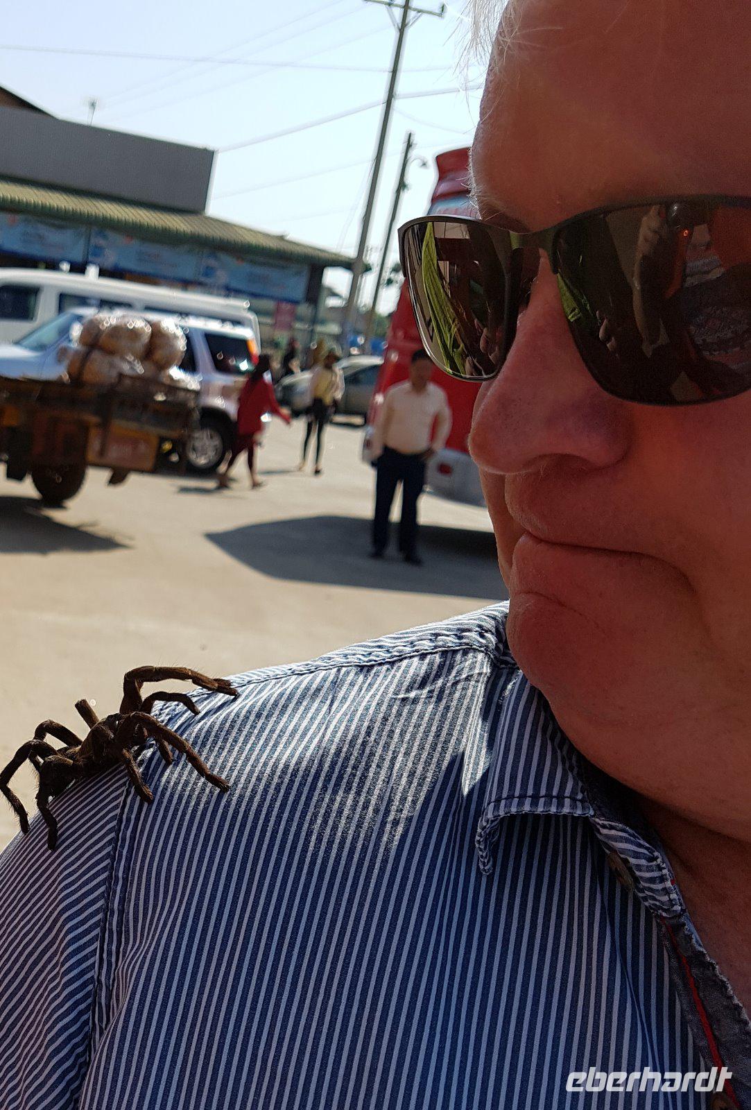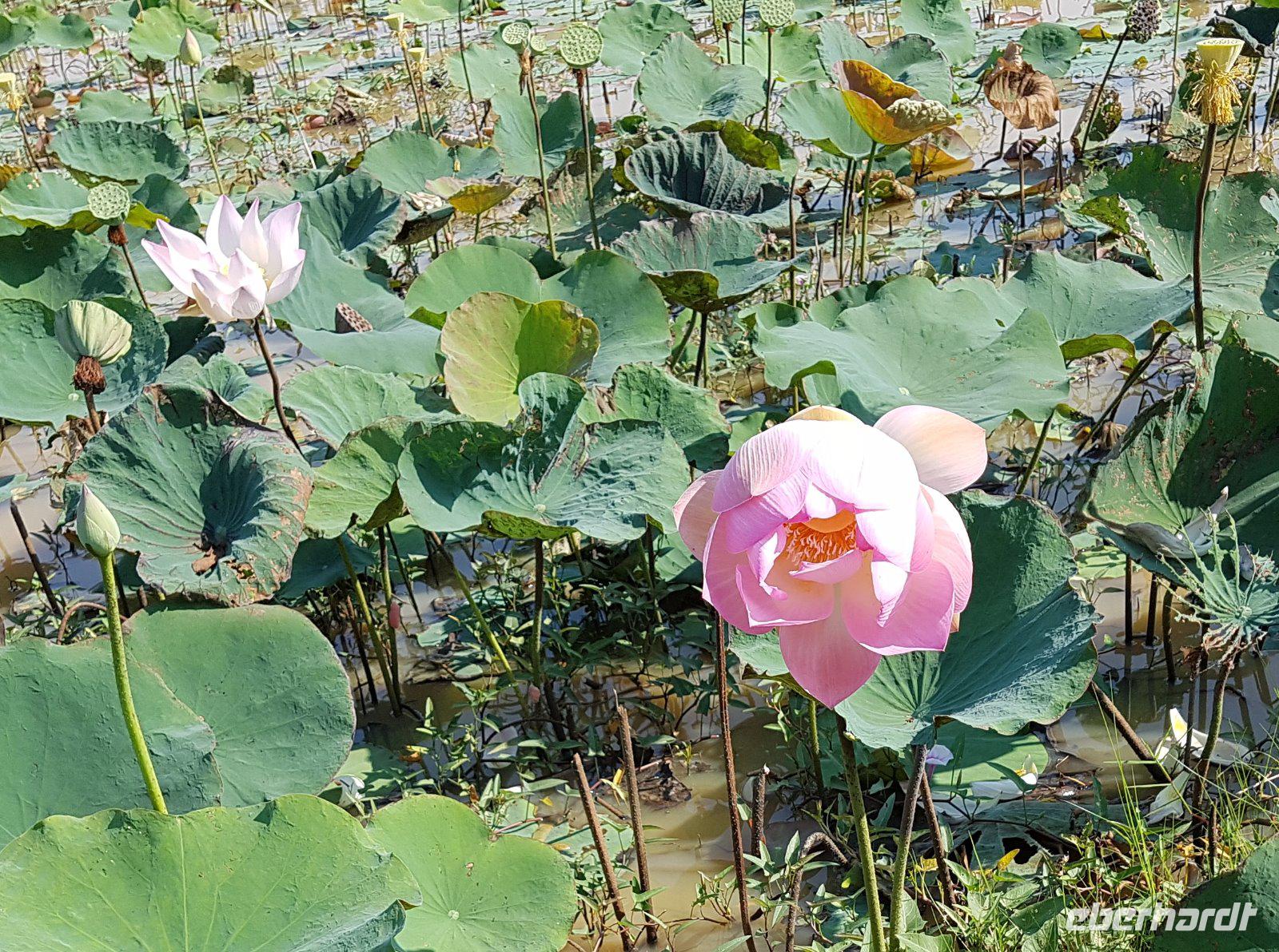 Unterwegs passieren wir schöne Landschaften aus Lotus-Teichen, dann stoppen wir an einem „Schlangenmarkt". Kakerlaken, Skorpione, Frösche und anderes Getier werden gebraten oder frittiert angeboten und von uns probiert.