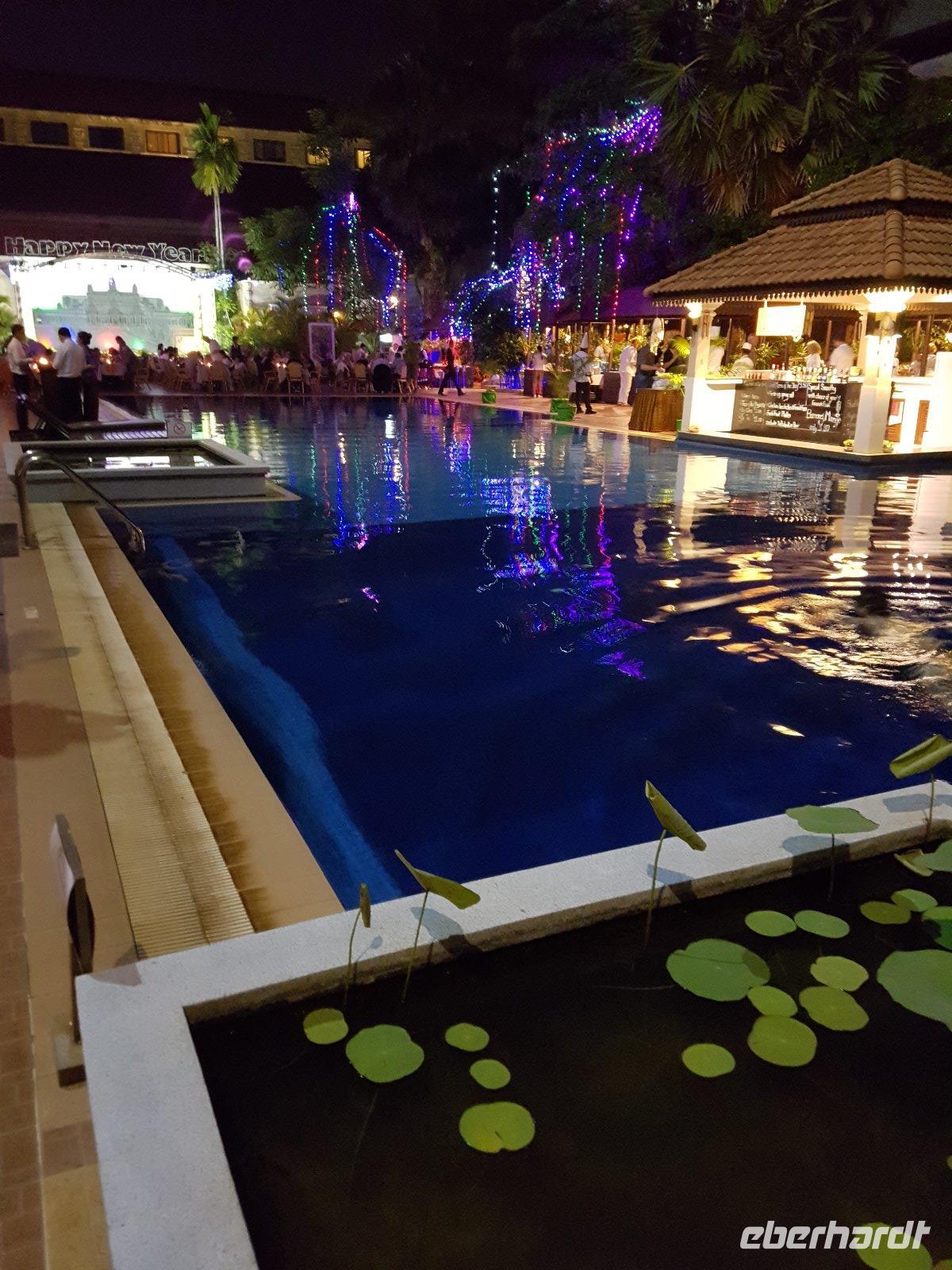 Zum Glück heute keine Wege mehr; rings um die Poollandschaft ist ein gigantisches Buffet für uns aufgebaut, auf der Bühne davor wird uns eine traditionelle Apsara Tanzvorführung zum Ausklang des Abends geboten.