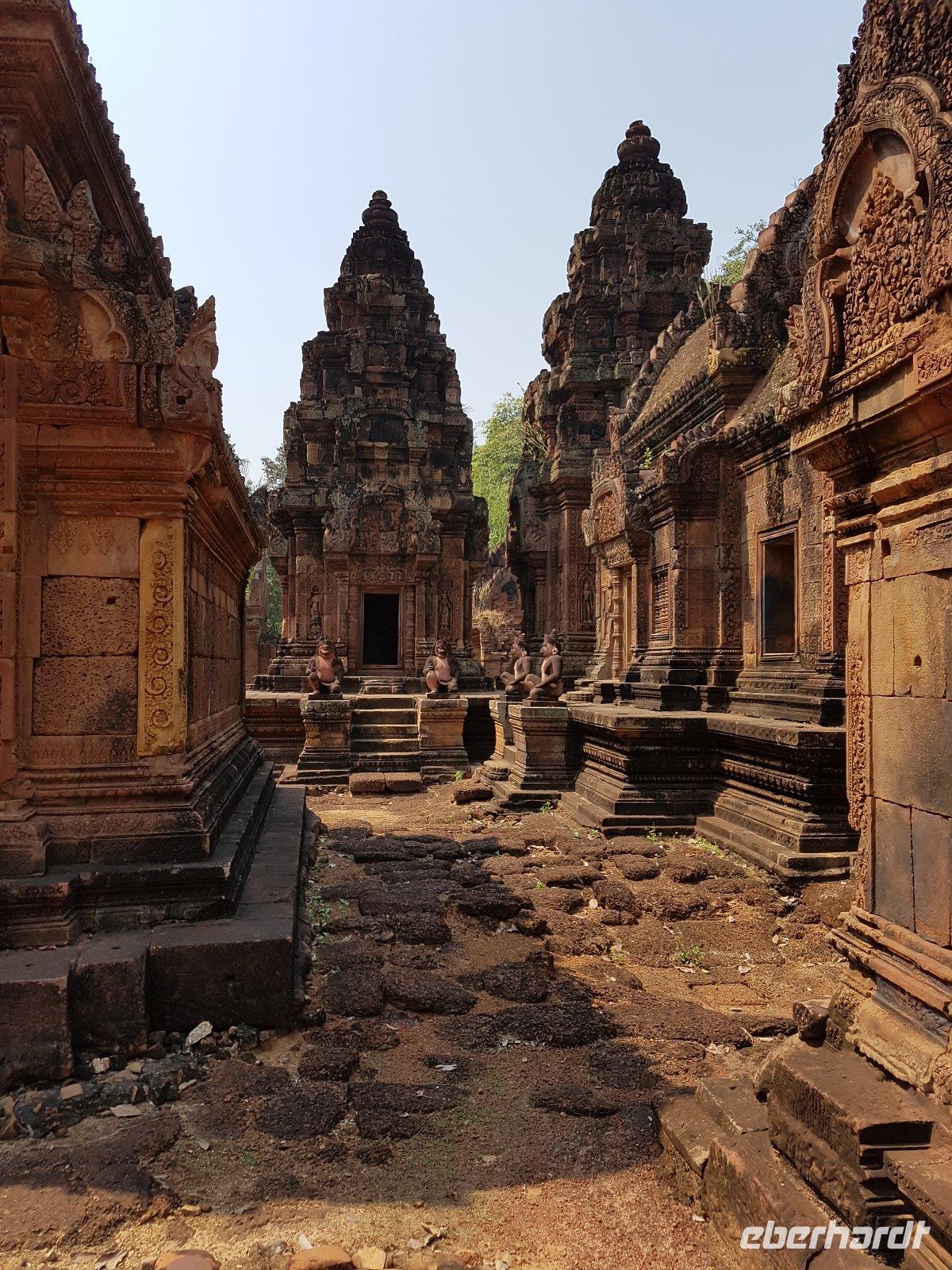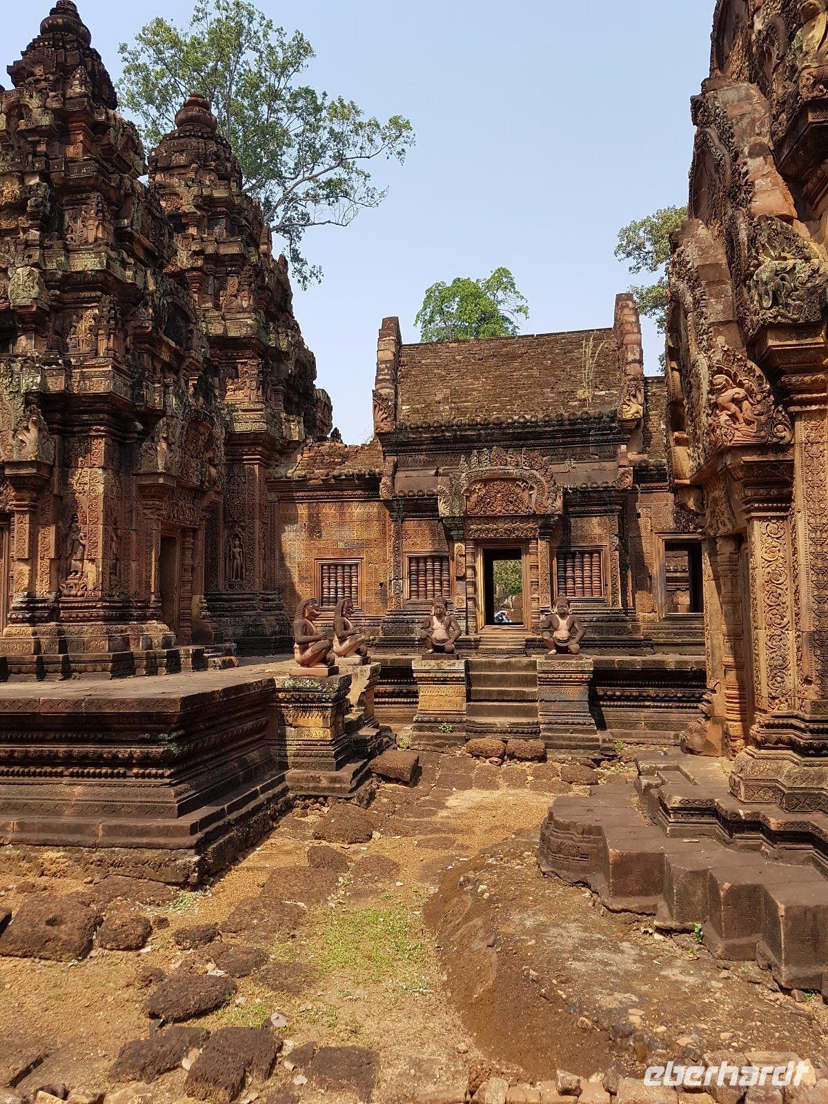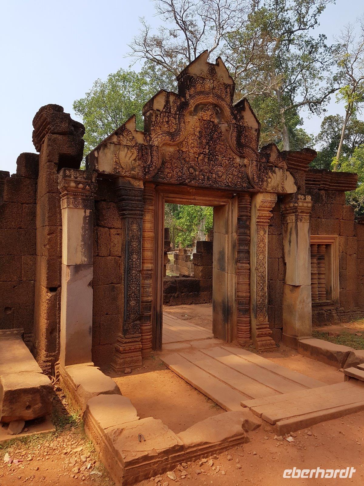 Die Anlage stammt aus der Mitte des 10. Jahrhunderts und ist ein Juwel unter den Tempeln. Die Faszination stammt zweifellos vom Variantenreichtum seines Dekors, welches wir detailreich erläutert bekommen. Die filigran gearbeiteten Ornamentverzierungen auf dem roten Sandstein überziehen fast alle Gebäudeteile.