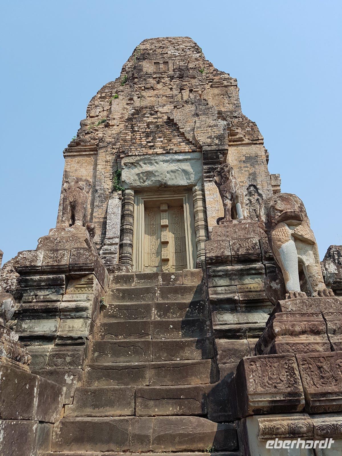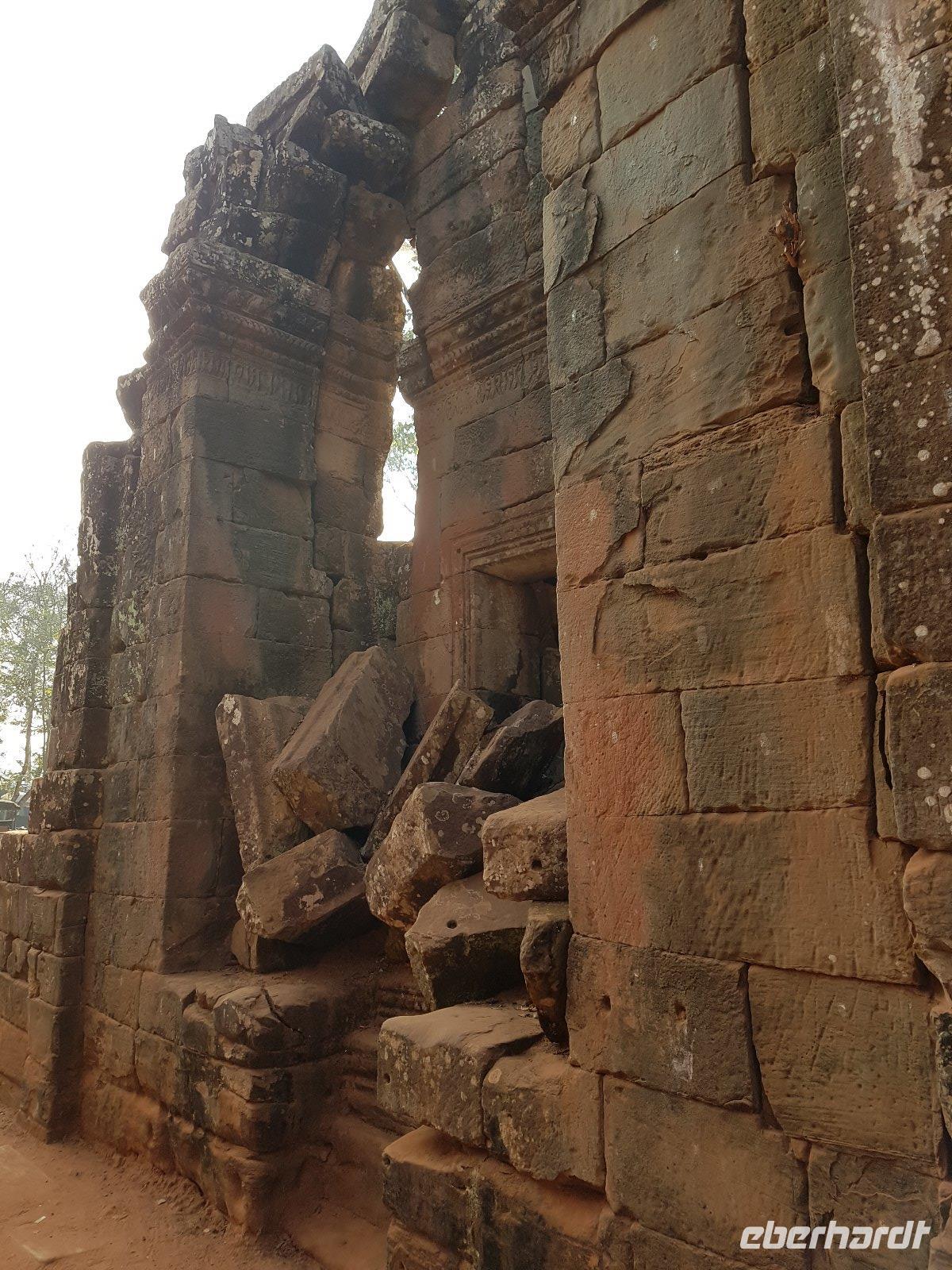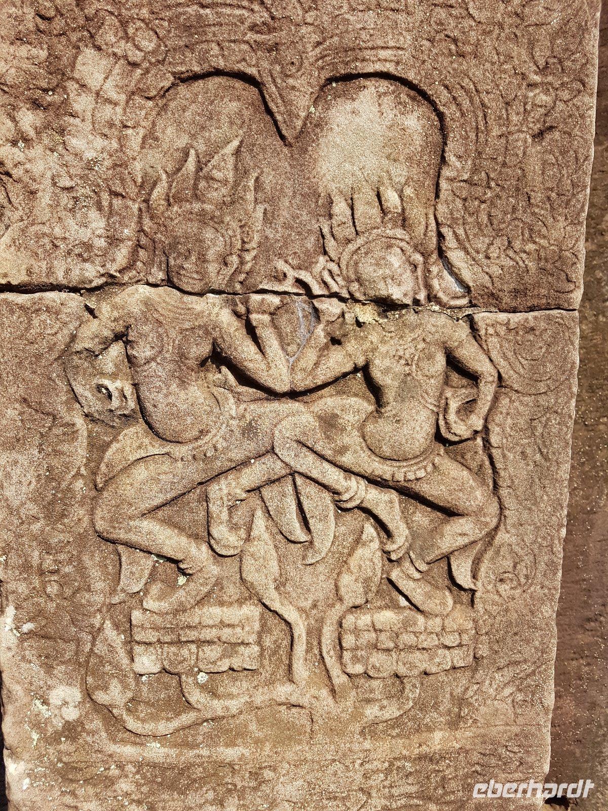 Die Anlage stammt aus der Mitte des 10. Jahrhunderts und ist ein Juwel unter den Tempeln. Die Faszination stammt zweifellos vom Variantenreichtum seines Dekors, welches wir detailreich erläutert bekommen. Die filigran gearbeiteten Ornamentverzierungen auf dem roten Sandstein überziehen fast alle Gebäudeteile.