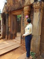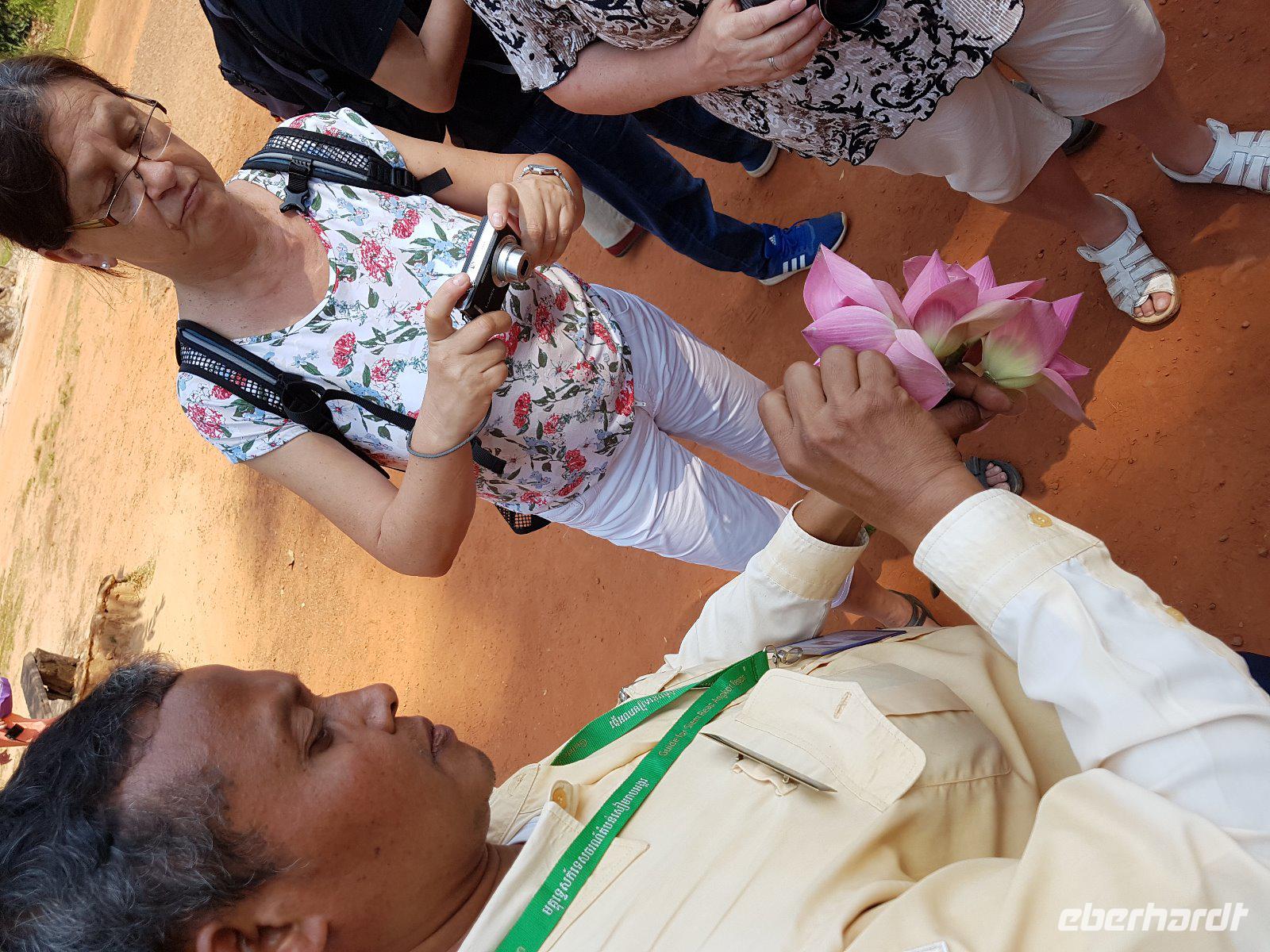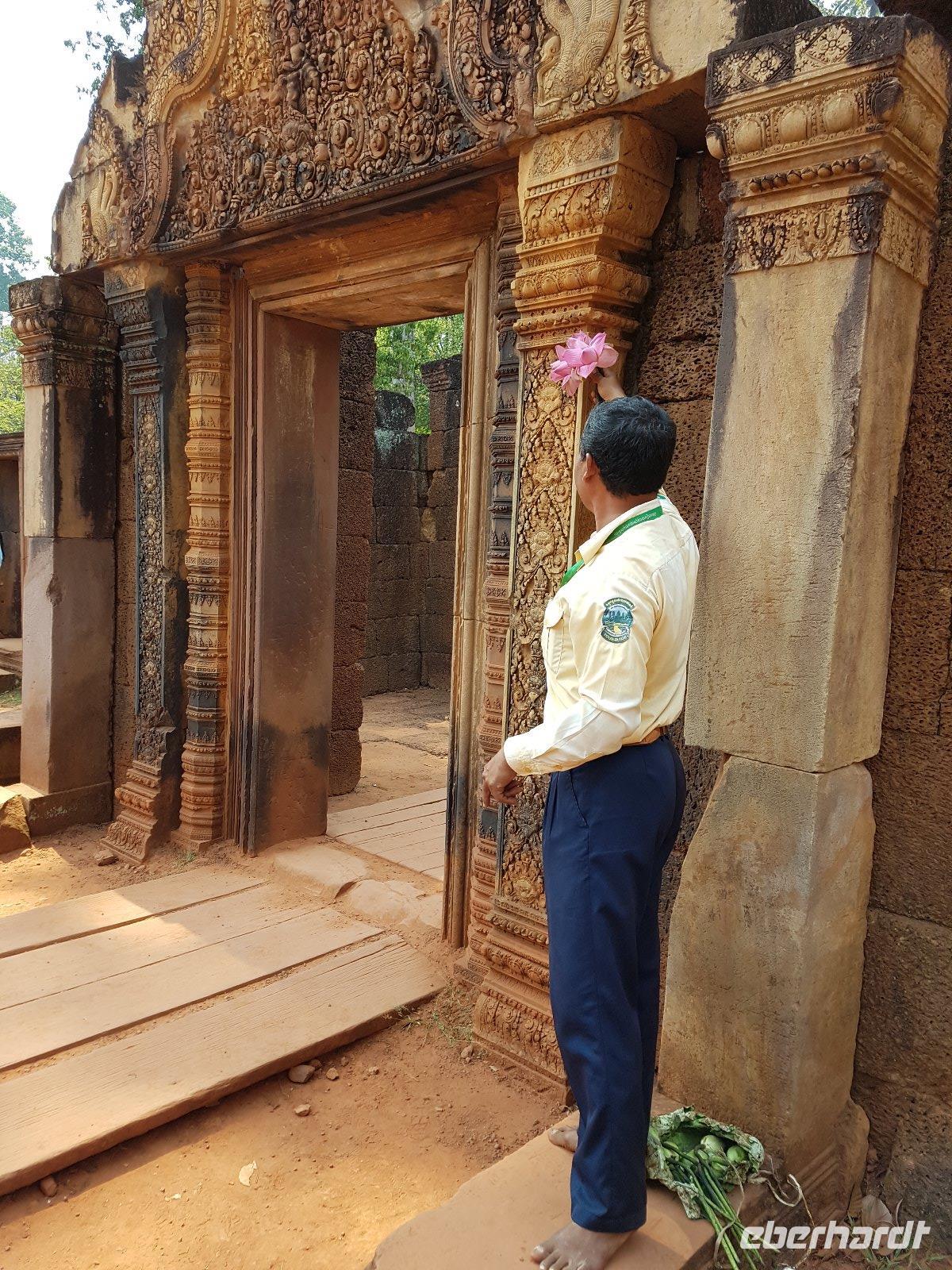 Anschließend besichtigen Sie den filigranen und eleganten Tempel Banteay Srei, der auch Frauentempel genannt wird. Min Thol bringt es fertig uns anhand von Lotuspflanzen, welche er geschickt faltet, auf verständliche Weise die Grundzüge der Khmerarchitektur zu erklären.