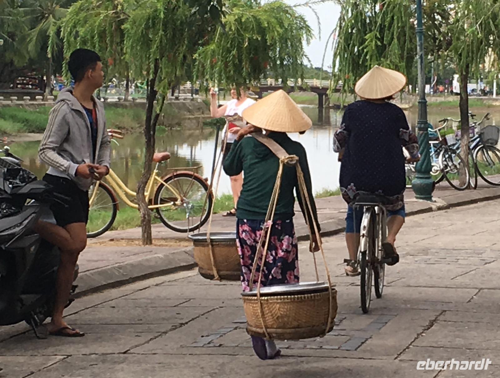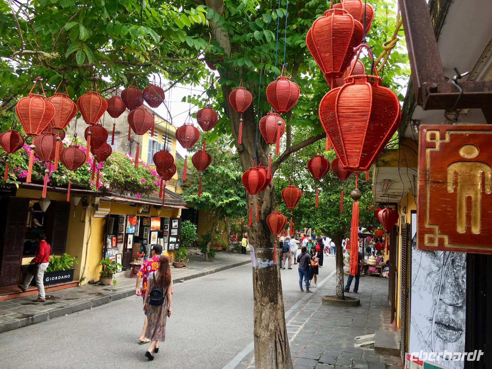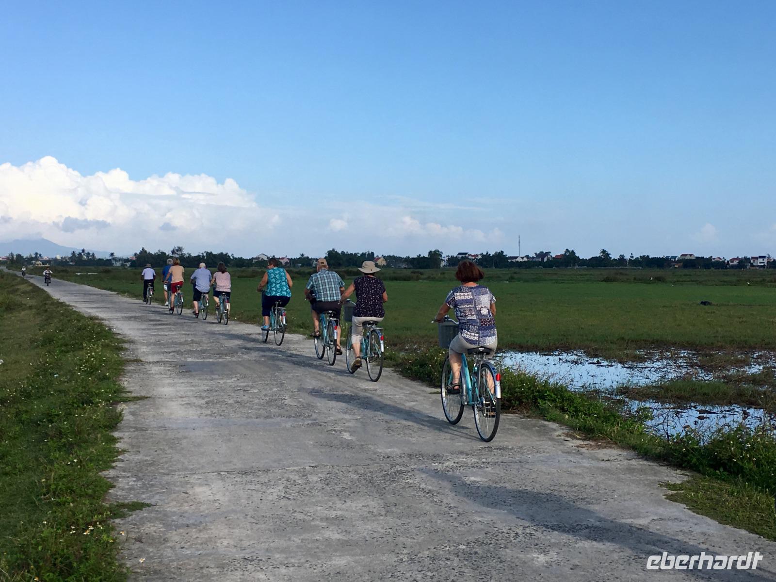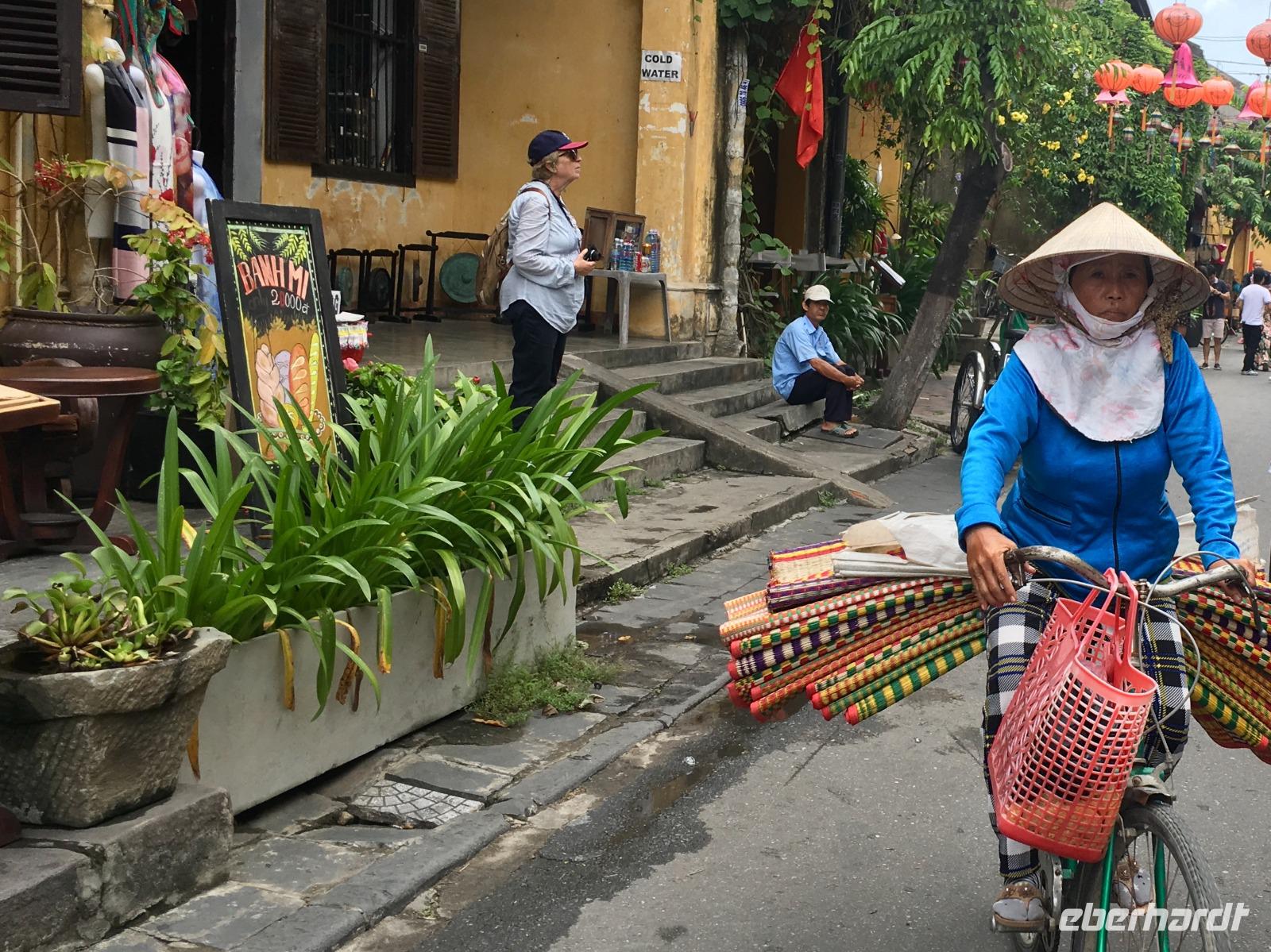 Heute duerfen wir dafuer ausschlafen und unser Hoi An Stadtrundgang beginnt erst um 10:00. Dem Fluss entlang spazierend kommen wir 5 Minuten spaeter schon ins Herz dieser alten Handelsstadt. Chinesische, japanische und vietnamesische Haendler lebten hier gemeinsam. Der Fluss der heute noch ca 100 Meter breit ist, war einmal ein breiter, tiefer Wasserweg. Schade, er hat keine Chance, wie Noch so schoen sagt, der Fluss ist versandet und Danang hat den Handelshafen uebernommen. Hoi An blieb in der Zeit stehen, wurde nie bombardiert in den zahlreichen Kriegen und ist somit zu einem UNESCO Weltkulturerbe erkoren worden. Ein lebendes Museum mit seinen Versammlungshallen (schauen innen aehnlich aus wie Pagoden) und der beruehmten japanischen Bruecke, sowie bis zu 200 Jahre alten Wohnhaeuser der reichen Handelsfamilien. Ein solches besuchen wir auch und staunen ueber die schoene Einrichtung aus Mahagoniholz, die Taefelung, die Seidenlampen, das Rattanbett, den Ahnenschrein und den hellen Patio inmitten des Hauses. Besonders aber die beiden Haus-Augen oberhalb des Einganges faszinieren uns denn wir sehen dieses Zeichen oberhalb vieler Hauseingaenge. Es ist das Ying&Yang Emblem. Diese ewige Ausgewogenheit ist die Anstrebung eines jeden Vietnamesen und sollte sicher auch unsere sein. Klassische Musik hoert man leise aus den Lautsprecher der Innenstadtstrasse und geschmackvolle Geschenke an alle Daheimgebliebenen werden hier angepriesen. Am Nachmittag gehen die meisten auf eine Fahrradtour, denn wer will schon diese Moeglichkeit verpassen, das echte Vietnam im Hinterland kennenzulernen. Wir kurven um Reisfelder, ueben uns im Verkehr, balancieren zwischen engstehenden Haeuser durch, wagen uns durch Dickicht. Wir radeln an einem Lotusblumen-Teichen vorbei, sehen sich badende Bueffel und gelangen so zu unserem einfachen und erlebnisreichen Mittagessen. Bei einer Familie lernen wir kochen und essen danach auch gleich wieder ein 6-Gang Menu....werden wir bei der Ausreise gewogen ? Zurueck zum Hotel wird wieder fleissig gestrampelt und danach ist Freizeit ehe wir uns wieder zum Abendessen treffen. Mmm so fein..in einem kleinen authentischen Restaurant werden wir verwoehnt. Spaeter kugeln wird zurueck zum Hotel direkt ins Bett ?