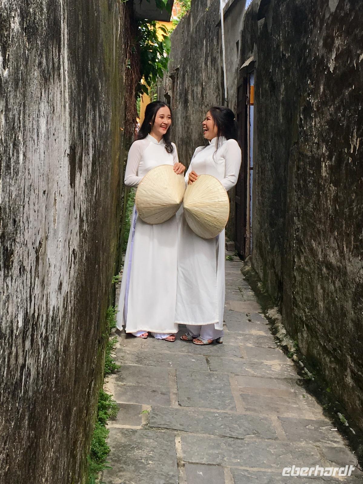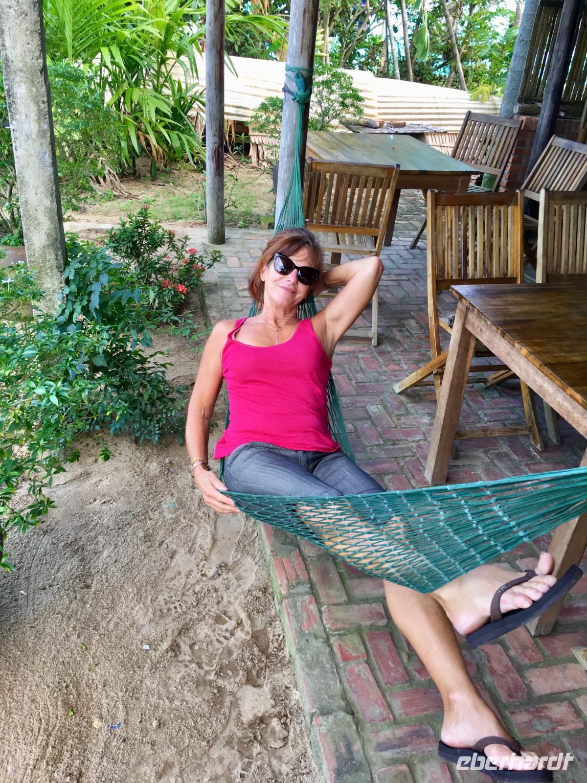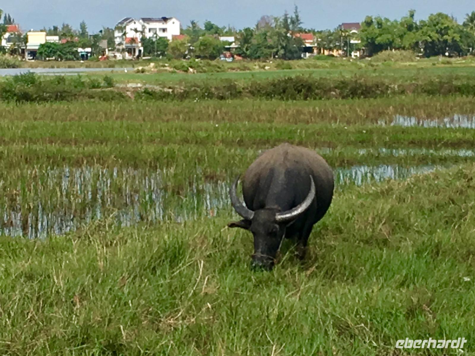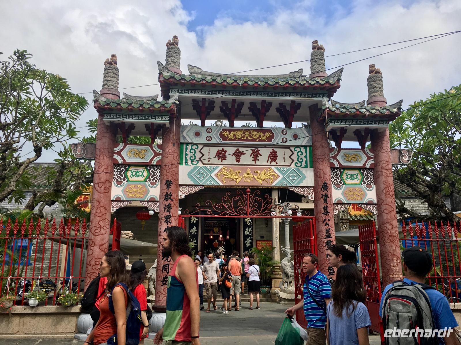 Heute duerfen wir dafuer ausschlafen und unser Hoi An Stadtrundgang beginnt erst um 10:00. Dem Fluss entlang spazierend kommen wir 5 Minuten spaeter schon ins Herz dieser alten Handelsstadt. Chinesische, japanische und vietnamesische Haendler lebten hier gemeinsam. Der Fluss der heute noch ca 100 Meter breit ist, war einmal ein breiter, tiefer Wasserweg. Schade, er hat keine Chance, wie Noch so schoen sagt, der Fluss ist versandet und Danang hat den Handelshafen uebernommen. Hoi An blieb in der Zeit stehen, wurde nie bombardiert in den zahlreichen Kriegen und ist somit zu einem UNESCO Weltkulturerbe erkoren worden. Ein lebendes Museum mit seinen Versammlungshallen (schauen innen aehnlich aus wie Pagoden) und der beruehmten japanischen Bruecke, sowie bis zu 200 Jahre alten Wohnhaeuser der reichen Handelsfamilien. Ein solches besuchen wir auch und staunen ueber die schoene Einrichtung aus Mahagoniholz, die Taefelung, die Seidenlampen, das Rattanbett, den Ahnenschrein und den hellen Patio inmitten des Hauses. Besonders aber die beiden Haus-Augen oberhalb des Einganges faszinieren uns denn wir sehen dieses Zeichen oberhalb vieler Hauseingaenge. Es ist das Ying&Yang Emblem. Diese ewige Ausgewogenheit ist die Anstrebung eines jeden Vietnamesen und sollte sicher auch unsere sein. Klassische Musik hoert man leise aus den Lautsprecher der Innenstadtstrasse und geschmackvolle Geschenke an alle Daheimgebliebenen werden hier angepriesen. Am Nachmittag gehen die meisten auf eine Fahrradtour, denn wer will schon diese Moeglichkeit verpassen, das echte Vietnam im Hinterland kennenzulernen. Wir kurven um Reisfelder, ueben uns im Verkehr, balancieren zwischen engstehenden Haeuser durch, wagen uns durch Dickicht. Wir radeln an einem Lotusblumen-Teichen vorbei, sehen sich badende Bueffel und gelangen so zu unserem einfachen und erlebnisreichen Mittagessen. Bei einer Familie lernen wir kochen und essen danach auch gleich wieder ein 6-Gang Menu....werden wir bei der Ausreise gewogen ? Zurueck zum Hotel wird wieder fleissig gestrampelt und danach ist Freizeit ehe wir uns wieder zum Abendessen treffen. Mmm so fein..in einem kleinen authentischen Restaurant werden wir verwoehnt. Spaeter kugeln wird zurueck zum Hotel direkt ins Bett ?