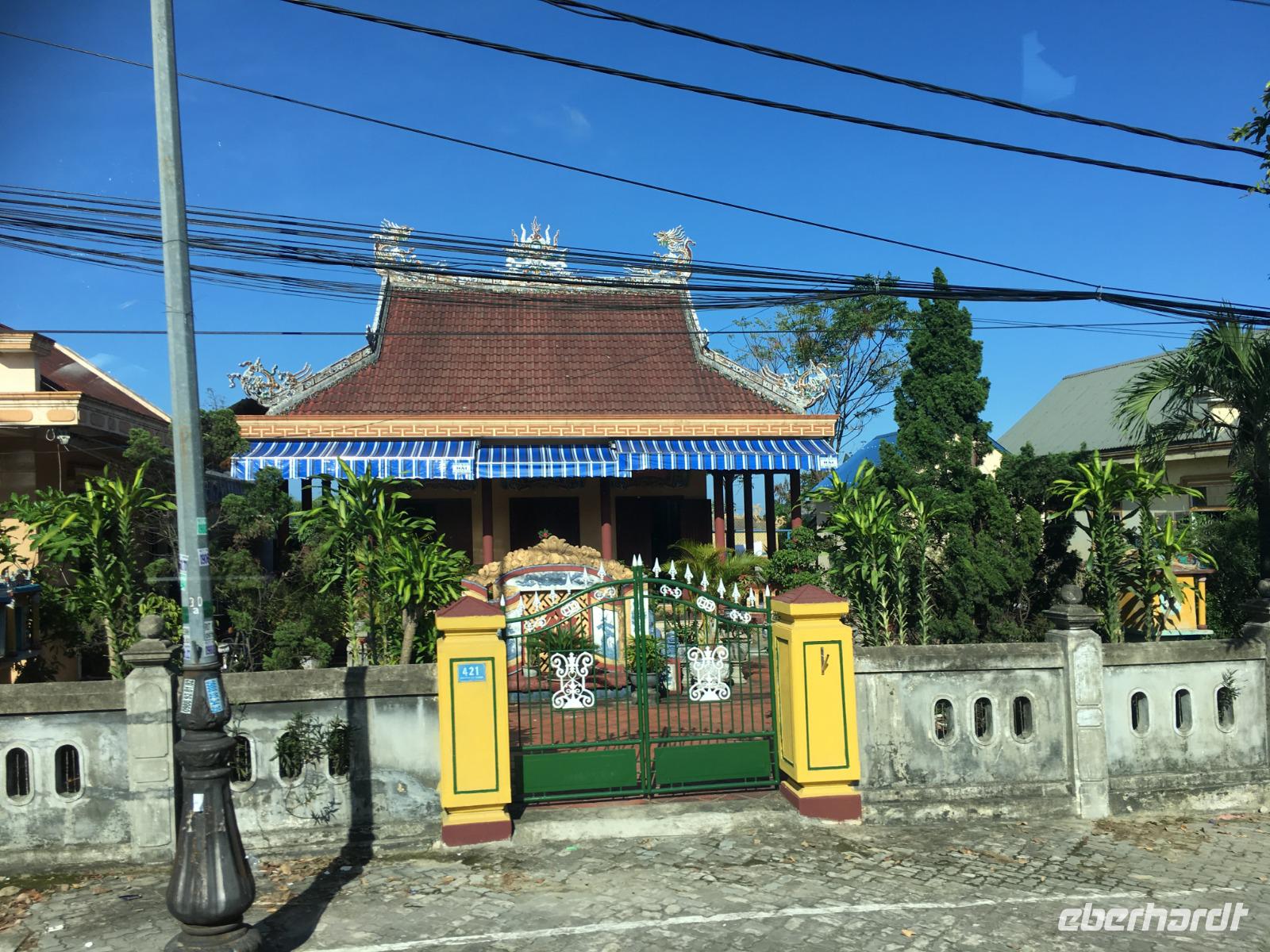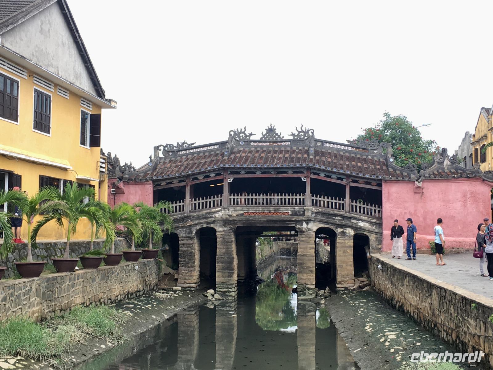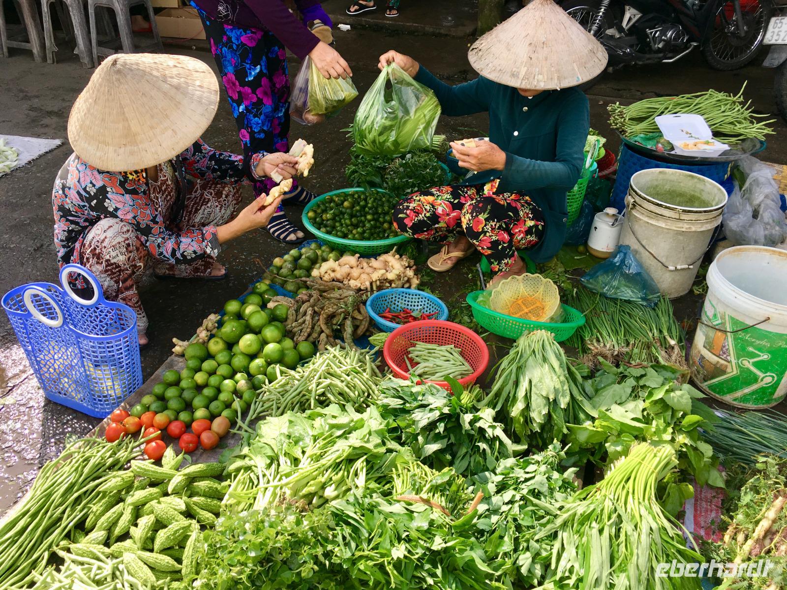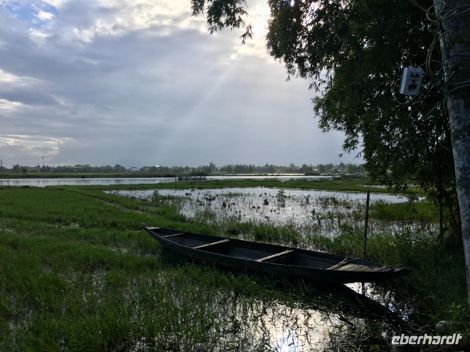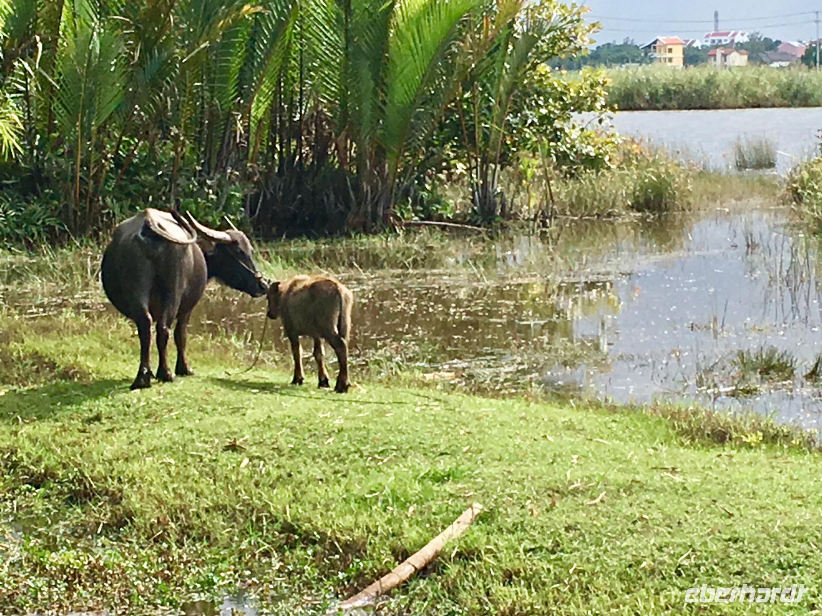 Heute duerfen wir dafuer ausschlafen und unser Hoi An Stadtrundgang beginnt erst um 10:00. Dem Fluss entlang spazierend kommen wir 5 Minuten spaeter schon ins Herz dieser alten Handelsstadt. Chinesische, japanische und vietnamesische Haendler lebten hier gemeinsam. Der Fluss der heute noch ca 100 Meter breit ist, war einmal ein breiter, tiefer Wasserweg. Schade, er hat keine Chance, wie Noch so schoen sagt, der Fluss ist versandet und Danang hat den Handelshafen uebernommen. Hoi An blieb in der Zeit stehen, wurde nie bombardiert in den zahlreichen Kriegen und ist somit zu einem UNESCO Weltkulturerbe erkoren worden. Ein lebendes Museum mit seinen Versammlungshallen (schauen innen aehnlich aus wie Pagoden) und der beruehmten japanischen Bruecke, sowie bis zu 200 Jahre alten Wohnhaeuser der reichen Handelsfamilien. Ein solches besuchen wir auch und staunen ueber die schoene Einrichtung aus Mahagoniholz, die Taefelung, die Seidenlampen, das Rattanbett, den Ahnenschrein und den hellen Patio inmitten des Hauses. Besonders aber die beiden Haus-Augen oberhalb des Einganges faszinieren uns denn wir sehen dieses Zeichen oberhalb vieler Hauseingaenge. Es ist das Ying&Yang Emblem. Diese ewige Ausgewogenheit ist die Anstrebung eines jeden Vietnamesen und sollte sicher auch unsere sein. Klassische Musik hoert man leise aus den Lautsprecher der Innenstadtstrasse und geschmackvolle Geschenke an alle Daheimgebliebenen werden hier angepriesen. Am Nachmittag gehen die meisten auf eine Fahrradtour, denn wer will schon diese Moeglichkeit verpassen, das echte Vietnam im Hinterland kennenzulernen. Wir kurven um Reisfelder, ueben uns im Verkehr, balancieren zwischen engstehenden Haeuser durch, wagen uns durch Dickicht. Wir radeln an einem Lotusblumen-Teichen vorbei, sehen sich badende Bueffel und gelangen so zu unserem einfachen und erlebnisreichen Mittagessen. Bei einer Familie lernen wir kochen und essen danach auch gleich wieder ein 6-Gang Menu....werden wir bei der Ausreise gewogen ? Zurueck zum Hotel wird wieder fleissig gestrampelt und danach ist Freizeit ehe wir uns wieder zum Abendessen treffen. Mmm so fein..in einem kleinen authentischen Restaurant werden wir verwoehnt. Spaeter kugeln wird zurueck zum Hotel direkt ins Bett ?