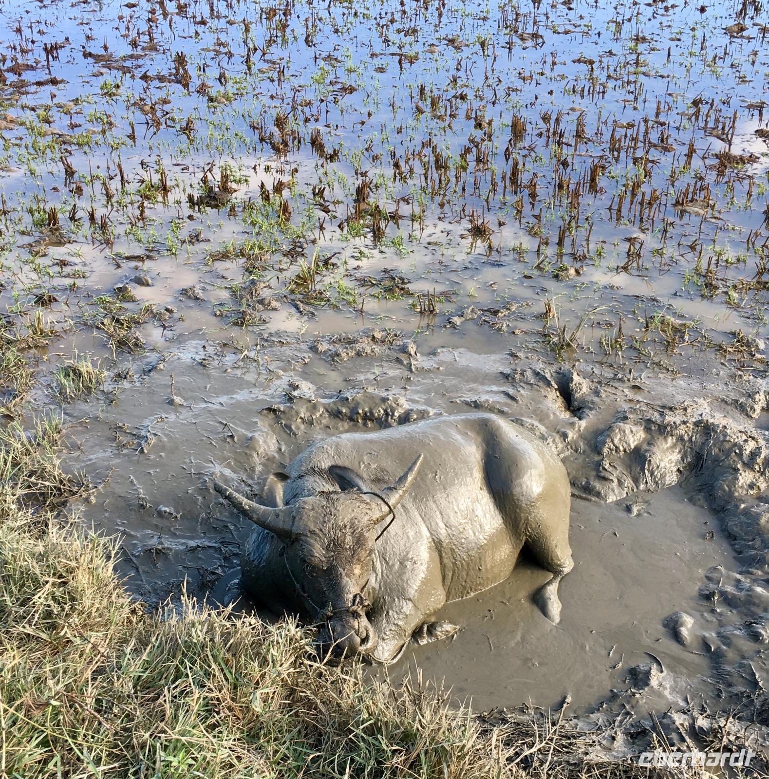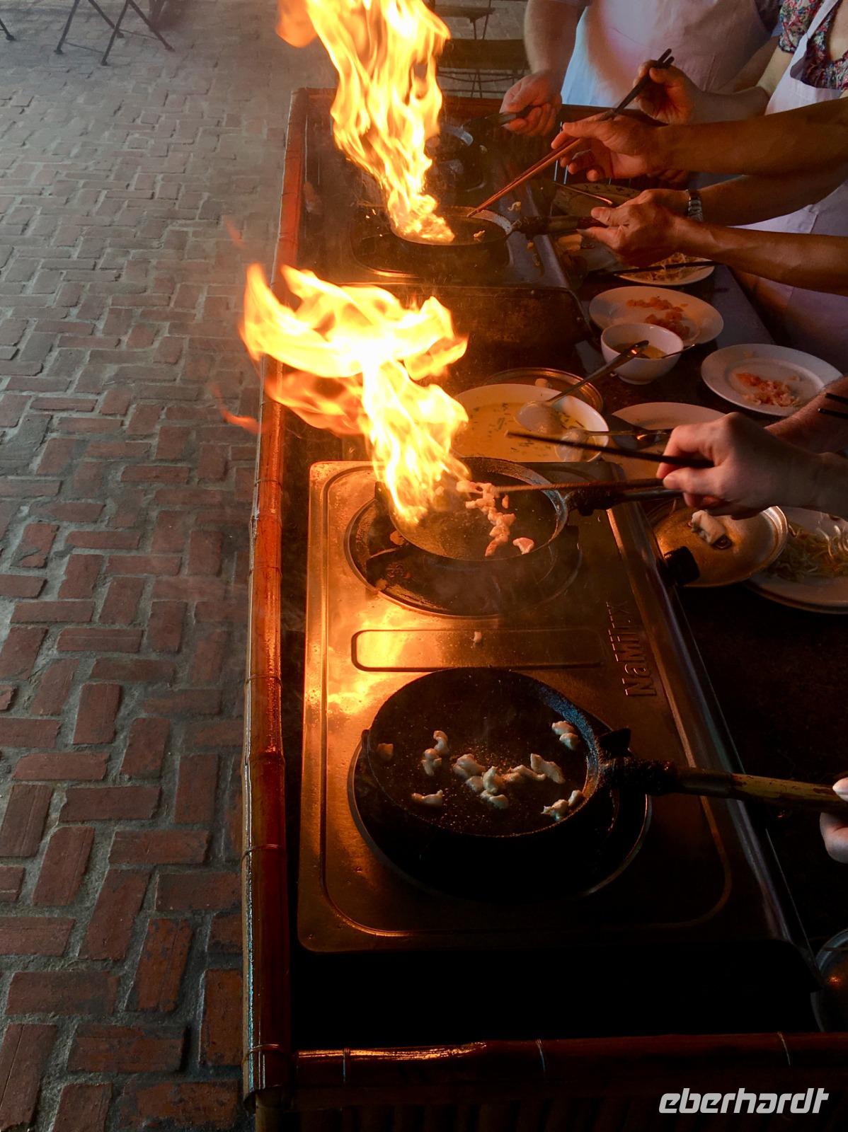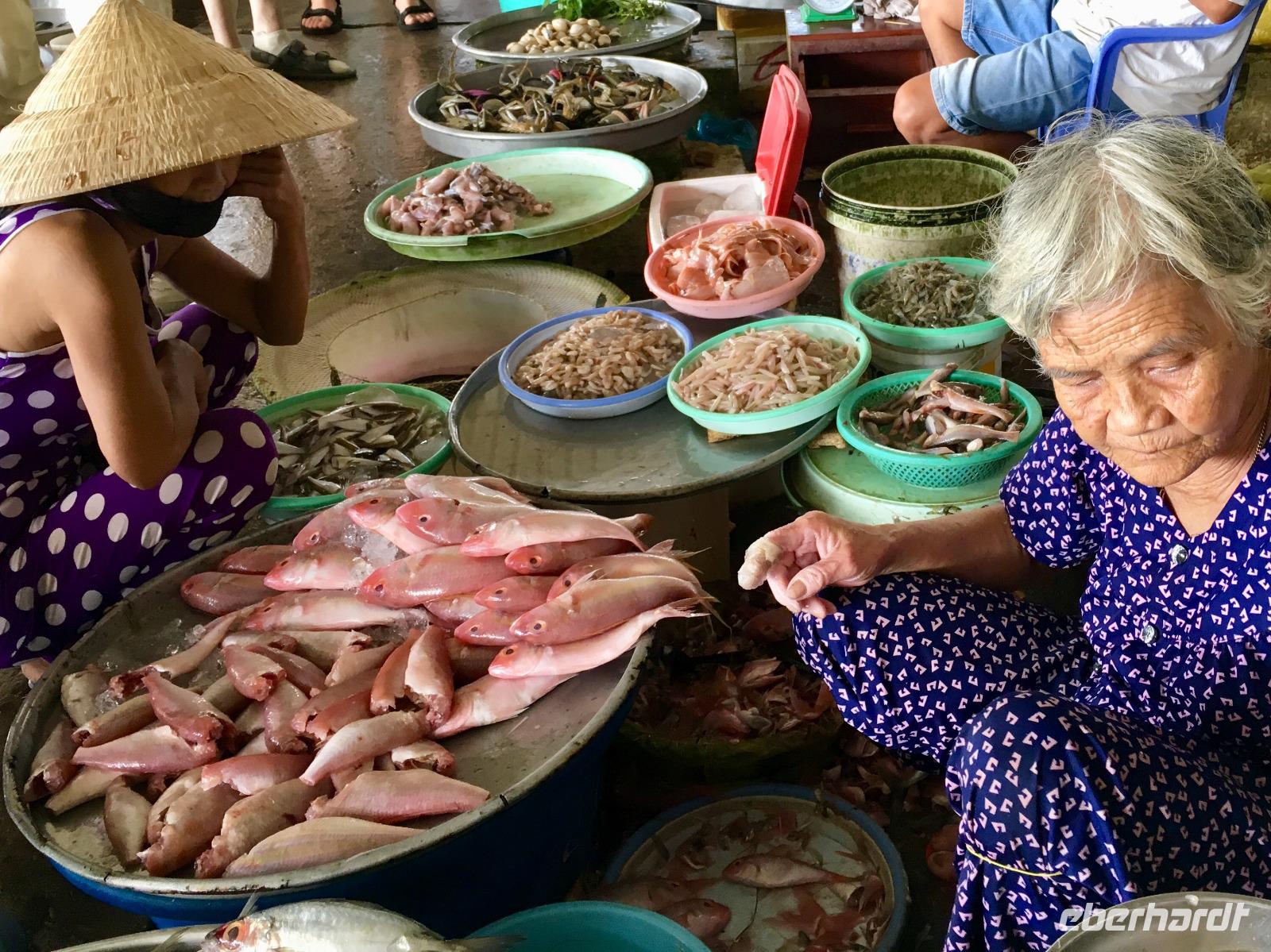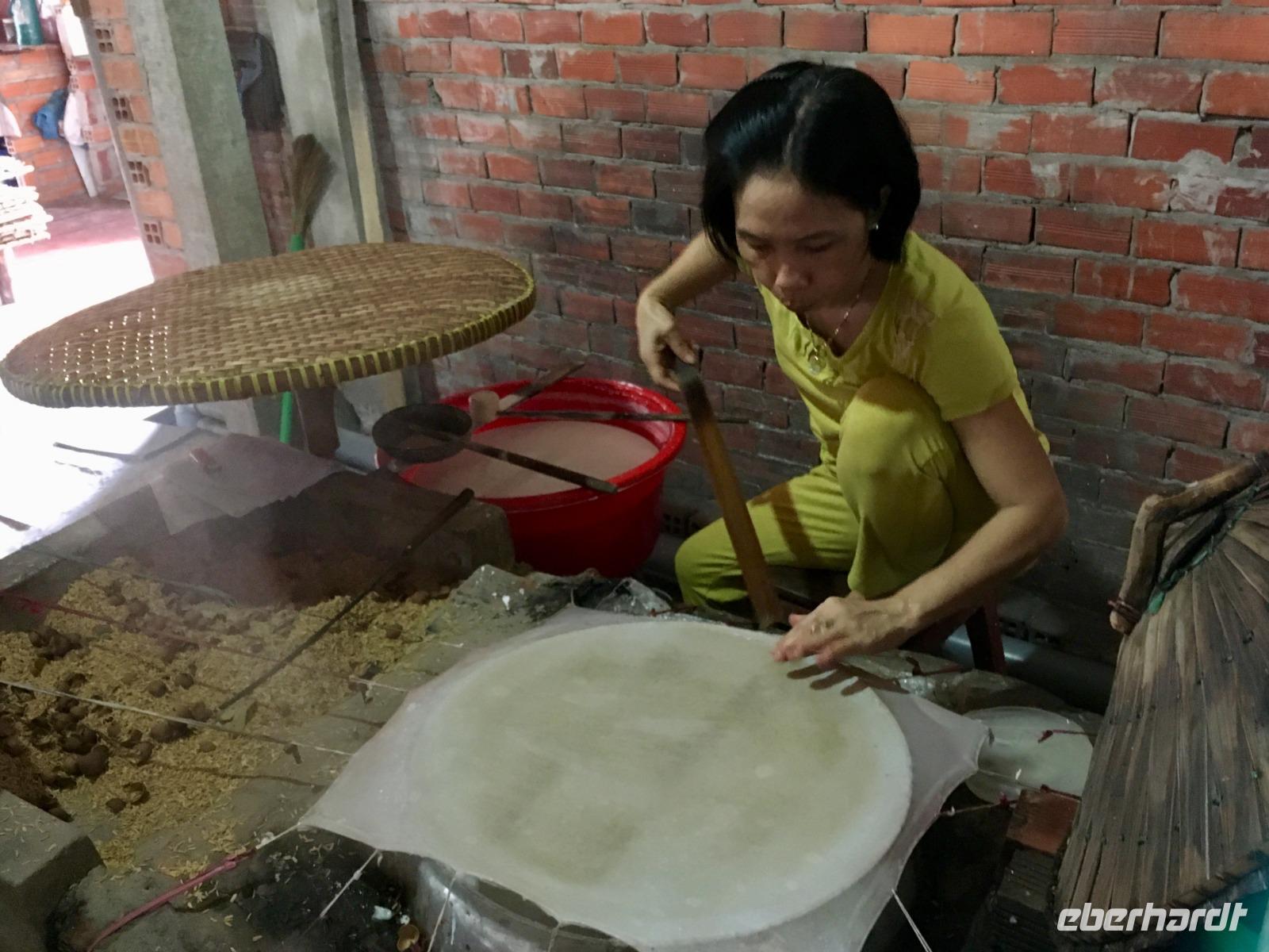 Heute duerfen wir dafuer ausschlafen und unser Hoi An Stadtrundgang beginnt erst um 10:00. Dem Fluss entlang spazierend kommen wir 5 Minuten spaeter schon ins Herz dieser alten Handelsstadt. Chinesische, japanische und vietnamesische Haendler lebten hier gemeinsam. Der Fluss der heute noch ca 100 Meter breit ist, war einmal ein breiter, tiefer Wasserweg. Schade, er hat keine Chance, wie Noch so schoen sagt, der Fluss ist versandet und Danang hat den Handelshafen uebernommen. Hoi An blieb in der Zeit stehen, wurde nie bombardiert in den zahlreichen Kriegen und ist somit zu einem UNESCO Weltkulturerbe erkoren worden. Ein lebendes Museum mit seinen Versammlungshallen (schauen innen aehnlich aus wie Pagoden) und der beruehmten japanischen Bruecke, sowie bis zu 200 Jahre alten Wohnhaeuser der reichen Handelsfamilien. Ein solches besuchen wir auch und staunen ueber die schoene Einrichtung aus Mahagoniholz, die Taefelung, die Seidenlampen, das Rattanbett, den Ahnenschrein und den hellen Patio inmitten des Hauses. Besonders aber die beiden Haus-Augen oberhalb des Einganges faszinieren uns denn wir sehen dieses Zeichen oberhalb vieler Hauseingaenge. Es ist das Ying&Yang Emblem. Diese ewige Ausgewogenheit ist die Anstrebung eines jeden Vietnamesen und sollte sicher auch unsere sein. Klassische Musik hoert man leise aus den Lautsprecher der Innenstadtstrasse und geschmackvolle Geschenke an alle Daheimgebliebenen werden hier angepriesen. Am Nachmittag gehen die meisten auf eine Fahrradtour, denn wer will schon diese Moeglichkeit verpassen, das echte Vietnam im Hinterland kennenzulernen. Wir kurven um Reisfelder, ueben uns im Verkehr, balancieren zwischen engstehenden Haeuser durch, wagen uns durch Dickicht. Wir radeln an einem Lotusblumen-Teichen vorbei, sehen sich badende Bueffel und gelangen so zu unserem einfachen und erlebnisreichen Mittagessen. Bei einer Familie lernen wir kochen und essen danach auch gleich wieder ein 6-Gang Menu....werden wir bei der Ausreise gewogen ? Zurueck zum Hotel wird wieder fleissig gestrampelt und danach ist Freizeit ehe wir uns wieder zum Abendessen treffen. Mmm so fein..in einem kleinen authentischen Restaurant werden wir verwoehnt. Spaeter kugeln wird zurueck zum Hotel direkt ins Bett ?