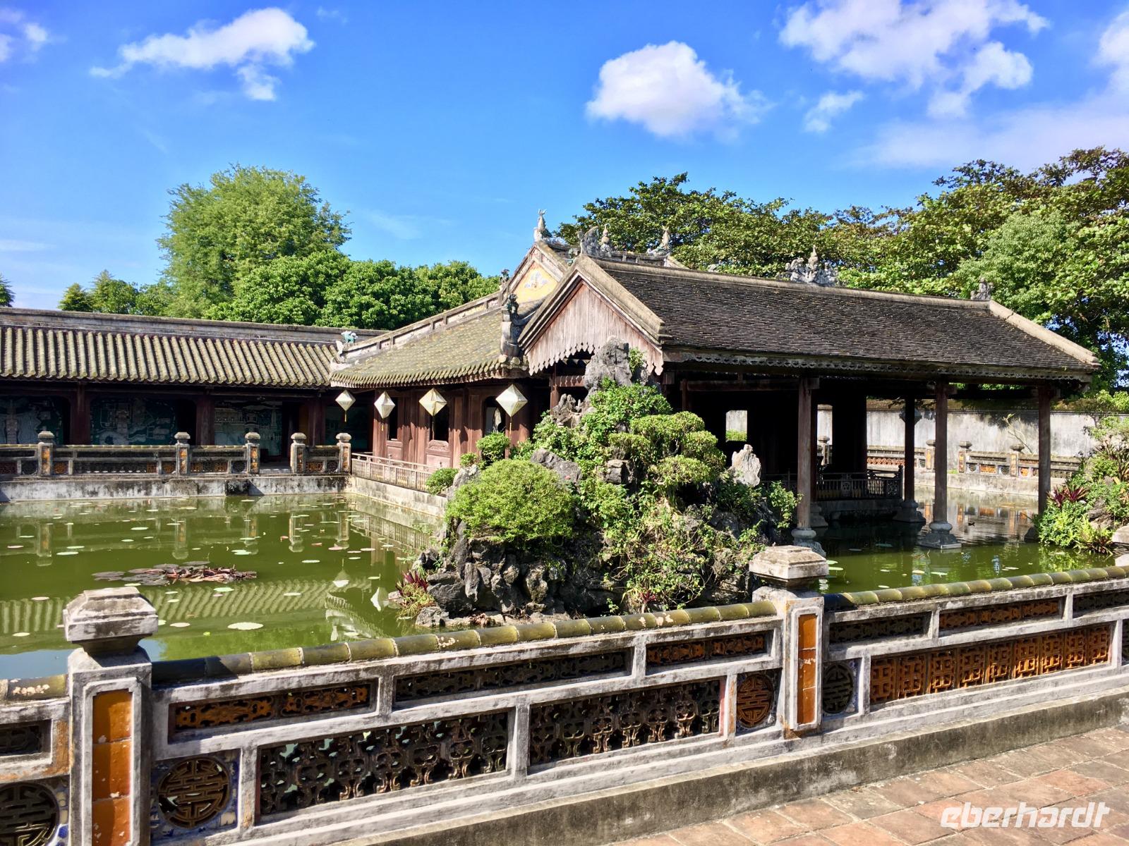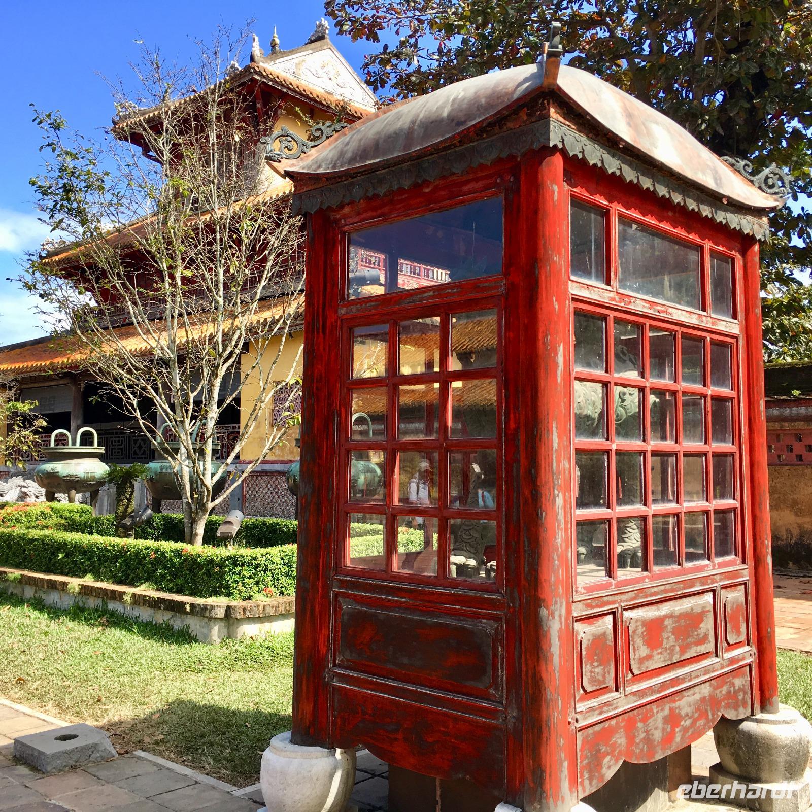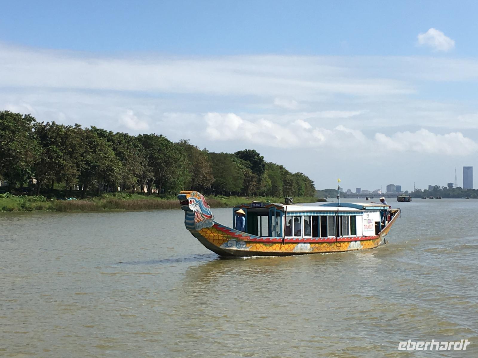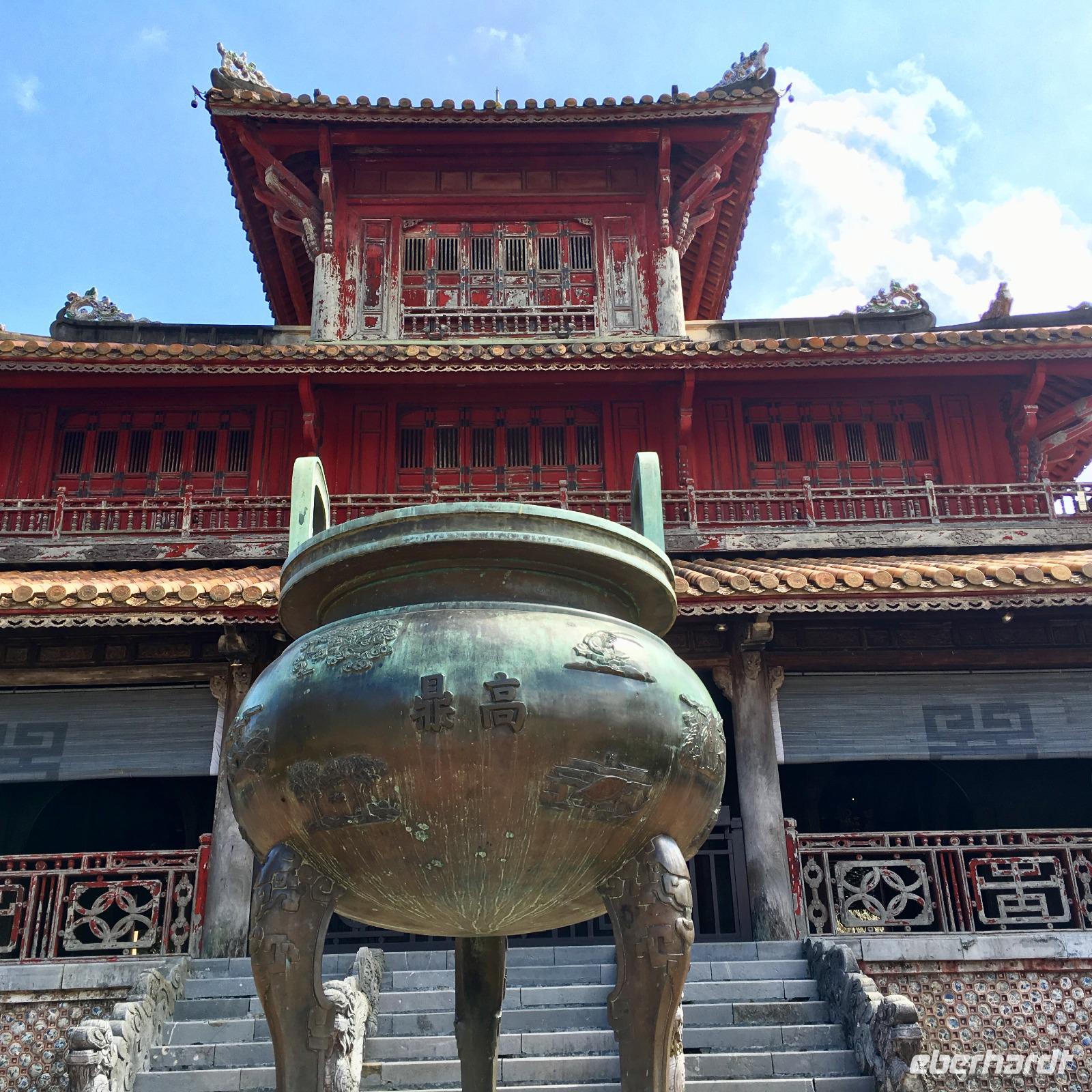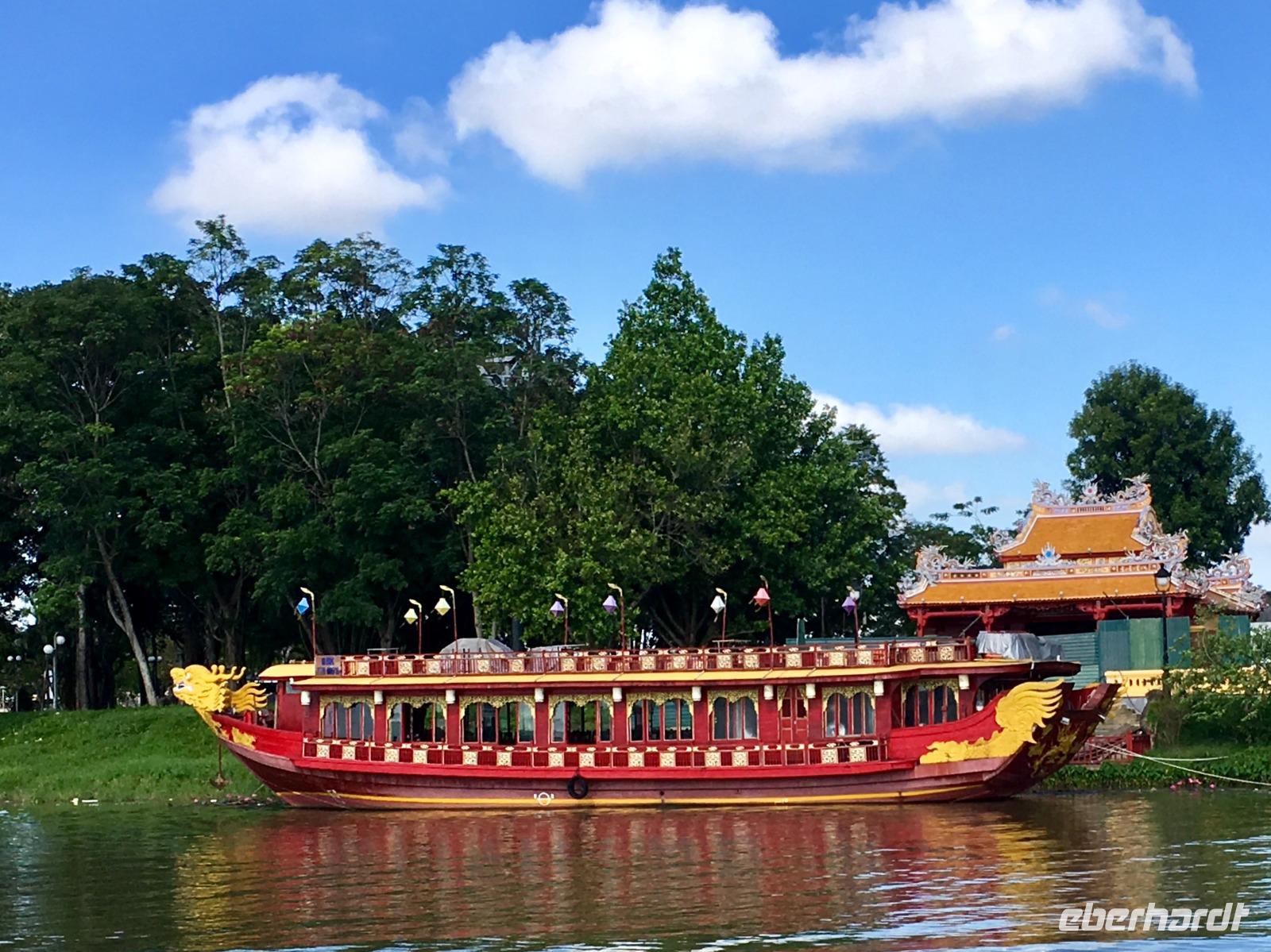 Ach wie schoen, es scheint die Sonne, wir koennen ausschlafen, der Dachterassenpool lockt, das ist Urlaub. Das Fruehstuecksbuffet ist so gross man braucht ein Fahrrad um es anzuschauen (Spruch eines Gastes). Um 9 Uhr fahren wir ab, aber bloss 10 Minuten spaeter sind wir schon angekommen. Heute faengt die Stadtrundfahrt in Hue auf dem Parfumfluss an. In einem glueckbringendem Drachenboot tuckern wir geruhsam dahin. Viele Fotos werden von den Pagoden, Bruecken, Fischer und anderen pitoresken kleineren Booten gemacht bis die Verkaufsdame auf dem Schiff nicht ihre Ware ausbreitet. Schoene Hemden, Morgenroecke, Schals und sonstiges wird nun feilgeboten und wir werden schwach.... Aber schau, da ist sie ja, die aelteste Pagode...wir legen an...noch schnell das Gekaufte bezahlen (am Schluss ist der Preis immer die Haelfte !) und freundliche Verabschiedung der Crew. Die steilen Stufen muessen nun gekraxelt werden, aber wir sind ja unterdessen schon fast Athleten, ehe wir vor der wunderbaren, nicht bombardierten, Tien Mu Pagodensaeule stehen. Die aelteste gusseisene Glocke wird auch betrachtet und dann gehts weiter zur Pagode die fuer die Ahnenverehrung noch immer gerne benutzt wird. Hier wohnen auch Moenche in ihren braunen Kutten und wir sehen wie die Jungen gerade aus der Schule wieder zurueck zur Pagode gehen. Es wird langsam warm und so sind wir gar nicht so ungluecklich in den gekuehlten Bus einzusteigen. 1 Kilometer spaeter, sind wir jedoch schon wieder angekommen...dieses mal bei dem beruehmten Kaiserpalast mit seiner Zitadelle, dem aeusseren Bereich der mit einer 11 Kilometer langen hohen Mauer eingefasst ist, dem Paradeplatz, einem Wassergraben, der Inneren Stadt inwelche man durch 4 Tore hineingehen kann und innendrinnen der Verbotenen Stadt die bloss fuer den Kaiser gedacht ist. Es ist ein sehr grosses Areal und wir koennten auch 2 Tage hier verweilen. Dieser Kaiserpalast war der Sitz von 10 Kaiser der Nguyen Dynastie. In der inneren Stadt lebten die Angestellten, Offiziere und Beamte. Hier ist auch die Audienz Halle. Um in die Verbotene Stadt zu kommen, gibt es bloss einen Eingang und fuer die Ehefrau, die Nebenfrauen sowie die Konkubinen gibt es auch keinen Ausgang, denn sie leben mit dem Kaiser und sind von der Aussenwelt abgeschieden. Bloss die Mutter des Kaisers und noch ein paar Eununche duerfen ausserdem in der Verbotenen Stadt leben und auch den Ausgang benutzen. Leider wurde waehrend der Kriegszeit vieles hier zerstoert, erst die Franzosen, dann die Amis, aber das Teehaus steht noch romantisch inmitten eines schoenen Teiches. Es ist so einladend, dass auch wir dort Tee und Kaffee trinken. Der Lesepavillon und der Wohnpalast sind noch groessten Teils original mit herrlich rot lackierten Holzsaeulen und Baldachine, dem Thron, der Saenfte und Tische sowie Stuehle. Rot und Gold wohin man schaut. Aussen sind die Pavillons mit Drachen, Schildkroeten, Phoenixe und Nghe verziert. Ein Phoenix ist ein Fabelvogel der Nghe ist jedoch ein Wulpertinger mit magischen Kraeften ! Wir lernen so vieles von Ngoc (Noch), dass wir uns nun ein gutes Bild machen koennen, wie das Leben auf dem vietnamesischen Hof anfangs des 19 Jhd bis ende des 20 Jhd ablief. Wir sind draufgekommen, dass man wirklich kein maennlicher Verwandter eines Beamten oder Offiziers sein wollte, denn wenn da was auf dem Hof nicht gerade passte, wurden bis zu 3 Generationen Maenner des Straeflings gekoepft. Auch eine Konkubine sein, ist nicht lustig, man ist eine von vielleicht 200, hat gebundene mini-Fuesse, darf nie raus, darf den Kaiser nie anschauen und wird aehnlich einer Fruehlingsrolle nackt in einen Teppich gewickelt und so zum Kaiser getragen wenn er sich gerade, zufaelligerweise, an einen erinnert. Besser Eberhardt Reisegast sein. Nun sind wir alle durchgeschwitzt und freuen uns auf den freien Nachmittag. Einige haben Massagen gebucht andere verweilen in der Stadt oder beim Pool. Wir gehen frueher schlafen, da wir morgen schon zeitig raus muessen zum Flughafen. Ich waere am liebsten ein Phoenix !