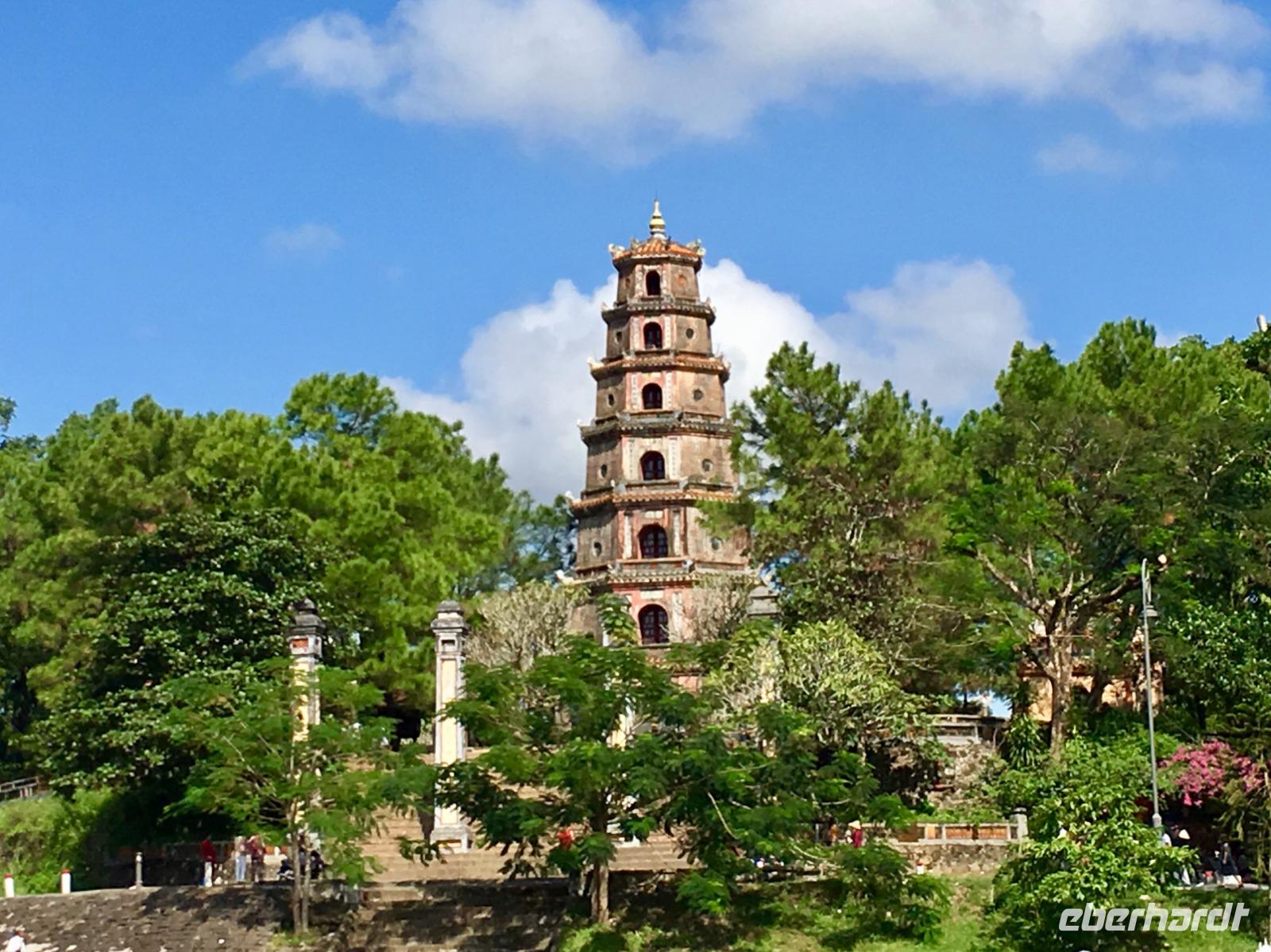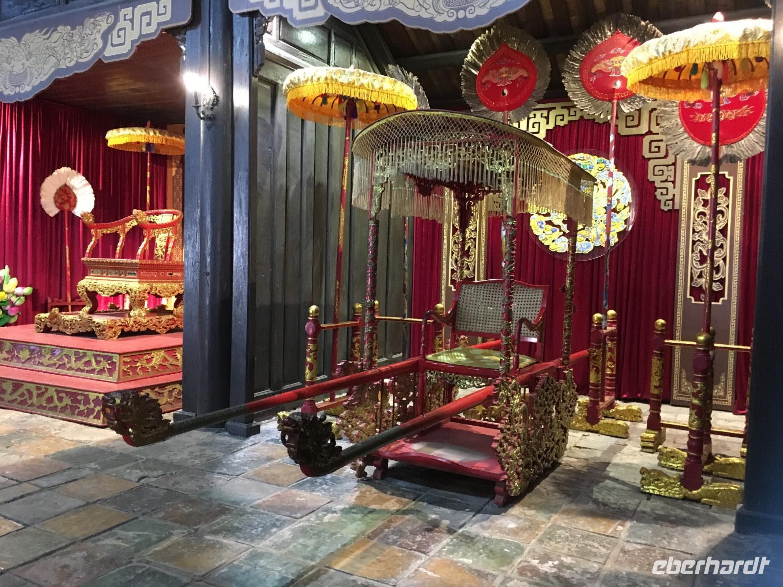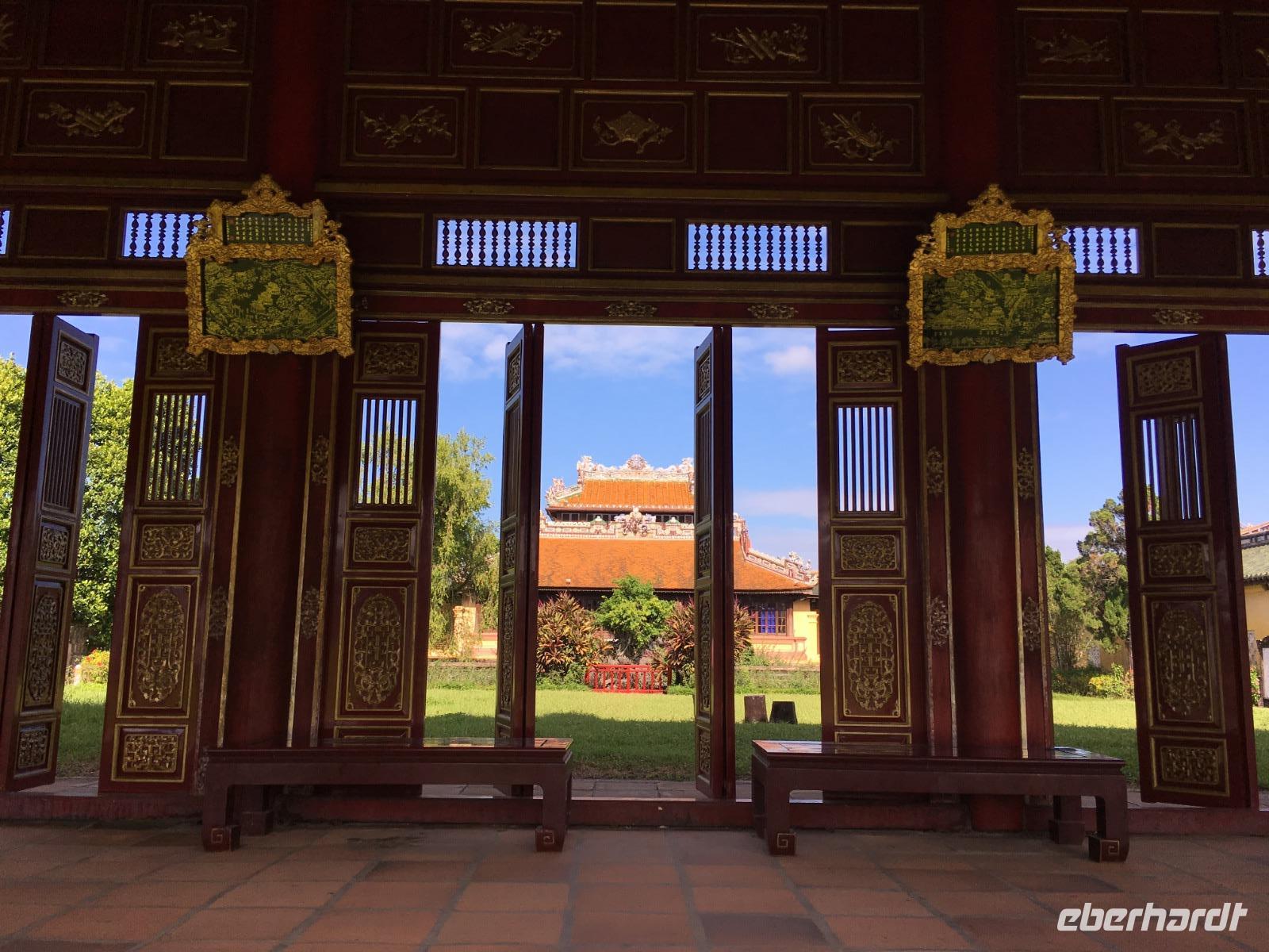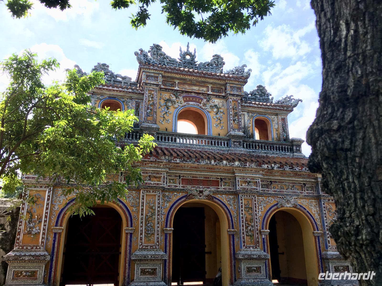 Ach wie schoen, es scheint die Sonne, wir koennen ausschlafen, der Dachterassenpool lockt, das ist Urlaub. Das Fruehstuecksbuffet ist so gross man braucht ein Fahrrad um es anzuschauen (Spruch eines Gastes). Um 9 Uhr fahren wir ab, aber bloss 10 Minuten spaeter sind wir schon angekommen. Heute faengt die Stadtrundfahrt in Hue auf dem Parfumfluss an. In einem glueckbringendem Drachenboot tuckern wir geruhsam dahin. Viele Fotos werden von den Pagoden, Bruecken, Fischer und anderen pitoresken kleineren Booten gemacht bis die Verkaufsdame auf dem Schiff nicht ihre Ware ausbreitet. Schoene Hemden, Morgenroecke, Schals und sonstiges wird nun feilgeboten und wir werden schwach.... Aber schau, da ist sie ja, die aelteste Pagode...wir legen an...noch schnell das Gekaufte bezahlen (am Schluss ist der Preis immer die Haelfte !) und freundliche Verabschiedung der Crew. Die steilen Stufen muessen nun gekraxelt werden, aber wir sind ja unterdessen schon fast Athleten, ehe wir vor der wunderbaren, nicht bombardierten, Tien Mu Pagodensaeule stehen. Die aelteste gusseisene Glocke wird auch betrachtet und dann gehts weiter zur Pagode die fuer die Ahnenverehrung noch immer gerne benutzt wird. Hier wohnen auch Moenche in ihren braunen Kutten und wir sehen wie die Jungen gerade aus der Schule wieder zurueck zur Pagode gehen. Es wird langsam warm und so sind wir gar nicht so ungluecklich in den gekuehlten Bus einzusteigen. 1 Kilometer spaeter, sind wir jedoch schon wieder angekommen...dieses mal bei dem beruehmten Kaiserpalast mit seiner Zitadelle, dem aeusseren Bereich der mit einer 11 Kilometer langen hohen Mauer eingefasst ist, dem Paradeplatz, einem Wassergraben, der Inneren Stadt inwelche man durch 4 Tore hineingehen kann und innendrinnen der Verbotenen Stadt die bloss fuer den Kaiser gedacht ist. Es ist ein sehr grosses Areal und wir koennten auch 2 Tage hier verweilen. Dieser Kaiserpalast war der Sitz von 10 Kaiser der Nguyen Dynastie. In der inneren Stadt lebten die Angestellten, Offiziere und Beamte. Hier ist auch die Audienz Halle. Um in die Verbotene Stadt zu kommen, gibt es bloss einen Eingang und fuer die Ehefrau, die Nebenfrauen sowie die Konkubinen gibt es auch keinen Ausgang, denn sie leben mit dem Kaiser und sind von der Aussenwelt abgeschieden. Bloss die Mutter des Kaisers und noch ein paar Eununche duerfen ausserdem in der Verbotenen Stadt leben und auch den Ausgang benutzen. Leider wurde waehrend der Kriegszeit vieles hier zerstoert, erst die Franzosen, dann die Amis, aber das Teehaus steht noch romantisch inmitten eines schoenen Teiches. Es ist so einladend, dass auch wir dort Tee und Kaffee trinken. Der Lesepavillon und der Wohnpalast sind noch groessten Teils original mit herrlich rot lackierten Holzsaeulen und Baldachine, dem Thron, der Saenfte und Tische sowie Stuehle. Rot und Gold wohin man schaut. Aussen sind die Pavillons mit Drachen, Schildkroeten, Phoenixe und Nghe verziert. Ein Phoenix ist ein Fabelvogel der Nghe ist jedoch ein Wulpertinger mit magischen Kraeften ! Wir lernen so vieles von Ngoc (Noch), dass wir uns nun ein gutes Bild machen koennen, wie das Leben auf dem vietnamesischen Hof anfangs des 19 Jhd bis ende des 20 Jhd ablief. Wir sind draufgekommen, dass man wirklich kein maennlicher Verwandter eines Beamten oder Offiziers sein wollte, denn wenn da was auf dem Hof nicht gerade passte, wurden bis zu 3 Generationen Maenner des Straeflings gekoepft. Auch eine Konkubine sein, ist nicht lustig, man ist eine von vielleicht 200, hat gebundene mini-Fuesse, darf nie raus, darf den Kaiser nie anschauen und wird aehnlich einer Fruehlingsrolle nackt in einen Teppich gewickelt und so zum Kaiser getragen wenn er sich gerade, zufaelligerweise, an einen erinnert. Besser Eberhardt Reisegast sein. Nun sind wir alle durchgeschwitzt und freuen uns auf den freien Nachmittag. Einige haben Massagen gebucht andere verweilen in der Stadt oder beim Pool. Wir gehen frueher schlafen, da wir morgen schon zeitig raus muessen zum Flughafen. Ich waere am liebsten ein Phoenix !