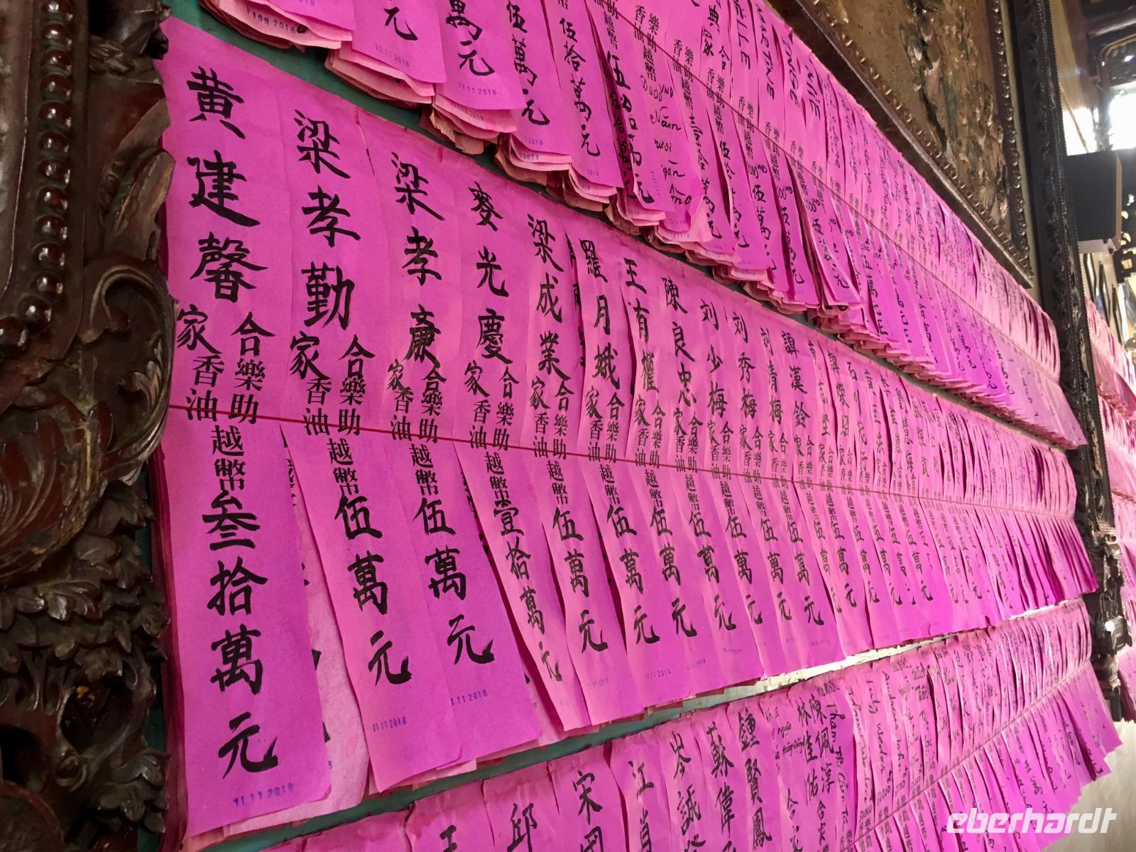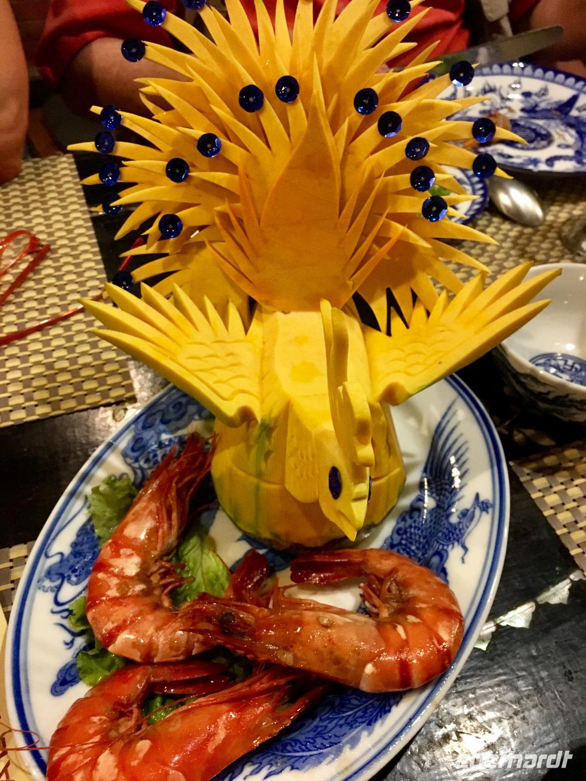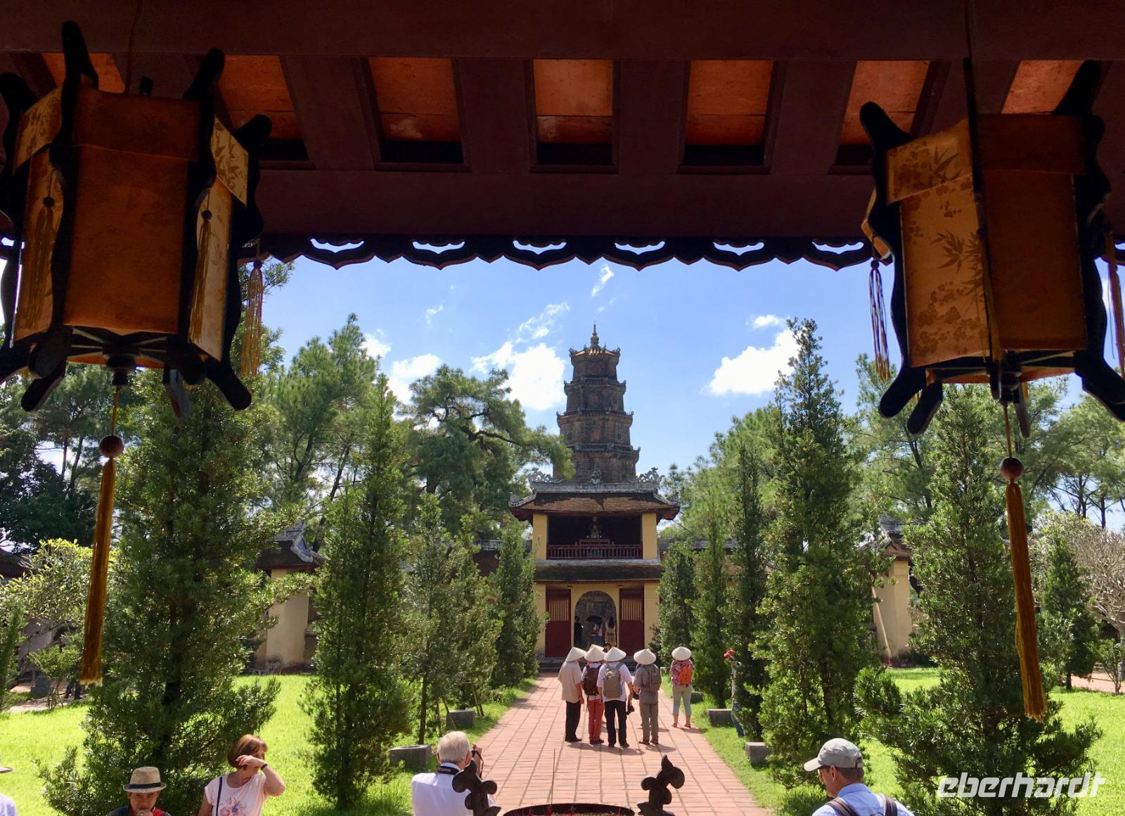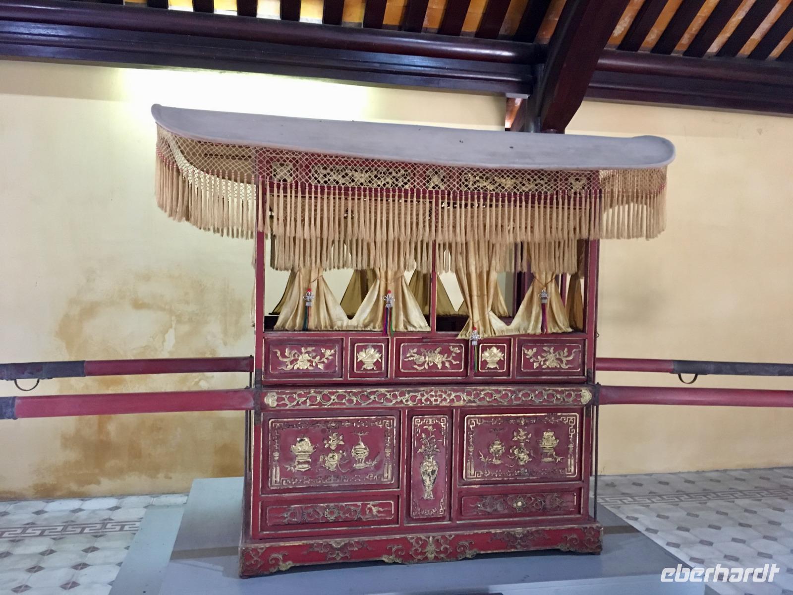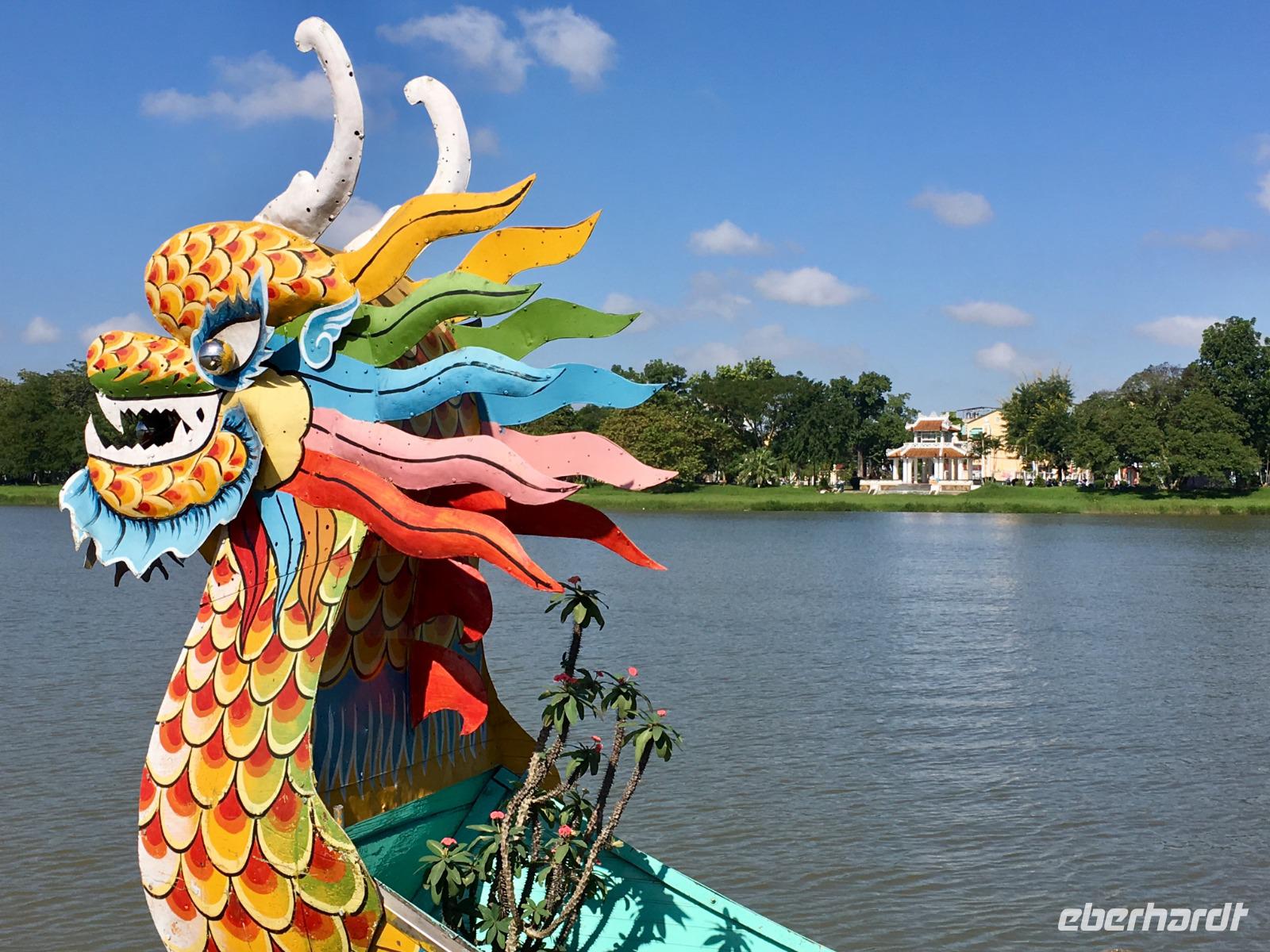 Ach wie schoen, es scheint die Sonne, wir koennen ausschlafen, der Dachterassenpool lockt, das ist Urlaub. Das Fruehstuecksbuffet ist so gross man braucht ein Fahrrad um es anzuschauen (Spruch eines Gastes). Um 9 Uhr fahren wir ab, aber bloss 10 Minuten spaeter sind wir schon angekommen. Heute faengt die Stadtrundfahrt in Hue auf dem Parfumfluss an. In einem glueckbringendem Drachenboot tuckern wir geruhsam dahin. Viele Fotos werden von den Pagoden, Bruecken, Fischer und anderen pitoresken kleineren Booten gemacht bis die Verkaufsdame auf dem Schiff nicht ihre Ware ausbreitet. Schoene Hemden, Morgenroecke, Schals und sonstiges wird nun feilgeboten und wir werden schwach.... Aber schau, da ist sie ja, die aelteste Pagode...wir legen an...noch schnell das Gekaufte bezahlen (am Schluss ist der Preis immer die Haelfte !) und freundliche Verabschiedung der Crew. Die steilen Stufen muessen nun gekraxelt werden, aber wir sind ja unterdessen schon fast Athleten, ehe wir vor der wunderbaren, nicht bombardierten, Tien Mu Pagodensaeule stehen. Die aelteste gusseisene Glocke wird auch betrachtet und dann gehts weiter zur Pagode die fuer die Ahnenverehrung noch immer gerne benutzt wird. Hier wohnen auch Moenche in ihren braunen Kutten und wir sehen wie die Jungen gerade aus der Schule wieder zurueck zur Pagode gehen. Es wird langsam warm und so sind wir gar nicht so ungluecklich in den gekuehlten Bus einzusteigen. 1 Kilometer spaeter, sind wir jedoch schon wieder angekommen...dieses mal bei dem beruehmten Kaiserpalast mit seiner Zitadelle, dem aeusseren Bereich der mit einer 11 Kilometer langen hohen Mauer eingefasst ist, dem Paradeplatz, einem Wassergraben, der Inneren Stadt inwelche man durch 4 Tore hineingehen kann und innendrinnen der Verbotenen Stadt die bloss fuer den Kaiser gedacht ist. Es ist ein sehr grosses Areal und wir koennten auch 2 Tage hier verweilen. Dieser Kaiserpalast war der Sitz von 10 Kaiser der Nguyen Dynastie. In der inneren Stadt lebten die Angestellten, Offiziere und Beamte. Hier ist auch die Audienz Halle. Um in die Verbotene Stadt zu kommen, gibt es bloss einen Eingang und fuer die Ehefrau, die Nebenfrauen sowie die Konkubinen gibt es auch keinen Ausgang, denn sie leben mit dem Kaiser und sind von der Aussenwelt abgeschieden. Bloss die Mutter des Kaisers und noch ein paar Eununche duerfen ausserdem in der Verbotenen Stadt leben und auch den Ausgang benutzen. Leider wurde waehrend der Kriegszeit vieles hier zerstoert, erst die Franzosen, dann die Amis, aber das Teehaus steht noch romantisch inmitten eines schoenen Teiches. Es ist so einladend, dass auch wir dort Tee und Kaffee trinken. Der Lesepavillon und der Wohnpalast sind noch groessten Teils original mit herrlich rot lackierten Holzsaeulen und Baldachine, dem Thron, der Saenfte und Tische sowie Stuehle. Rot und Gold wohin man schaut. Aussen sind die Pavillons mit Drachen, Schildkroeten, Phoenixe und Nghe verziert. Ein Phoenix ist ein Fabelvogel der Nghe ist jedoch ein Wulpertinger mit magischen Kraeften ! Wir lernen so vieles von Ngoc (Noch), dass wir uns nun ein gutes Bild machen koennen, wie das Leben auf dem vietnamesischen Hof anfangs des 19 Jhd bis ende des 20 Jhd ablief. Wir sind draufgekommen, dass man wirklich kein maennlicher Verwandter eines Beamten oder Offiziers sein wollte, denn wenn da was auf dem Hof nicht gerade passte, wurden bis zu 3 Generationen Maenner des Straeflings gekoepft. Auch eine Konkubine sein, ist nicht lustig, man ist eine von vielleicht 200, hat gebundene mini-Fuesse, darf nie raus, darf den Kaiser nie anschauen und wird aehnlich einer Fruehlingsrolle nackt in einen Teppich gewickelt und so zum Kaiser getragen wenn er sich gerade, zufaelligerweise, an einen erinnert. Besser Eberhardt Reisegast sein. Nun sind wir alle durchgeschwitzt und freuen uns auf den freien Nachmittag. Einige haben Massagen gebucht andere verweilen in der Stadt oder beim Pool. Wir gehen frueher schlafen, da wir morgen schon zeitig raus muessen zum Flughafen. Ich waere am liebsten ein Phoenix !