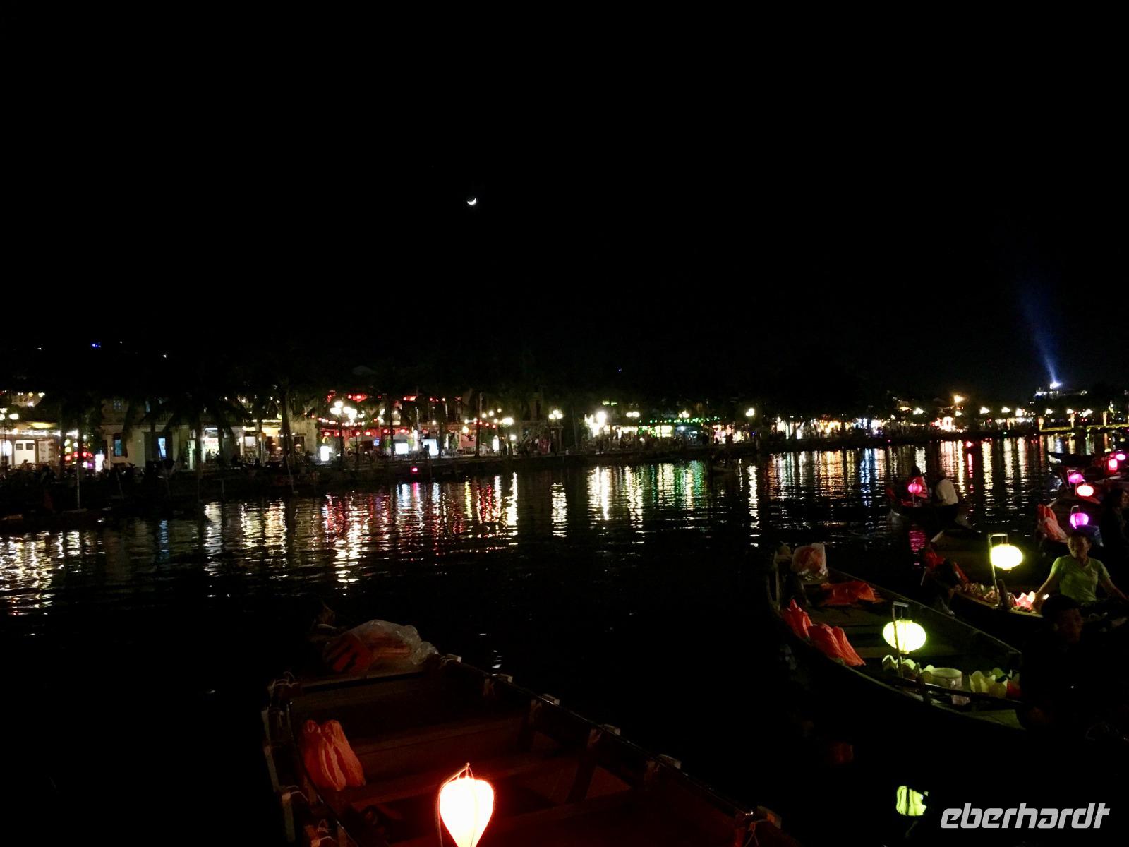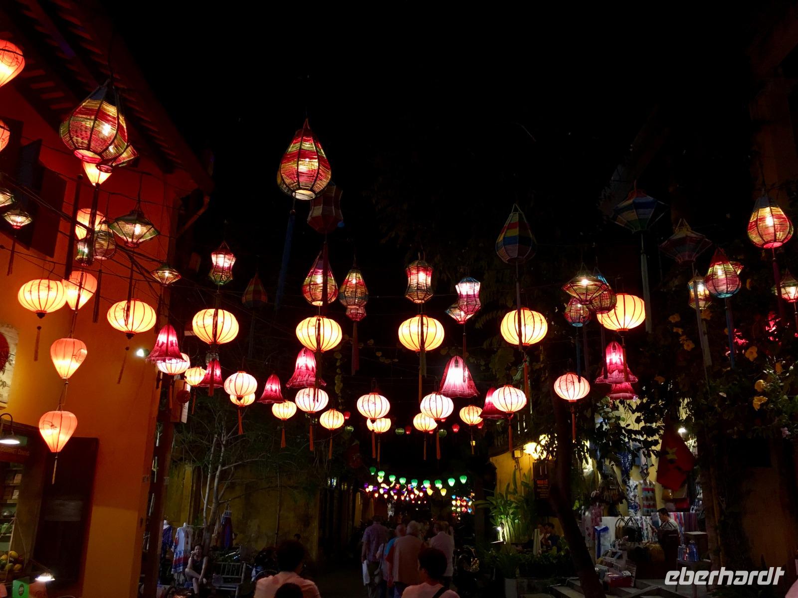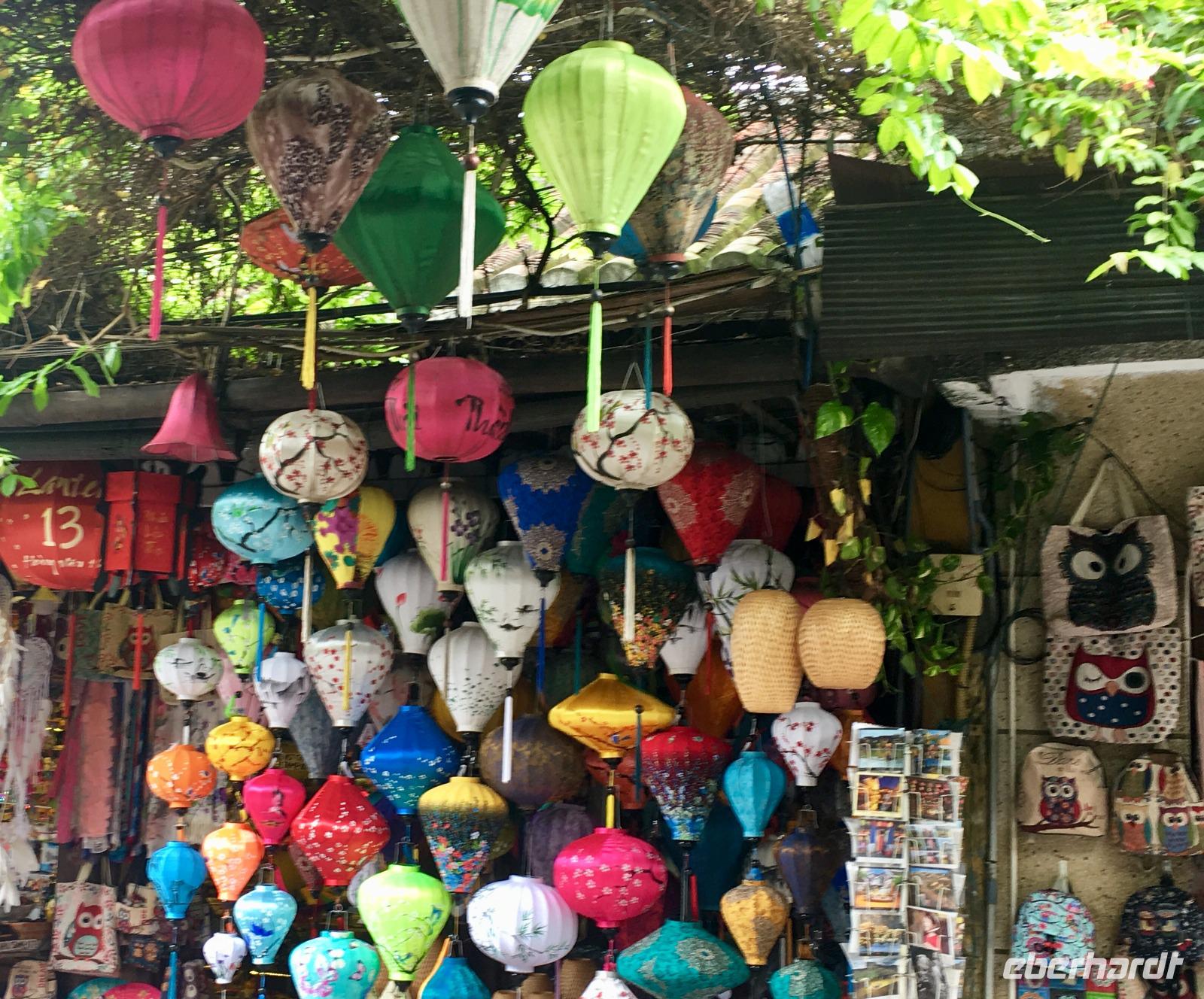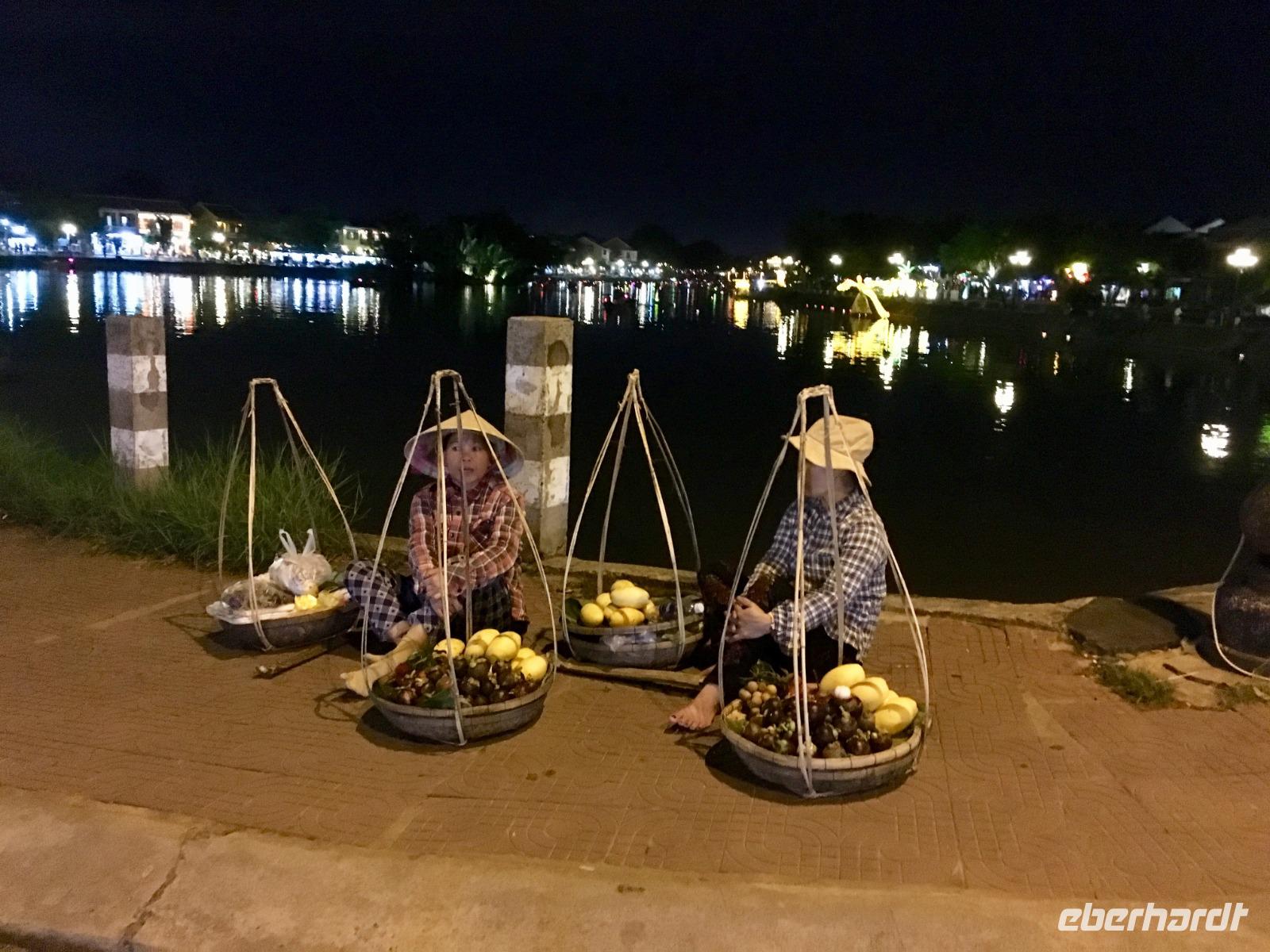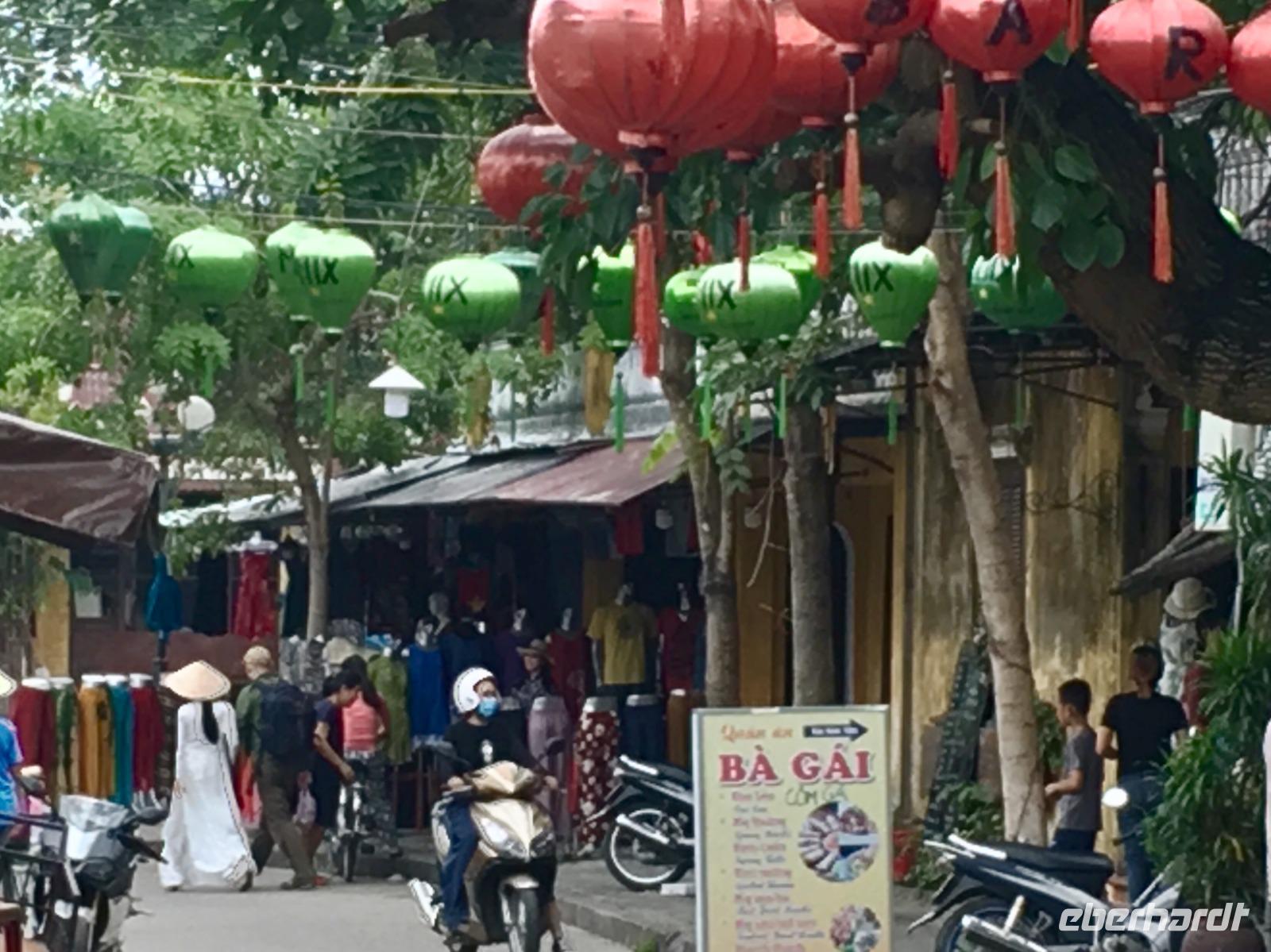 Aufwachen, rausschauen. Huch, sind die Vorhaenge doch zugezogen ? Nein, es ist soooo neblig, man sieht nicht ueber die Terrasse also nichts wie unter die Dusche. Wir wollten doch immer schon im warmen Nebel draussen duschen, oder doch in den kalten Privatpool huepfen ? Bald werden die Berge wieder frei gegeben und ausgepackt, das Fruehstueck ruft und gehts zum auschecken und abfahren. Wir fahren heute ueber die Berge zurueck nach Hanoi. Das dauert auch gute 3 ½ Stunden. Also machen wir unterwegs immer wieder Fotostopps und auch sonstige Pausen. Wir lernen was hier so angebaut und wie es vermarktet wird. Apfelsinen und Mandarinen, Bananen und Gemuese, wo man hinschaut. Eine Bueffelherde wird gerade ueber die Strasse gefuehrt und etliche Maerkte zieren die Gehsteige. So gelangen wir wieder in die Stadt Hanoi. Mai oh mai, so viel Verkehr, so hohe Gebaeude, so ein Hupkonzert und so ein Durcheinander von Verkehrsteilnehmer. Wo ist die Idylle geblieben ? Rechtzeitig kommen wir beim Flughafen an. Nun bedanken wir uns noch bei Ot fuer die Reiseleitung, beim Besten Fahrer fuer seine perfekten Fahrkuenste und beim Co-Piloten fuer seine immerwaehrende Hilfe und sein stylisches Aussehen. Einchecken, Koffer abgeben, Gate suchen ist alles kein Problem. Aber oh jeh, unser Flug hat Verspaetung - erst eine ½ Stunde dann noch 1 Stunde dazu. Die Hauptsache, wir kommen gut in Danang an. Unser Reiseleiter Mr. Ngoc (ausgesprochen «Noch») scheint auch gluecklich zu sein, dass wir endlich ankommen. Eine kurze Stunde spaeter sind wir in Hoi An und spazieren gleich zum Fluss wo uns ein feines Abendessen gereicht wird. Dies Restaurant ist von hunderten von Lampions beleuchtet und besonders romantisch. Wir sitzen, bis wir nicht die letzten Gaeste sind. Dann erst, checken wir in unserem schoenen Hotel am Fluss ein.