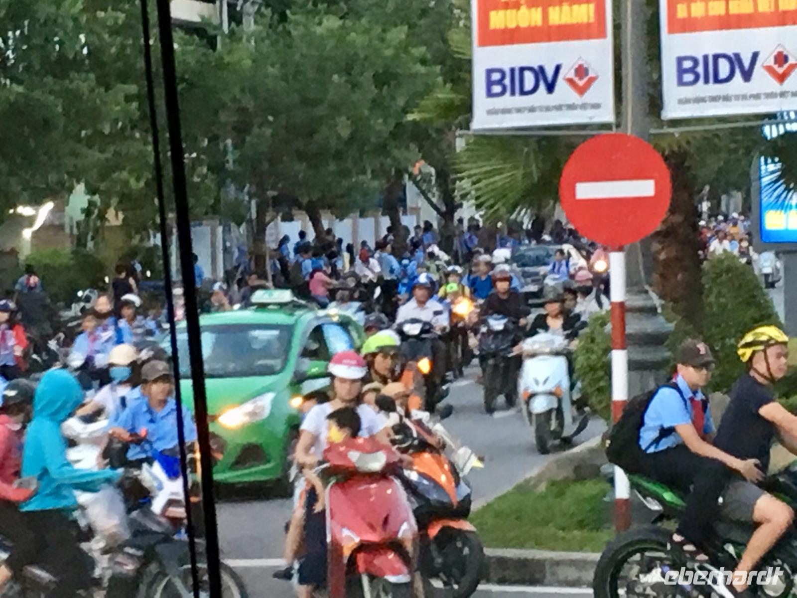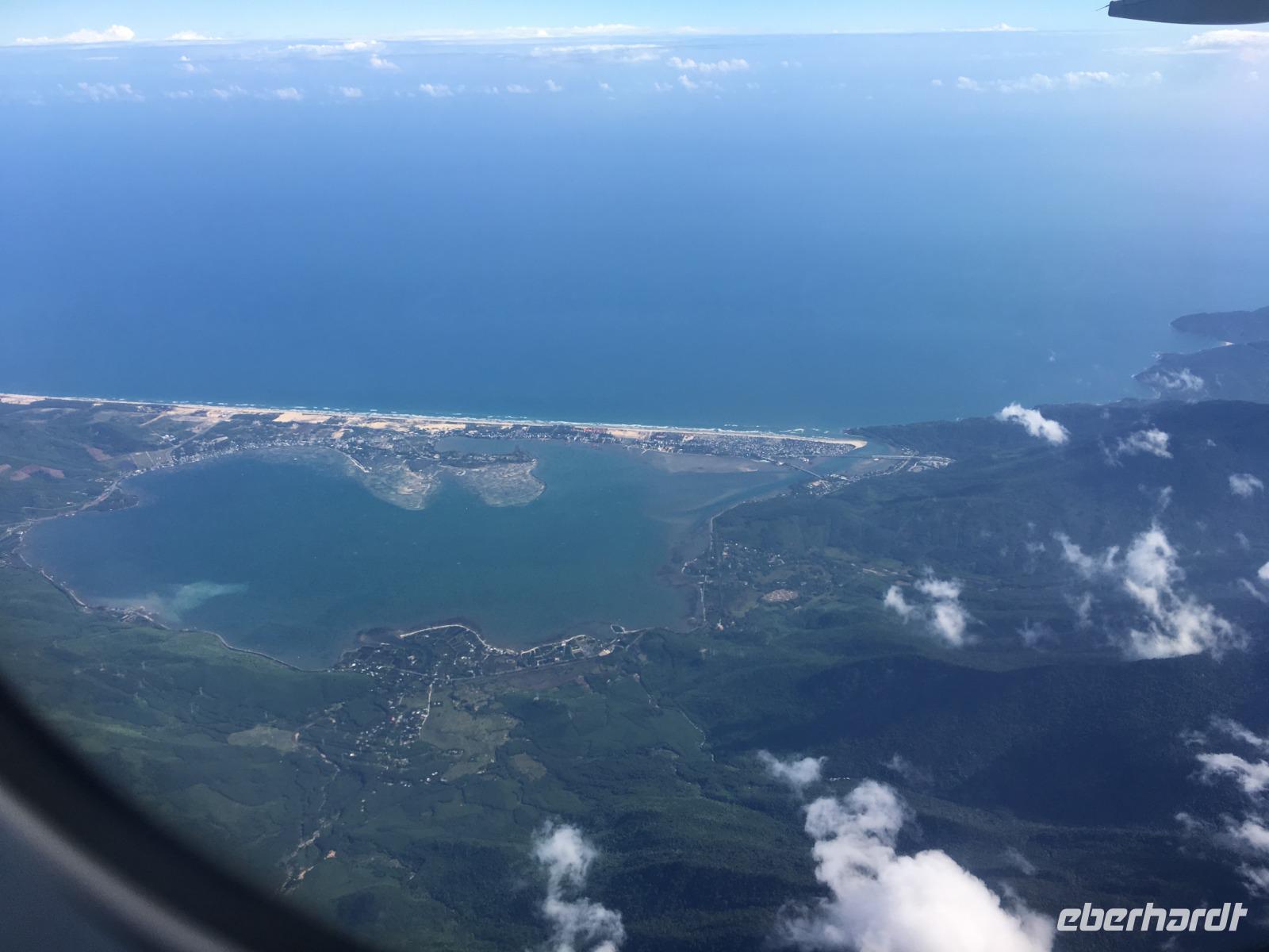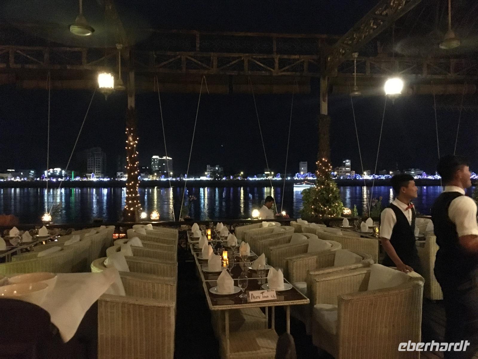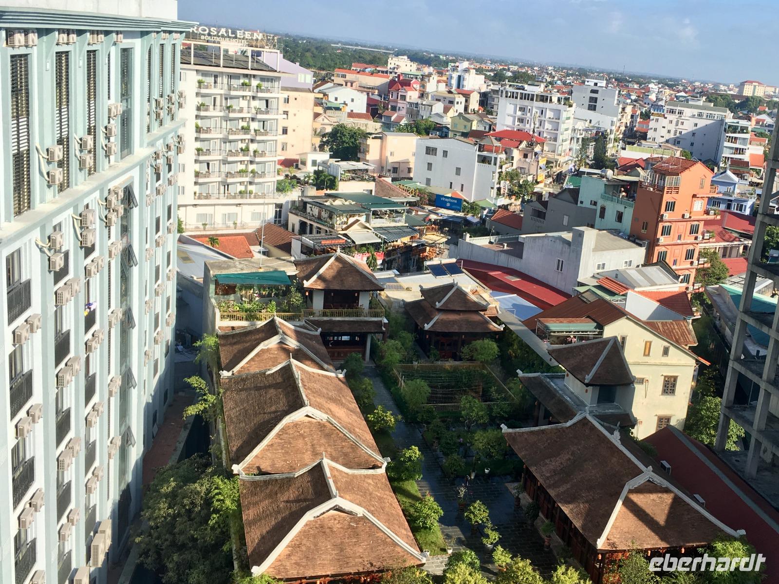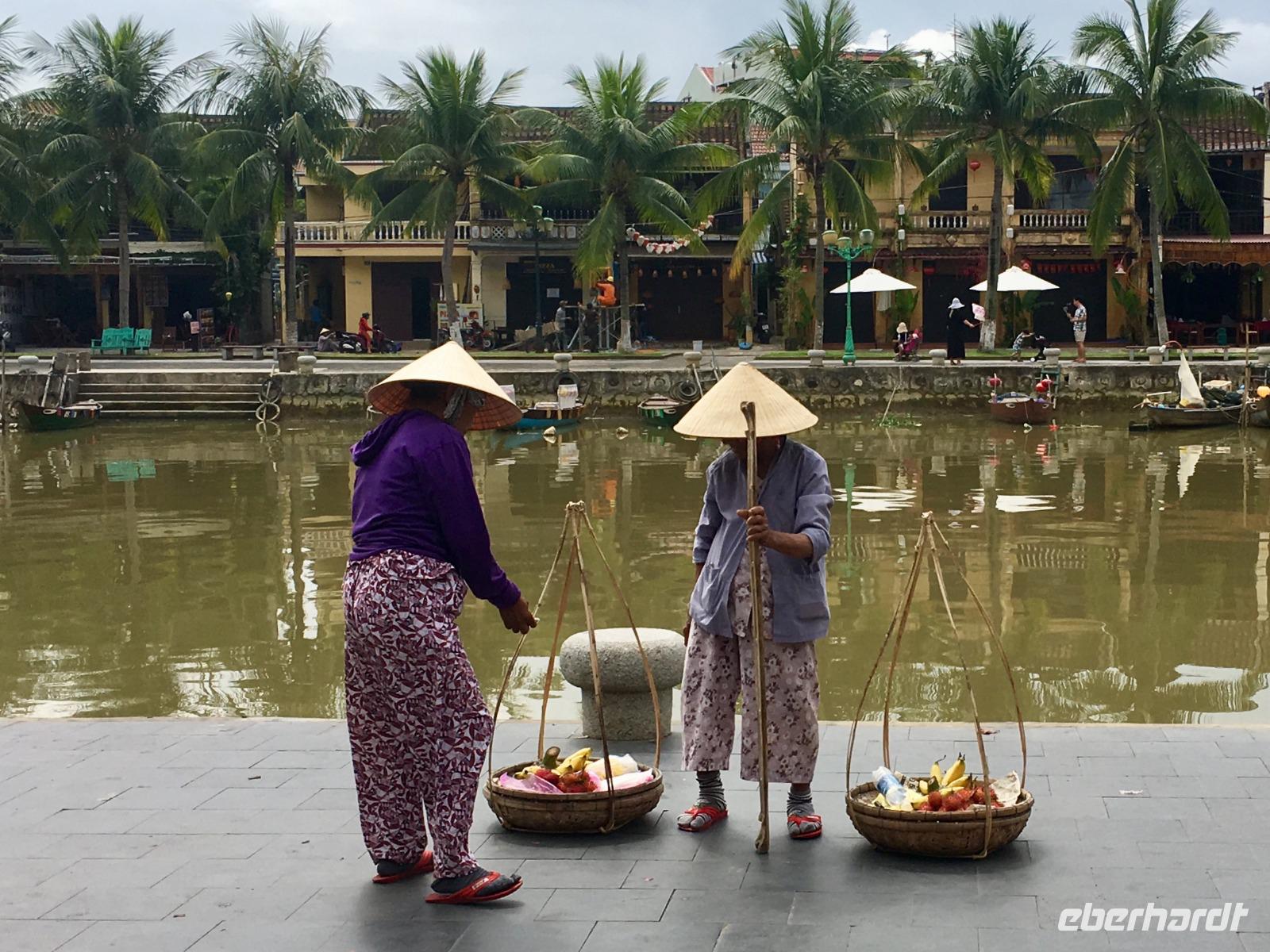 Aufwachen, rausschauen. Huch, sind die Vorhaenge doch zugezogen ? Nein, es ist soooo neblig, man sieht nicht ueber die Terrasse also nichts wie unter die Dusche. Wir wollten doch immer schon im warmen Nebel draussen duschen, oder doch in den kalten Privatpool huepfen ? Bald werden die Berge wieder frei gegeben und ausgepackt, das Fruehstueck ruft und gehts zum auschecken und abfahren. Wir fahren heute ueber die Berge zurueck nach Hanoi. Das dauert auch gute 3 ½ Stunden. Also machen wir unterwegs immer wieder Fotostopps und auch sonstige Pausen. Wir lernen was hier so angebaut und wie es vermarktet wird. Apfelsinen und Mandarinen, Bananen und Gemuese, wo man hinschaut. Eine Bueffelherde wird gerade ueber die Strasse gefuehrt und etliche Maerkte zieren die Gehsteige. So gelangen wir wieder in die Stadt Hanoi. Mai oh mai, so viel Verkehr, so hohe Gebaeude, so ein Hupkonzert und so ein Durcheinander von Verkehrsteilnehmer. Wo ist die Idylle geblieben ? Rechtzeitig kommen wir beim Flughafen an. Nun bedanken wir uns noch bei Ot fuer die Reiseleitung, beim Besten Fahrer fuer seine perfekten Fahrkuenste und beim Co-Piloten fuer seine immerwaehrende Hilfe und sein stylisches Aussehen. Einchecken, Koffer abgeben, Gate suchen ist alles kein Problem. Aber oh jeh, unser Flug hat Verspaetung - erst eine ½ Stunde dann noch 1 Stunde dazu. Die Hauptsache, wir kommen gut in Danang an. Unser Reiseleiter Mr. Ngoc (ausgesprochen «Noch») scheint auch gluecklich zu sein, dass wir endlich ankommen. Eine kurze Stunde spaeter sind wir in Hoi An und spazieren gleich zum Fluss wo uns ein feines Abendessen gereicht wird. Dies Restaurant ist von hunderten von Lampions beleuchtet und besonders romantisch. Wir sitzen, bis wir nicht die letzten Gaeste sind. Dann erst, checken wir in unserem schoenen Hotel am Fluss ein.