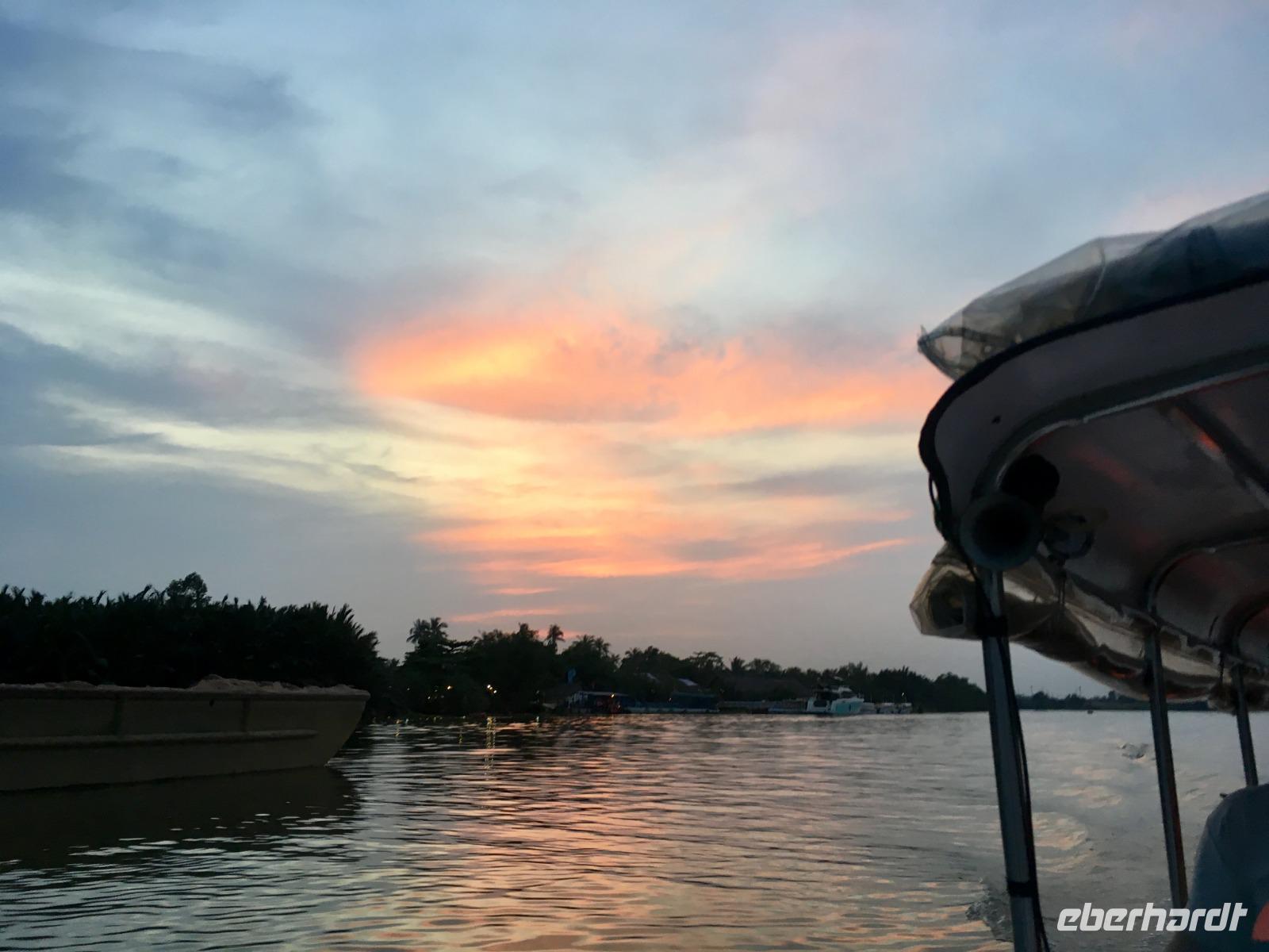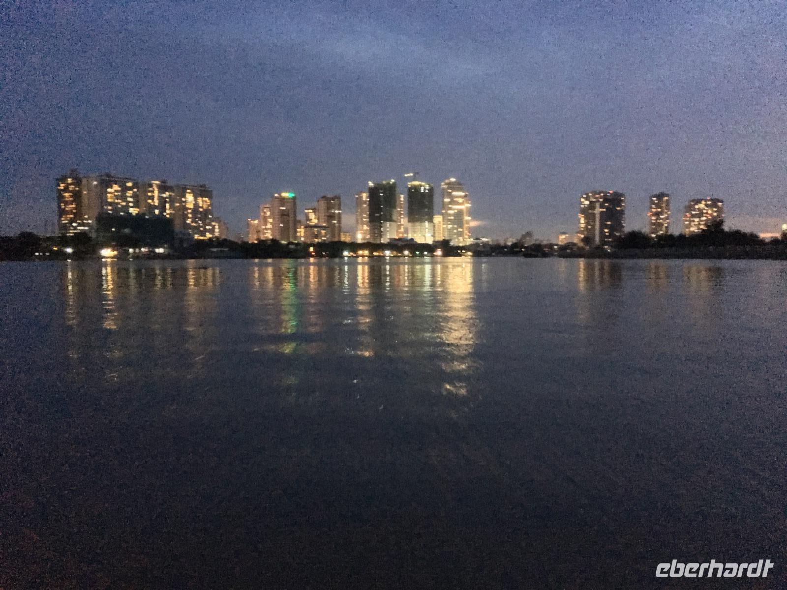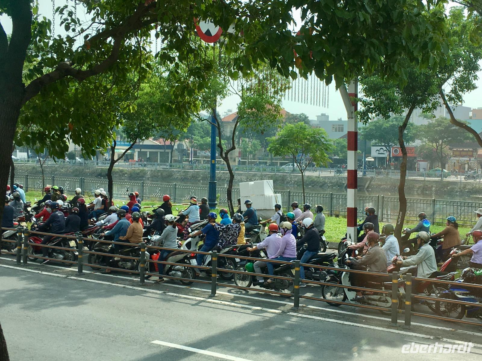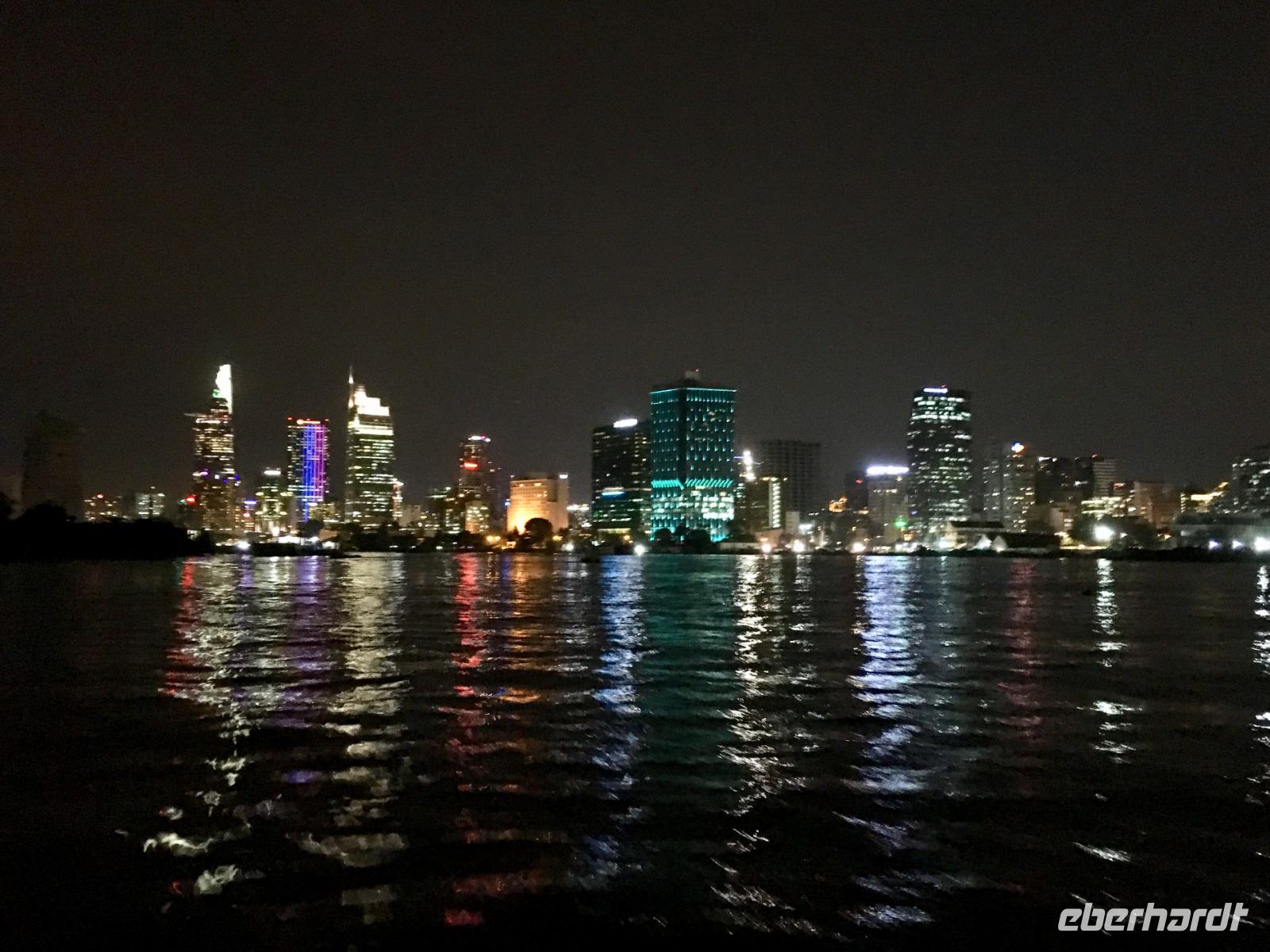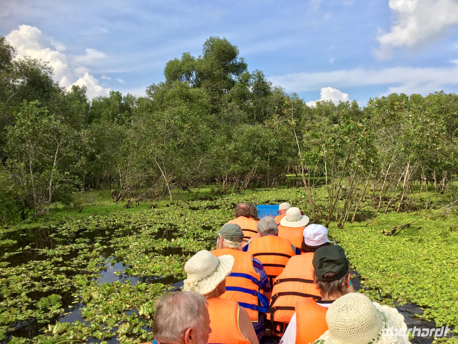 Uiii, 5 Uhr in der Frueh, Weckruf, nun aber auf, denn heute erwartet uns ein wunderbarer Tag. Erst der Flug von Hue nach Saigon. Wir kommen alle gut und mit Koffer bestueckt in Saigon an. Erwartet werden wir von Mrs. Huong, unsere Reiseleitung in Suedvietnam. Sie zeigt uns ihr Saigon auf der anschliessenden Stadtrundfahrt. Als erstes aber, laesst sie uns aussteigen und jeder darf in eine Riksha steigen. So erleben wir Saigons Chinatown mit seinen engen Gassen, gedeckten Maerkten, beladenen Verkaufslaeden und dichtem Mofa-Verkehr einmal anders. Vorbei am chinesischen Tuch-, Tabak-und Plastikmarkt, enlang des Blumen-,Fleisch- und Gemuesemarktes bis alle unsere Sinne geweckt und durchwuehlt sind. Die Pagodenbesichtigung der 10'000 Buddahs ist danach eine echte Erholung und der Ventilator beim Eingang in die Pagode, eine Erleichterung. Heute ist es schwuel und heiss, aber das sei immer so, jetzt sei Winter und sehr angenehm. Wir sind durchgeschwitzt und vom Verkehr in Staub gehuellt. Aber es muss Winter sein, denn die Vietnamesinnen auf ihren Mofas sind von Kopf bis Fuss fest eingekleidet sogar das Gesicht und die Haende werden eingedeckt und geschuetz, nicht nur gegen die Sonne, sondern auch gegen all den Staub ! Nun fahren wir mit dem Bus zum grossen Markt, wo wir auch ein feines, leichtes Mittagessen kosten. Sogar Clinton hatte in demselben Lokal schon gegessen. In dem franzoesischen Viertel sehen wir sehr schoene Haeuser der Kolonialzeit, hier steht auch die Kathedrale von Notre Dame, die Oper, sowie das Stadtamt. In dem Postamt sehen wir auch die gemalene Landkarte von damals und der 83-jaehrige Uebersetzer sitzt auch noch auf seinem Sessel. Er hat nun weniger Arbeit als frueher, meint er, Google Translator hat ihm viel Arbeit weggenommen. Wir werden zu geuebten Bus-Ein- und Aussteiger trainiert ! denn auch in der Fuzo steigen wir aus, damit wir das gelbe Rathaus besichtigen koennen. In dieser 2'000 Km2 grossen Stadt mit ihren 13 Mio Einwohner und 5'000 Mofas ist ganz schoen viel los. Bald checken wir in unser schmuckes Hotel ein und erholen uns ehe es auf unserer Erlebnis Tour weitergeht. Zwei Minibusse fuehren uns an eine Anlegestelle des Saigon Flusses wo unser Boot schon am Pier liegt. Auf dem Boot wird uns nun feierlich unser «Geschenk» uebergeben .... und viel Bier dazu. Die Fahrt ist einmalig, wir sehen diese chaotische Stadt in einem ganz neuen Kleid. Die beleuchteten Hochhaeuser ragen aus dem Lichtermeer der Stadt heraus, sie glitzern und glaenzen im Abendhimmel und spiegeln sich in dem ruhigen Saigon Fluss. Der Sonnenuntergang ist hier besonders schoen und die Stadt wird echt romantisch. Noch ein Bierchen.... also Mo Hai Ba Gioooo und die Freude und Gemuetlichkeit nehmen konstant zu. Nach 2 Stunden wollen wir gar nicht mehr aussteigen. Die 2 Minibusse aber, fahren uns nun zum einzigartigen Abendessen auf einer Dachterasse. Inmitten Vietnamesen werden wir verkoestigt wie die Kaiser, neun Gaenge und 2 grosse Bierbehaelter spaeter, schauen wir auf einen langen und wunderschoenen Tag in Saigon zurueck. Zur Verdauung bietet sich nun der Abendspaziergang zum Hotel an.