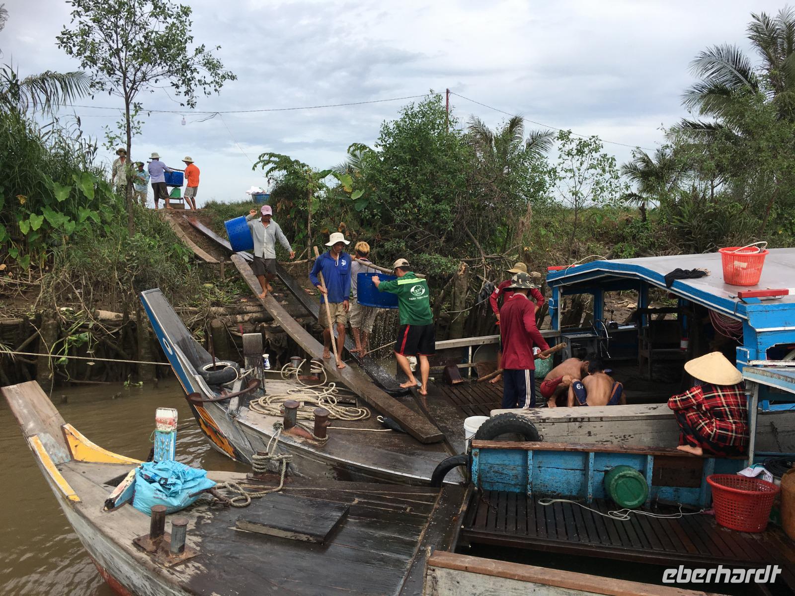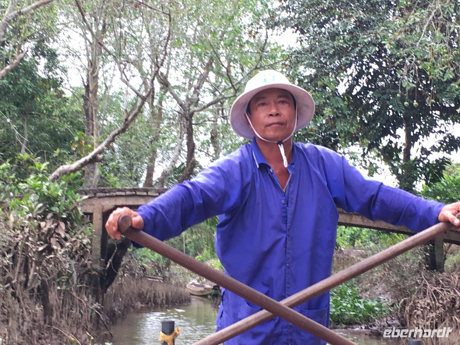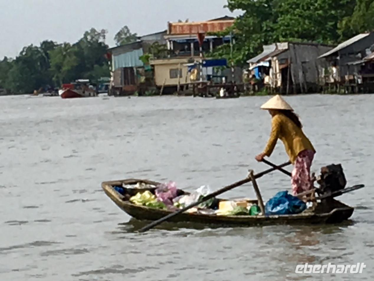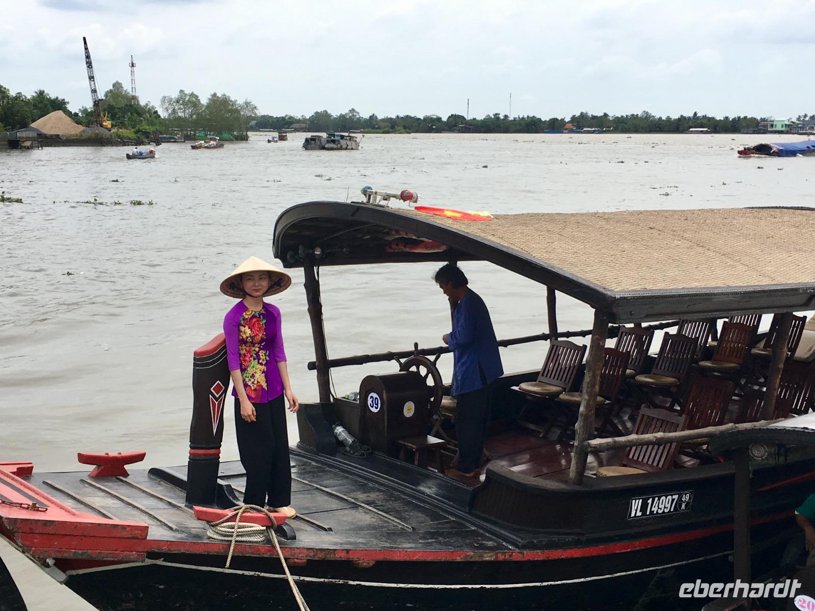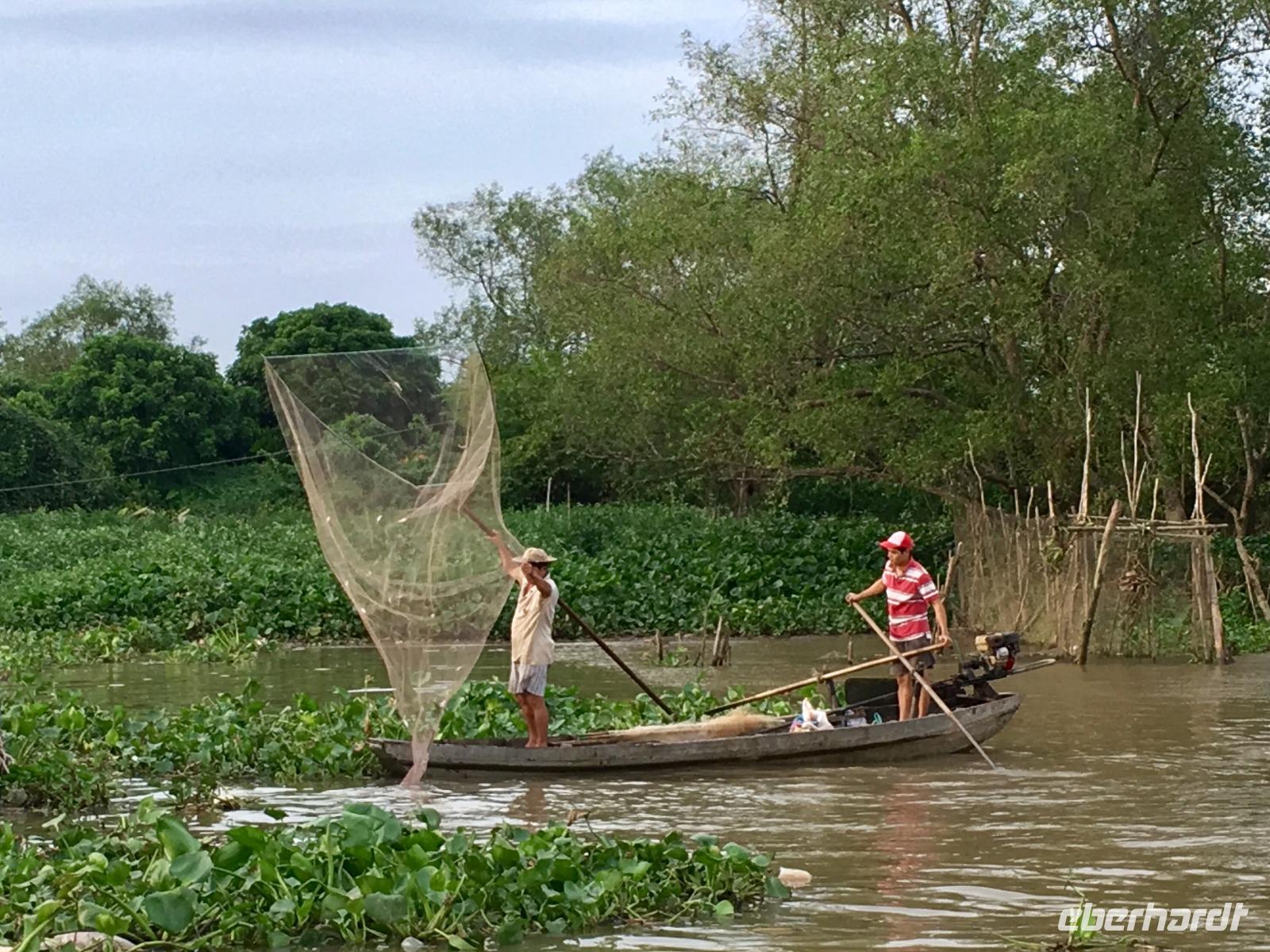 Heute gehts wieder gemuetlicher her, wie im Urlaub, fahren wir um 8:30 los. Das Mekong Delta wartet schon auf uns und wir sind gespannt. Vorerst fahren wir jedoch durch die Stadt hinaus und kommen auch an dem Wiedervereinigungspalast vorbei. Seine Geschichte ist sehr interessant und zeugt von der Zeit nach dem letzten Krieg in Vietnam. Bald sind wir aus der Stadt draussen und Reisfelder loesen die Hochhaeuser ab. Der Reis wurde bereits abgeerntet und der Spreu wird nun gesammelt und an die Ziegeleien als Brennmaterial verkauft. Hier wird alles wiederverwertet, verkauft und nochmals gebraucht. In den verschiedenen Doerfer sehen wir Zeugen vieler Religionen Moscheen, Hindu Tempel, Pagoden und Kirchen laden Glaeubige ein. Auf den Strassenmaerkten gibt es auch lebende, kleine, schwarze Voegelchen zu kaufen. Diesen gibt man seine guten Wuensche mit auf den Flug in die Freiheit! Nicht ueberall wird Reis angepflanzt in den Wasserfelder, sondern einige werden als Entenfarmen, Fischaufzuchten und Schlangenzuchten verwendet. Waehrend der Fahrt erklaert uns Huong auch vieles ueber Geschichte, Religion und die Cu Chi Tunnel. Diese unterirdischen engen Gaenge wurden waehrend der verschiedenen Kriege gebaut, teils um dem Feind zu entkommen aber auch um den Feind in der Nacht ueberfallen zu koennen. Bloss die schlanken Vietnamesen konnten in diese Unterwelt abtauchen, da die Gaenge 50-60cm breit und etwa 1Meter hoch sind. Sie konnten dort bis zu einer Woche leben, Vorratskammern sowie Schlafmoeglichkeiten, Pagode, Kueche, Lazaret, Munitionslager usw waren alle vorhanden. Nur gut, dass diese schreckliche Zeit endlich ein Ende gefunden hat und Vietnam heute voll aufbluehen kann. Bald veraendert sich die Landschaft und Duria, Rambutan, Papaya, Mango, Kokosnuss und viel andere Fruechte, Nuesse und Gemuese werden angebaut. Fluesse ziehen durch die Plantagen und ploetzlich sehen wir ihn...der Mekong Fluss. Aussteigen und in ein schoenes langes Boot einsteigen denn nun gehts mit dem Schiff weiter. Der Mekong ist breit und braun, viele Wasserhyazinthen schwimmen obenauf und Schiffe aller Art und Gattungen benutzen das Gewaesser. Wir hoeren Musik am Ufer und denken natuerlich an ein Fest, aber nein, es ist eine Trauerkapelle und sie spielen die Lieblingslieder des Verstorbenen. Ah, wir halten an, vorsichtig steigen wir aus und gehen in eine Verkaufshalle wo wir lernen wie man Reispapier herstellt fuer die Fruehlingsrollen, wie man Kokosnuesse in wunderbare Bonbons verzaubern- und wie man Popreis herstellen kann mit schwarzem Mekongsand. Alles ist aeusserst interessant und der Reisschnaps ist auch koestlich. Nach der Besichtigung einer Wuergeschlange eilen wir wieder zum Boot denn nicht weit von hier, warten die Damen schon auf uns mit ihren Sampan. Sampan sind kleinere hoelzerne Ruderboote womit wir nun in einen Seitenarm des Mekong Flusses gefuehrt werden. So lernen wir auch das Leben mit, neben und auf dem Wasser kennen. Alles ist tropisch gruen, Pflanzen wuchern, Villen thronen und einfachere Huetten verstecken sich hinter Fruchtbaeumen, Palmen und Blumen. Diese Fahrt ist ein tolles Erlebnis. Aber es will nicht enden, denn bald sind wir bei einem Restaurant und hier werden wir bewirtschaftet als haetten wir 10 Tage nichts gegessen ! Ein wunderschoen hergerichteter Fisch im Ganzen wird uns, unter anderem, gereicht. Er steht mit einer Dekoration im offenen Maul, gebraten auf dem Tisch und er heisst Elefantenohrfisch. Nein, er hat keine grossen Ohren und auch keinen Ruessel, aber seine Form gibt ihm den Namen. Es ist sehr lecker und gerne waeren wir noch laenger gesessen aber die Ebbe holt uns ein und das Wasser schrumpft gute 1 ½ Meter ! Wenn wir nicht im Schlamm gehen wollen, muessen wir wieder aufs Boot. Mit einem Umweg, entkommen wir der Ebbe und gelangen so zu einem Privathaus. Dort wird uns eine musikalische Vorstellung geboten mit Gesang ueber Liebe und Arbeit. Besonders das eine Lied wo Mutter der Tochter erklaert, dass sie nun heiraten wird, das Elternhaus verlassen muss und die Schwiegereltern verehren soll, ist tragisch und schoen gesungen. Daraufhin gehts fuer uns wieder weiter mit dem Boot bis nach Vinh Long, von wo wir nach Can Tho weiterfahren mit dem Bus. Was fuer ein herrlicher Tag auf dem Mekong. Am Abend gehen wir noch am Flussufer auf der schoenen neuen Promenade flanieren ehe wir muede ins Bett fallen.