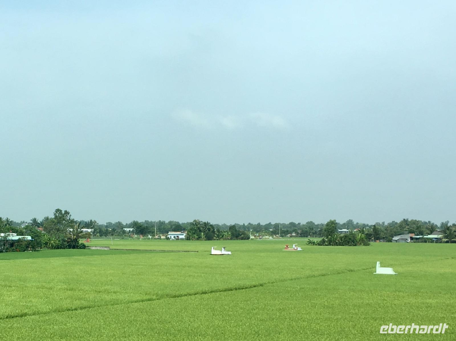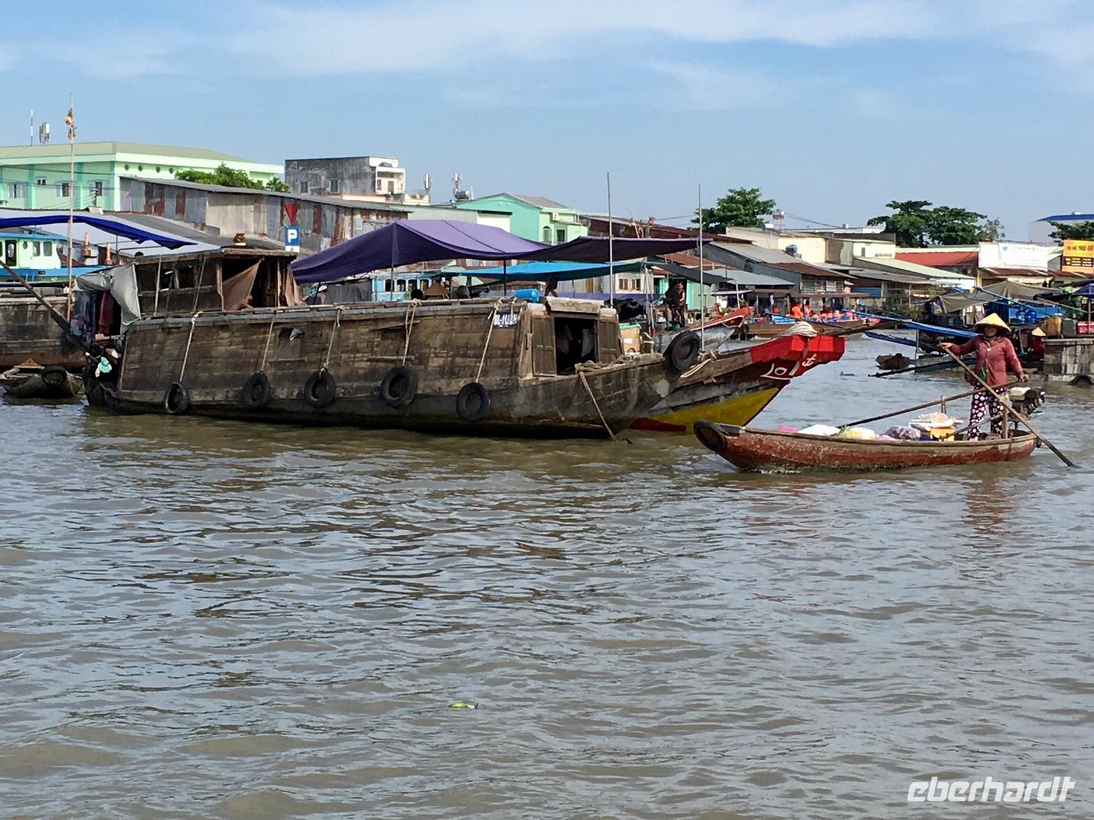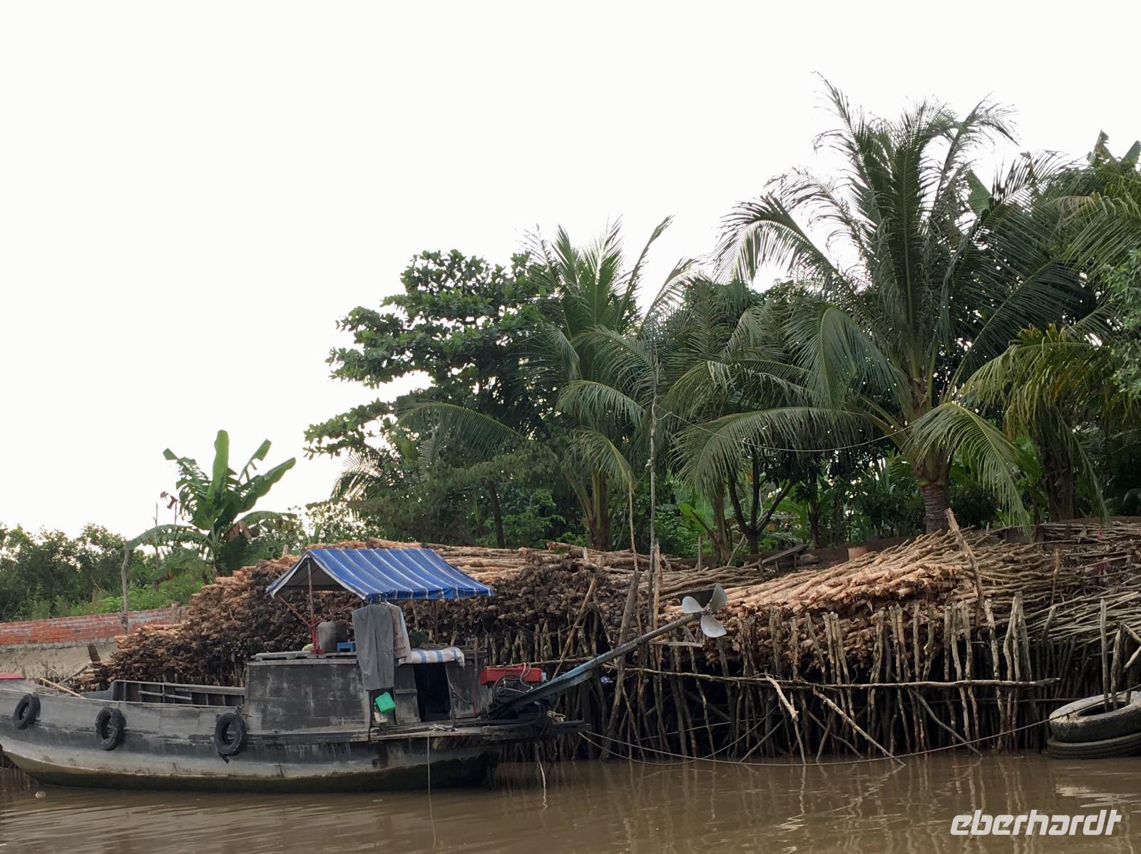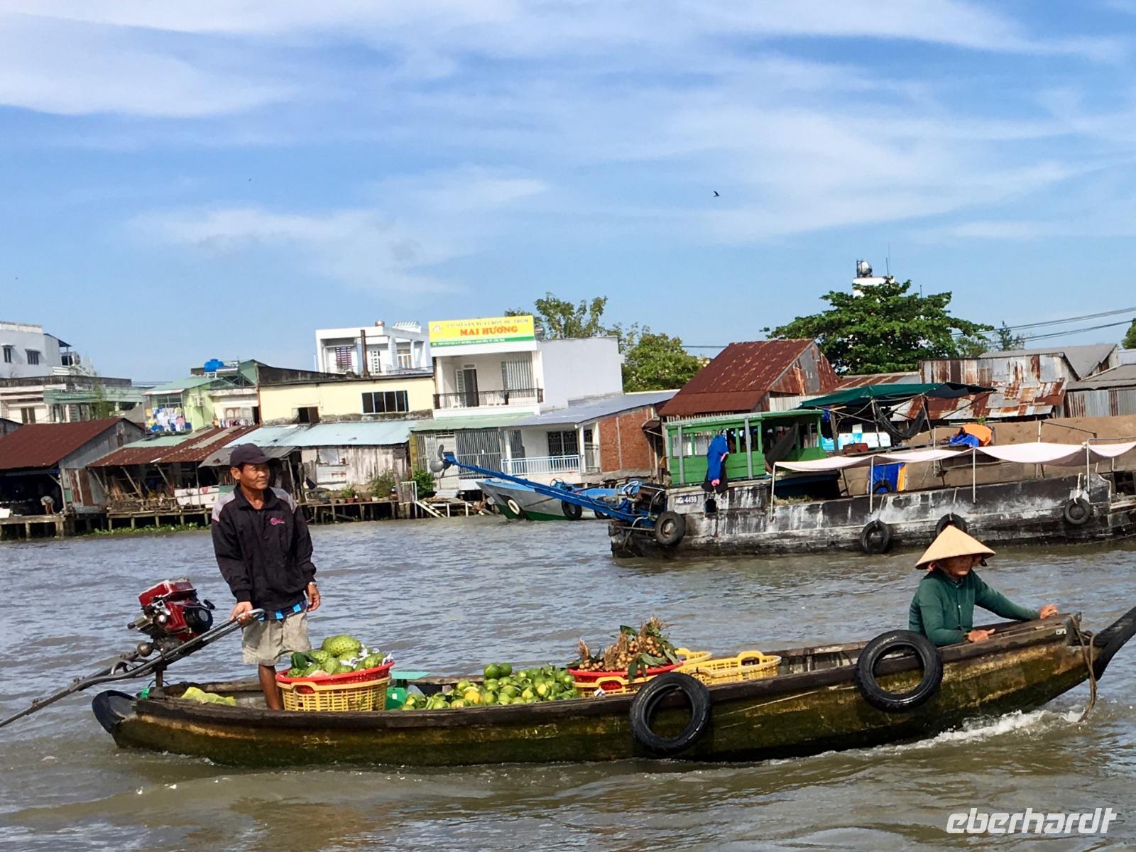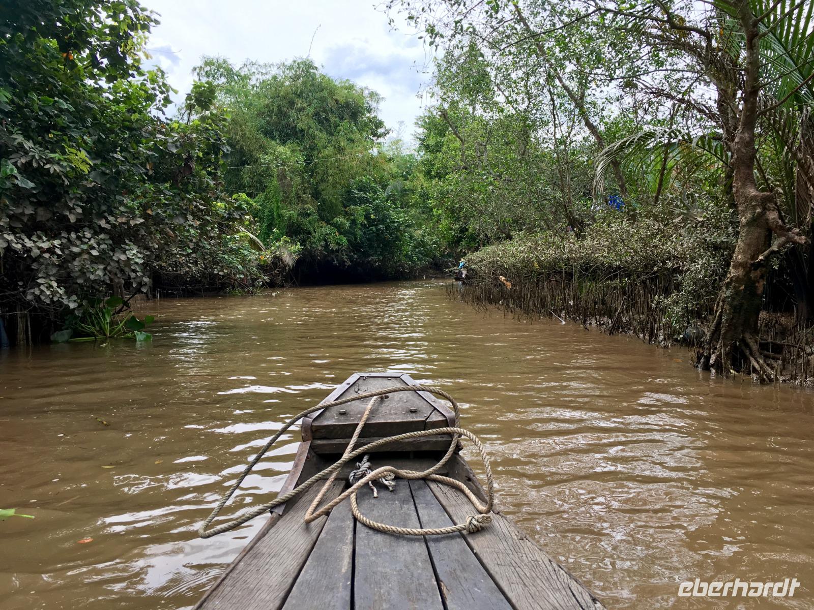 Heute gehts wieder gemuetlicher her, wie im Urlaub, fahren wir um 8:30 los. Das Mekong Delta wartet schon auf uns und wir sind gespannt. Vorerst fahren wir jedoch durch die Stadt hinaus und kommen auch an dem Wiedervereinigungspalast vorbei. Seine Geschichte ist sehr interessant und zeugt von der Zeit nach dem letzten Krieg in Vietnam. Bald sind wir aus der Stadt draussen und Reisfelder loesen die Hochhaeuser ab. Der Reis wurde bereits abgeerntet und der Spreu wird nun gesammelt und an die Ziegeleien als Brennmaterial verkauft. Hier wird alles wiederverwertet, verkauft und nochmals gebraucht. In den verschiedenen Doerfer sehen wir Zeugen vieler Religionen Moscheen, Hindu Tempel, Pagoden und Kirchen laden Glaeubige ein. Auf den Strassenmaerkten gibt es auch lebende, kleine, schwarze Voegelchen zu kaufen. Diesen gibt man seine guten Wuensche mit auf den Flug in die Freiheit! Nicht ueberall wird Reis angepflanzt in den Wasserfelder, sondern einige werden als Entenfarmen, Fischaufzuchten und Schlangenzuchten verwendet. Waehrend der Fahrt erklaert uns Huong auch vieles ueber Geschichte, Religion und die Cu Chi Tunnel. Diese unterirdischen engen Gaenge wurden waehrend der verschiedenen Kriege gebaut, teils um dem Feind zu entkommen aber auch um den Feind in der Nacht ueberfallen zu koennen. Bloss die schlanken Vietnamesen konnten in diese Unterwelt abtauchen, da die Gaenge 50-60cm breit und etwa 1Meter hoch sind. Sie konnten dort bis zu einer Woche leben, Vorratskammern sowie Schlafmoeglichkeiten, Pagode, Kueche, Lazaret, Munitionslager usw waren alle vorhanden. Nur gut, dass diese schreckliche Zeit endlich ein Ende gefunden hat und Vietnam heute voll aufbluehen kann. Bald veraendert sich die Landschaft und Duria, Rambutan, Papaya, Mango, Kokosnuss und viel andere Fruechte, Nuesse und Gemuese werden angebaut. Fluesse ziehen durch die Plantagen und ploetzlich sehen wir ihn...der Mekong Fluss. Aussteigen und in ein schoenes langes Boot einsteigen denn nun gehts mit dem Schiff weiter. Der Mekong ist breit und braun, viele Wasserhyazinthen schwimmen obenauf und Schiffe aller Art und Gattungen benutzen das Gewaesser. Wir hoeren Musik am Ufer und denken natuerlich an ein Fest, aber nein, es ist eine Trauerkapelle und sie spielen die Lieblingslieder des Verstorbenen. Ah, wir halten an, vorsichtig steigen wir aus und gehen in eine Verkaufshalle wo wir lernen wie man Reispapier herstellt fuer die Fruehlingsrollen, wie man Kokosnuesse in wunderbare Bonbons verzaubern- und wie man Popreis herstellen kann mit schwarzem Mekongsand. Alles ist aeusserst interessant und der Reisschnaps ist auch koestlich. Nach der Besichtigung einer Wuergeschlange eilen wir wieder zum Boot denn nicht weit von hier, warten die Damen schon auf uns mit ihren Sampan. Sampan sind kleinere hoelzerne Ruderboote womit wir nun in einen Seitenarm des Mekong Flusses gefuehrt werden. So lernen wir auch das Leben mit, neben und auf dem Wasser kennen. Alles ist tropisch gruen, Pflanzen wuchern, Villen thronen und einfachere Huetten verstecken sich hinter Fruchtbaeumen, Palmen und Blumen. Diese Fahrt ist ein tolles Erlebnis. Aber es will nicht enden, denn bald sind wir bei einem Restaurant und hier werden wir bewirtschaftet als haetten wir 10 Tage nichts gegessen ! Ein wunderschoen hergerichteter Fisch im Ganzen wird uns, unter anderem, gereicht. Er steht mit einer Dekoration im offenen Maul, gebraten auf dem Tisch und er heisst Elefantenohrfisch. Nein, er hat keine grossen Ohren und auch keinen Ruessel, aber seine Form gibt ihm den Namen. Es ist sehr lecker und gerne waeren wir noch laenger gesessen aber die Ebbe holt uns ein und das Wasser schrumpft gute 1 ½ Meter ! Wenn wir nicht im Schlamm gehen wollen, muessen wir wieder aufs Boot. Mit einem Umweg, entkommen wir der Ebbe und gelangen so zu einem Privathaus. Dort wird uns eine musikalische Vorstellung geboten mit Gesang ueber Liebe und Arbeit. Besonders das eine Lied wo Mutter der Tochter erklaert, dass sie nun heiraten wird, das Elternhaus verlassen muss und die Schwiegereltern verehren soll, ist tragisch und schoen gesungen. Daraufhin gehts fuer uns wieder weiter mit dem Boot bis nach Vinh Long, von wo wir nach Can Tho weiterfahren mit dem Bus. Was fuer ein herrlicher Tag auf dem Mekong. Am Abend gehen wir noch am Flussufer auf der schoenen neuen Promenade flanieren ehe wir muede ins Bett fallen.