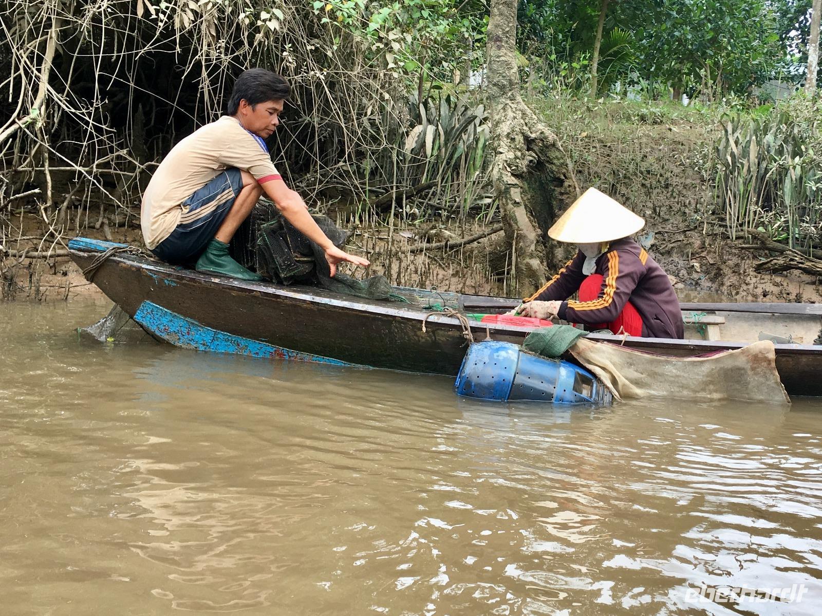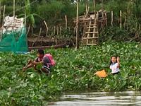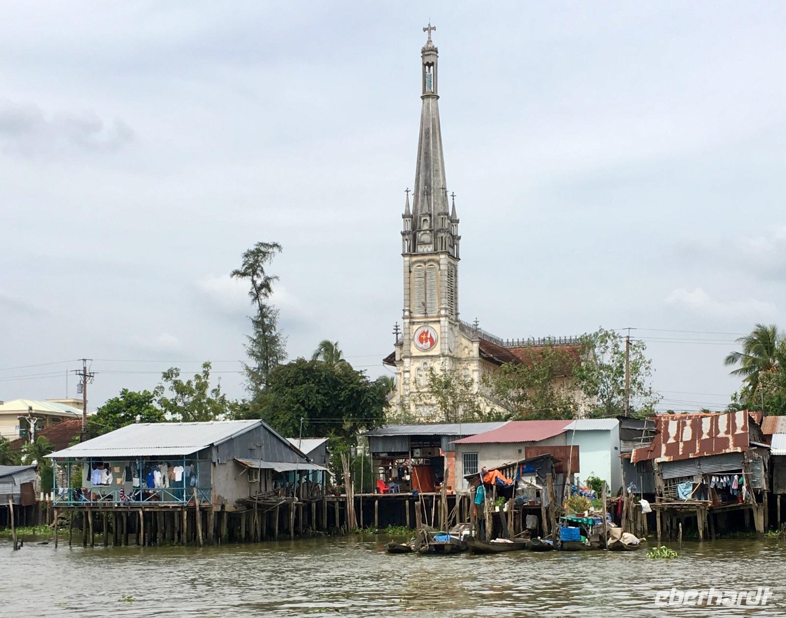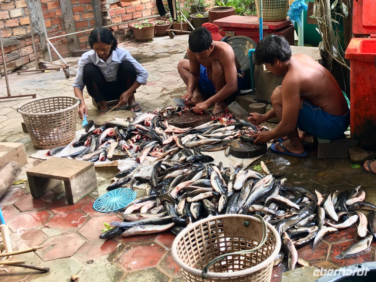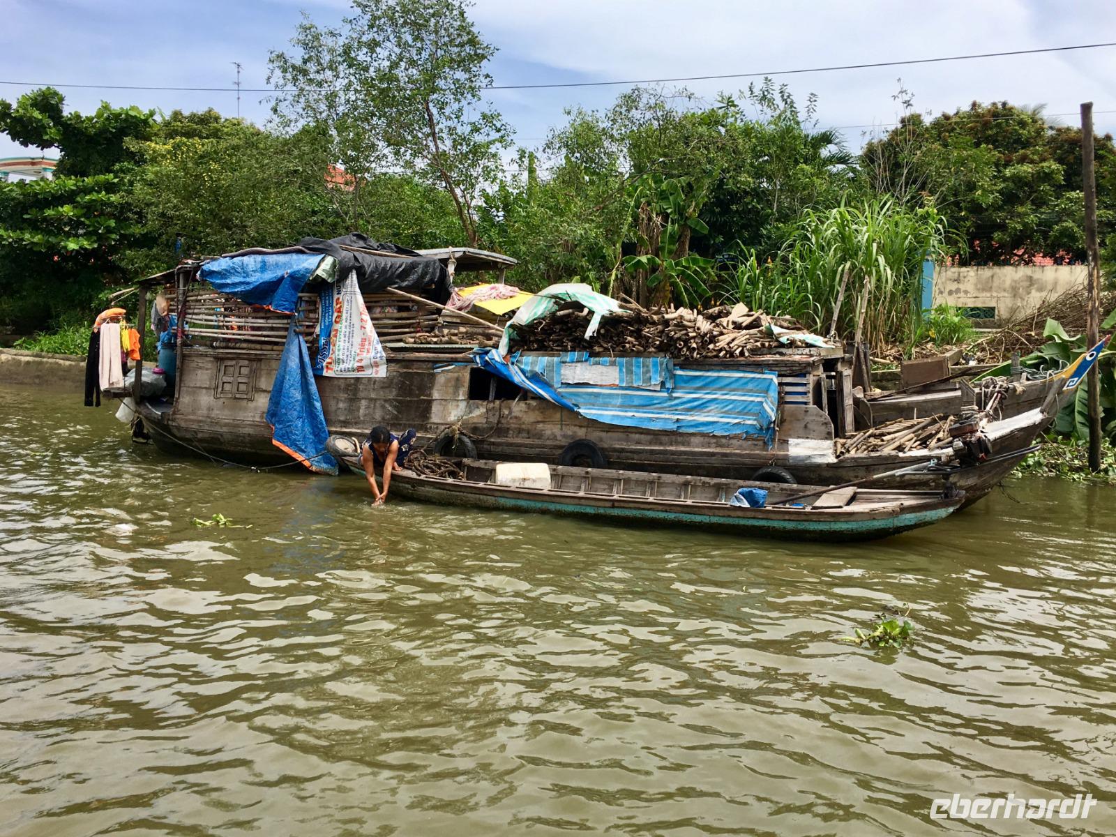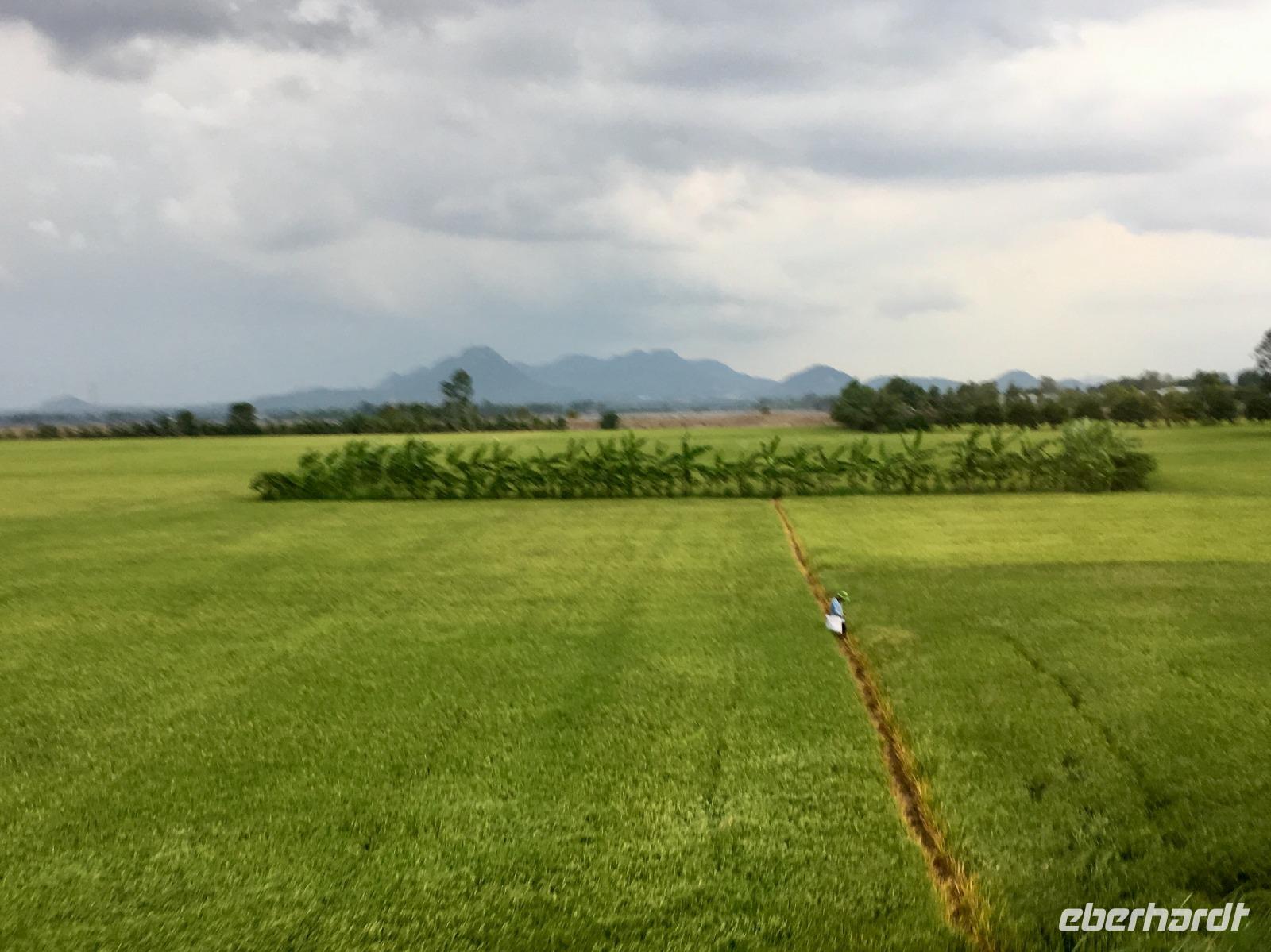 Heute gehts wieder gemuetlicher her, wie im Urlaub, fahren wir um 8:30 los. Das Mekong Delta wartet schon auf uns und wir sind gespannt. Vorerst fahren wir jedoch durch die Stadt hinaus und kommen auch an dem Wiedervereinigungspalast vorbei. Seine Geschichte ist sehr interessant und zeugt von der Zeit nach dem letzten Krieg in Vietnam. Bald sind wir aus der Stadt draussen und Reisfelder loesen die Hochhaeuser ab. Der Reis wurde bereits abgeerntet und der Spreu wird nun gesammelt und an die Ziegeleien als Brennmaterial verkauft. Hier wird alles wiederverwertet, verkauft und nochmals gebraucht. In den verschiedenen Doerfer sehen wir Zeugen vieler Religionen Moscheen, Hindu Tempel, Pagoden und Kirchen laden Glaeubige ein. Auf den Strassenmaerkten gibt es auch lebende, kleine, schwarze Voegelchen zu kaufen. Diesen gibt man seine guten Wuensche mit auf den Flug in die Freiheit! Nicht ueberall wird Reis angepflanzt in den Wasserfelder, sondern einige werden als Entenfarmen, Fischaufzuchten und Schlangenzuchten verwendet. Waehrend der Fahrt erklaert uns Huong auch vieles ueber Geschichte, Religion und die Cu Chi Tunnel. Diese unterirdischen engen Gaenge wurden waehrend der verschiedenen Kriege gebaut, teils um dem Feind zu entkommen aber auch um den Feind in der Nacht ueberfallen zu koennen. Bloss die schlanken Vietnamesen konnten in diese Unterwelt abtauchen, da die Gaenge 50-60cm breit und etwa 1Meter hoch sind. Sie konnten dort bis zu einer Woche leben, Vorratskammern sowie Schlafmoeglichkeiten, Pagode, Kueche, Lazaret, Munitionslager usw waren alle vorhanden. Nur gut, dass diese schreckliche Zeit endlich ein Ende gefunden hat und Vietnam heute voll aufbluehen kann. Bald veraendert sich die Landschaft und Duria, Rambutan, Papaya, Mango, Kokosnuss und viel andere Fruechte, Nuesse und Gemuese werden angebaut. Fluesse ziehen durch die Plantagen und ploetzlich sehen wir ihn...der Mekong Fluss. Aussteigen und in ein schoenes langes Boot einsteigen denn nun gehts mit dem Schiff weiter. Der Mekong ist breit und braun, viele Wasserhyazinthen schwimmen obenauf und Schiffe aller Art und Gattungen benutzen das Gewaesser. Wir hoeren Musik am Ufer und denken natuerlich an ein Fest, aber nein, es ist eine Trauerkapelle und sie spielen die Lieblingslieder des Verstorbenen. Ah, wir halten an, vorsichtig steigen wir aus und gehen in eine Verkaufshalle wo wir lernen wie man Reispapier herstellt fuer die Fruehlingsrollen, wie man Kokosnuesse in wunderbare Bonbons verzaubern- und wie man Popreis herstellen kann mit schwarzem Mekongsand. Alles ist aeusserst interessant und der Reisschnaps ist auch koestlich. Nach der Besichtigung einer Wuergeschlange eilen wir wieder zum Boot denn nicht weit von hier, warten die Damen schon auf uns mit ihren Sampan. Sampan sind kleinere hoelzerne Ruderboote womit wir nun in einen Seitenarm des Mekong Flusses gefuehrt werden. So lernen wir auch das Leben mit, neben und auf dem Wasser kennen. Alles ist tropisch gruen, Pflanzen wuchern, Villen thronen und einfachere Huetten verstecken sich hinter Fruchtbaeumen, Palmen und Blumen. Diese Fahrt ist ein tolles Erlebnis. Aber es will nicht enden, denn bald sind wir bei einem Restaurant und hier werden wir bewirtschaftet als haetten wir 10 Tage nichts gegessen ! Ein wunderschoen hergerichteter Fisch im Ganzen wird uns, unter anderem, gereicht. Er steht mit einer Dekoration im offenen Maul, gebraten auf dem Tisch und er heisst Elefantenohrfisch. Nein, er hat keine grossen Ohren und auch keinen Ruessel, aber seine Form gibt ihm den Namen. Es ist sehr lecker und gerne waeren wir noch laenger gesessen aber die Ebbe holt uns ein und das Wasser schrumpft gute 1 ½ Meter ! Wenn wir nicht im Schlamm gehen wollen, muessen wir wieder aufs Boot. Mit einem Umweg, entkommen wir der Ebbe und gelangen so zu einem Privathaus. Dort wird uns eine musikalische Vorstellung geboten mit Gesang ueber Liebe und Arbeit. Besonders das eine Lied wo Mutter der Tochter erklaert, dass sie nun heiraten wird, das Elternhaus verlassen muss und die Schwiegereltern verehren soll, ist tragisch und schoen gesungen. Daraufhin gehts fuer uns wieder weiter mit dem Boot bis nach Vinh Long, von wo wir nach Can Tho weiterfahren mit dem Bus. Was fuer ein herrlicher Tag auf dem Mekong. Am Abend gehen wir noch am Flussufer auf der schoenen neuen Promenade flanieren ehe wir muede ins Bett fallen.