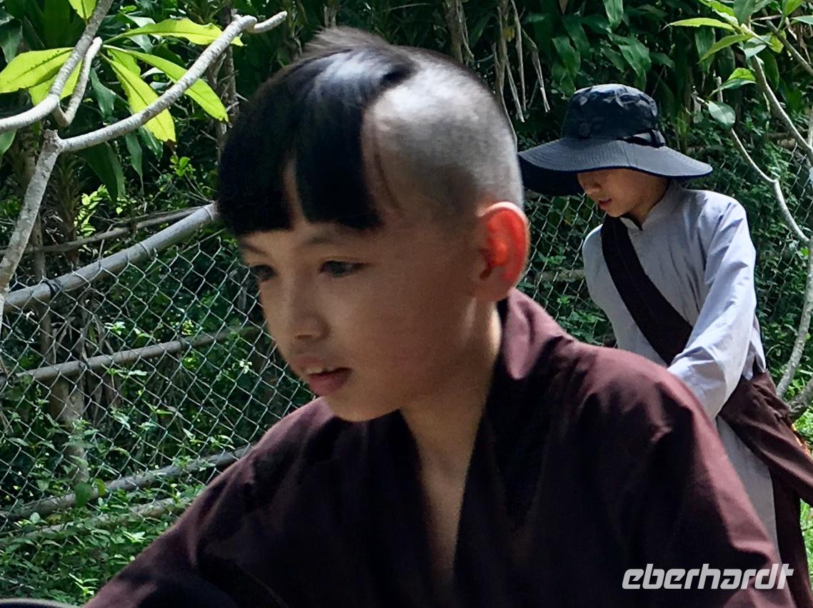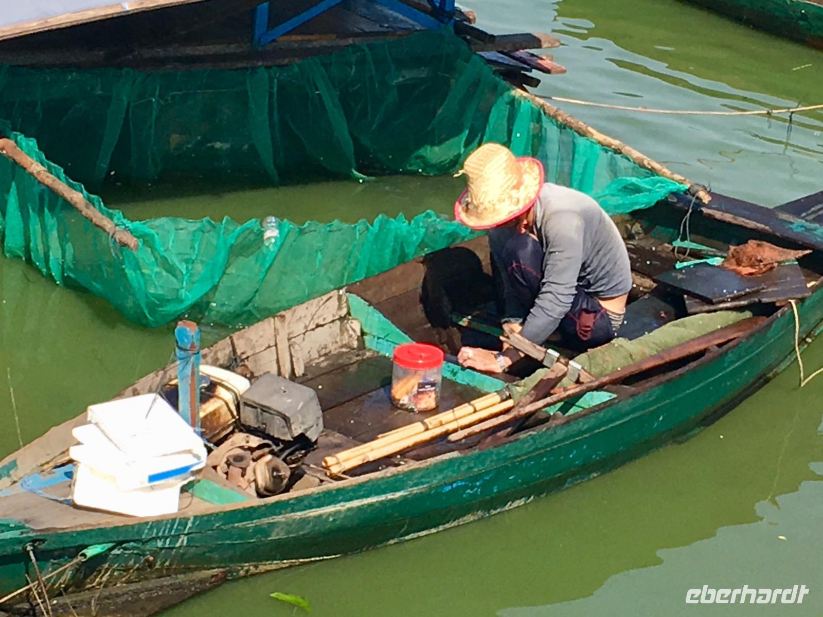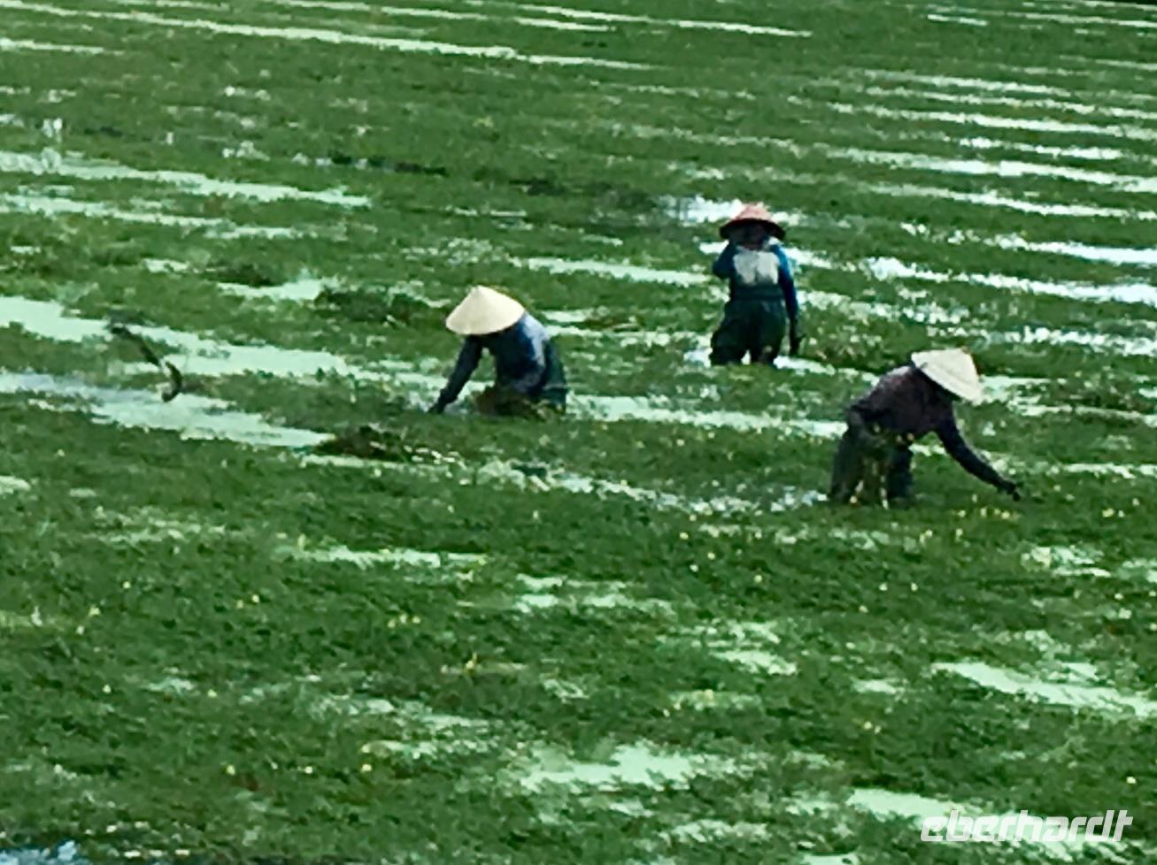 Dring, dring, ach ne, 6 Uhr in der Frueh ! Der Thai Chi Kurs ist in einer viertel Stunde auf dem Oberdeck. Nicht viele Eberhardt Gaeste turnen da mit aber 5 andere Gaeste schon. Nach den zierlichen Balanceakten auf dem Schiff.... werden die Sinne belebt. Der Leib wird mit einem kleinen Fruehstueck hingehalten, da wir vorerst eine Hoehle besuchen wollen. Sie ist so gross, dass da Leute drinnen wohnten und spaeter Seefahrer und Fischer in Not dort Zuflucht fanden. Stalagtiten und Stalagmiten zieren die 100 m2 grosse und sehr hohe Trockenhoele. Wieder zurueck auf unserer Luxus-Dschunke wird uns ein Brunch angeboten wie er im Buechlein steht. Von der Aussicht auf die, nie endenden und immer anders ausschauenden, Karstberge kann man nicht genug kriegen. Wir sind wie verzaubert, schoenes, klares Wasser und Berge die wie Tuerme aus dem Meer ragen begluecken uns fortwaehrend. Tausend Fotos und 2 Stunden spaeter sind wir wieder beim Auslaufhafen und dieses Erlebnis in der Halong Bucht zu segeln geht dem Ende zu. Hier steht er ja schon, unser Reiseleiter Ot, mit dem breiten Laecheln erwartet er uns schon und fuehrt uns gleich mal in eine Perlenaufzucht. Da lernen wir die Mikimoto Methode. Eine aus Perlmutter geformte Kugel wird der Auster eingepflanzt. Die Auster umwickelt diesen Fremdkoerper in ihrer Muschel ueber 3-4 Jahre mit Perlmutter. Dann wird die entstandene Perle entfernt und in der grossen Verkaufshalle schoen eingefasst verkauft. Bei uns gehts aber bald wieder weiter, eine neue Autobahn ist erst seit September geoeffnet und auf dieser fahren wir nun die ersten 40 Km in Richtung Binh Minh. Vorbei an Austern, Garnelen und Fischzuchten und ueber eine riesen Bruecke fuehrt uns diese nigel-nagel-neue Strasse. Wir fahren in Richtung Sueden also dem Meer entlang. Hier gibt es viele Mangrovenwaelder, Bananenplantagen und teilweise Gemueseanbau, da die Erde so fruchtbar und das Wasser suess ist. Ehe wir in unsers schoenes Emeralda Resort einchecken, machen wir noch eine Paddeltour. Am Flussufer, warten schon viele, aus Bambus gefertigte flache Boote mit ihren Ruderer auf uns. Immer zu zweit im perfekten Balanceakt, werden wir auf einem ruhigen Fluss in dieser trockenen Halong Bucht gefloest. Ploetzlich sehen wir auf einem dieser Karstberge etwas Grosses schwarz-weisses. Aufregung auf den Schiffchen macht sich breit. Kameras werden gezueckt und auf einmal sehen wir sie ganz klar....es sind grosse Affen die sich auf den Baeumen und im Grass tummeln. In der Tropfsteinhoehle machen wir kehrt und schaukeln gemuetlich zurueck zum Ausgangspunkt. Im Hotel haben wir kleine Haeuser als Zimmer und die Hotelanlage ist ein echter Park mit grosszuegigem aussen- und innen-Schwimmbad, Wanderwegen, Restaurants und immer wieder Haeuser die wie kleine Doerfer inmitten des Dschungels angelegt sind. Das Abendessen ist wieder sehr fein und der Weg in unser «Dorf» ist 10 Gehminuten entfernt, wenn man es fertig bringt nicht anzuhalten um nochmehr Fotos zu knipsen.