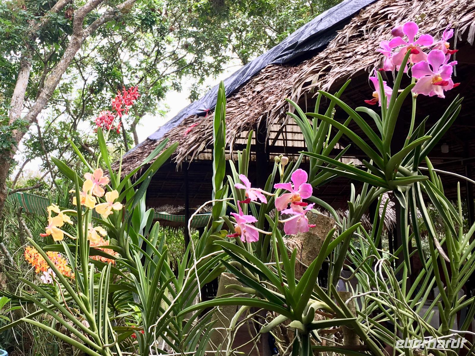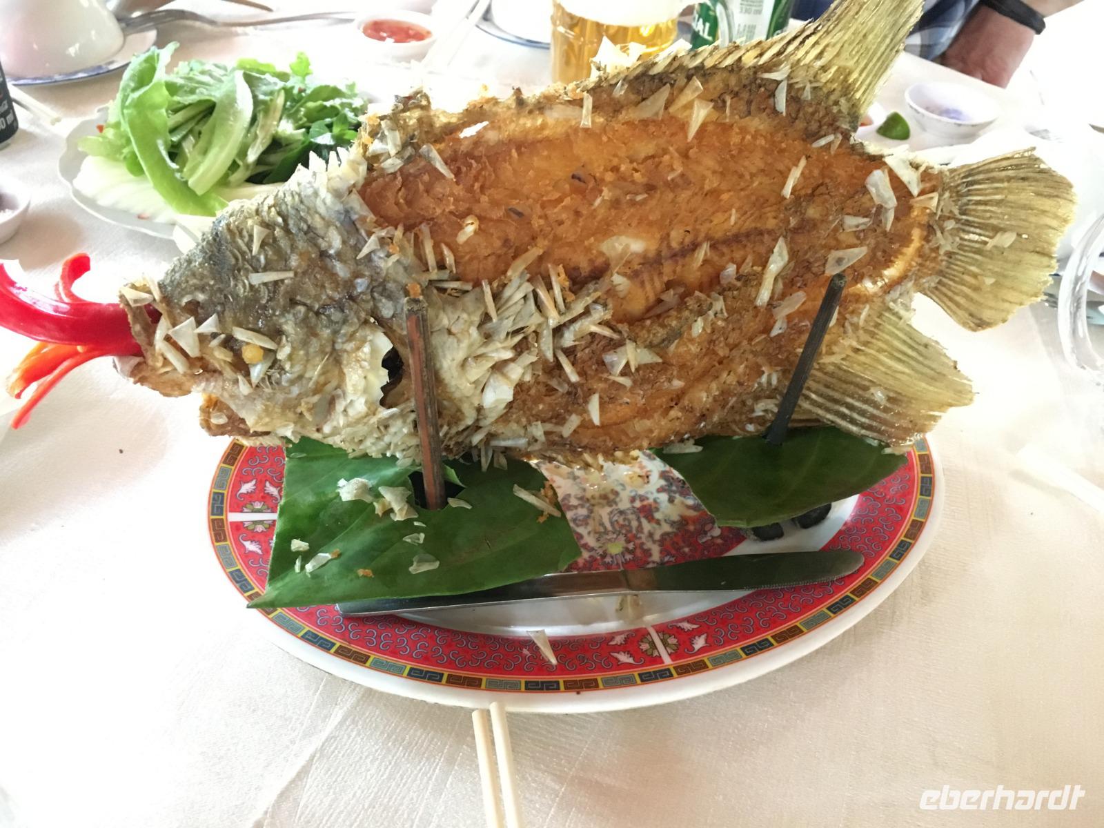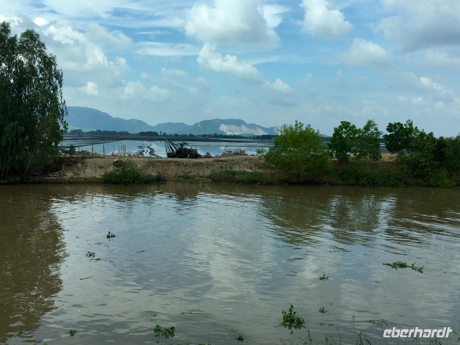 Dring, dring, ach ne, 6 Uhr in der Frueh ! Der Thai Chi Kurs ist in einer viertel Stunde auf dem Oberdeck. Nicht viele Eberhardt Gaeste turnen da mit aber 5 andere Gaeste schon. Nach den zierlichen Balanceakten auf dem Schiff.... werden die Sinne belebt. Der Leib wird mit einem kleinen Fruehstueck hingehalten, da wir vorerst eine Hoehle besuchen wollen. Sie ist so gross, dass da Leute drinnen wohnten und spaeter Seefahrer und Fischer in Not dort Zuflucht fanden. Stalagtiten und Stalagmiten zieren die 100 m2 grosse und sehr hohe Trockenhoele. Wieder zurueck auf unserer Luxus-Dschunke wird uns ein Brunch angeboten wie er im Buechlein steht. Von der Aussicht auf die, nie endenden und immer anders ausschauenden, Karstberge kann man nicht genug kriegen. Wir sind wie verzaubert, schoenes, klares Wasser und Berge die wie Tuerme aus dem Meer ragen begluecken uns fortwaehrend. Tausend Fotos und 2 Stunden spaeter sind wir wieder beim Auslaufhafen und dieses Erlebnis in der Halong Bucht zu segeln geht dem Ende zu. Hier steht er ja schon, unser Reiseleiter Ot, mit dem breiten Laecheln erwartet er uns schon und fuehrt uns gleich mal in eine Perlenaufzucht. Da lernen wir die Mikimoto Methode. Eine aus Perlmutter geformte Kugel wird der Auster eingepflanzt. Die Auster umwickelt diesen Fremdkoerper in ihrer Muschel ueber 3-4 Jahre mit Perlmutter. Dann wird die entstandene Perle entfernt und in der grossen Verkaufshalle schoen eingefasst verkauft. Bei uns gehts aber bald wieder weiter, eine neue Autobahn ist erst seit September geoeffnet und auf dieser fahren wir nun die ersten 40 Km in Richtung Binh Minh. Vorbei an Austern, Garnelen und Fischzuchten und ueber eine riesen Bruecke fuehrt uns diese nigel-nagel-neue Strasse. Wir fahren in Richtung Sueden also dem Meer entlang. Hier gibt es viele Mangrovenwaelder, Bananenplantagen und teilweise Gemueseanbau, da die Erde so fruchtbar und das Wasser suess ist. Ehe wir in unsers schoenes Emeralda Resort einchecken, machen wir noch eine Paddeltour. Am Flussufer, warten schon viele, aus Bambus gefertigte flache Boote mit ihren Ruderer auf uns. Immer zu zweit im perfekten Balanceakt, werden wir auf einem ruhigen Fluss in dieser trockenen Halong Bucht gefloest. Ploetzlich sehen wir auf einem dieser Karstberge etwas Grosses schwarz-weisses. Aufregung auf den Schiffchen macht sich breit. Kameras werden gezueckt und auf einmal sehen wir sie ganz klar....es sind grosse Affen die sich auf den Baeumen und im Grass tummeln. In der Tropfsteinhoehle machen wir kehrt und schaukeln gemuetlich zurueck zum Ausgangspunkt. Im Hotel haben wir kleine Haeuser als Zimmer und die Hotelanlage ist ein echter Park mit grosszuegigem aussen- und innen-Schwimmbad, Wanderwegen, Restaurants und immer wieder Haeuser die wie kleine Doerfer inmitten des Dschungels angelegt sind. Das Abendessen ist wieder sehr fein und der Weg in unser «Dorf» ist 10 Gehminuten entfernt, wenn man es fertig bringt nicht anzuhalten um nochmehr Fotos zu knipsen.