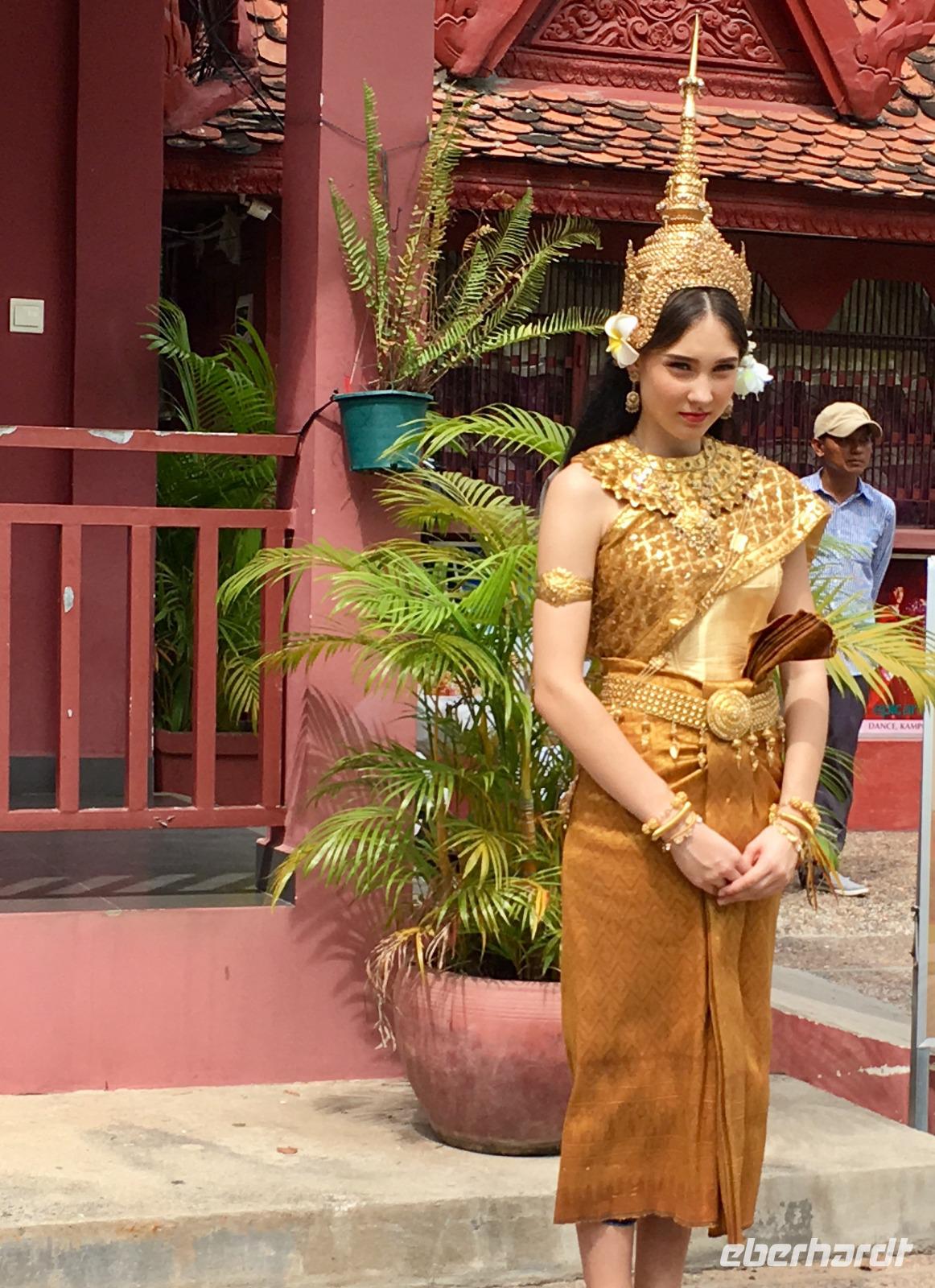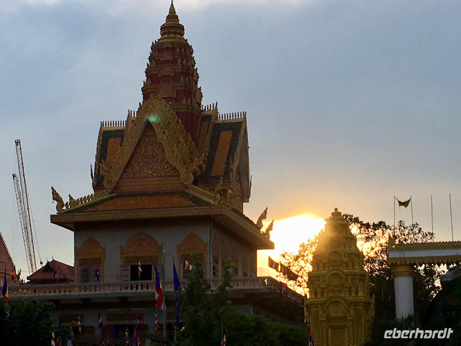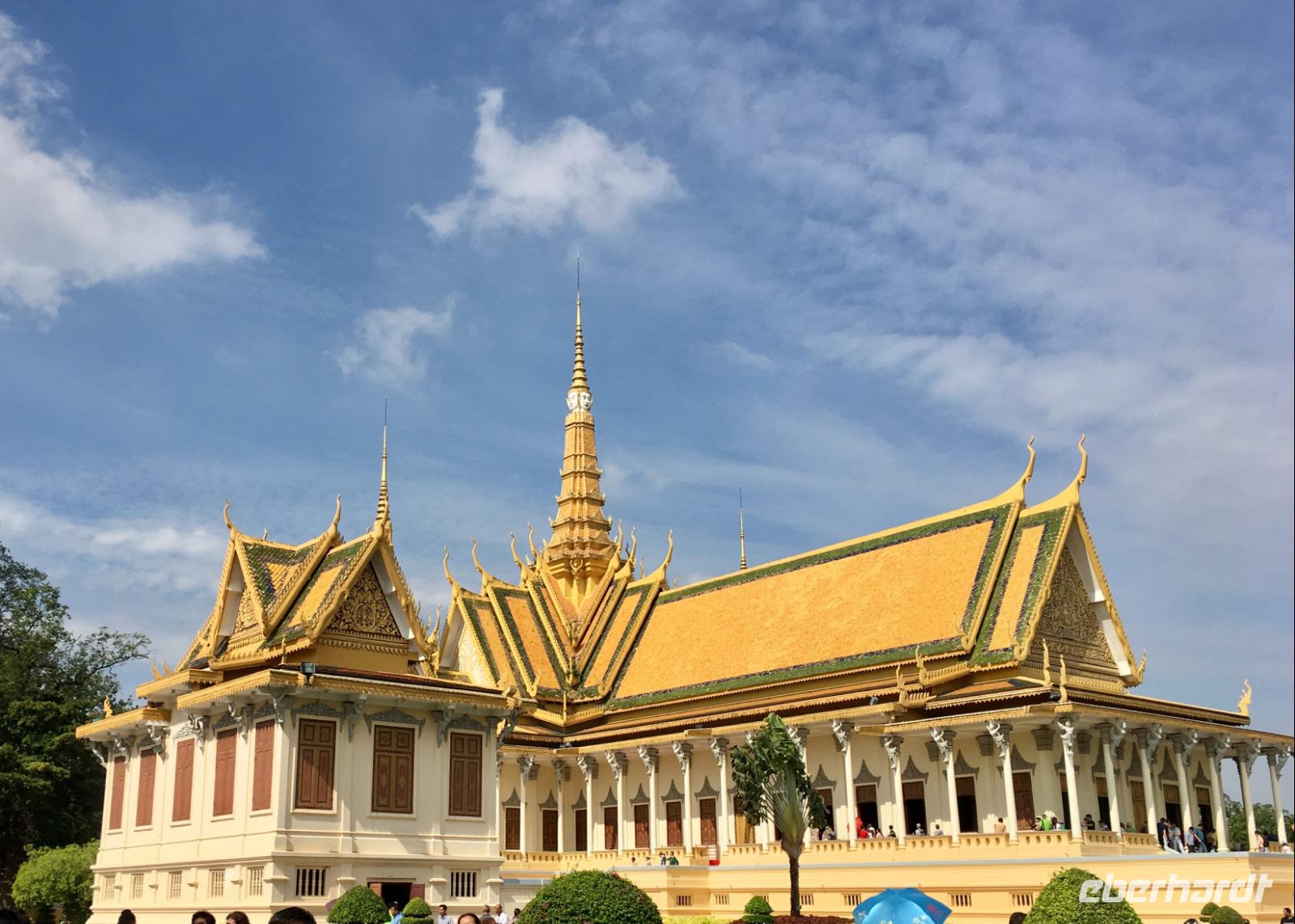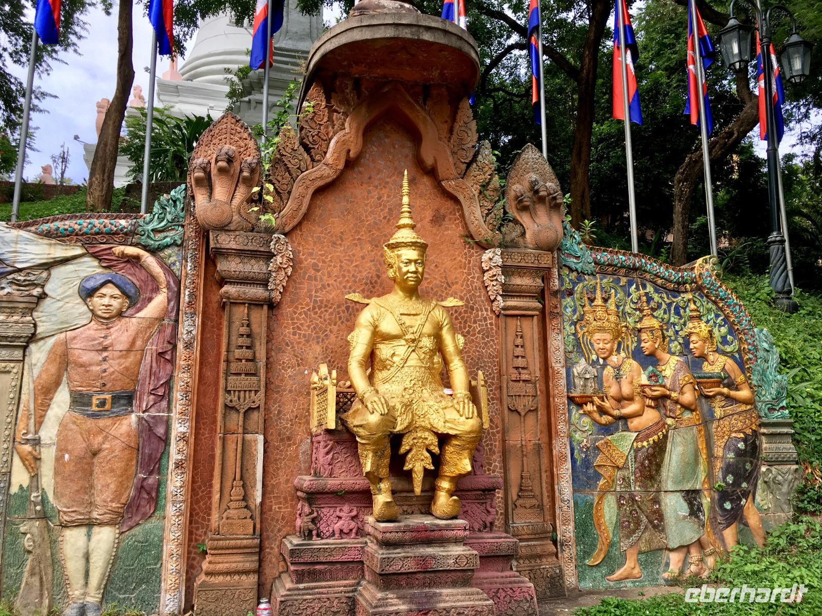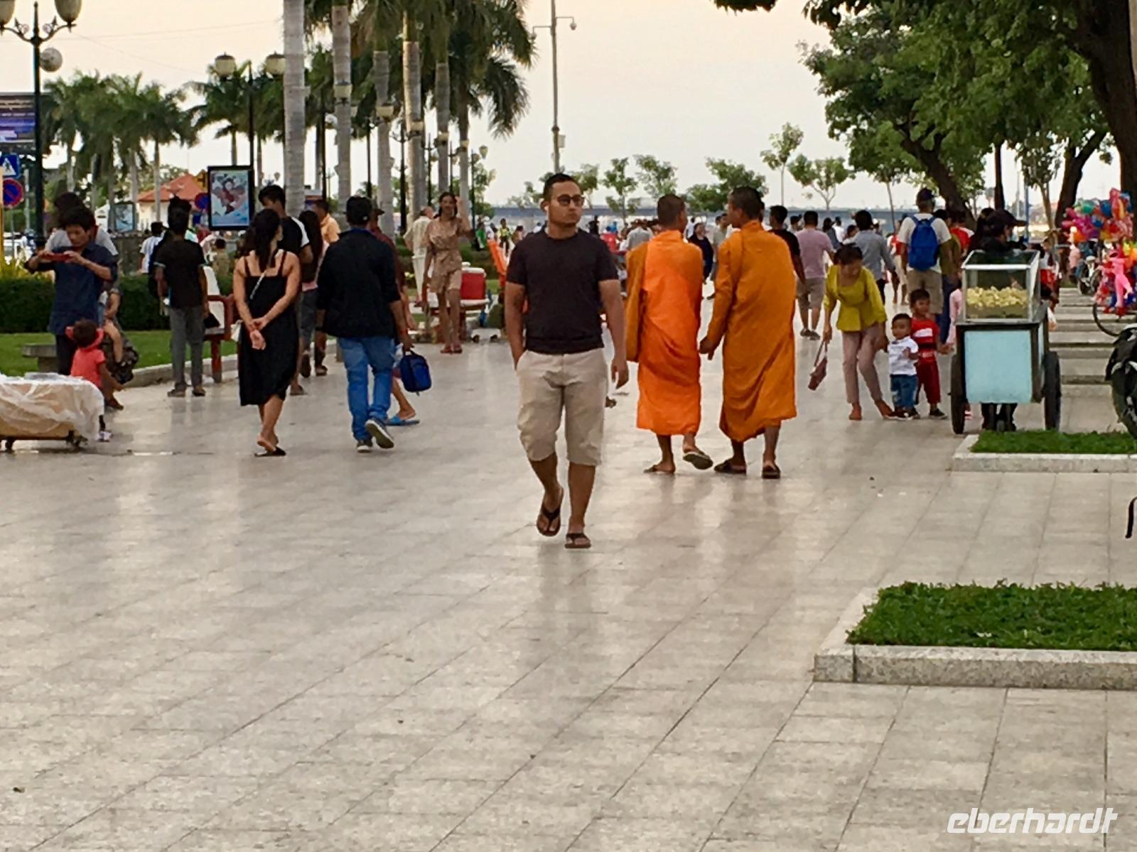 Um 8:00 Uhr sind wir schon startbereit. Der Himmel ist weisslich mit blauem Schleier, oder umgekehrt ! So viele Autos, Mofas und Motore verschmutzen die Luft. Thol wird unser Reiseleiter von nun an und er fuehrt uns auch gleich zum Kaiserpalast. Da er freier Reiseleiter ist, wird er kontrolliert und darf nicht immer das sagen, was wir hoeren moechten. Spietzel seien ueberall in diesem kommunistischen Land wo es seit 1 Jahr bloss noch eine Partei gibt, die Volkspartei. Er sei seit April ein Aktivist und lebe in einem Kloster, die Situation hier in Kambodscha sei sehr schwierig traut er uns an. Auf einer Flaeche von 391 Km2 leben hier in Phnom Penh rund 2 Mio Einwohner. Wir befinden uns hier 12 Meter ueber Meer, jedes Jahr steigt hier der Mekong zur Regenzeit bis zu 4 Meter an. Jedenfalls schauen wir uns vorerst die Prunkgebaeude des Kaiserpalastes an. Es ist ein sehr grosses Areal, mitten in der Stadt am Mekong Fluss gelegen. Die Empfangshalle ist wohl das Paradestueck mit seinem imposanten Aufgang und dem vergoldeten Dach. Hier werden bloss lokale Politiker empfangen keine auslaendischen. Daneben ist, hinter einer Mauer gelegen, der eigentliche Palast, wo der Koenig nach wie vor mit seiner Mutter, 5 Ehefrauen und 15 Kinderlein lebt. In der Naehe des Flusses sehen wir auch ein offenes Gebaeude, oder ueberdachter Platz. Es ist die Versammlungshalle, der kuehle Wind des Mekongs kuehlt hier die Koepfe der Besprechungs-teilnehmer. Nun noch die beruehmte Silber-Pagode. Der ganze Boden soll hier einmal aus Silber gewesen sein und in der Mitte sogar aus purem Gold. Ueber die Zeit, wurde es von verschiedenen Bewegungen «ausgetauscht». Wir stehen heute auf Blech. Aber die ganze Pagode ist sehr eindruecklich und Buddah sitzt in seinen 5000 Kg Gold, ganz oben mit seinem himmlischen Ausdruck des Erleuchteten. Na ja, das Gold wurde auch schon «ausgetauscht» denn man kann da einfach hingehen ! Ausserhalb sehen wir noch eine Stupa, die nicht angemalt ist, sie sei das Grabmal des verstorbenen Koenigs Sianouh. So viele herrliche, goldene Eindruecke bringen uns wieder zum Ausgang und dann gleich weiter zum National Museum. Leider sind alle Audio Guides schon besetzt also schauen wir uns mit Thol die wunderbaren Ausstellungsstuecke der Khmer Kunst an. Statuen, Bruchteile von Eingaengen und Mauerteile sind hier verwahrt sowie alte Stoffe, Kronen und Schmuck. Wir lernen ueber die Vor- und Nach - Angkor Zeit und auch, dass im 1907 der franzoesische Generalgouvereur dieses Museum hat bauen lassen. Koenig Siswath wurde damals zur Eroeffnung eingeladen. In Kambodscha gibt es Buddisten und Hindus uns so sehen wir Vishnu mit seiner vielzahl von Armen, Nagha als mehrere Schlangen dargestellt, Ganesh der Elefant und immer wieder Apsara Taenzerinnen in ihren grazioesen Positionen sowie Buddah mit seinem serenen Gesichtsausdruck und Ngeh das Fabeltier. Aber auch hier im National Museum sind wir von Spietzel umringt was die Erklaerungen sehr nuechtern haltet. Nun gehts aber zum Mittagessen in ein nahegelegenes Restaurant. Die wunderbaren Curries und Suppen schmecken sehr lecker. Danach noch den obligaten Besuch der Pagode nach der diese Stadt benannt wurde. Wat Phnom wurde bereits im 1373 auf einem Huegel erbaut und thront in seinem vollen Glanze nach wie vor ueber der Stadt. Am Nachmittag ist nun etwas Freizeit angesagt. Der Pool mit dem kuehlen Wasser lockt. Einige kommen gegen Abend mit zur Uferpromenade, denn dort wollen wir einfach dem Leben der Kambodschaner zuschauen. Einige zieht es zum Hardrock Cafe, da das T-Shirt als Andenken an diese Stadt in der Garderobe nicht fehlen darf. Uebermorgen ist hier ein grosses Fest, das jaehrliche Wasserfest, angesagt. Die Drachenboote welche mit 80-100 Ruderer bestueckt sind ueben schon und die alten Dschunken wurden mit riesen Leuchtbilder versehen und stehen nun am Siswath Quay bereit zur Besichtigung. Unsere Bierchen und bunten Cocktails auf der wunderbaren Terrasse untermalen das Treiben der Uferpromenade sehr angenehm. Das Hotel ist bloss 4 TukTuk Dollar entfernt. Noch schnell umziehen und dann ab zum schmackhaften Abendbrot in einem Gartenrestaurant am Mekong. Das war ein voller, schoener Tag und die geraeumigen Zimmer warten schon auf uns. Wenn man mal herausgefunden hat, wie das Licht ausgeht und die Klimaanlage an bleibt darf man auch schlafen gehen.