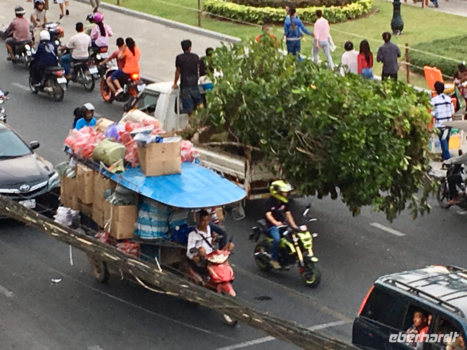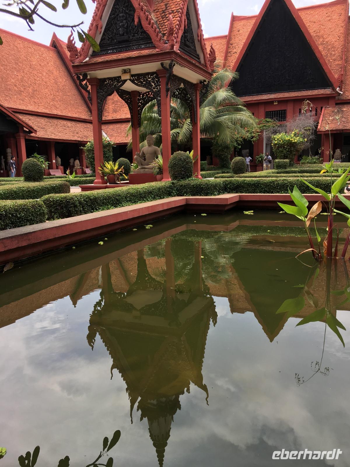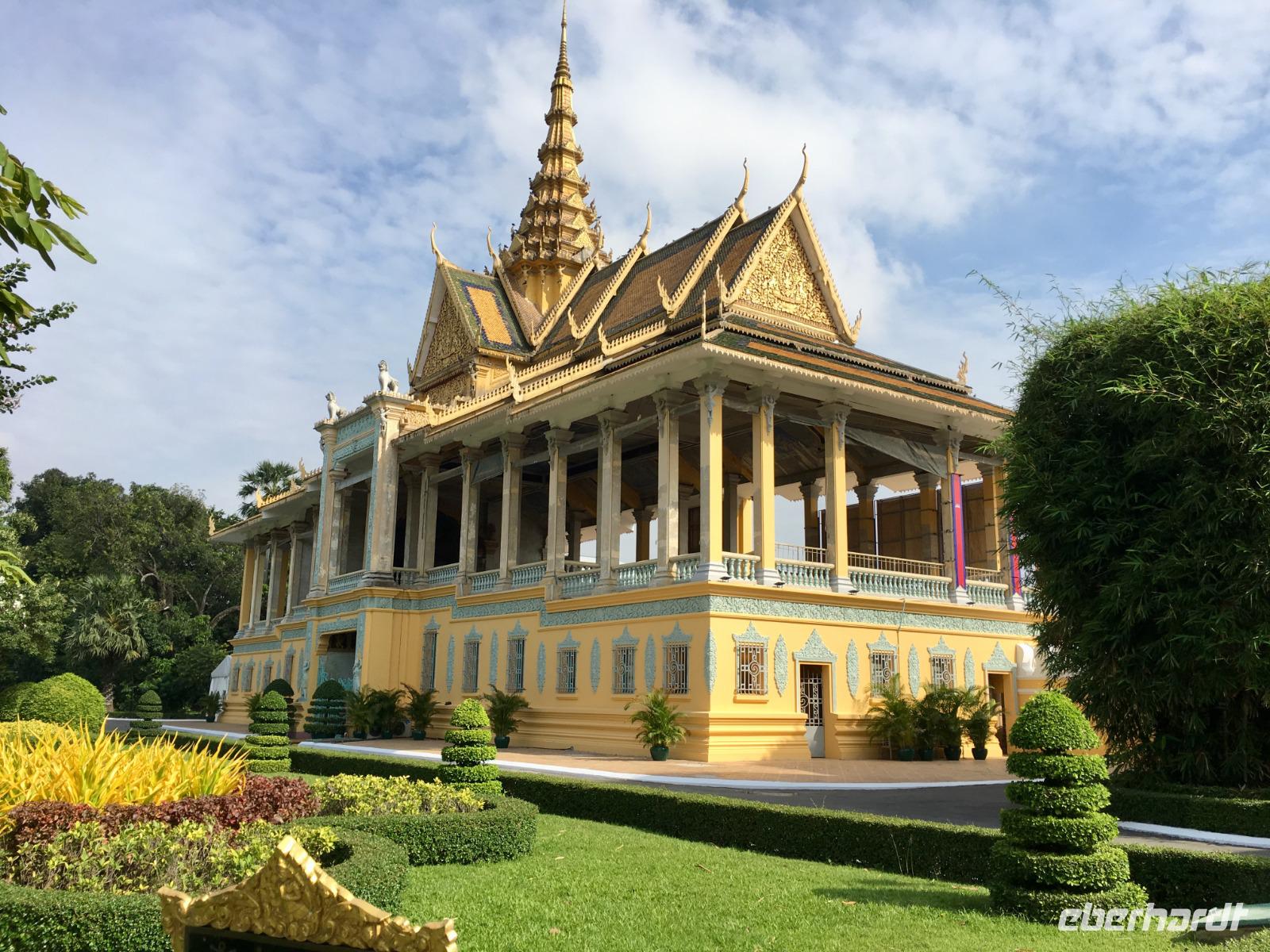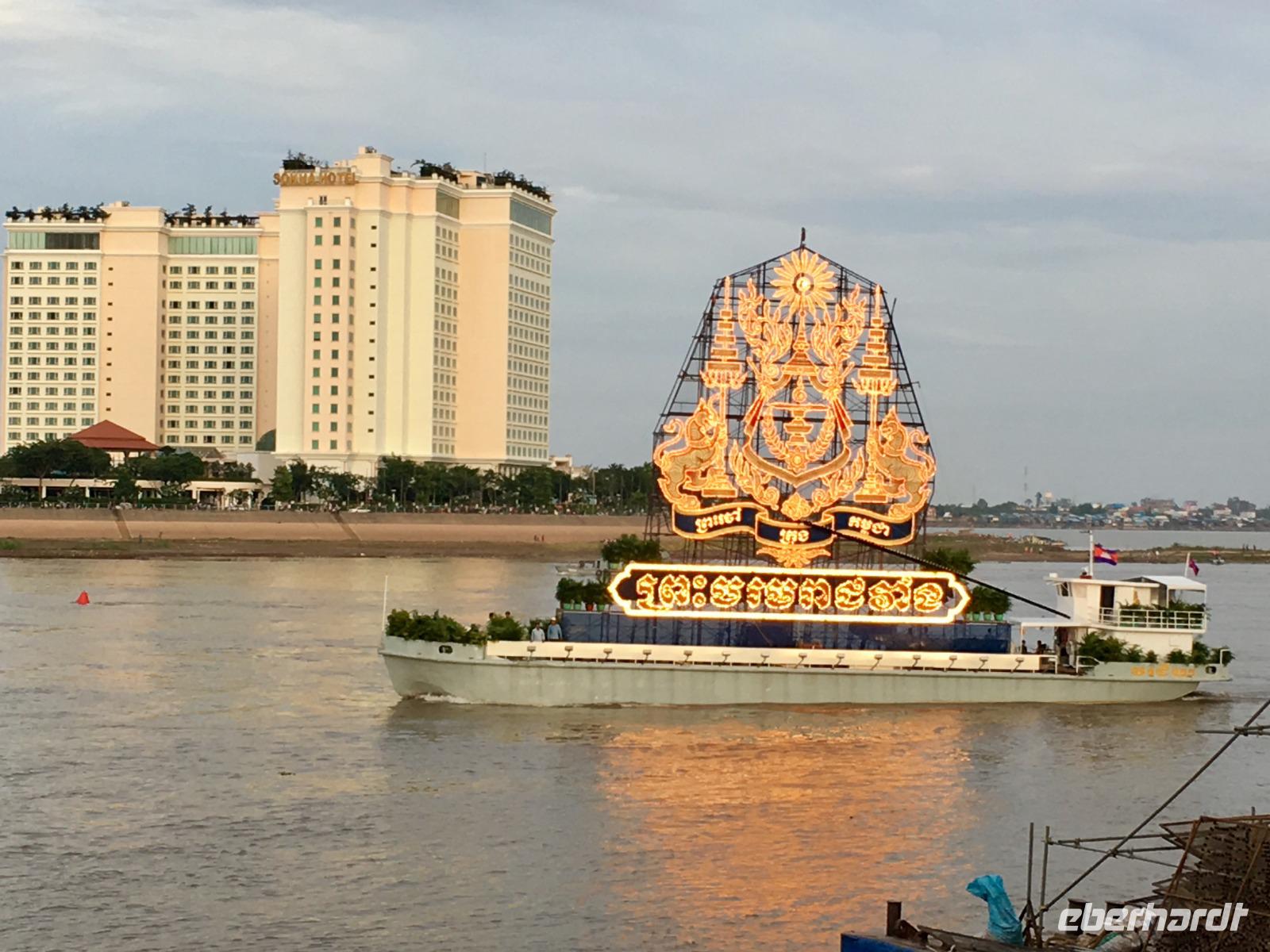 Um 8:00 Uhr sind wir schon startbereit. Der Himmel ist weisslich mit blauem Schleier, oder umgekehrt ! So viele Autos, Mofas und Motore verschmutzen die Luft. Thol wird unser Reiseleiter von nun an und er fuehrt uns auch gleich zum Kaiserpalast. Da er freier Reiseleiter ist, wird er kontrolliert und darf nicht immer das sagen, was wir hoeren moechten. Spietzel seien ueberall in diesem kommunistischen Land wo es seit 1 Jahr bloss noch eine Partei gibt, die Volkspartei. Er sei seit April ein Aktivist und lebe in einem Kloster, die Situation hier in Kambodscha sei sehr schwierig traut er uns an. Auf einer Flaeche von 391 Km2 leben hier in Phnom Penh rund 2 Mio Einwohner. Wir befinden uns hier 12 Meter ueber Meer, jedes Jahr steigt hier der Mekong zur Regenzeit bis zu 4 Meter an. Jedenfalls schauen wir uns vorerst die Prunkgebaeude des Kaiserpalastes an. Es ist ein sehr grosses Areal, mitten in der Stadt am Mekong Fluss gelegen. Die Empfangshalle ist wohl das Paradestueck mit seinem imposanten Aufgang und dem vergoldeten Dach. Hier werden bloss lokale Politiker empfangen keine auslaendischen. Daneben ist, hinter einer Mauer gelegen, der eigentliche Palast, wo der Koenig nach wie vor mit seiner Mutter, 5 Ehefrauen und 15 Kinderlein lebt. In der Naehe des Flusses sehen wir auch ein offenes Gebaeude, oder ueberdachter Platz. Es ist die Versammlungshalle, der kuehle Wind des Mekongs kuehlt hier die Koepfe der Besprechungs-teilnehmer. Nun noch die beruehmte Silber-Pagode. Der ganze Boden soll hier einmal aus Silber gewesen sein und in der Mitte sogar aus purem Gold. Ueber die Zeit, wurde es von verschiedenen Bewegungen «ausgetauscht». Wir stehen heute auf Blech. Aber die ganze Pagode ist sehr eindruecklich und Buddah sitzt in seinen 5000 Kg Gold, ganz oben mit seinem himmlischen Ausdruck des Erleuchteten. Na ja, das Gold wurde auch schon «ausgetauscht» denn man kann da einfach hingehen ! Ausserhalb sehen wir noch eine Stupa, die nicht angemalt ist, sie sei das Grabmal des verstorbenen Koenigs Sianouh. So viele herrliche, goldene Eindruecke bringen uns wieder zum Ausgang und dann gleich weiter zum National Museum. Leider sind alle Audio Guides schon besetzt also schauen wir uns mit Thol die wunderbaren Ausstellungsstuecke der Khmer Kunst an. Statuen, Bruchteile von Eingaengen und Mauerteile sind hier verwahrt sowie alte Stoffe, Kronen und Schmuck. Wir lernen ueber die Vor- und Nach - Angkor Zeit und auch, dass im 1907 der franzoesische Generalgouvereur dieses Museum hat bauen lassen. Koenig Siswath wurde damals zur Eroeffnung eingeladen. In Kambodscha gibt es Buddisten und Hindus uns so sehen wir Vishnu mit seiner vielzahl von Armen, Nagha als mehrere Schlangen dargestellt, Ganesh der Elefant und immer wieder Apsara Taenzerinnen in ihren grazioesen Positionen sowie Buddah mit seinem serenen Gesichtsausdruck und Ngeh das Fabeltier. Aber auch hier im National Museum sind wir von Spietzel umringt was die Erklaerungen sehr nuechtern haltet. Nun gehts aber zum Mittagessen in ein nahegelegenes Restaurant. Die wunderbaren Curries und Suppen schmecken sehr lecker. Danach noch den obligaten Besuch der Pagode nach der diese Stadt benannt wurde. Wat Phnom wurde bereits im 1373 auf einem Huegel erbaut und thront in seinem vollen Glanze nach wie vor ueber der Stadt. Am Nachmittag ist nun etwas Freizeit angesagt. Der Pool mit dem kuehlen Wasser lockt. Einige kommen gegen Abend mit zur Uferpromenade, denn dort wollen wir einfach dem Leben der Kambodschaner zuschauen. Einige zieht es zum Hardrock Cafe, da das T-Shirt als Andenken an diese Stadt in der Garderobe nicht fehlen darf. Uebermorgen ist hier ein grosses Fest, das jaehrliche Wasserfest, angesagt. Die Drachenboote welche mit 80-100 Ruderer bestueckt sind ueben schon und die alten Dschunken wurden mit riesen Leuchtbilder versehen und stehen nun am Siswath Quay bereit zur Besichtigung. Unsere Bierchen und bunten Cocktails auf der wunderbaren Terrasse untermalen das Treiben der Uferpromenade sehr angenehm. Das Hotel ist bloss 4 TukTuk Dollar entfernt. Noch schnell umziehen und dann ab zum schmackhaften Abendbrot in einem Gartenrestaurant am Mekong. Das war ein voller, schoener Tag und die geraeumigen Zimmer warten schon auf uns. Wenn man mal herausgefunden hat, wie das Licht ausgeht und die Klimaanlage an bleibt darf man auch schlafen gehen.