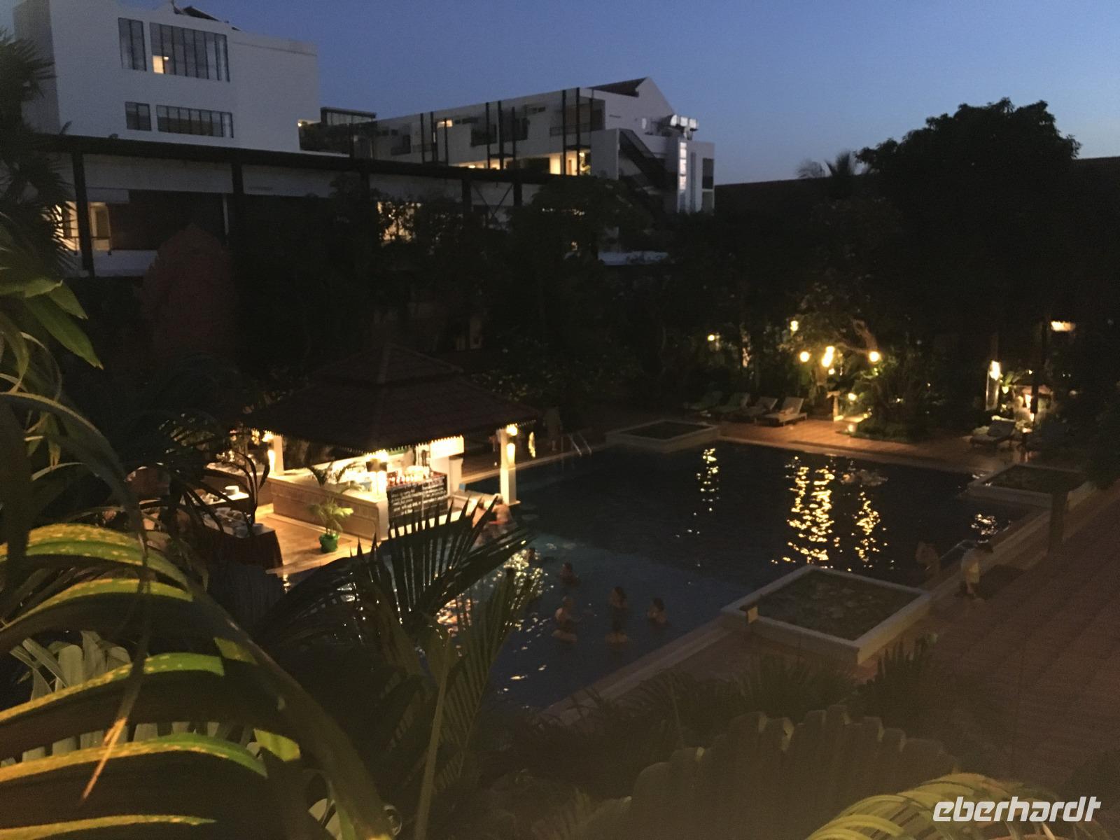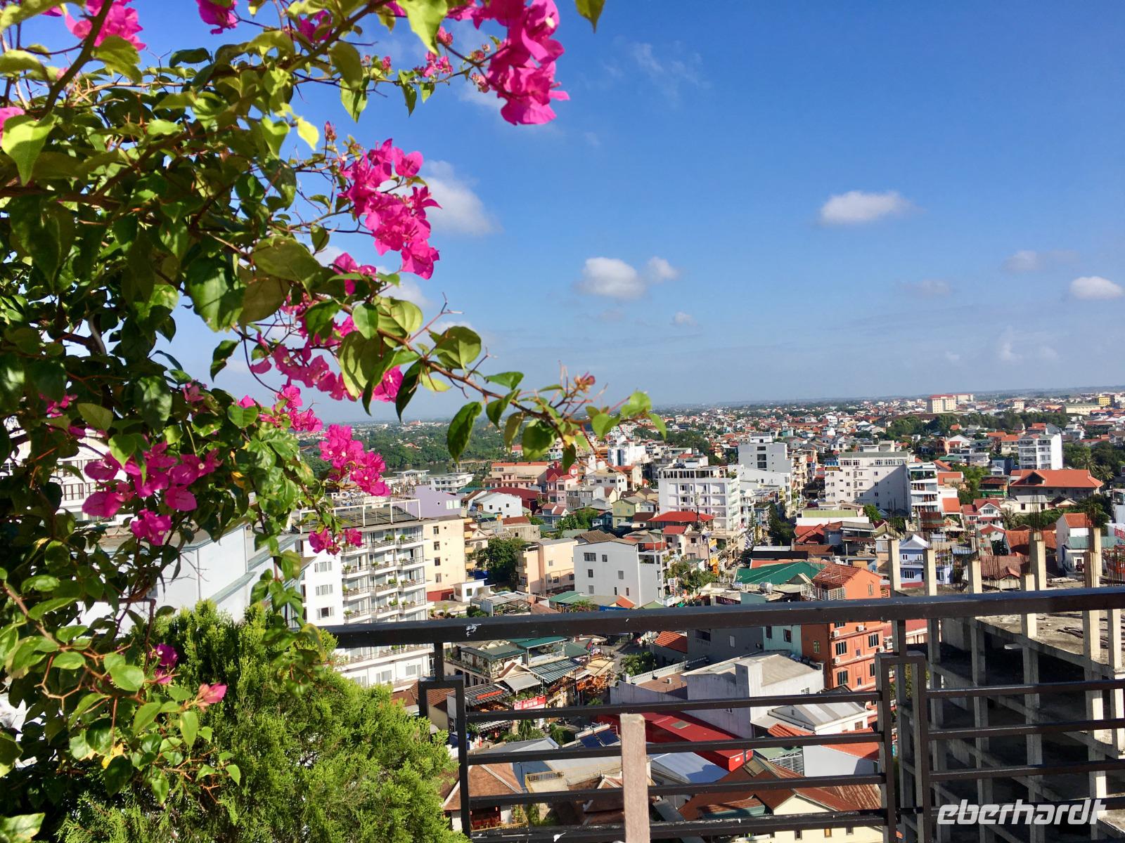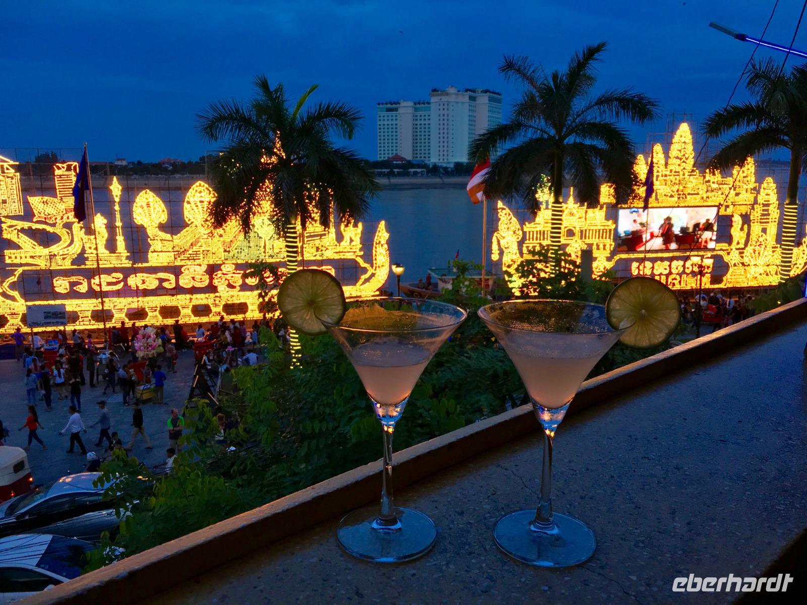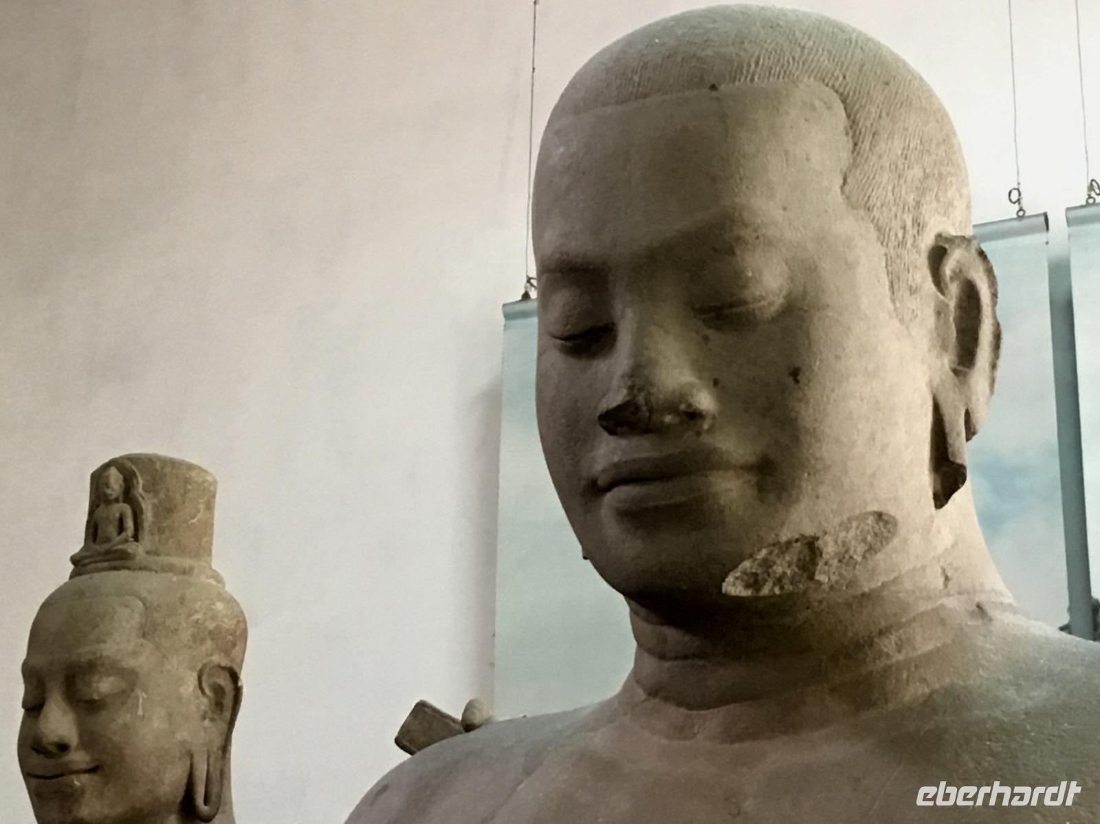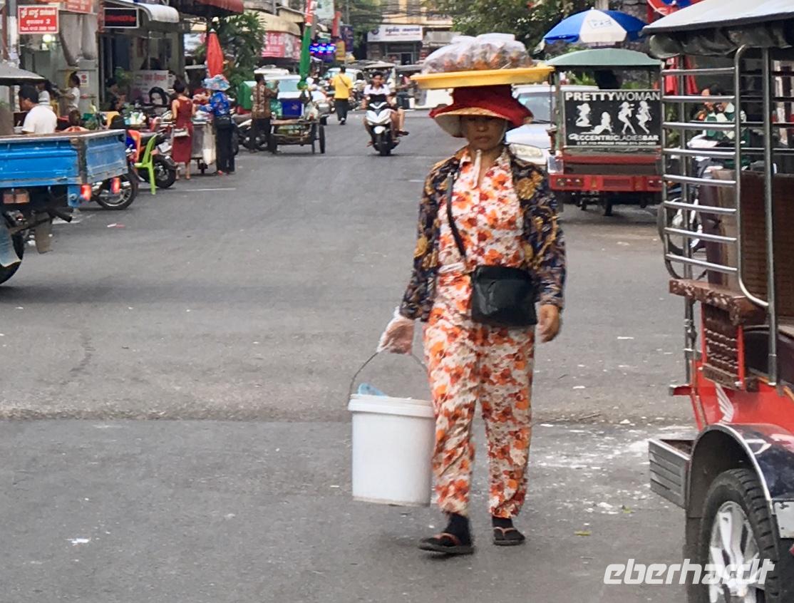 Um 8:00 Uhr sind wir schon startbereit. Der Himmel ist weisslich mit blauem Schleier, oder umgekehrt ! So viele Autos, Mofas und Motore verschmutzen die Luft. Thol wird unser Reiseleiter von nun an und er fuehrt uns auch gleich zum Kaiserpalast. Da er freier Reiseleiter ist, wird er kontrolliert und darf nicht immer das sagen, was wir hoeren moechten. Spietzel seien ueberall in diesem kommunistischen Land wo es seit 1 Jahr bloss noch eine Partei gibt, die Volkspartei. Er sei seit April ein Aktivist und lebe in einem Kloster, die Situation hier in Kambodscha sei sehr schwierig traut er uns an. Auf einer Flaeche von 391 Km2 leben hier in Phnom Penh rund 2 Mio Einwohner. Wir befinden uns hier 12 Meter ueber Meer, jedes Jahr steigt hier der Mekong zur Regenzeit bis zu 4 Meter an. Jedenfalls schauen wir uns vorerst die Prunkgebaeude des Kaiserpalastes an. Es ist ein sehr grosses Areal, mitten in der Stadt am Mekong Fluss gelegen. Die Empfangshalle ist wohl das Paradestueck mit seinem imposanten Aufgang und dem vergoldeten Dach. Hier werden bloss lokale Politiker empfangen keine auslaendischen. Daneben ist, hinter einer Mauer gelegen, der eigentliche Palast, wo der Koenig nach wie vor mit seiner Mutter, 5 Ehefrauen und 15 Kinderlein lebt. In der Naehe des Flusses sehen wir auch ein offenes Gebaeude, oder ueberdachter Platz. Es ist die Versammlungshalle, der kuehle Wind des Mekongs kuehlt hier die Koepfe der Besprechungs-teilnehmer. Nun noch die beruehmte Silber-Pagode. Der ganze Boden soll hier einmal aus Silber gewesen sein und in der Mitte sogar aus purem Gold. Ueber die Zeit, wurde es von verschiedenen Bewegungen «ausgetauscht». Wir stehen heute auf Blech. Aber die ganze Pagode ist sehr eindruecklich und Buddah sitzt in seinen 5000 Kg Gold, ganz oben mit seinem himmlischen Ausdruck des Erleuchteten. Na ja, das Gold wurde auch schon «ausgetauscht» denn man kann da einfach hingehen ! Ausserhalb sehen wir noch eine Stupa, die nicht angemalt ist, sie sei das Grabmal des verstorbenen Koenigs Sianouh. So viele herrliche, goldene Eindruecke bringen uns wieder zum Ausgang und dann gleich weiter zum National Museum. Leider sind alle Audio Guides schon besetzt also schauen wir uns mit Thol die wunderbaren Ausstellungsstuecke der Khmer Kunst an. Statuen, Bruchteile von Eingaengen und Mauerteile sind hier verwahrt sowie alte Stoffe, Kronen und Schmuck. Wir lernen ueber die Vor- und Nach - Angkor Zeit und auch, dass im 1907 der franzoesische Generalgouvereur dieses Museum hat bauen lassen. Koenig Siswath wurde damals zur Eroeffnung eingeladen. In Kambodscha gibt es Buddisten und Hindus uns so sehen wir Vishnu mit seiner vielzahl von Armen, Nagha als mehrere Schlangen dargestellt, Ganesh der Elefant und immer wieder Apsara Taenzerinnen in ihren grazioesen Positionen sowie Buddah mit seinem serenen Gesichtsausdruck und Ngeh das Fabeltier. Aber auch hier im National Museum sind wir von Spietzel umringt was die Erklaerungen sehr nuechtern haltet. Nun gehts aber zum Mittagessen in ein nahegelegenes Restaurant. Die wunderbaren Curries und Suppen schmecken sehr lecker. Danach noch den obligaten Besuch der Pagode nach der diese Stadt benannt wurde. Wat Phnom wurde bereits im 1373 auf einem Huegel erbaut und thront in seinem vollen Glanze nach wie vor ueber der Stadt. Am Nachmittag ist nun etwas Freizeit angesagt. Der Pool mit dem kuehlen Wasser lockt. Einige kommen gegen Abend mit zur Uferpromenade, denn dort wollen wir einfach dem Leben der Kambodschaner zuschauen. Einige zieht es zum Hardrock Cafe, da das T-Shirt als Andenken an diese Stadt in der Garderobe nicht fehlen darf. Uebermorgen ist hier ein grosses Fest, das jaehrliche Wasserfest, angesagt. Die Drachenboote welche mit 80-100 Ruderer bestueckt sind ueben schon und die alten Dschunken wurden mit riesen Leuchtbilder versehen und stehen nun am Siswath Quay bereit zur Besichtigung. Unsere Bierchen und bunten Cocktails auf der wunderbaren Terrasse untermalen das Treiben der Uferpromenade sehr angenehm. Das Hotel ist bloss 4 TukTuk Dollar entfernt. Noch schnell umziehen und dann ab zum schmackhaften Abendbrot in einem Gartenrestaurant am Mekong. Das war ein voller, schoener Tag und die geraeumigen Zimmer warten schon auf uns. Wenn man mal herausgefunden hat, wie das Licht ausgeht und die Klimaanlage an bleibt darf man auch schlafen gehen.