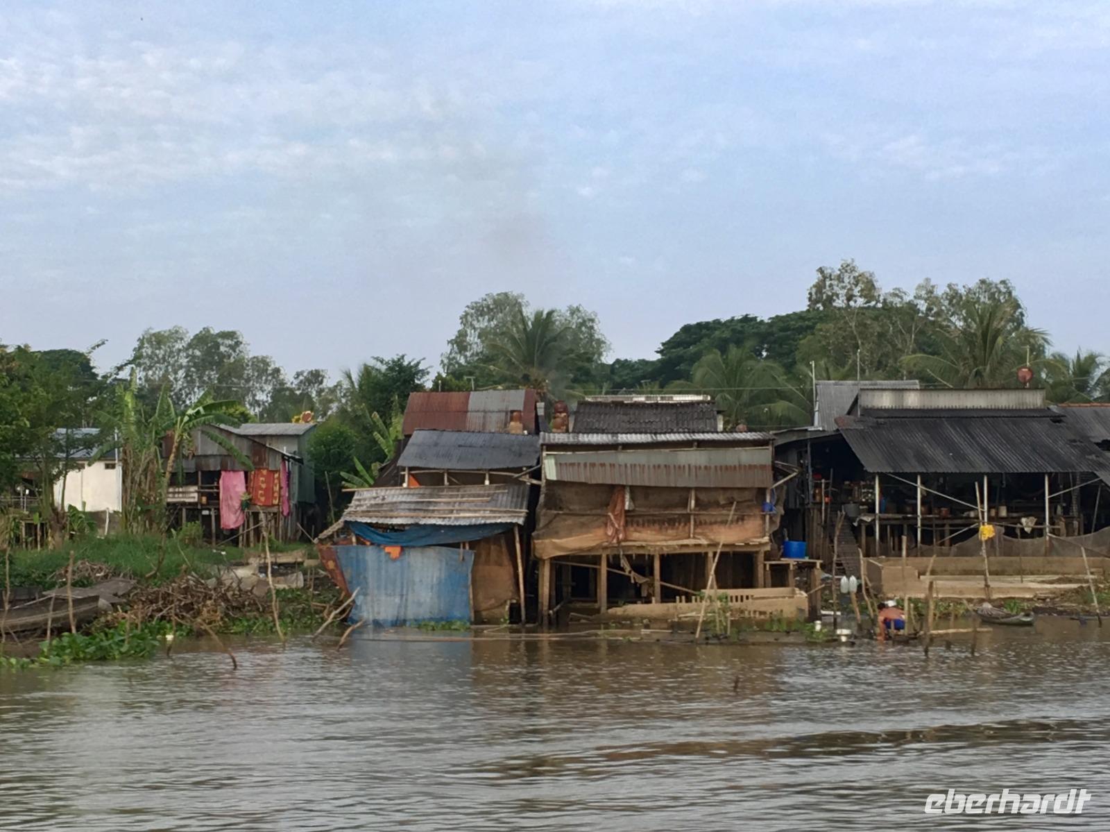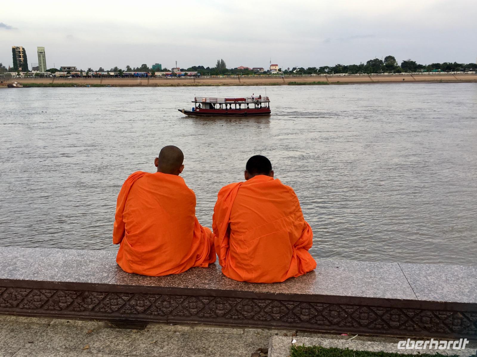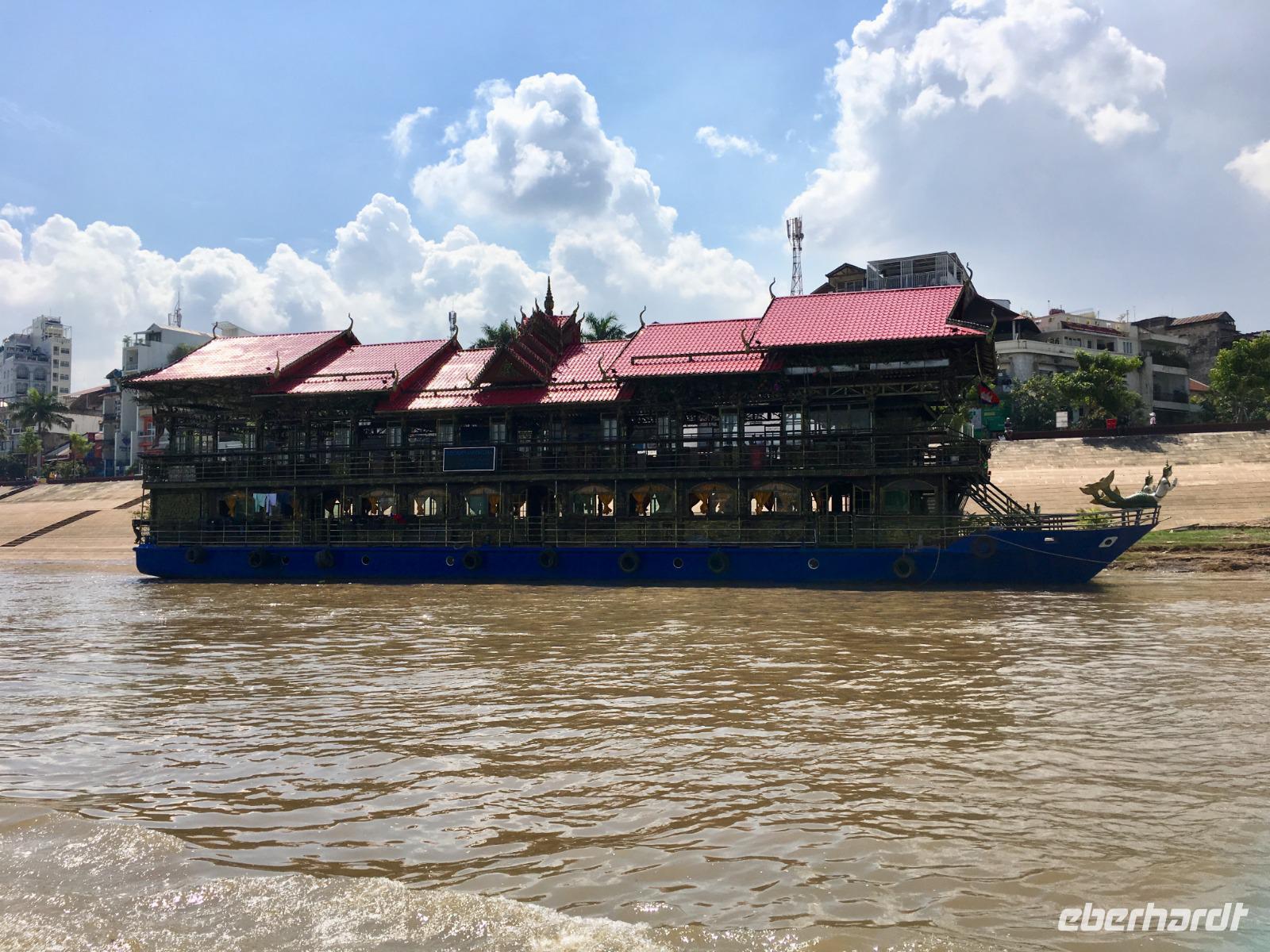 Bereits um 6:30 sind wir bereit um unseren naechsten Abschnitt der Reise anzutreten. Heute segeln wir auf dem Mekong flussaufwaerts nach Kambodscha. Erst einmal ins Schnellboot huepfen indem schon alle unsere Koffer geladen sind und ab geht es auf rasanter Fahrt den Mekong hinauf. Unsere gute Huong winkt uns noch zu und der Fahrer ist schon wieder unter seinem Bus versteckt, er arbeitet wohl an seiner Tuere, die seit gestern abend nur noch sporadisch auf-und zu geht. Vorbei an vielen Frachtschiffen und Faehren sowie Fischerboote und Sampan flitzen wir. Der Mekong ist noch immer braun, da es im Norden sehr viel geregnet hatte. In der Regenzeit schwillt der Fluss bis zu 3 Meter an, dann sind diese schoenen Inseln ueberschwemmt. Gerade deswegen ist das Land hier auch besonders fruchtbar. Ein Stunde und die ersten Bierchen spaeter sind wir bereits an der Grenze. May, unsere Bootsreiseleiterin hat bereits alle Vorkehrungen fuer uns getroffen und wir muessen lediglich noch einen Stempel in unseren Pass geben lassen. Der Grenzwart freut sich nicht besonders ueber so viel Arbeit und verbringt gute 5 Minuten damit, seine Stempel und Kugelschreiber auf seinem Schreibtisch zu ordnen und wiederzuordnen. May geht auch kurz bei ihm vorbei und oeffnet seine Schublade...schwups...ah, jetzt gehts, wir kommen dran. May muss uns nun hier leider verlassen und der charmante Doc uebernimmt das servieren der vielen Getraenke, Fruechte und Sandwiches. Nun geniessen wir noch 3 Stunden auf dem schoenen Mekong Fluss, bis wir in Phnom Penh ankommen. Der oertliche Reiseleiter Ahnan findet uns auch bald und faehrt mit uns und unseren Koffern zu einem sehr schoenen Hotel. Nun haben wir den Nachmittag zur freien Verfuegung. Einige gehen gleich mal schwimmen in dem grossen Aussenpool des Hotels, andere spazieren in die Stadtmitte und wieder andere ruhen sich einfach mal aus. Wir treffen uns dann alle wieder zum Abendessen und sind schon gespannt wie das hier in Kambodscha wohl schmecken wird. Erster Eindruck : schaerfer, andere Gewuerze wobei die Speisen nicht unbedingt anders ausschauen und die Leute sind hier noch freundlicher, falls dies ueberhaupt moeglich waere. Morgen haben wir Stadtbesichtigung mit einem anderen Reiseleiter und wir freuen uns schon darauf.