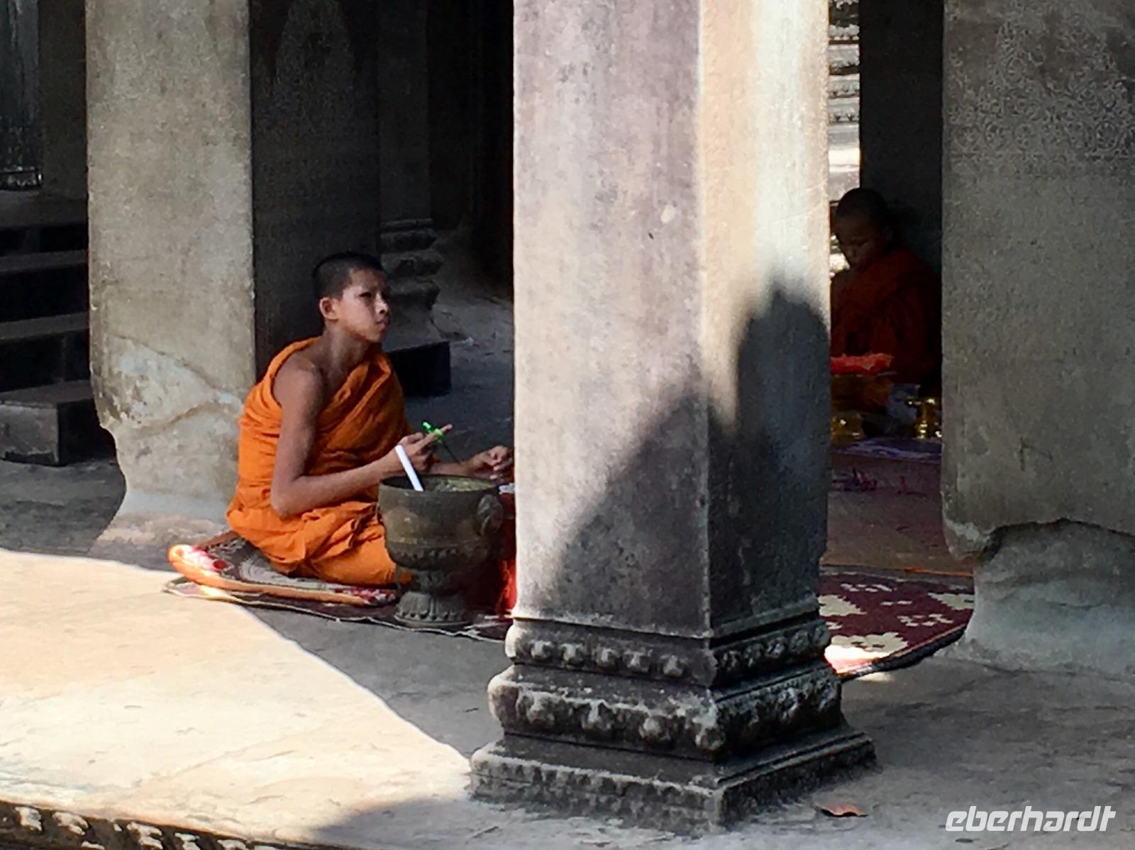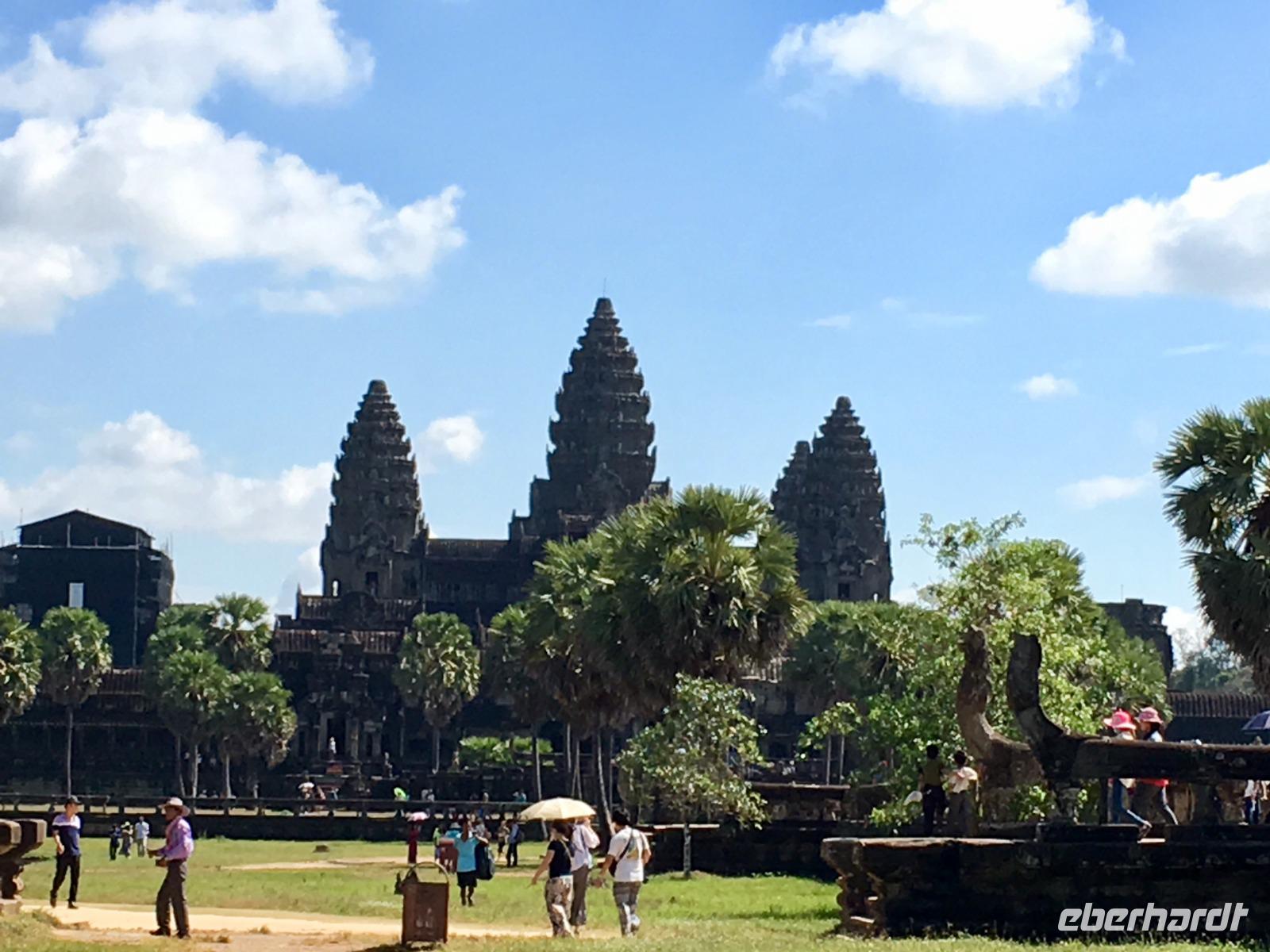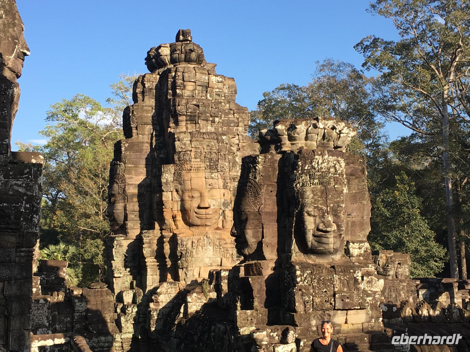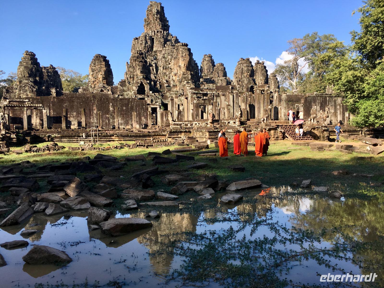 Um 8:00 Uhr stehen wir alle schon bereit in Tempelausruestung (Hosen bis zum Knie, T-Shirt mit Kurzarm, gutes Schuhwerk schnell zum aus- und anziehen). Da ist auch schon Thol mit einem riesen Blumenstrauss, lauter Lotusblumen hat er uns gebracht und Flaeschen dazu um die geschenkte Blume im Zimmer aufstellen zu koennen. Ahhh, danke schoen. Spaeter lernen wir dann auch noch, wie man so eine Blume falten kann, damit sie zu einer Rose oder Tulpe wird und sehr lange haelt. Gleich fahren wir die 2 Km bis zum Eintritts-karten-Palast. Keine ¼ Stunde spaeter sind wir ausgeruestet mit einer personalisierten Eintrittskarte zu den Angkor Tempel. Noch 5 Km und dann stehen wir vor diesem herrlichen UNESO Weltkulturerbe. Eine grosse Bruecke fuehrt ueber den Wassergraben zum West-Eingangs-Tempel des Angkor Wat Komplexes. Die eigentliche Steinbruecke wird gerade renoviert also spazieren wir auf einer Ersatzbruecke. Nein, Krokodile gibt es schon lange keine mehr in dem Graben aber Lotusblumen schon. Wir hoeren, wie die vielen Kriege, Kolonialherrschaften und politischen Perioden diese Tempel beschaedigt und teilweise zerstoert haben. Diese Buddistentempel wurden im 11. und 12. Jhrdt erbaut und von vielen nachfolgenden Religionen und Koenigen verwandelt, angepasst und «renoviert». Es war die Khmer Hauptstadt und hatte seine Bluetezeit vom 9. bis zum 15. Jhrdt. So sind sie heute Hindu-tempel geworden mit ein paar versteckten Buddahs meist in oberen, schwer erreichbaren Etagen. Das ganze Angkor Wat ist wie eine Stadt, mit einigen Gebaeuden, vielen Tempel, Terrassen, See, Moenchsquartiere und Ausgrabungsstellen. Wir klettern ueber viele Tuerschwellen, gehen vielen Gallerien entlang die mit herrlichem Tief-Relief verziert sind, steigen immer wieder Treppen hinauf und hinunter und vor allem, kommen wir aus dem Staunen kaum heraus. Ueberall herrliche Durchblicke, Ein- und Ausblicke. Die Kameras werden ganz wild und wollen immer ueberall dabei und zu vorderst sein. Wenn es nicht so irre heiss waere, kaeme eine echte Euphorie auf...aber eben, die Schweissperlen im Gesicht und die nassgeschwitzten Hemde zuegeln unsere Energie. Es gibt sogar eine Maenner- und 100 Mt entfernt eine Damenkueche. Auch sie schauen wie Tempel aus und wurden zu Bibliotheken umgewandelt. Ein paar «Billy» rein und tadah....aus Kueche wird Bibliothek ! Neben dem Restaurant sehen wir auch das Moenchkloster und die vielen Stupas. Die Mittagspause ist eine Erholung und die verschiedenen Salate und Speisen, geben uns die Kraft zum naechsten Tempel-Komplex. Er ist bloss 9Km2 gross und heisst Angkor Thom. Da gibt es 72 Tempel, einen Koenigspalast und eine Elefantenterrasse. Wir schauen uns vorerst Bayon Tempel an. Ein hochragender, reichdekorierter Khmer-Tempel mit vielen verschieden hohen Tuermen erwartet uns. Vor dem Tempel ein kleiner See und daneben 5 junge Moenche in ihren orange leuchtenden Kutten. Der Tempel ist grau, da er von einer japanischen Firma vor 2 Jahren gereinigt wurde. Das Moos und die Flaechten wachsen jedoch schnell wieder nach. Man stelle sich vor, blauer See, darin gespiegelter Tempel, saftig gruenes Grass mit orang bekleideten Moenchen vor dem Tempel, wolkendurchzogener blauer Himmel als Kanvas, das muss doch ein Paradestueck von Foto werden. Im Tempel drinnen wird es etwas eng, viele Durchgaenge und Kammern, Gallerien, Fenster und Tueren verleiten zu einem Versteckespiel. Aber wir sind Erwachsene also knipsen wir lustige Bilder von unseren Lieben und natuerlich auch von den schoenen Gesichter die riesengross in Stein gemeisselt, in verschiedene Richtungen schauend, die zahlreichen Tuerme, zieren. Nun besuchen wir noch die Elefantenterrasse, sie schaut auf eine grosse Flaeche hinunter wo Elefanten fuer Zuschauer kaempften. Auf der Wiese sehen wir keine Elefanten aber ein Aeffchen, wie es soeben von einer fahrenden Verkaeuferin eine Banane gestohlen hat und protzig nun dasitzt und das Gestohlene genuesslich verzehrt. Beim Ausgang kommen wir auch bei dekorierten Elefanten vorbei, knips, und wir fahren schon weiter zu unserem Hotel mit dem schoenen Schwimmbad. Das Abendessen ist beim Schwimmbad. Ein wunderbares Buffet wurde hergerichtet und eine Buehne aufgestellt. Die Tempeltaenzerinnen fuehren ihre zierliche Apsarataenze vor mit Bewegungen die wir heute in Stein gemeisselt schon gesehen haben. Ach wie schoen und gute Nacht.