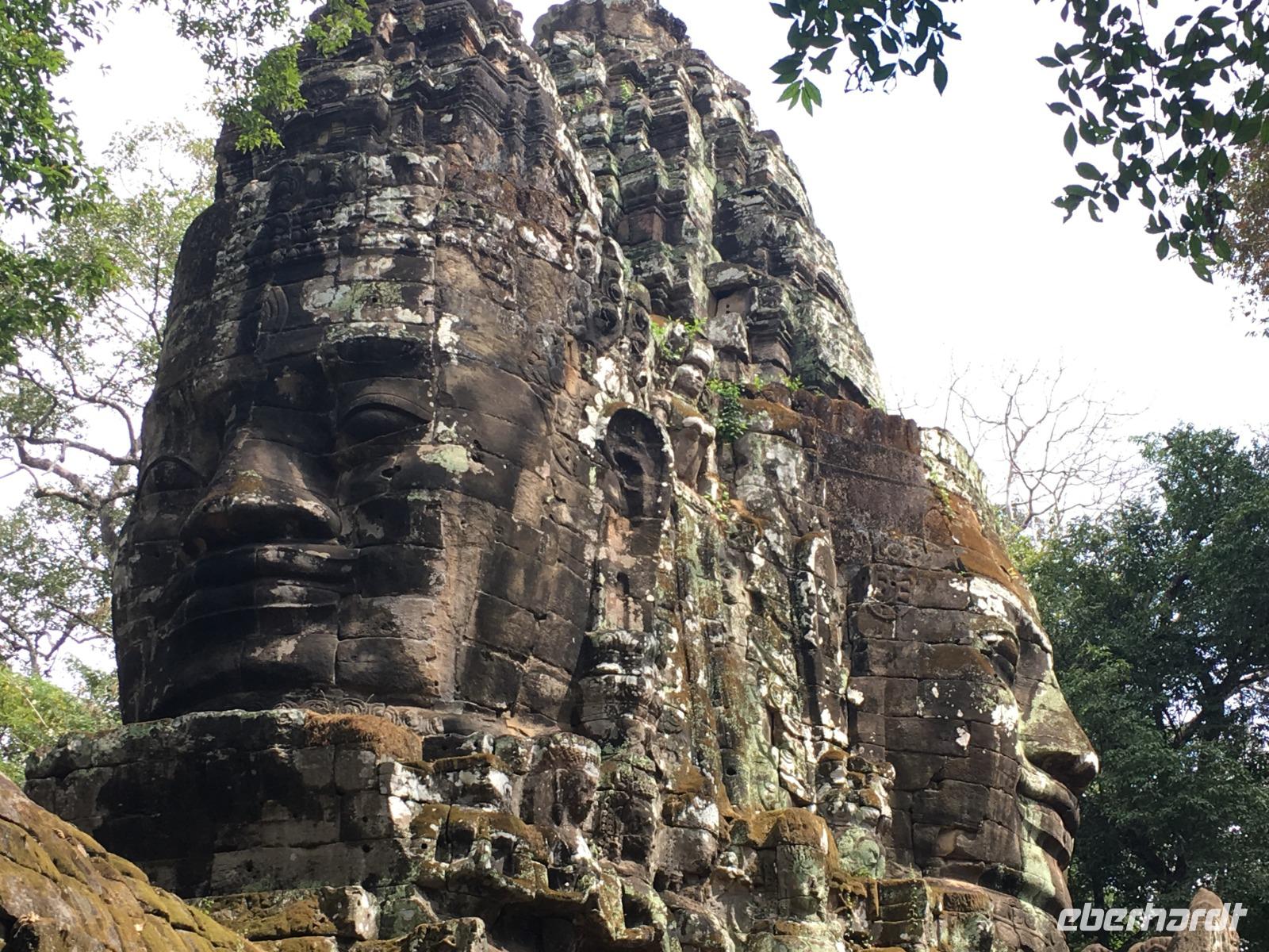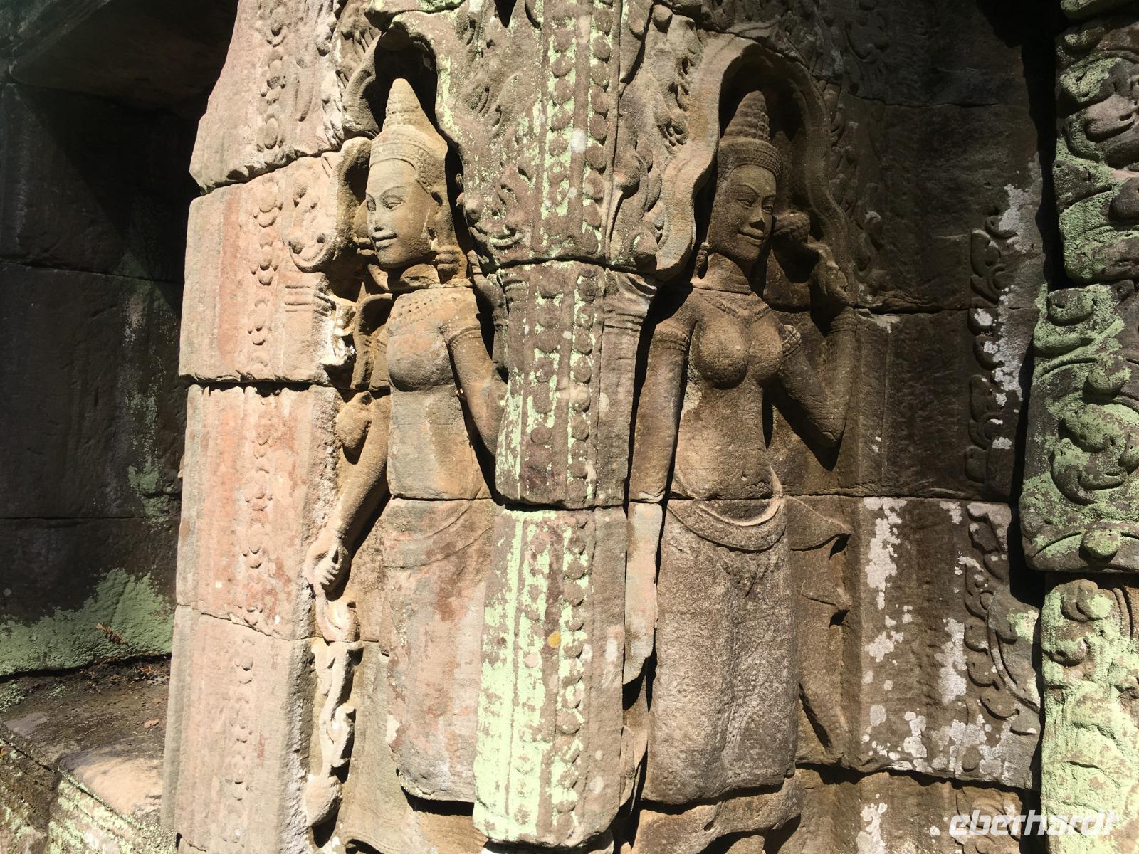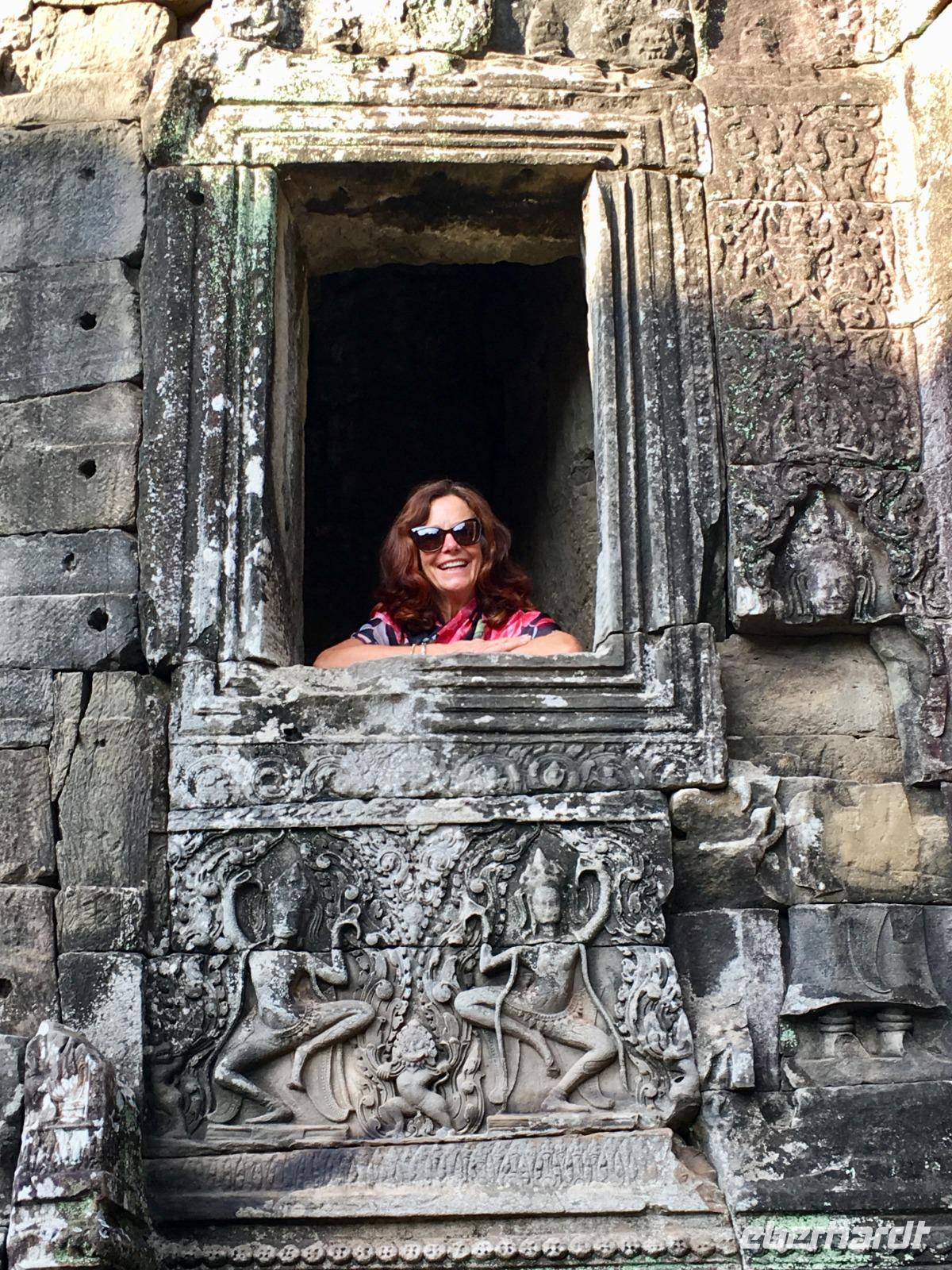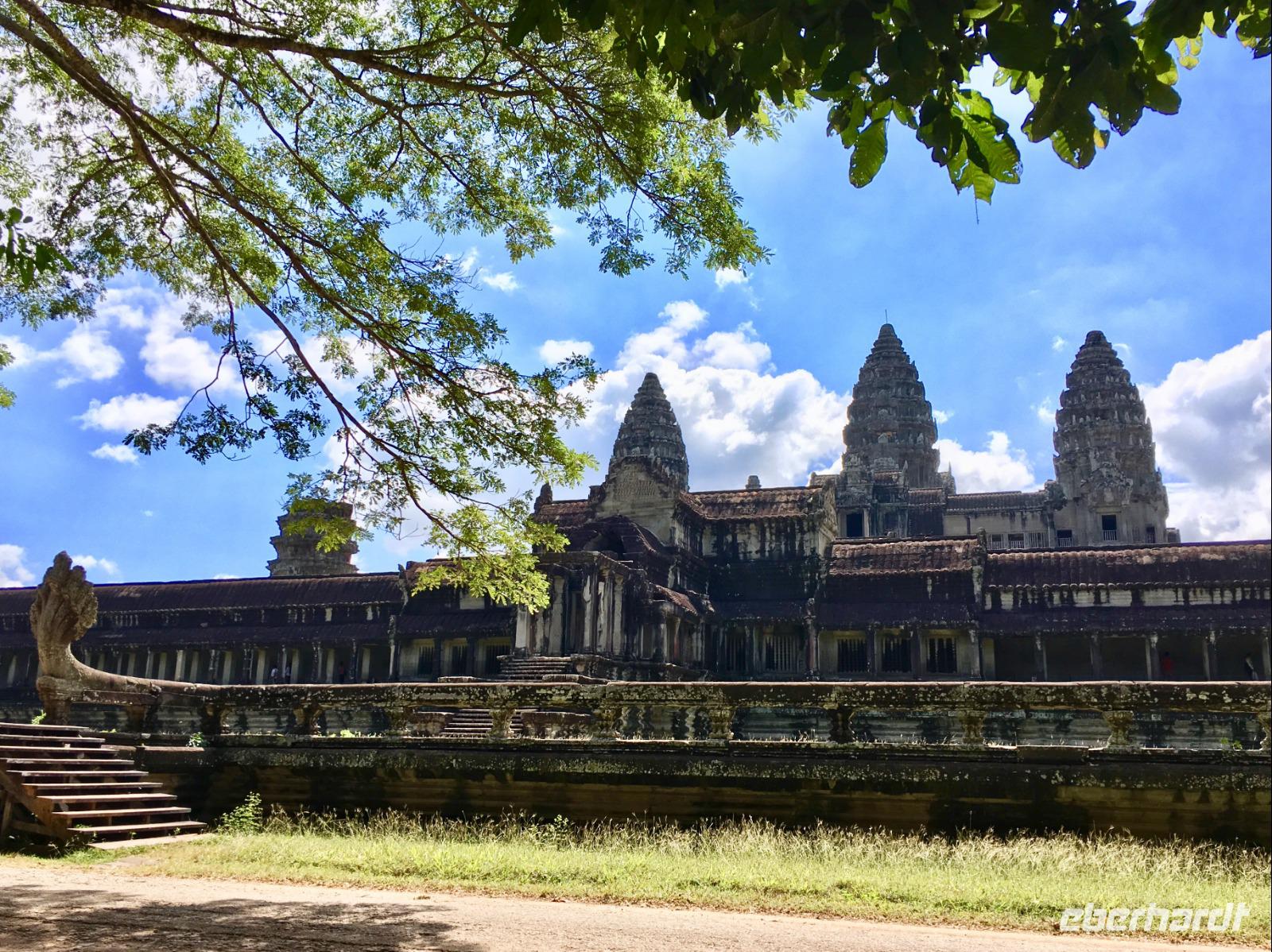 Um 8:00 Uhr stehen wir alle schon bereit in Tempelausruestung (Hosen bis zum Knie, T-Shirt mit Kurzarm, gutes Schuhwerk schnell zum aus- und anziehen). Da ist auch schon Thol mit einem riesen Blumenstrauss, lauter Lotusblumen hat er uns gebracht und Flaeschen dazu um die geschenkte Blume im Zimmer aufstellen zu koennen. Ahhh, danke schoen. Spaeter lernen wir dann auch noch, wie man so eine Blume falten kann, damit sie zu einer Rose oder Tulpe wird und sehr lange haelt. Gleich fahren wir die 2 Km bis zum Eintritts-karten-Palast. Keine ¼ Stunde spaeter sind wir ausgeruestet mit einer personalisierten Eintrittskarte zu den Angkor Tempel. Noch 5 Km und dann stehen wir vor diesem herrlichen UNESO Weltkulturerbe. Eine grosse Bruecke fuehrt ueber den Wassergraben zum West-Eingangs-Tempel des Angkor Wat Komplexes. Die eigentliche Steinbruecke wird gerade renoviert also spazieren wir auf einer Ersatzbruecke. Nein, Krokodile gibt es schon lange keine mehr in dem Graben aber Lotusblumen schon. Wir hoeren, wie die vielen Kriege, Kolonialherrschaften und politischen Perioden diese Tempel beschaedigt und teilweise zerstoert haben. Diese Buddistentempel wurden im 11. und 12. Jhrdt erbaut und von vielen nachfolgenden Religionen und Koenigen verwandelt, angepasst und «renoviert». Es war die Khmer Hauptstadt und hatte seine Bluetezeit vom 9. bis zum 15. Jhrdt. So sind sie heute Hindu-tempel geworden mit ein paar versteckten Buddahs meist in oberen, schwer erreichbaren Etagen. Das ganze Angkor Wat ist wie eine Stadt, mit einigen Gebaeuden, vielen Tempel, Terrassen, See, Moenchsquartiere und Ausgrabungsstellen. Wir klettern ueber viele Tuerschwellen, gehen vielen Gallerien entlang die mit herrlichem Tief-Relief verziert sind, steigen immer wieder Treppen hinauf und hinunter und vor allem, kommen wir aus dem Staunen kaum heraus. Ueberall herrliche Durchblicke, Ein- und Ausblicke. Die Kameras werden ganz wild und wollen immer ueberall dabei und zu vorderst sein. Wenn es nicht so irre heiss waere, kaeme eine echte Euphorie auf...aber eben, die Schweissperlen im Gesicht und die nassgeschwitzten Hemde zuegeln unsere Energie. Es gibt sogar eine Maenner- und 100 Mt entfernt eine Damenkueche. Auch sie schauen wie Tempel aus und wurden zu Bibliotheken umgewandelt. Ein paar «Billy» rein und tadah....aus Kueche wird Bibliothek ! Neben dem Restaurant sehen wir auch das Moenchkloster und die vielen Stupas. Die Mittagspause ist eine Erholung und die verschiedenen Salate und Speisen, geben uns die Kraft zum naechsten Tempel-Komplex. Er ist bloss 9Km2 gross und heisst Angkor Thom. Da gibt es 72 Tempel, einen Koenigspalast und eine Elefantenterrasse. Wir schauen uns vorerst Bayon Tempel an. Ein hochragender, reichdekorierter Khmer-Tempel mit vielen verschieden hohen Tuermen erwartet uns. Vor dem Tempel ein kleiner See und daneben 5 junge Moenche in ihren orange leuchtenden Kutten. Der Tempel ist grau, da er von einer japanischen Firma vor 2 Jahren gereinigt wurde. Das Moos und die Flaechten wachsen jedoch schnell wieder nach. Man stelle sich vor, blauer See, darin gespiegelter Tempel, saftig gruenes Grass mit orang bekleideten Moenchen vor dem Tempel, wolkendurchzogener blauer Himmel als Kanvas, das muss doch ein Paradestueck von Foto werden. Im Tempel drinnen wird es etwas eng, viele Durchgaenge und Kammern, Gallerien, Fenster und Tueren verleiten zu einem Versteckespiel. Aber wir sind Erwachsene also knipsen wir lustige Bilder von unseren Lieben und natuerlich auch von den schoenen Gesichter die riesengross in Stein gemeisselt, in verschiedene Richtungen schauend, die zahlreichen Tuerme, zieren. Nun besuchen wir noch die Elefantenterrasse, sie schaut auf eine grosse Flaeche hinunter wo Elefanten fuer Zuschauer kaempften. Auf der Wiese sehen wir keine Elefanten aber ein Aeffchen, wie es soeben von einer fahrenden Verkaeuferin eine Banane gestohlen hat und protzig nun dasitzt und das Gestohlene genuesslich verzehrt. Beim Ausgang kommen wir auch bei dekorierten Elefanten vorbei, knips, und wir fahren schon weiter zu unserem Hotel mit dem schoenen Schwimmbad. Das Abendessen ist beim Schwimmbad. Ein wunderbares Buffet wurde hergerichtet und eine Buehne aufgestellt. Die Tempeltaenzerinnen fuehren ihre zierliche Apsarataenze vor mit Bewegungen die wir heute in Stein gemeisselt schon gesehen haben. Ach wie schoen und gute Nacht.