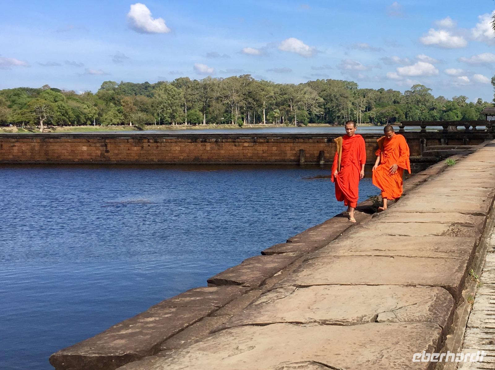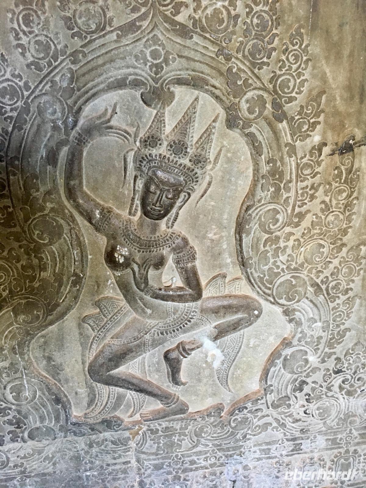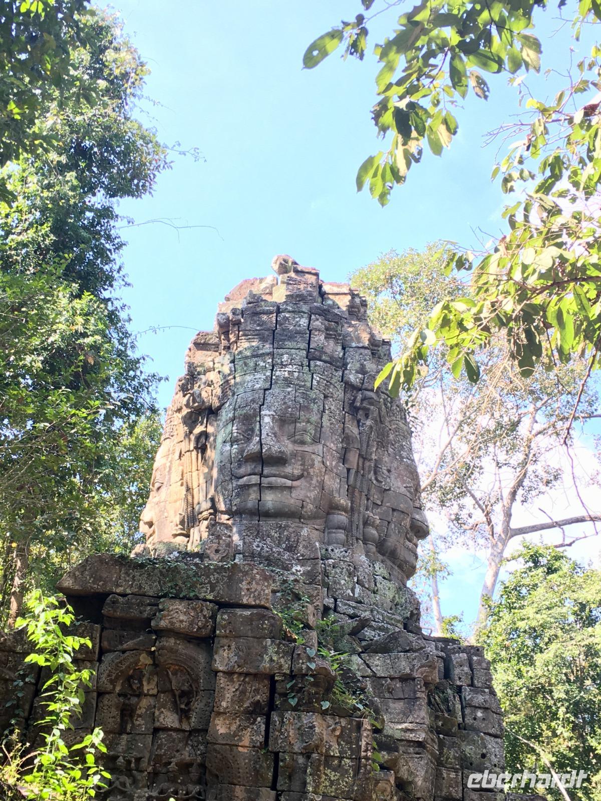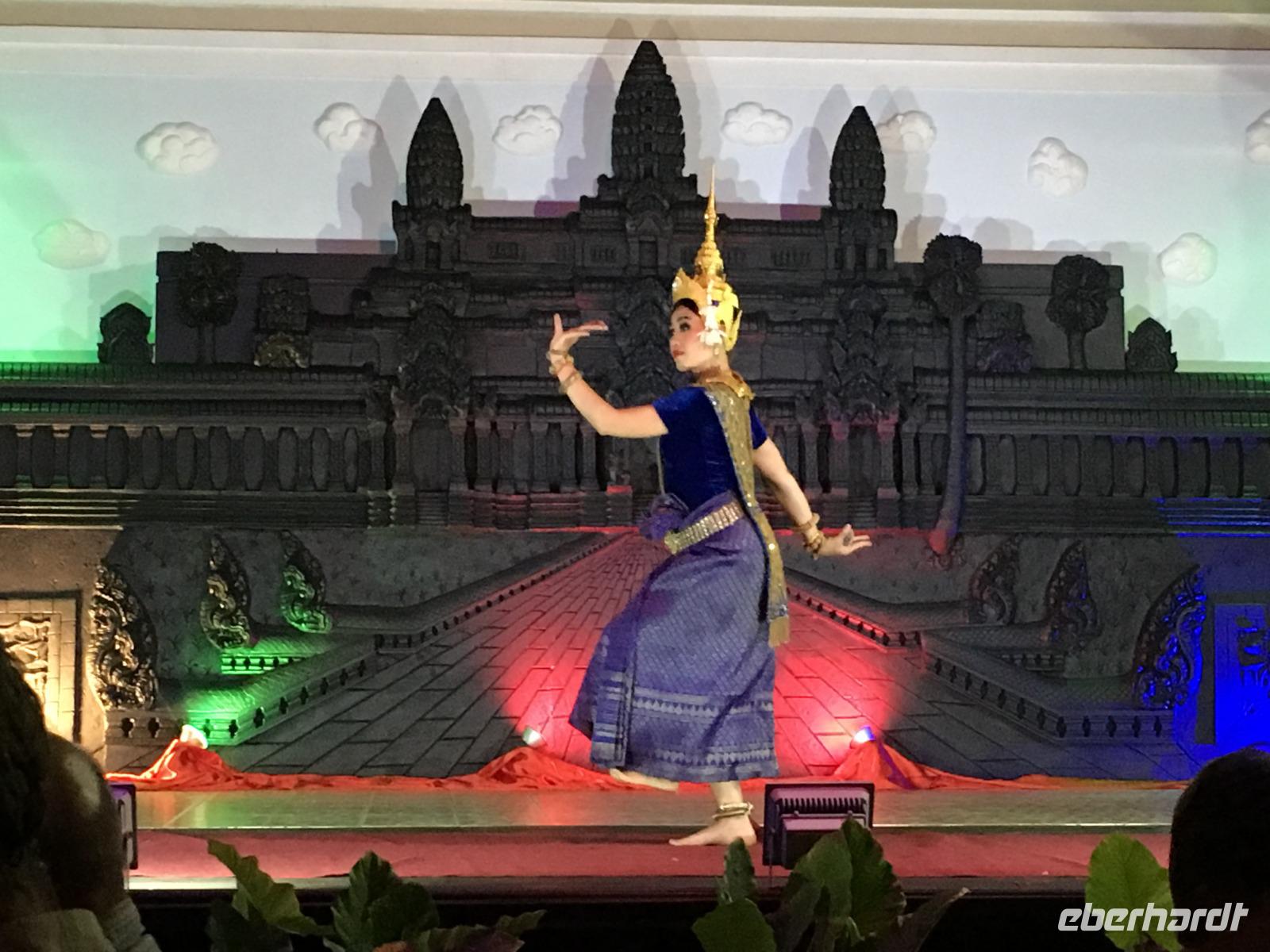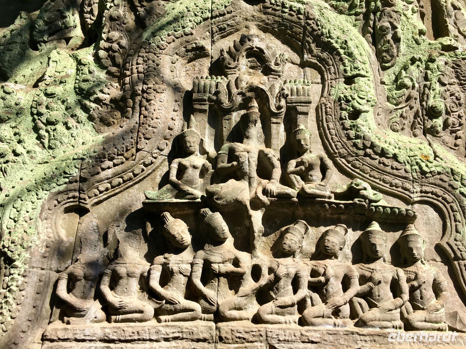 Um 8:00 Uhr stehen wir alle schon bereit in Tempelausruestung (Hosen bis zum Knie, T-Shirt mit Kurzarm, gutes Schuhwerk schnell zum aus- und anziehen). Da ist auch schon Thol mit einem riesen Blumenstrauss, lauter Lotusblumen hat er uns gebracht und Flaeschen dazu um die geschenkte Blume im Zimmer aufstellen zu koennen. Ahhh, danke schoen. Spaeter lernen wir dann auch noch, wie man so eine Blume falten kann, damit sie zu einer Rose oder Tulpe wird und sehr lange haelt. Gleich fahren wir die 2 Km bis zum Eintritts-karten-Palast. Keine ¼ Stunde spaeter sind wir ausgeruestet mit einer personalisierten Eintrittskarte zu den Angkor Tempel. Noch 5 Km und dann stehen wir vor diesem herrlichen UNESO Weltkulturerbe. Eine grosse Bruecke fuehrt ueber den Wassergraben zum West-Eingangs-Tempel des Angkor Wat Komplexes. Die eigentliche Steinbruecke wird gerade renoviert also spazieren wir auf einer Ersatzbruecke. Nein, Krokodile gibt es schon lange keine mehr in dem Graben aber Lotusblumen schon. Wir hoeren, wie die vielen Kriege, Kolonialherrschaften und politischen Perioden diese Tempel beschaedigt und teilweise zerstoert haben. Diese Buddistentempel wurden im 11. und 12. Jhrdt erbaut und von vielen nachfolgenden Religionen und Koenigen verwandelt, angepasst und «renoviert». Es war die Khmer Hauptstadt und hatte seine Bluetezeit vom 9. bis zum 15. Jhrdt. So sind sie heute Hindu-tempel geworden mit ein paar versteckten Buddahs meist in oberen, schwer erreichbaren Etagen. Das ganze Angkor Wat ist wie eine Stadt, mit einigen Gebaeuden, vielen Tempel, Terrassen, See, Moenchsquartiere und Ausgrabungsstellen. Wir klettern ueber viele Tuerschwellen, gehen vielen Gallerien entlang die mit herrlichem Tief-Relief verziert sind, steigen immer wieder Treppen hinauf und hinunter und vor allem, kommen wir aus dem Staunen kaum heraus. Ueberall herrliche Durchblicke, Ein- und Ausblicke. Die Kameras werden ganz wild und wollen immer ueberall dabei und zu vorderst sein. Wenn es nicht so irre heiss waere, kaeme eine echte Euphorie auf...aber eben, die Schweissperlen im Gesicht und die nassgeschwitzten Hemde zuegeln unsere Energie. Es gibt sogar eine Maenner- und 100 Mt entfernt eine Damenkueche. Auch sie schauen wie Tempel aus und wurden zu Bibliotheken umgewandelt. Ein paar «Billy» rein und tadah....aus Kueche wird Bibliothek ! Neben dem Restaurant sehen wir auch das Moenchkloster und die vielen Stupas. Die Mittagspause ist eine Erholung und die verschiedenen Salate und Speisen, geben uns die Kraft zum naechsten Tempel-Komplex. Er ist bloss 9Km2 gross und heisst Angkor Thom. Da gibt es 72 Tempel, einen Koenigspalast und eine Elefantenterrasse. Wir schauen uns vorerst Bayon Tempel an. Ein hochragender, reichdekorierter Khmer-Tempel mit vielen verschieden hohen Tuermen erwartet uns. Vor dem Tempel ein kleiner See und daneben 5 junge Moenche in ihren orange leuchtenden Kutten. Der Tempel ist grau, da er von einer japanischen Firma vor 2 Jahren gereinigt wurde. Das Moos und die Flaechten wachsen jedoch schnell wieder nach. Man stelle sich vor, blauer See, darin gespiegelter Tempel, saftig gruenes Grass mit orang bekleideten Moenchen vor dem Tempel, wolkendurchzogener blauer Himmel als Kanvas, das muss doch ein Paradestueck von Foto werden. Im Tempel drinnen wird es etwas eng, viele Durchgaenge und Kammern, Gallerien, Fenster und Tueren verleiten zu einem Versteckespiel. Aber wir sind Erwachsene also knipsen wir lustige Bilder von unseren Lieben und natuerlich auch von den schoenen Gesichter die riesengross in Stein gemeisselt, in verschiedene Richtungen schauend, die zahlreichen Tuerme, zieren. Nun besuchen wir noch die Elefantenterrasse, sie schaut auf eine grosse Flaeche hinunter wo Elefanten fuer Zuschauer kaempften. Auf der Wiese sehen wir keine Elefanten aber ein Aeffchen, wie es soeben von einer fahrenden Verkaeuferin eine Banane gestohlen hat und protzig nun dasitzt und das Gestohlene genuesslich verzehrt. Beim Ausgang kommen wir auch bei dekorierten Elefanten vorbei, knips, und wir fahren schon weiter zu unserem Hotel mit dem schoenen Schwimmbad. Das Abendessen ist beim Schwimmbad. Ein wunderbares Buffet wurde hergerichtet und eine Buehne aufgestellt. Die Tempeltaenzerinnen fuehren ihre zierliche Apsarataenze vor mit Bewegungen die wir heute in Stein gemeisselt schon gesehen haben. Ach wie schoen und gute Nacht.