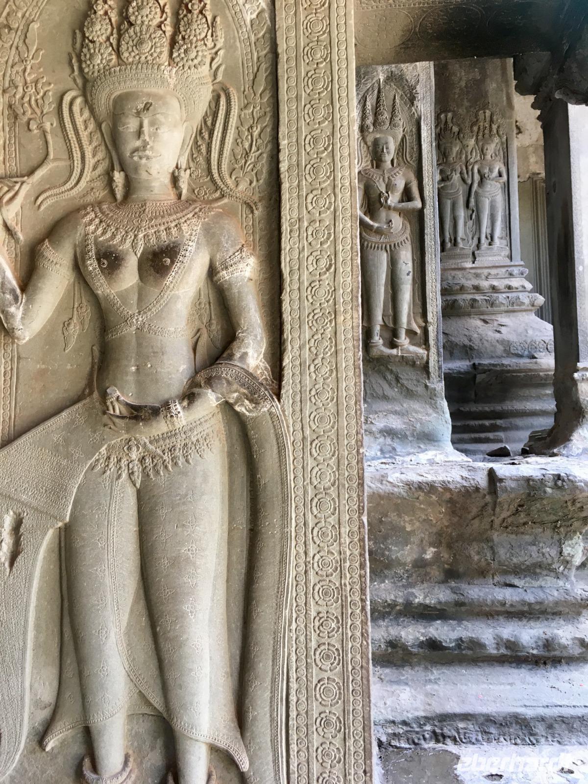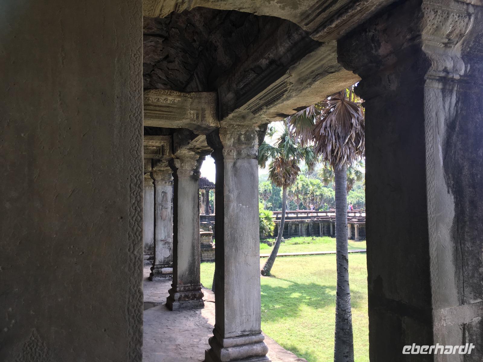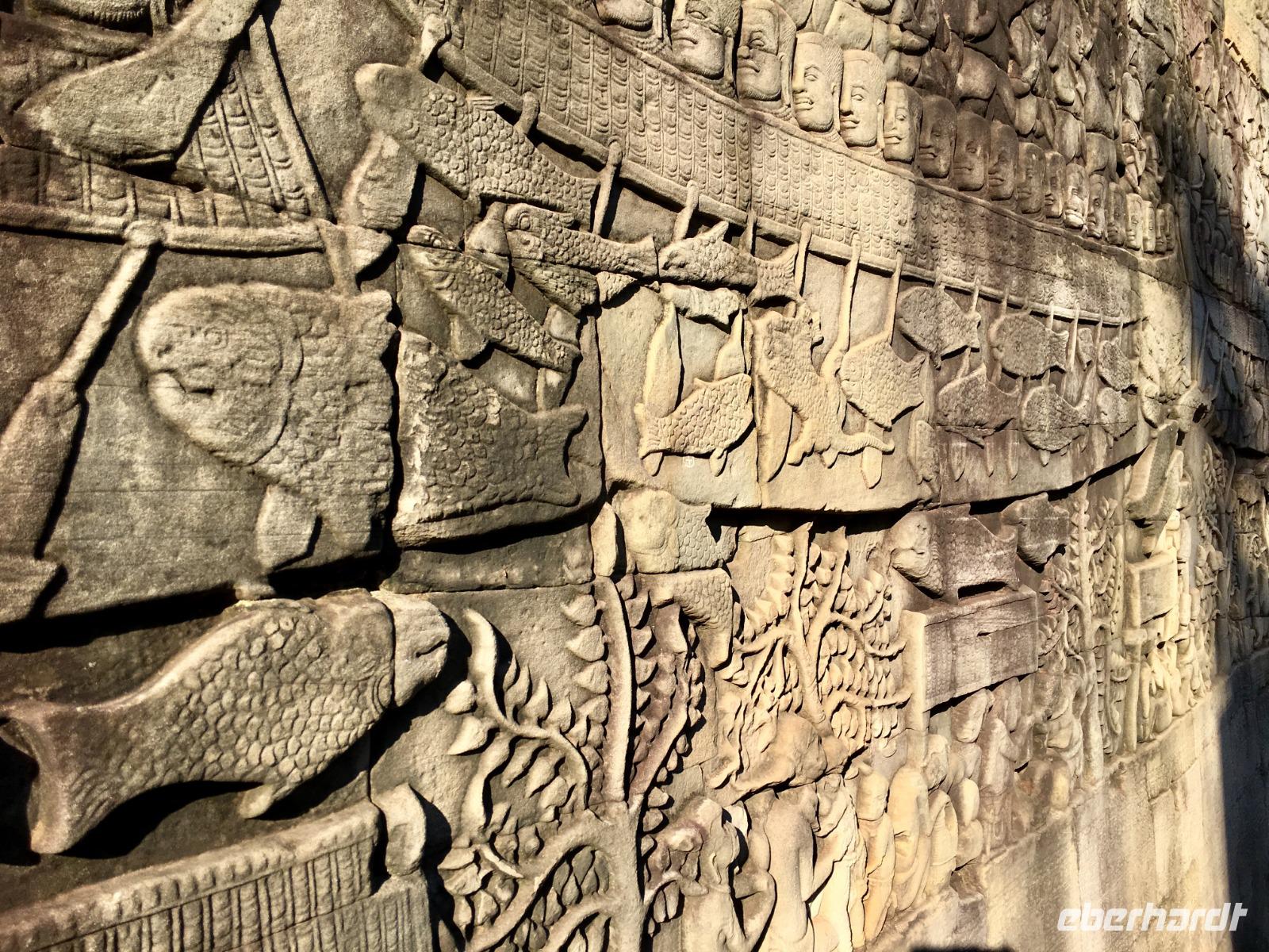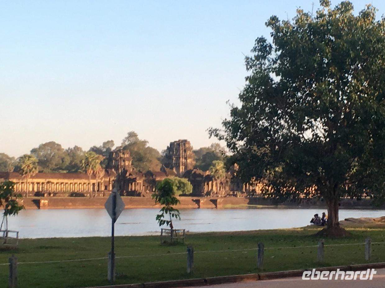 Um 8:00 Uhr stehen wir alle schon bereit in Tempelausruestung (Hosen bis zum Knie, T-Shirt mit Kurzarm, gutes Schuhwerk schnell zum aus- und anziehen). Da ist auch schon Thol mit einem riesen Blumenstrauss, lauter Lotusblumen hat er uns gebracht und Flaeschen dazu um die geschenkte Blume im Zimmer aufstellen zu koennen. Ahhh, danke schoen. Spaeter lernen wir dann auch noch, wie man so eine Blume falten kann, damit sie zu einer Rose oder Tulpe wird und sehr lange haelt. Gleich fahren wir die 2 Km bis zum Eintritts-karten-Palast. Keine ¼ Stunde spaeter sind wir ausgeruestet mit einer personalisierten Eintrittskarte zu den Angkor Tempel. Noch 5 Km und dann stehen wir vor diesem herrlichen UNESO Weltkulturerbe. Eine grosse Bruecke fuehrt ueber den Wassergraben zum West-Eingangs-Tempel des Angkor Wat Komplexes. Die eigentliche Steinbruecke wird gerade renoviert also spazieren wir auf einer Ersatzbruecke. Nein, Krokodile gibt es schon lange keine mehr in dem Graben aber Lotusblumen schon. Wir hoeren, wie die vielen Kriege, Kolonialherrschaften und politischen Perioden diese Tempel beschaedigt und teilweise zerstoert haben. Diese Buddistentempel wurden im 11. und 12. Jhrdt erbaut und von vielen nachfolgenden Religionen und Koenigen verwandelt, angepasst und «renoviert». Es war die Khmer Hauptstadt und hatte seine Bluetezeit vom 9. bis zum 15. Jhrdt. So sind sie heute Hindu-tempel geworden mit ein paar versteckten Buddahs meist in oberen, schwer erreichbaren Etagen. Das ganze Angkor Wat ist wie eine Stadt, mit einigen Gebaeuden, vielen Tempel, Terrassen, See, Moenchsquartiere und Ausgrabungsstellen. Wir klettern ueber viele Tuerschwellen, gehen vielen Gallerien entlang die mit herrlichem Tief-Relief verziert sind, steigen immer wieder Treppen hinauf und hinunter und vor allem, kommen wir aus dem Staunen kaum heraus. Ueberall herrliche Durchblicke, Ein- und Ausblicke. Die Kameras werden ganz wild und wollen immer ueberall dabei und zu vorderst sein. Wenn es nicht so irre heiss waere, kaeme eine echte Euphorie auf...aber eben, die Schweissperlen im Gesicht und die nassgeschwitzten Hemde zuegeln unsere Energie. Es gibt sogar eine Maenner- und 100 Mt entfernt eine Damenkueche. Auch sie schauen wie Tempel aus und wurden zu Bibliotheken umgewandelt. Ein paar «Billy» rein und tadah....aus Kueche wird Bibliothek ! Neben dem Restaurant sehen wir auch das Moenchkloster und die vielen Stupas. Die Mittagspause ist eine Erholung und die verschiedenen Salate und Speisen, geben uns die Kraft zum naechsten Tempel-Komplex. Er ist bloss 9Km2 gross und heisst Angkor Thom. Da gibt es 72 Tempel, einen Koenigspalast und eine Elefantenterrasse. Wir schauen uns vorerst Bayon Tempel an. Ein hochragender, reichdekorierter Khmer-Tempel mit vielen verschieden hohen Tuermen erwartet uns. Vor dem Tempel ein kleiner See und daneben 5 junge Moenche in ihren orange leuchtenden Kutten. Der Tempel ist grau, da er von einer japanischen Firma vor 2 Jahren gereinigt wurde. Das Moos und die Flaechten wachsen jedoch schnell wieder nach. Man stelle sich vor, blauer See, darin gespiegelter Tempel, saftig gruenes Grass mit orang bekleideten Moenchen vor dem Tempel, wolkendurchzogener blauer Himmel als Kanvas, das muss doch ein Paradestueck von Foto werden. Im Tempel drinnen wird es etwas eng, viele Durchgaenge und Kammern, Gallerien, Fenster und Tueren verleiten zu einem Versteckespiel. Aber wir sind Erwachsene also knipsen wir lustige Bilder von unseren Lieben und natuerlich auch von den schoenen Gesichter die riesengross in Stein gemeisselt, in verschiedene Richtungen schauend, die zahlreichen Tuerme, zieren. Nun besuchen wir noch die Elefantenterrasse, sie schaut auf eine grosse Flaeche hinunter wo Elefanten fuer Zuschauer kaempften. Auf der Wiese sehen wir keine Elefanten aber ein Aeffchen, wie es soeben von einer fahrenden Verkaeuferin eine Banane gestohlen hat und protzig nun dasitzt und das Gestohlene genuesslich verzehrt. Beim Ausgang kommen wir auch bei dekorierten Elefanten vorbei, knips, und wir fahren schon weiter zu unserem Hotel mit dem schoenen Schwimmbad. Das Abendessen ist beim Schwimmbad. Ein wunderbares Buffet wurde hergerichtet und eine Buehne aufgestellt. Die Tempeltaenzerinnen fuehren ihre zierliche Apsarataenze vor mit Bewegungen die wir heute in Stein gemeisselt schon gesehen haben. Ach wie schoen und gute Nacht.