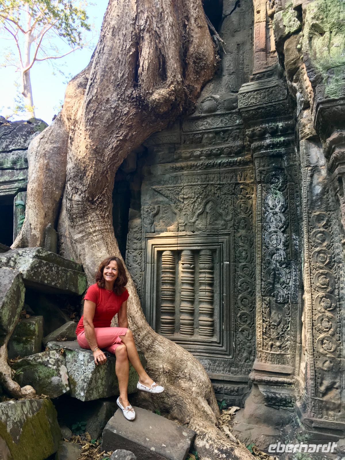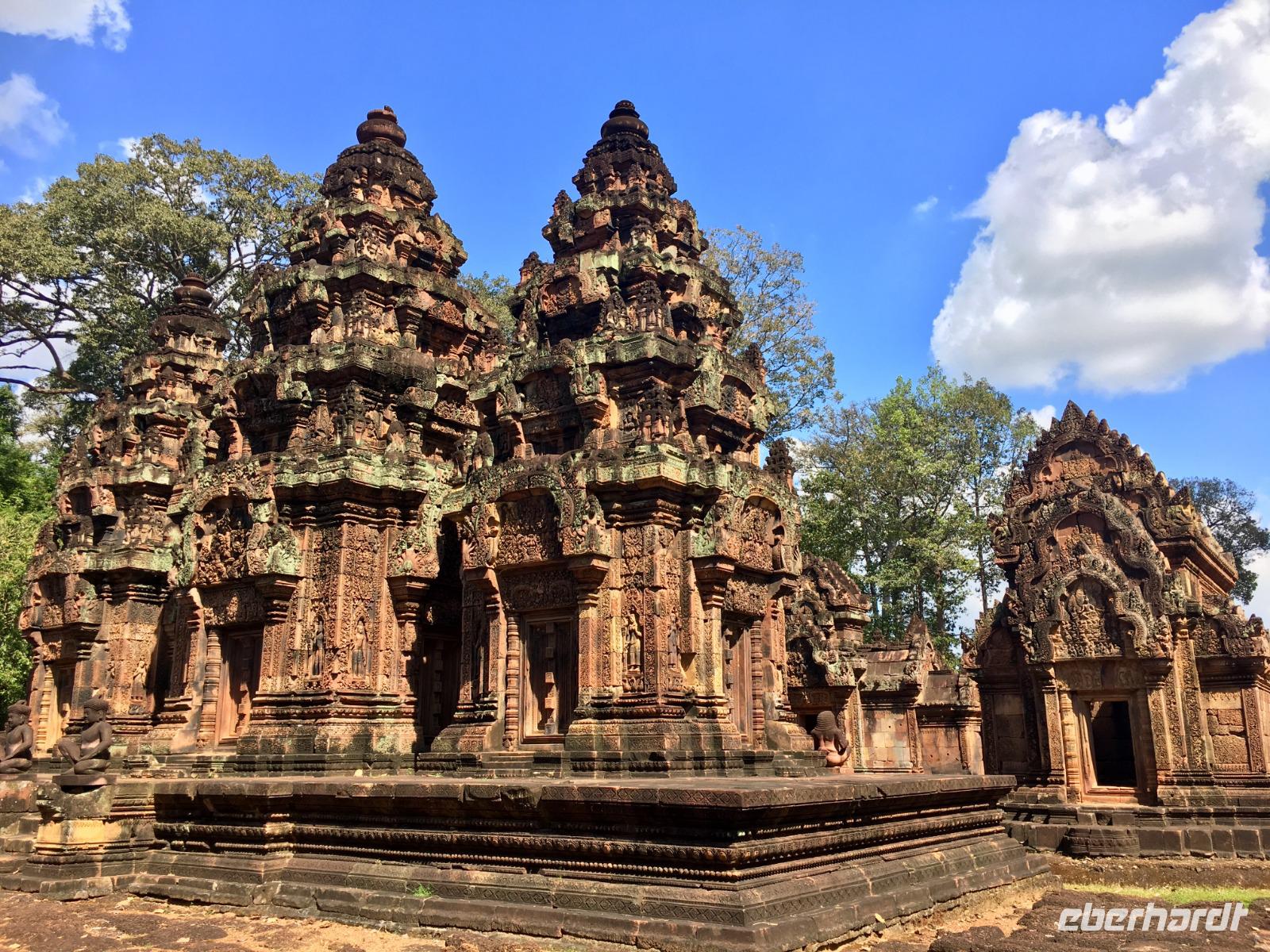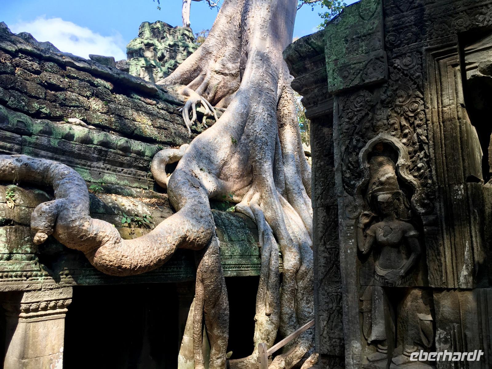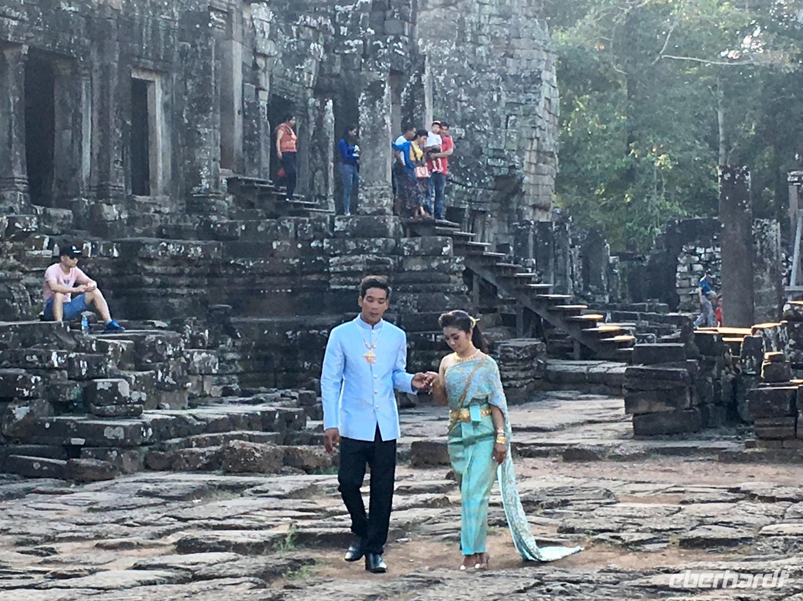 Heute nehmen wir die persoenlichen Eintrittskarten mit Photo wieder mit, denn wir haben zwei ganz besondere Sehenswuerdigkeiten auf dem Programm. Vorerst wieder aus Siem Reap heraus beim Spital vorbei wo frueher die Tieger aus dem Teich getrunken haben, laut Legende der Aelteren. 12 Km spater sind wir beim Tempel Ta Prohm. Er wird auch liebevoll der Dschungel-Tempel genannt da er mitten in einem dichten Wald steht und seine grossen, dicken Chamba- und Harzbeaume mit den Tempeltuermen um die Wette eifern. Wer stuetzt wen, Natur und Kultur leben hier in Eintracht und die ausgewogenen Gesichter von Buddah sowie die grazioesen, eingemeisselten Asparataenzerinnen zieren die Tempeltuerme. Eine hohe Mauer umringt diese Tempelanlage und wir klettern und kraxeln auf vielen Steinbloecken herum um noch mehr zu sehen und vielleicht doch ein, noch nie gemachtes Bild, zu erhaschen. Die Motive sind manigfaltig, ueberall stehen riesen Baeume auf den Tuermen und Mauern und ihre Wurzeln zieren das Mauerwerk. Manchmal schaut es aus wie ein Oktopus manchmal eine Schlange oder ein Wasserfall. Der Fantasie sind hier keine Grenzen gesetzt. Dieser Tempel wurde schon fuer einige Filme genuezt und ein Paeaerchen hat sich heute diese Kulisse fuer ein Hochzeitsbild ausgesucht. Die Braut ist Gelb gekleidet also ist es Dienstag....eine Woche lang, werden jeden Tag Photos des Brautpaares gemacht, jeden Tag in einer anderen Farbe. Lange bleiben wir hier, dieser Tempel ist allzu interessant. Ein Spaziergang durch den Dschungel bringt uns danach an einer Tarantula- und einer Grillen- Behausung vorbei. Wir sehen auch Massen von Termiten an der Arbeit, ehe wir beim Nordtor des Ta Phrom Tempels hinausgehen. Auch dieser Ein/Ausgang hat einen Turm mit wunderbar schoenen Buddah Gesichter. Wir fahren nun mit dem Bus weiter und benutzen dieses Mal das Siegestor um von Angkor raus zu fahren. Nur wenn ein Sieg gelungen war, kam die Armee durch dieses reichdekorierte Tor in die Angkor Stadt, ansonsten gab es das Todestor, uuups. Nach 25 Km sind wir bei unserem naechsten Tempel. Es ist der Banteay Srei auch Damen Tempel genannt. Er ist etwas abgelegen, war aber auch einmal Teil einer grossen Stadt in der Angkor Periode. Er ist von einer Mauer und einem Wassergraben umgeben und hat die allerschoensten Filigranreliefe aller hiesiger Tempel. Der Stein der hier benutzt wurde ist rosa und die Farbe kaempft mit dem Moos und den Flechten die sich hier ansiedeln wollen. Die Tuerme sind viel zierlicher und kleiner, die original Tuer- und Fensterrahmen stehen auch alle noch und viele Buddah Representationen sind noch immer ersichtlich und wurden noch nicht zerstoert. Als Beschuetzer sitzten auch immer wieder Affen auf den Simsen und Terrassen auch sie sind aus Stein gemeisselt und machen sich ueber manche lebendige Makake lustig. Wir staunen ueber die preziesen Reliefe, horchen den interessanten Geschichten Thols zu und knipsen unmengen von Bilder. Thol fuehlt sich hier freier und seine Erklaerungen sind sehr interessant. Hier schiessen wir auch das obligate Spiegelbild Foto fuer die Titelseite des Albums «Eberhardts Schaetze Suedost Asiens». Nun gehts aber zurueck zum Hotel mit dem schoenen Pool. Unterwegs halten wir immer wieder bei aermeren Familien an und beschenken sie mit unseren mitgebrachten Sachen. So viele glueckliche Gesichter sehen wir. Spaeter gibt es ein sehr feines Abendessen in einer Baumkronen-Oase und zum Abschluss statten wir der beruehmten Pub Street auch noch einen Besuch ab. Hier ist es sehr, sehr laut und lustig. Leute ueberall, jung und alt prominiert auf dieser Strasse die sich wie ein riesen Club benimmt. Das ist nun echt ein voller, wunderbarer Tag und das Bettchen ruft schon von weitem....