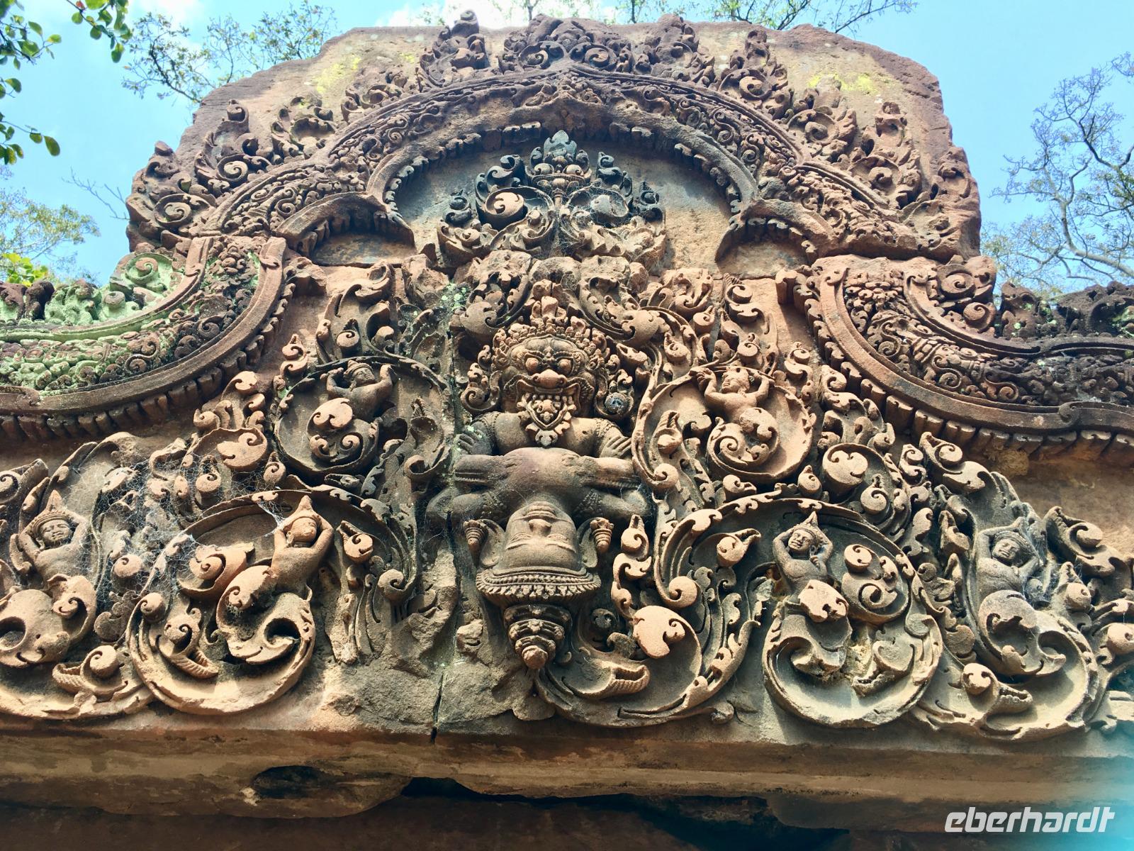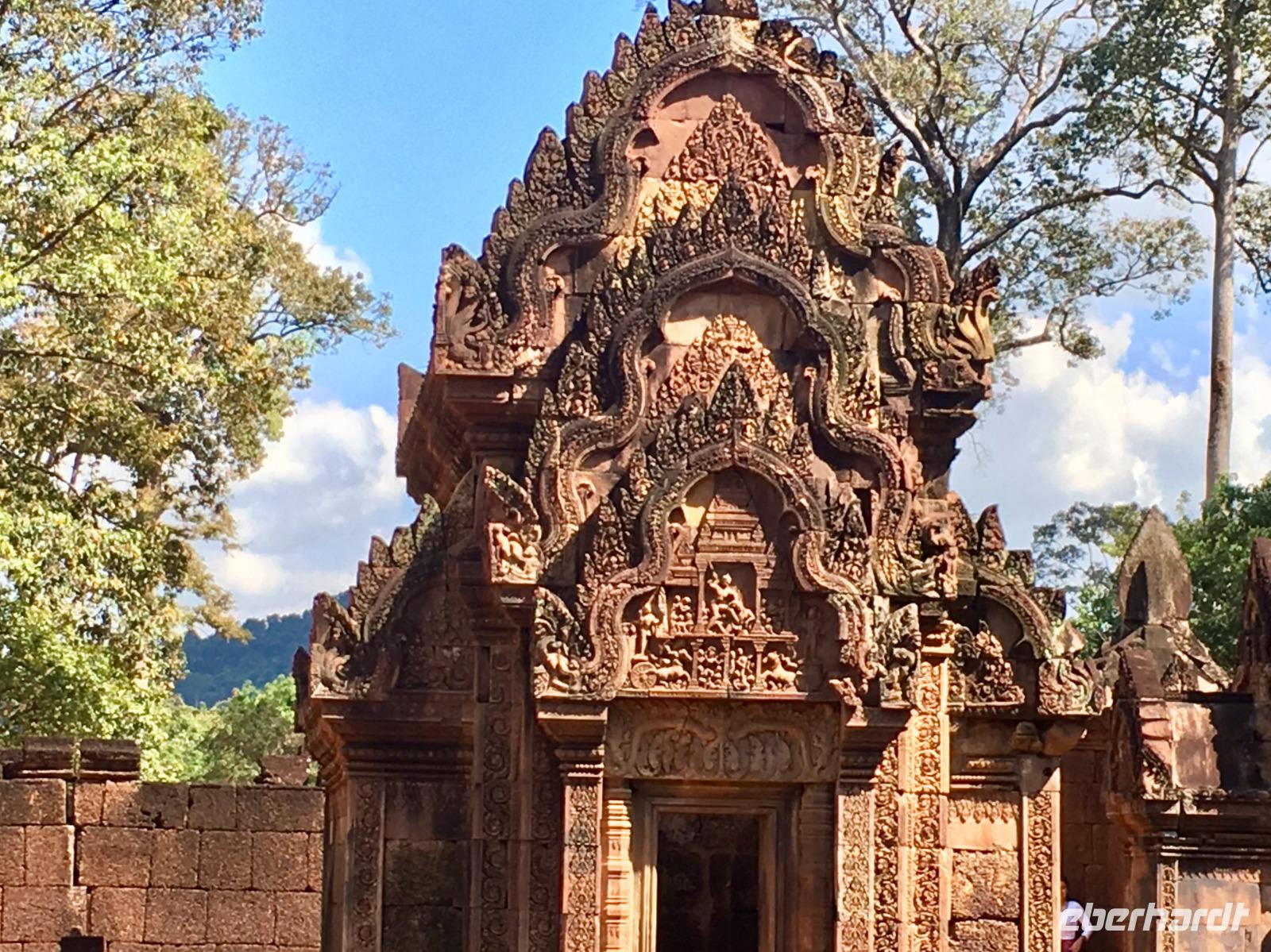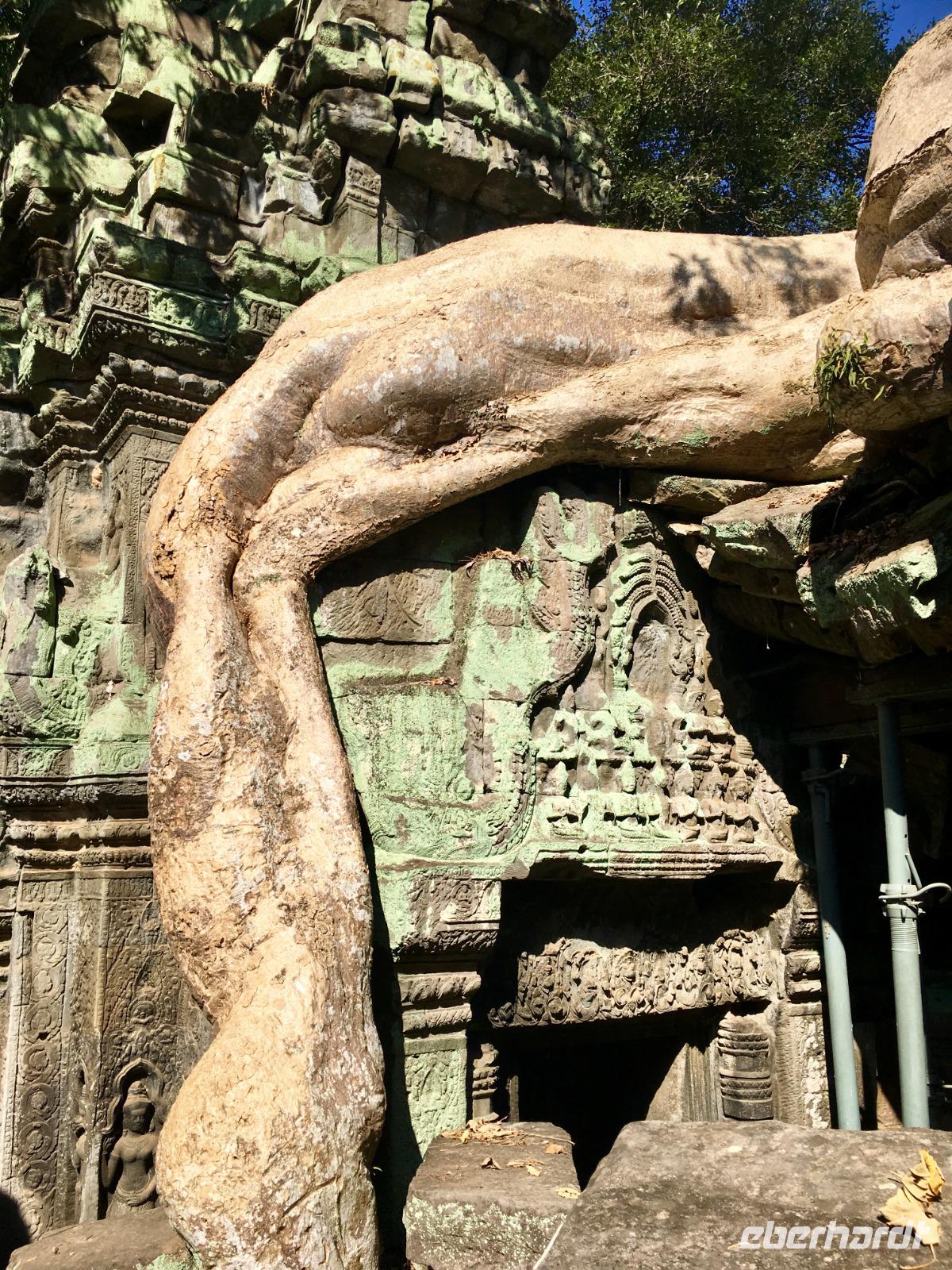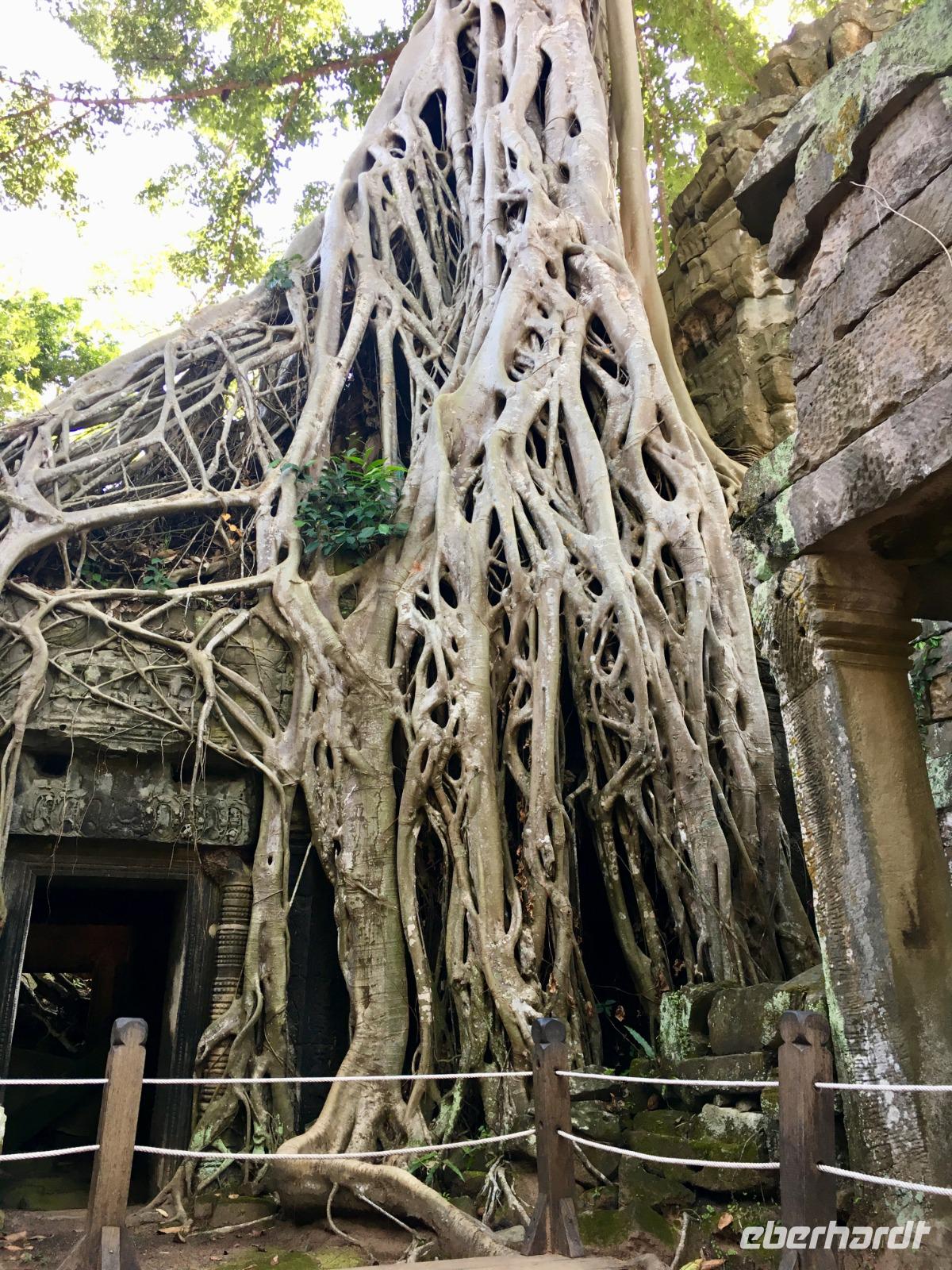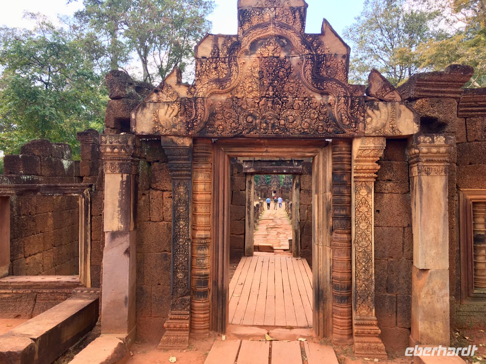 Heute nehmen wir die persoenlichen Eintrittskarten mit Photo wieder mit, denn wir haben zwei ganz besondere Sehenswuerdigkeiten auf dem Programm. Vorerst wieder aus Siem Reap heraus beim Spital vorbei wo frueher die Tieger aus dem Teich getrunken haben, laut Legende der Aelteren. 12 Km spater sind wir beim Tempel Ta Prohm. Er wird auch liebevoll der Dschungel-Tempel genannt da er mitten in einem dichten Wald steht und seine grossen, dicken Chamba- und Harzbeaume mit den Tempeltuermen um die Wette eifern. Wer stuetzt wen, Natur und Kultur leben hier in Eintracht und die ausgewogenen Gesichter von Buddah sowie die grazioesen, eingemeisselten Asparataenzerinnen zieren die Tempeltuerme. Eine hohe Mauer umringt diese Tempelanlage und wir klettern und kraxeln auf vielen Steinbloecken herum um noch mehr zu sehen und vielleicht doch ein, noch nie gemachtes Bild, zu erhaschen. Die Motive sind manigfaltig, ueberall stehen riesen Baeume auf den Tuermen und Mauern und ihre Wurzeln zieren das Mauerwerk. Manchmal schaut es aus wie ein Oktopus manchmal eine Schlange oder ein Wasserfall. Der Fantasie sind hier keine Grenzen gesetzt. Dieser Tempel wurde schon fuer einige Filme genuezt und ein Paeaerchen hat sich heute diese Kulisse fuer ein Hochzeitsbild ausgesucht. Die Braut ist Gelb gekleidet also ist es Dienstag....eine Woche lang, werden jeden Tag Photos des Brautpaares gemacht, jeden Tag in einer anderen Farbe. Lange bleiben wir hier, dieser Tempel ist allzu interessant. Ein Spaziergang durch den Dschungel bringt uns danach an einer Tarantula- und einer Grillen- Behausung vorbei. Wir sehen auch Massen von Termiten an der Arbeit, ehe wir beim Nordtor des Ta Phrom Tempels hinausgehen. Auch dieser Ein/Ausgang hat einen Turm mit wunderbar schoenen Buddah Gesichter. Wir fahren nun mit dem Bus weiter und benutzen dieses Mal das Siegestor um von Angkor raus zu fahren. Nur wenn ein Sieg gelungen war, kam die Armee durch dieses reichdekorierte Tor in die Angkor Stadt, ansonsten gab es das Todestor, uuups. Nach 25 Km sind wir bei unserem naechsten Tempel. Es ist der Banteay Srei auch Damen Tempel genannt. Er ist etwas abgelegen, war aber auch einmal Teil einer grossen Stadt in der Angkor Periode. Er ist von einer Mauer und einem Wassergraben umgeben und hat die allerschoensten Filigranreliefe aller hiesiger Tempel. Der Stein der hier benutzt wurde ist rosa und die Farbe kaempft mit dem Moos und den Flechten die sich hier ansiedeln wollen. Die Tuerme sind viel zierlicher und kleiner, die original Tuer- und Fensterrahmen stehen auch alle noch und viele Buddah Representationen sind noch immer ersichtlich und wurden noch nicht zerstoert. Als Beschuetzer sitzten auch immer wieder Affen auf den Simsen und Terrassen auch sie sind aus Stein gemeisselt und machen sich ueber manche lebendige Makake lustig. Wir staunen ueber die preziesen Reliefe, horchen den interessanten Geschichten Thols zu und knipsen unmengen von Bilder. Thol fuehlt sich hier freier und seine Erklaerungen sind sehr interessant. Hier schiessen wir auch das obligate Spiegelbild Foto fuer die Titelseite des Albums «Eberhardts Schaetze Suedost Asiens». Nun gehts aber zurueck zum Hotel mit dem schoenen Pool. Unterwegs halten wir immer wieder bei aermeren Familien an und beschenken sie mit unseren mitgebrachten Sachen. So viele glueckliche Gesichter sehen wir. Spaeter gibt es ein sehr feines Abendessen in einer Baumkronen-Oase und zum Abschluss statten wir der beruehmten Pub Street auch noch einen Besuch ab. Hier ist es sehr, sehr laut und lustig. Leute ueberall, jung und alt prominiert auf dieser Strasse die sich wie ein riesen Club benimmt. Das ist nun echt ein voller, wunderbarer Tag und das Bettchen ruft schon von weitem....