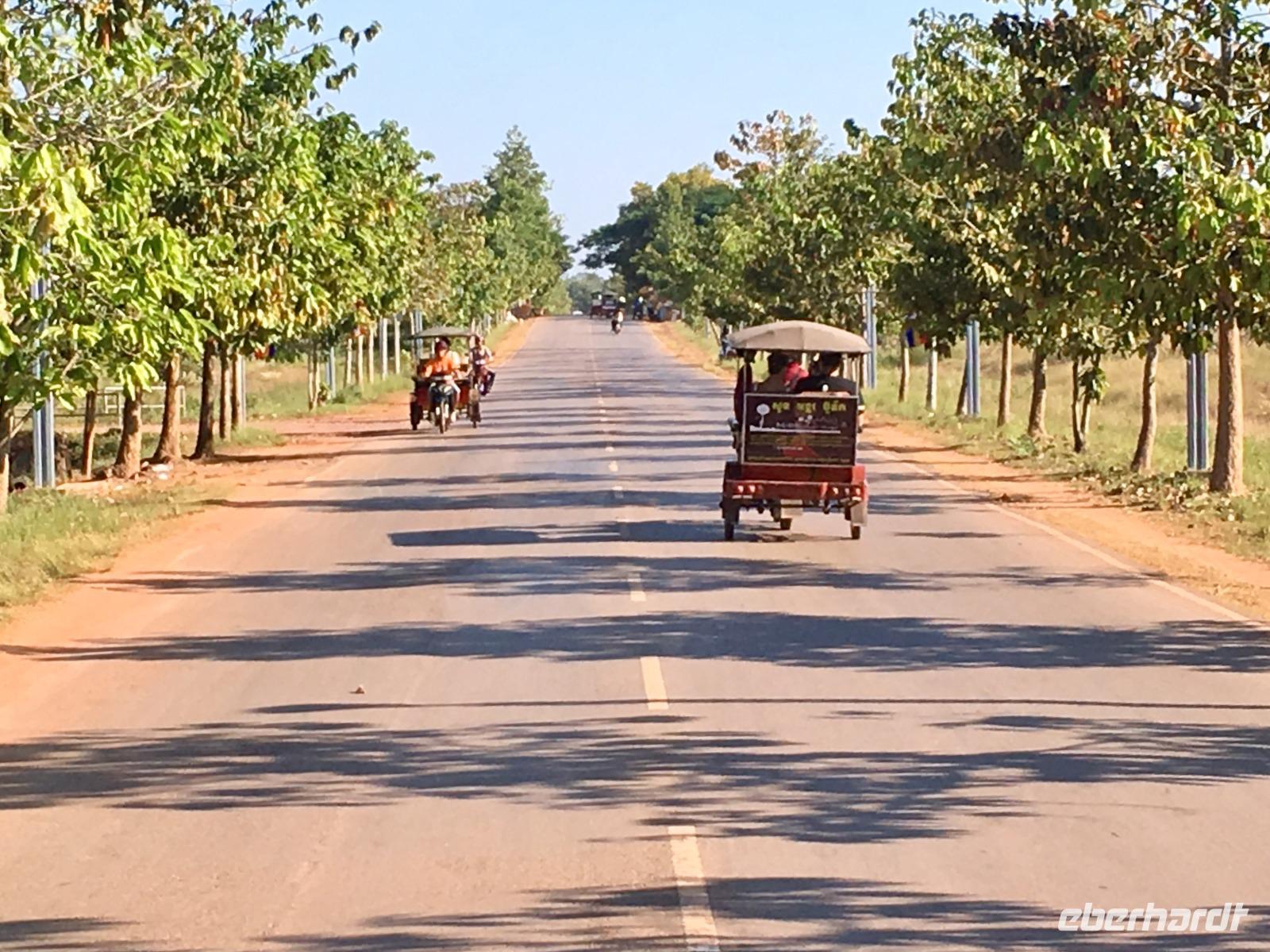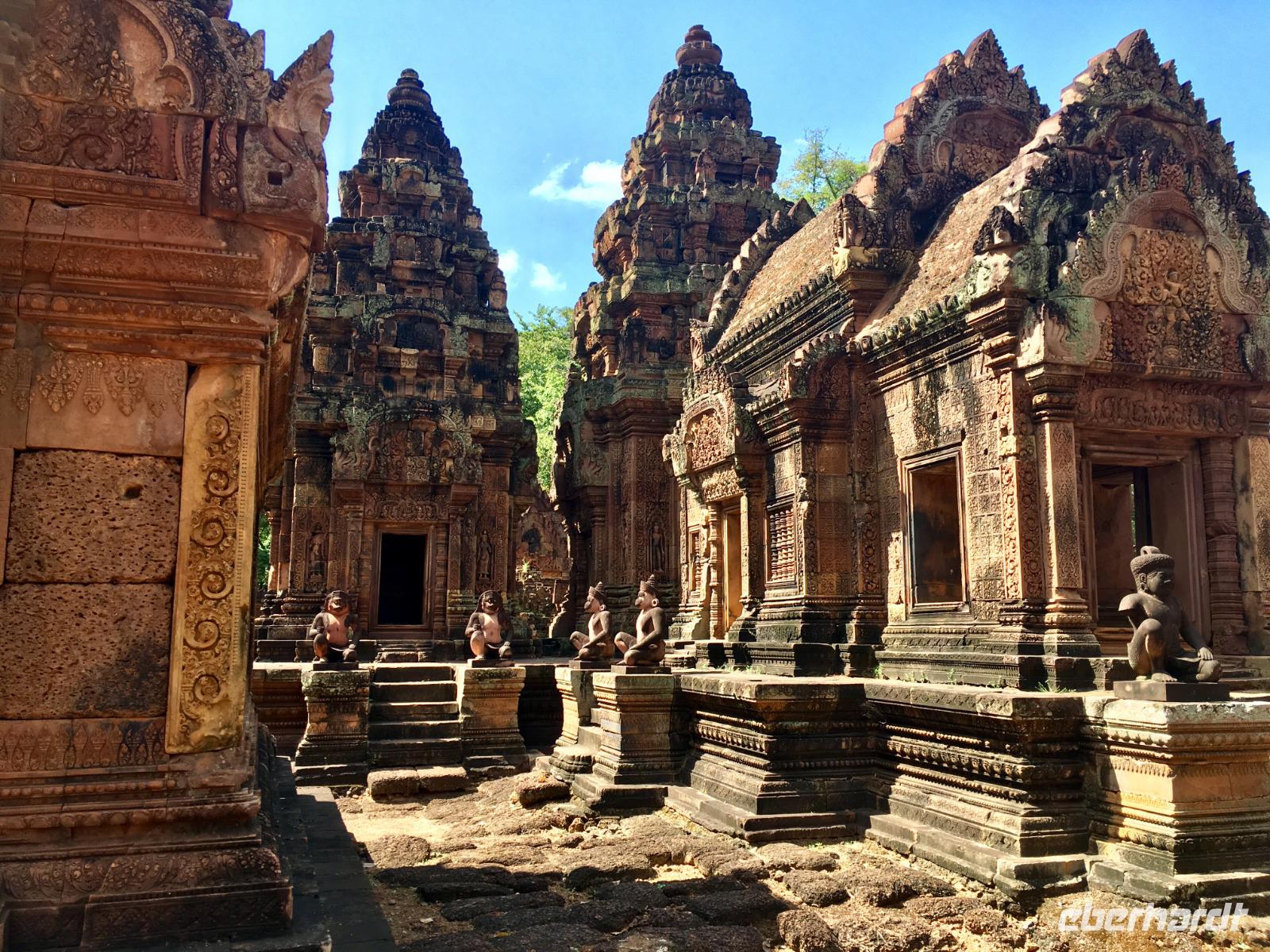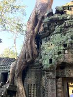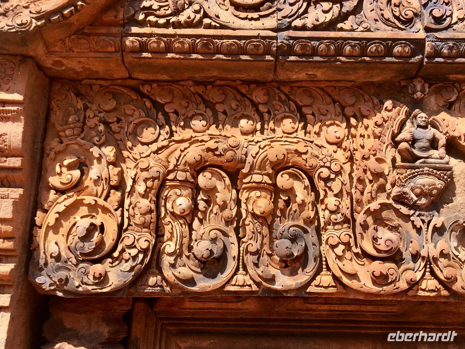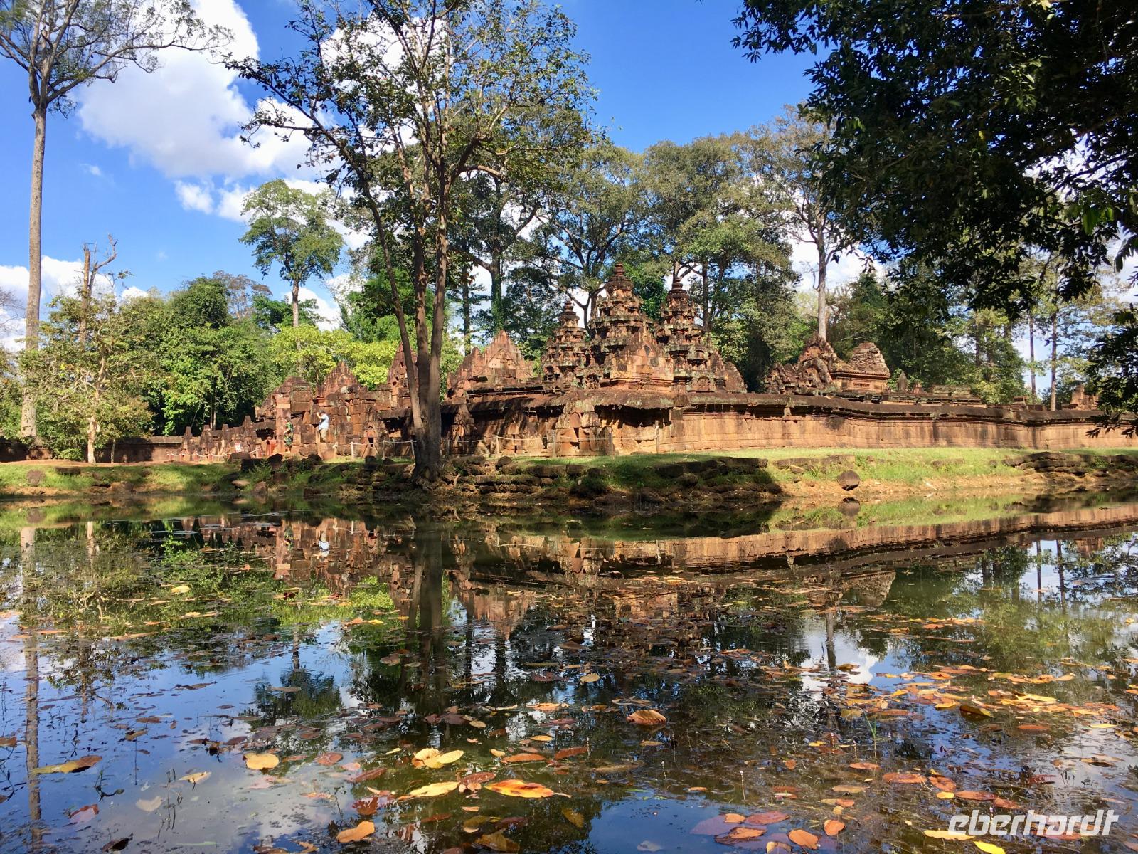 Heute nehmen wir die persoenlichen Eintrittskarten mit Photo wieder mit, denn wir haben zwei ganz besondere Sehenswuerdigkeiten auf dem Programm. Vorerst wieder aus Siem Reap heraus beim Spital vorbei wo frueher die Tieger aus dem Teich getrunken haben, laut Legende der Aelteren. 12 Km spater sind wir beim Tempel Ta Prohm. Er wird auch liebevoll der Dschungel-Tempel genannt da er mitten in einem dichten Wald steht und seine grossen, dicken Chamba- und Harzbeaume mit den Tempeltuermen um die Wette eifern. Wer stuetzt wen, Natur und Kultur leben hier in Eintracht und die ausgewogenen Gesichter von Buddah sowie die grazioesen, eingemeisselten Asparataenzerinnen zieren die Tempeltuerme. Eine hohe Mauer umringt diese Tempelanlage und wir klettern und kraxeln auf vielen Steinbloecken herum um noch mehr zu sehen und vielleicht doch ein, noch nie gemachtes Bild, zu erhaschen. Die Motive sind manigfaltig, ueberall stehen riesen Baeume auf den Tuermen und Mauern und ihre Wurzeln zieren das Mauerwerk. Manchmal schaut es aus wie ein Oktopus manchmal eine Schlange oder ein Wasserfall. Der Fantasie sind hier keine Grenzen gesetzt. Dieser Tempel wurde schon fuer einige Filme genuezt und ein Paeaerchen hat sich heute diese Kulisse fuer ein Hochzeitsbild ausgesucht. Die Braut ist Gelb gekleidet also ist es Dienstag....eine Woche lang, werden jeden Tag Photos des Brautpaares gemacht, jeden Tag in einer anderen Farbe. Lange bleiben wir hier, dieser Tempel ist allzu interessant. Ein Spaziergang durch den Dschungel bringt uns danach an einer Tarantula- und einer Grillen- Behausung vorbei. Wir sehen auch Massen von Termiten an der Arbeit, ehe wir beim Nordtor des Ta Phrom Tempels hinausgehen. Auch dieser Ein/Ausgang hat einen Turm mit wunderbar schoenen Buddah Gesichter. Wir fahren nun mit dem Bus weiter und benutzen dieses Mal das Siegestor um von Angkor raus zu fahren. Nur wenn ein Sieg gelungen war, kam die Armee durch dieses reichdekorierte Tor in die Angkor Stadt, ansonsten gab es das Todestor, uuups. Nach 25 Km sind wir bei unserem naechsten Tempel. Es ist der Banteay Srei auch Damen Tempel genannt. Er ist etwas abgelegen, war aber auch einmal Teil einer grossen Stadt in der Angkor Periode. Er ist von einer Mauer und einem Wassergraben umgeben und hat die allerschoensten Filigranreliefe aller hiesiger Tempel. Der Stein der hier benutzt wurde ist rosa und die Farbe kaempft mit dem Moos und den Flechten die sich hier ansiedeln wollen. Die Tuerme sind viel zierlicher und kleiner, die original Tuer- und Fensterrahmen stehen auch alle noch und viele Buddah Representationen sind noch immer ersichtlich und wurden noch nicht zerstoert. Als Beschuetzer sitzten auch immer wieder Affen auf den Simsen und Terrassen auch sie sind aus Stein gemeisselt und machen sich ueber manche lebendige Makake lustig. Wir staunen ueber die preziesen Reliefe, horchen den interessanten Geschichten Thols zu und knipsen unmengen von Bilder. Thol fuehlt sich hier freier und seine Erklaerungen sind sehr interessant. Hier schiessen wir auch das obligate Spiegelbild Foto fuer die Titelseite des Albums «Eberhardts Schaetze Suedost Asiens». Nun gehts aber zurueck zum Hotel mit dem schoenen Pool. Unterwegs halten wir immer wieder bei aermeren Familien an und beschenken sie mit unseren mitgebrachten Sachen. So viele glueckliche Gesichter sehen wir. Spaeter gibt es ein sehr feines Abendessen in einer Baumkronen-Oase und zum Abschluss statten wir der beruehmten Pub Street auch noch einen Besuch ab. Hier ist es sehr, sehr laut und lustig. Leute ueberall, jung und alt prominiert auf dieser Strasse die sich wie ein riesen Club benimmt. Das ist nun echt ein voller, wunderbarer Tag und das Bettchen ruft schon von weitem....