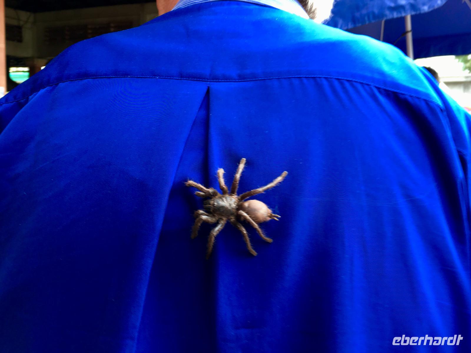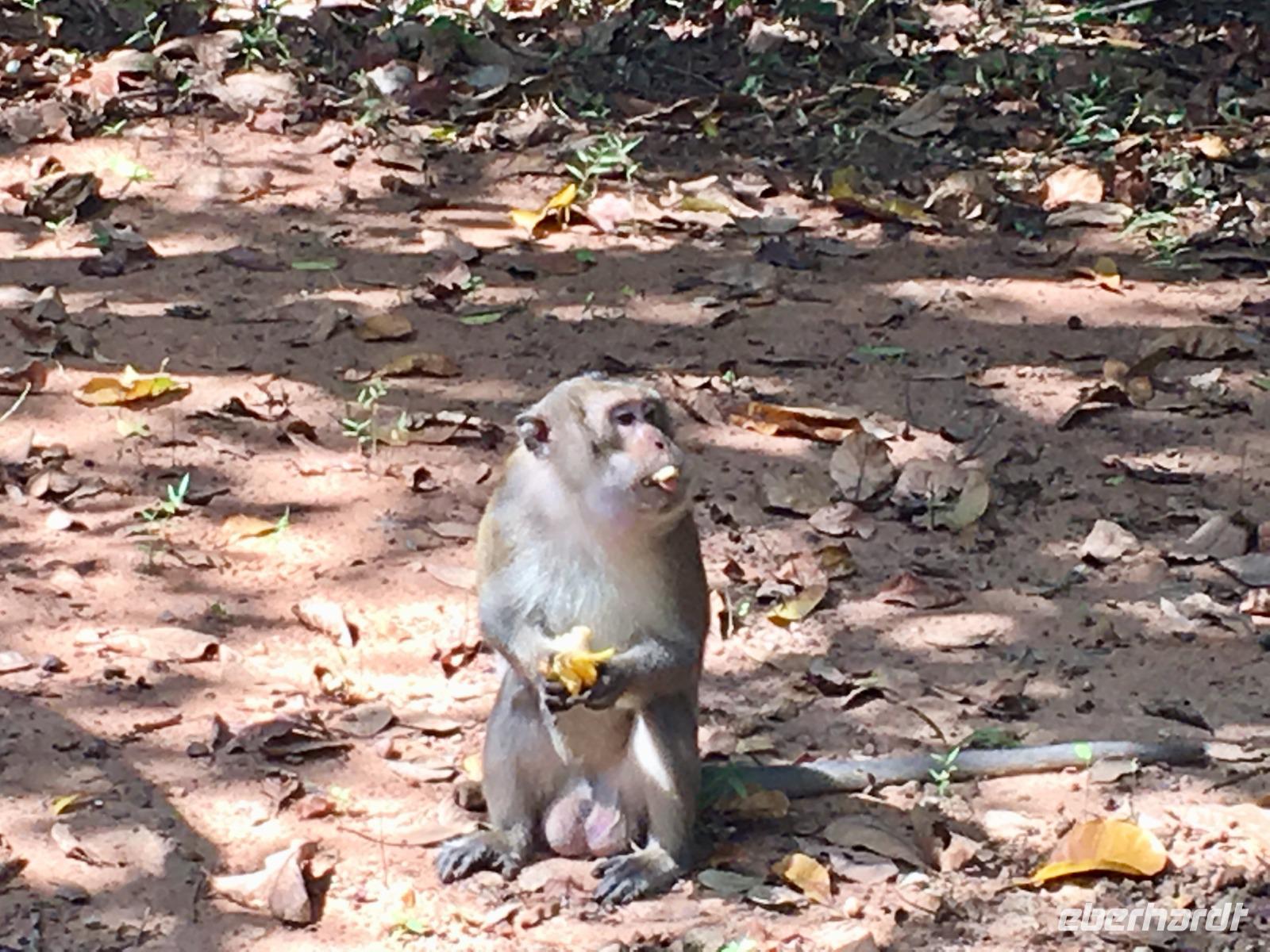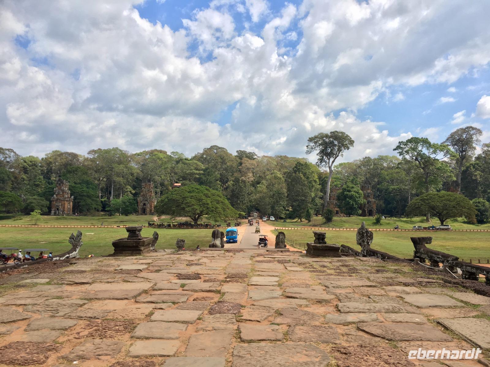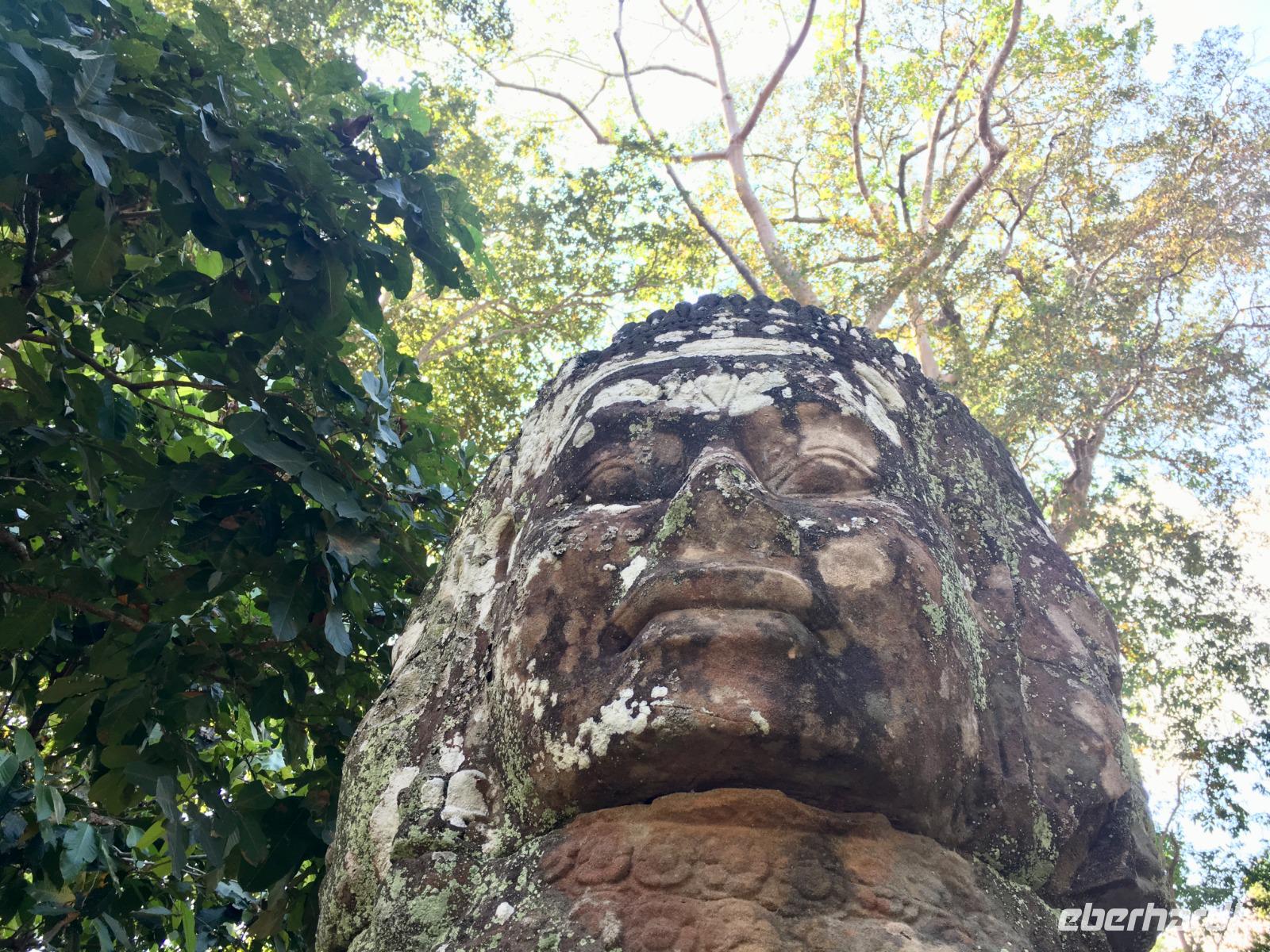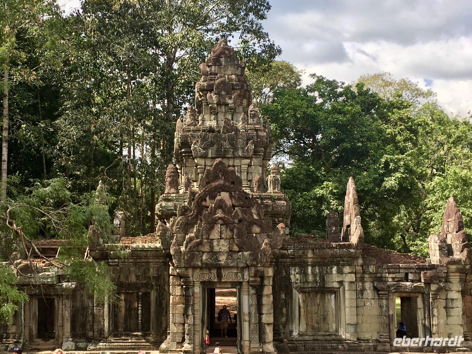 Heute nehmen wir die persoenlichen Eintrittskarten mit Photo wieder mit, denn wir haben zwei ganz besondere Sehenswuerdigkeiten auf dem Programm. Vorerst wieder aus Siem Reap heraus beim Spital vorbei wo frueher die Tieger aus dem Teich getrunken haben, laut Legende der Aelteren. 12 Km spater sind wir beim Tempel Ta Prohm. Er wird auch liebevoll der Dschungel-Tempel genannt da er mitten in einem dichten Wald steht und seine grossen, dicken Chamba- und Harzbeaume mit den Tempeltuermen um die Wette eifern. Wer stuetzt wen, Natur und Kultur leben hier in Eintracht und die ausgewogenen Gesichter von Buddah sowie die grazioesen, eingemeisselten Asparataenzerinnen zieren die Tempeltuerme. Eine hohe Mauer umringt diese Tempelanlage und wir klettern und kraxeln auf vielen Steinbloecken herum um noch mehr zu sehen und vielleicht doch ein, noch nie gemachtes Bild, zu erhaschen. Die Motive sind manigfaltig, ueberall stehen riesen Baeume auf den Tuermen und Mauern und ihre Wurzeln zieren das Mauerwerk. Manchmal schaut es aus wie ein Oktopus manchmal eine Schlange oder ein Wasserfall. Der Fantasie sind hier keine Grenzen gesetzt. Dieser Tempel wurde schon fuer einige Filme genuezt und ein Paeaerchen hat sich heute diese Kulisse fuer ein Hochzeitsbild ausgesucht. Die Braut ist Gelb gekleidet also ist es Dienstag....eine Woche lang, werden jeden Tag Photos des Brautpaares gemacht, jeden Tag in einer anderen Farbe. Lange bleiben wir hier, dieser Tempel ist allzu interessant. Ein Spaziergang durch den Dschungel bringt uns danach an einer Tarantula- und einer Grillen- Behausung vorbei. Wir sehen auch Massen von Termiten an der Arbeit, ehe wir beim Nordtor des Ta Phrom Tempels hinausgehen. Auch dieser Ein/Ausgang hat einen Turm mit wunderbar schoenen Buddah Gesichter. Wir fahren nun mit dem Bus weiter und benutzen dieses Mal das Siegestor um von Angkor raus zu fahren. Nur wenn ein Sieg gelungen war, kam die Armee durch dieses reichdekorierte Tor in die Angkor Stadt, ansonsten gab es das Todestor, uuups. Nach 25 Km sind wir bei unserem naechsten Tempel. Es ist der Banteay Srei auch Damen Tempel genannt. Er ist etwas abgelegen, war aber auch einmal Teil einer grossen Stadt in der Angkor Periode. Er ist von einer Mauer und einem Wassergraben umgeben und hat die allerschoensten Filigranreliefe aller hiesiger Tempel. Der Stein der hier benutzt wurde ist rosa und die Farbe kaempft mit dem Moos und den Flechten die sich hier ansiedeln wollen. Die Tuerme sind viel zierlicher und kleiner, die original Tuer- und Fensterrahmen stehen auch alle noch und viele Buddah Representationen sind noch immer ersichtlich und wurden noch nicht zerstoert. Als Beschuetzer sitzten auch immer wieder Affen auf den Simsen und Terrassen auch sie sind aus Stein gemeisselt und machen sich ueber manche lebendige Makake lustig. Wir staunen ueber die preziesen Reliefe, horchen den interessanten Geschichten Thols zu und knipsen unmengen von Bilder. Thol fuehlt sich hier freier und seine Erklaerungen sind sehr interessant. Hier schiessen wir auch das obligate Spiegelbild Foto fuer die Titelseite des Albums «Eberhardts Schaetze Suedost Asiens». Nun gehts aber zurueck zum Hotel mit dem schoenen Pool. Unterwegs halten wir immer wieder bei aermeren Familien an und beschenken sie mit unseren mitgebrachten Sachen. So viele glueckliche Gesichter sehen wir. Spaeter gibt es ein sehr feines Abendessen in einer Baumkronen-Oase und zum Abschluss statten wir der beruehmten Pub Street auch noch einen Besuch ab. Hier ist es sehr, sehr laut und lustig. Leute ueberall, jung und alt prominiert auf dieser Strasse die sich wie ein riesen Club benimmt. Das ist nun echt ein voller, wunderbarer Tag und das Bettchen ruft schon von weitem....