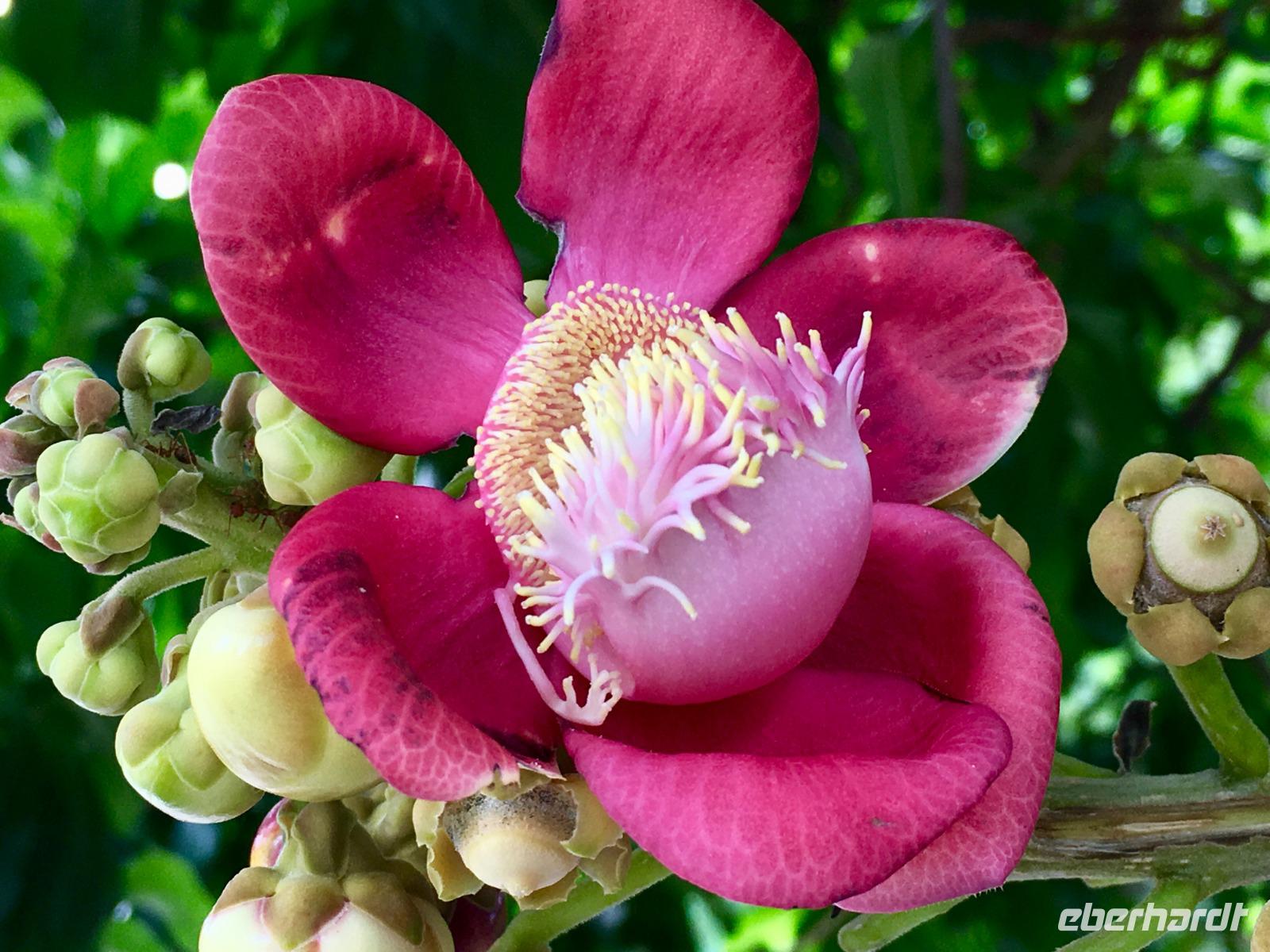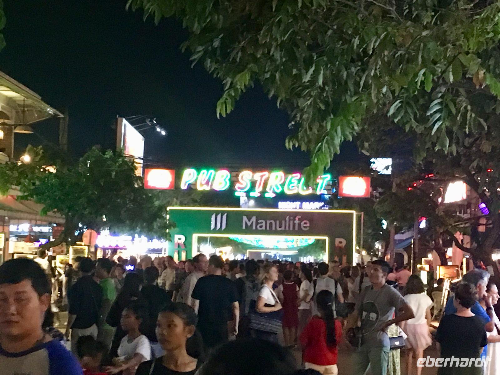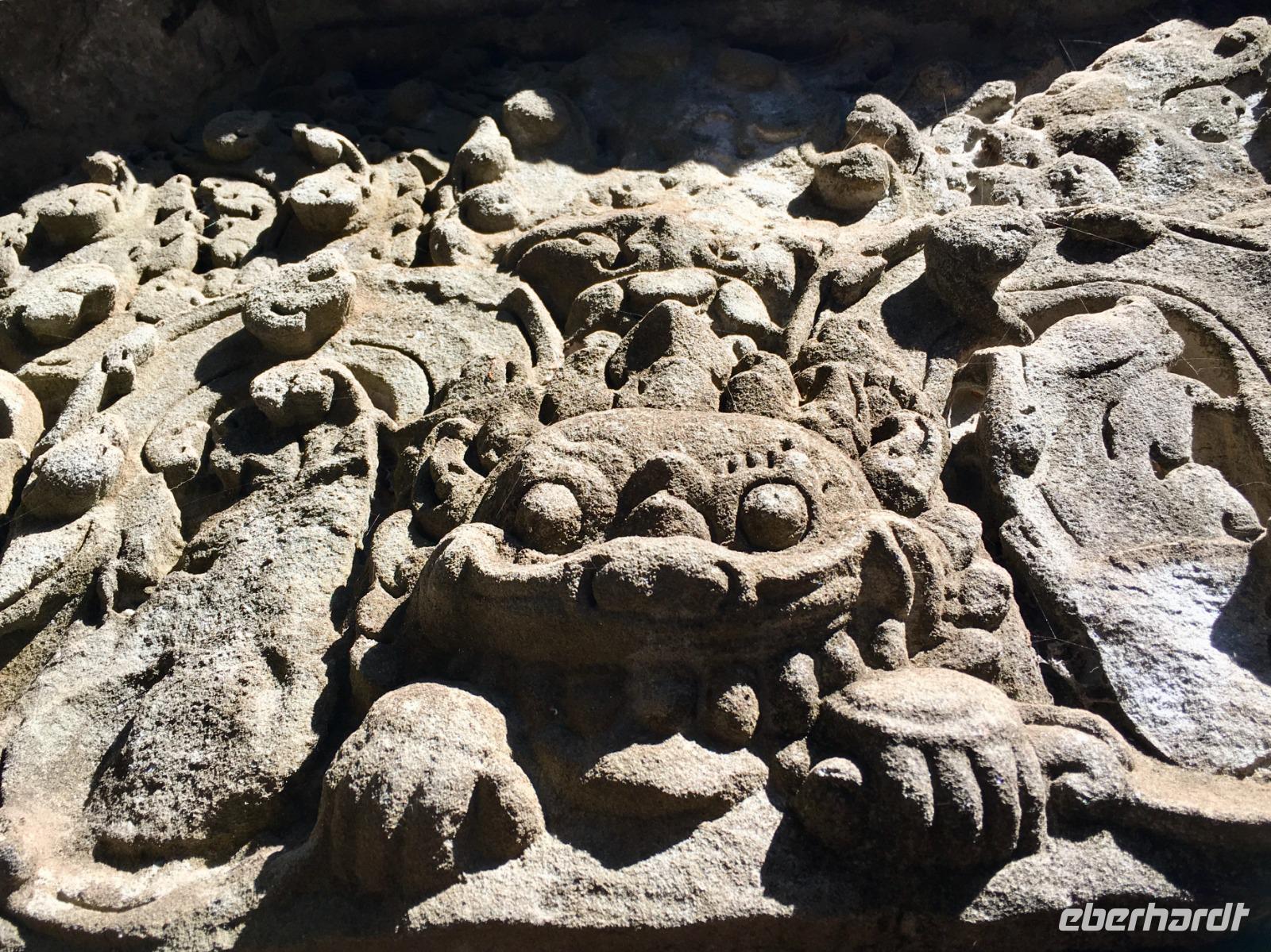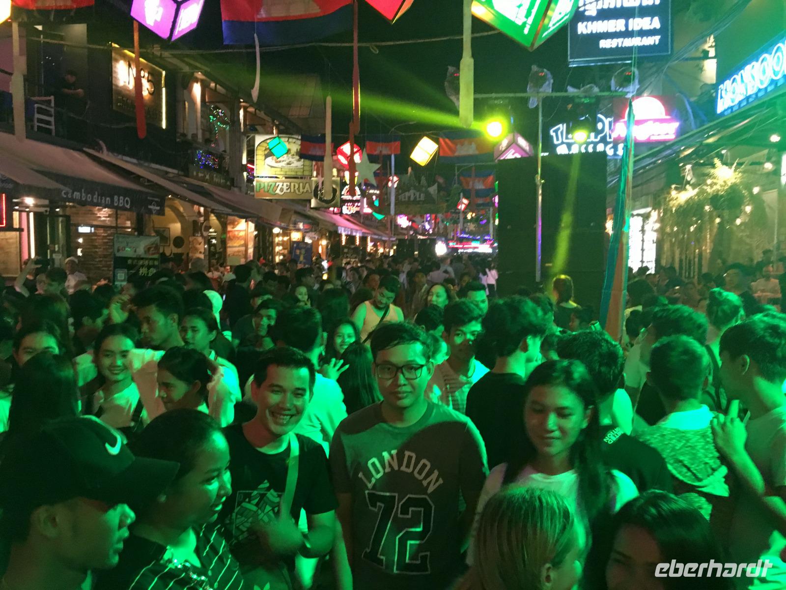 Heute nehmen wir die persoenlichen Eintrittskarten mit Photo wieder mit, denn wir haben zwei ganz besondere Sehenswuerdigkeiten auf dem Programm. Vorerst wieder aus Siem Reap heraus beim Spital vorbei wo frueher die Tieger aus dem Teich getrunken haben, laut Legende der Aelteren. 12 Km spater sind wir beim Tempel Ta Prohm. Er wird auch liebevoll der Dschungel-Tempel genannt da er mitten in einem dichten Wald steht und seine grossen, dicken Chamba- und Harzbeaume mit den Tempeltuermen um die Wette eifern. Wer stuetzt wen, Natur und Kultur leben hier in Eintracht und die ausgewogenen Gesichter von Buddah sowie die grazioesen, eingemeisselten Asparataenzerinnen zieren die Tempeltuerme. Eine hohe Mauer umringt diese Tempelanlage und wir klettern und kraxeln auf vielen Steinbloecken herum um noch mehr zu sehen und vielleicht doch ein, noch nie gemachtes Bild, zu erhaschen. Die Motive sind manigfaltig, ueberall stehen riesen Baeume auf den Tuermen und Mauern und ihre Wurzeln zieren das Mauerwerk. Manchmal schaut es aus wie ein Oktopus manchmal eine Schlange oder ein Wasserfall. Der Fantasie sind hier keine Grenzen gesetzt. Dieser Tempel wurde schon fuer einige Filme genuezt und ein Paeaerchen hat sich heute diese Kulisse fuer ein Hochzeitsbild ausgesucht. Die Braut ist Gelb gekleidet also ist es Dienstag....eine Woche lang, werden jeden Tag Photos des Brautpaares gemacht, jeden Tag in einer anderen Farbe. Lange bleiben wir hier, dieser Tempel ist allzu interessant. Ein Spaziergang durch den Dschungel bringt uns danach an einer Tarantula- und einer Grillen- Behausung vorbei. Wir sehen auch Massen von Termiten an der Arbeit, ehe wir beim Nordtor des Ta Phrom Tempels hinausgehen. Auch dieser Ein/Ausgang hat einen Turm mit wunderbar schoenen Buddah Gesichter. Wir fahren nun mit dem Bus weiter und benutzen dieses Mal das Siegestor um von Angkor raus zu fahren. Nur wenn ein Sieg gelungen war, kam die Armee durch dieses reichdekorierte Tor in die Angkor Stadt, ansonsten gab es das Todestor, uuups. Nach 25 Km sind wir bei unserem naechsten Tempel. Es ist der Banteay Srei auch Damen Tempel genannt. Er ist etwas abgelegen, war aber auch einmal Teil einer grossen Stadt in der Angkor Periode. Er ist von einer Mauer und einem Wassergraben umgeben und hat die allerschoensten Filigranreliefe aller hiesiger Tempel. Der Stein der hier benutzt wurde ist rosa und die Farbe kaempft mit dem Moos und den Flechten die sich hier ansiedeln wollen. Die Tuerme sind viel zierlicher und kleiner, die original Tuer- und Fensterrahmen stehen auch alle noch und viele Buddah Representationen sind noch immer ersichtlich und wurden noch nicht zerstoert. Als Beschuetzer sitzten auch immer wieder Affen auf den Simsen und Terrassen auch sie sind aus Stein gemeisselt und machen sich ueber manche lebendige Makake lustig. Wir staunen ueber die preziesen Reliefe, horchen den interessanten Geschichten Thols zu und knipsen unmengen von Bilder. Thol fuehlt sich hier freier und seine Erklaerungen sind sehr interessant. Hier schiessen wir auch das obligate Spiegelbild Foto fuer die Titelseite des Albums «Eberhardts Schaetze Suedost Asiens». Nun gehts aber zurueck zum Hotel mit dem schoenen Pool. Unterwegs halten wir immer wieder bei aermeren Familien an und beschenken sie mit unseren mitgebrachten Sachen. So viele glueckliche Gesichter sehen wir. Spaeter gibt es ein sehr feines Abendessen in einer Baumkronen-Oase und zum Abschluss statten wir der beruehmten Pub Street auch noch einen Besuch ab. Hier ist es sehr, sehr laut und lustig. Leute ueberall, jung und alt prominiert auf dieser Strasse die sich wie ein riesen Club benimmt. Das ist nun echt ein voller, wunderbarer Tag und das Bettchen ruft schon von weitem....