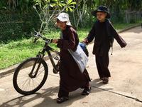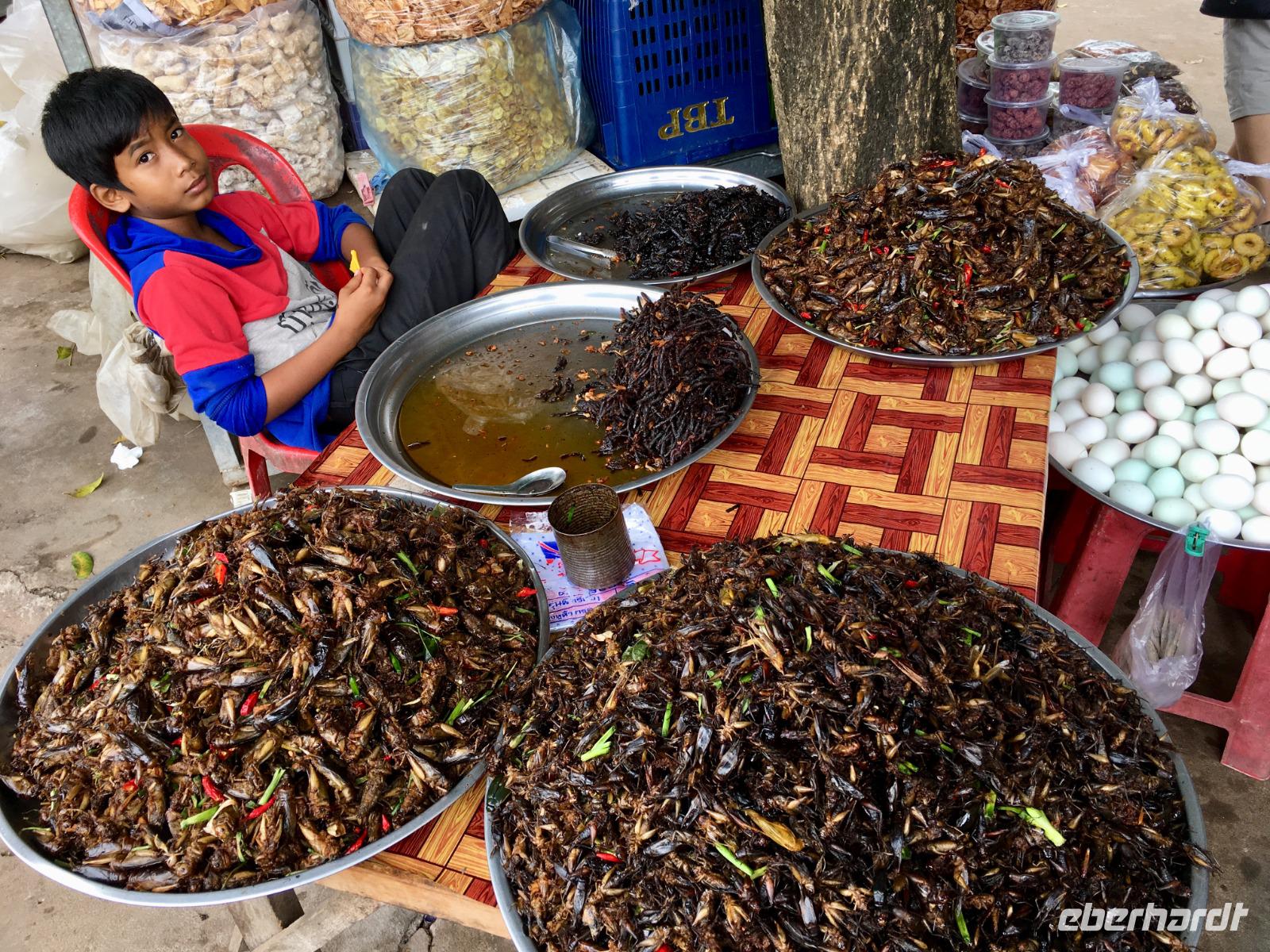 Ach wie amuesant, die Dusche hat eine Gebrauchsanleitung die man bloss mit Lesebrille (in meinem Fall) lesen kann, also probieren wir mal alle Knoepfe, Schalter und Hebel. Manchmal regnets von oben troepfelt von der Seite oder es sprueht wie ein Drache aus einer versteckten Brause die man nicht aus ihrem Kaefig befreien kann, manchmal spritzts hart aus vertikalen Duesen oder es dampft die ganze Kabine voll, Grrr geht der Jacuzzi ohne Wasser an, sodass man fast hinfaellt vor Schreck und Musik kann man auch einstellen, aber das war mir dann doch zu riskant ! Nass von Kopf bis Fuss findet man den Ausgang aus dieser Kammer wieder. Durchgewaschen ist man, wenn man draussen vor dem Spiegel wieder ankommt. Item, das Fruehstueck ist sehr ueppig und staerkt uns fuer die 250 Km lange Reise nach Siem Reap, es wird die letzte Etappe dieser wunderbaren Asien-Tour. Vorerst geht es aus der Stadt hinaus und wir sehen auch ganz deutlich, wie Wohnblock- und Villen- Siedlungen die Reisfelder abloesen. Bloss reiche Chinesen, Koreaner und Indonesier koennen sich diesen Luxus leisten, sie sind die grossen Investoren in diesem Land. Die zahlreichen Minibusse die wir auf der neuen Strasse ueberholen haben 15 Sitzplaetze und sind allesamt mit 30 Passagiere besetzt. Die meisten fahren zu den Bekleidungsfabriken die ausserhalb Phnom Penhs angesiedelt sind. Heute werden auch viele Themen behandelt und wir lernen ueber die Schulen und Kinder, ueber Waisenkinder und Universitaeten ueber Kaffeplantagen, Lotusblumen und allgemeine Ekonomie des Landes. Bei einem interessanten Markt halten wir kurz an. Es werden hier vor allem fritierte Insekten verkauft und es gibt auch einen gewissen Andrang auf die Ware. Von Spinnen ueber Maden, Kaefer, Schaben bis zu nackten Singvoegelchen gibt es alles fuer den kleinen Hunger zwischendurch. ;-) Spaeter, auf der Strassenseite sehen wir Steinmetze die aus grossen, weissen Sandsteinbloecke riesen Statuen kreiren. Sie sind allesamt viel zu gross um im Flieger mitnehmen zu koennen also knipsen wir ein paar tolle Photos, geben den Kinder ein paar Zuckerl, kaufen ein paar miniatur Statuen fuer die Daheimgebliebenen (haben sie es auch bekommen ?) und fahren wieder weiter. Die Mittagspause machen wir wieder auf einer Terrasse entlang des nun kleineren Mekongs. Den Nachmittag hingegen verbringen wir mit Kinder einer Grundschule. Eberhardt und seine Reisegaeste sponsern jaehrlich auf dieser Reise eine Schule und beschenken auch die Kinder. Dies ist ein bleibendes Erlebniss, denn die Kinder stehen schon Spalier beim Eingang und begruessen uns mit einem herzlichen, Welcome. Wir mischen uns unter die Kinder und verteilen eifrig unser Geschenk an jedes Kind. 101 Schueler gibt es hier aber bloss die Haelfte ist anwesend, denn die andere Haelfte hatte morgends Unterricht. Wir haben Soyamilch mit Schokolade und feine Kekse mitgebracht, die 35 Uniformen fuer die aermsten unter ihnen, die Schreibhefte und das viele Schreibmaterial zeichnen grosses Laecheln auf der Kinder Gesichter. Als aber die Fussbaelle auf den Boden fallen, nimmt die Freude noch zu. Wir spielen alle auch mit und schwitzen wesentlich mehr als die Kinder ? Einige unter uns, geben auch noch Bargeld in die Schulkasse und andere haben nochmehr schoene Hefte, Stifte und Schreibmaterialen aus D mitgebracht. Der Schulleiter ist geruehrt, wir auch. Viele Fotos spaeter und nach grossem Winke-winke verabschieden wir uns und fahren weiter nach Siem Reap mit einem Stopp bei der aeltesten Bruecke. Die Naga Bruecke wurde im 12 Jhdt gebaut und ist noch immer befahrbar. Nun aber auf ins tolle Somadevi Hotel. Das Abendessen faellt heute abend etwas nuechtern aus, tut uns aber sicher gut nach der ganzen Schwelgerei.