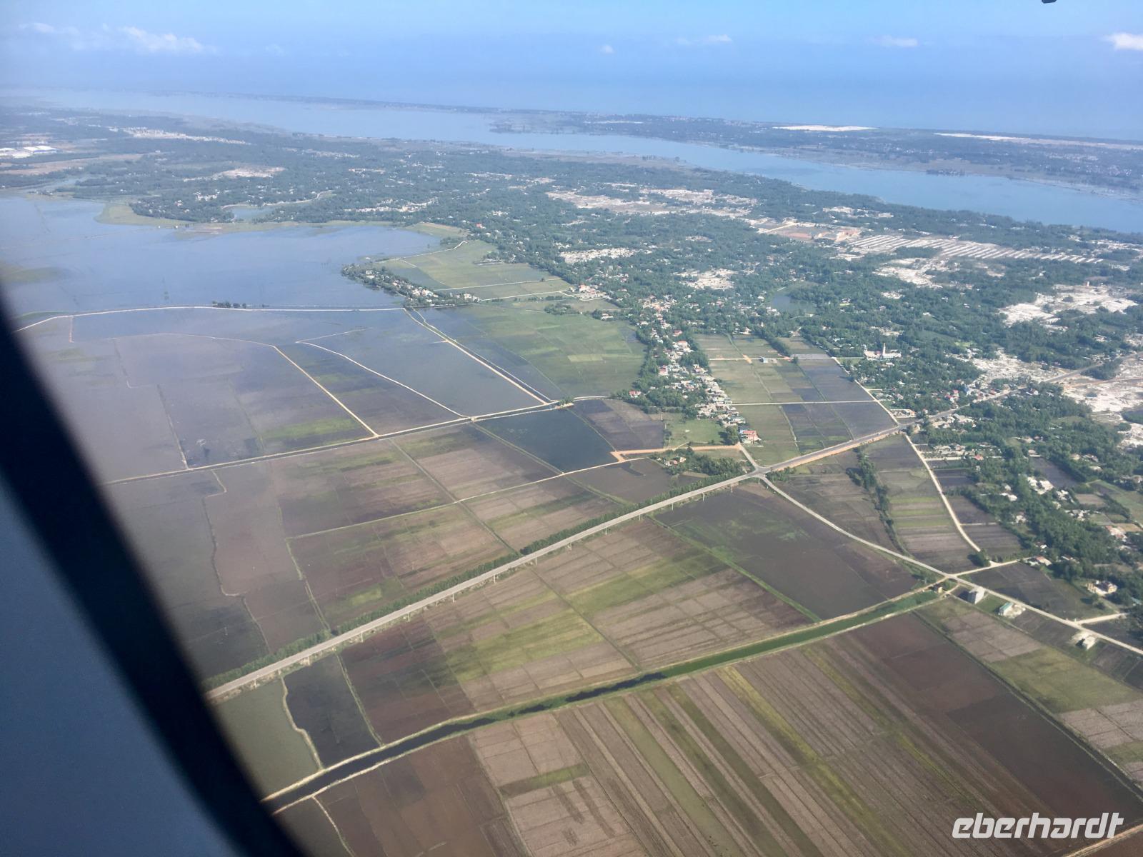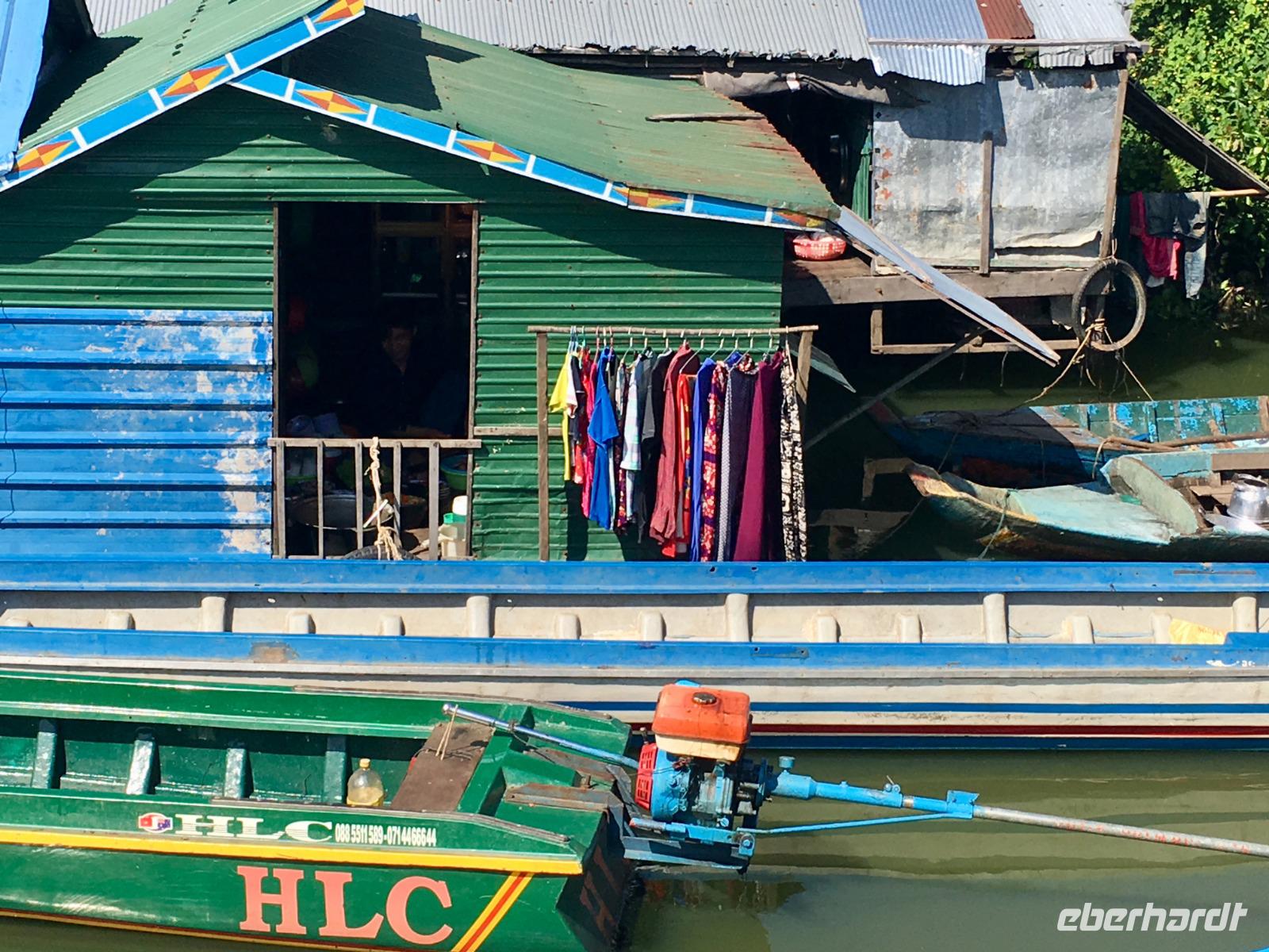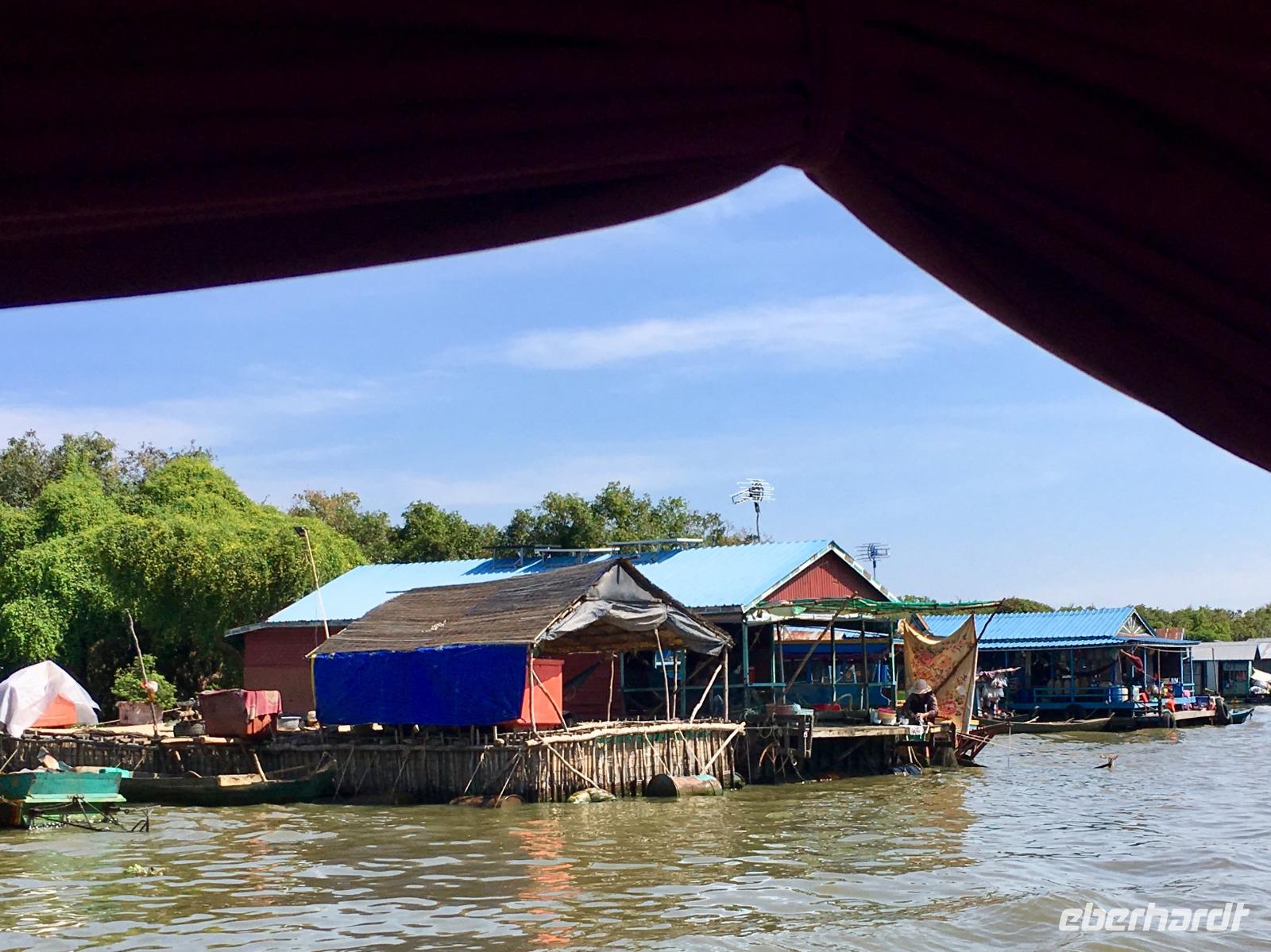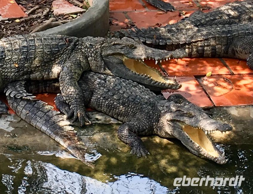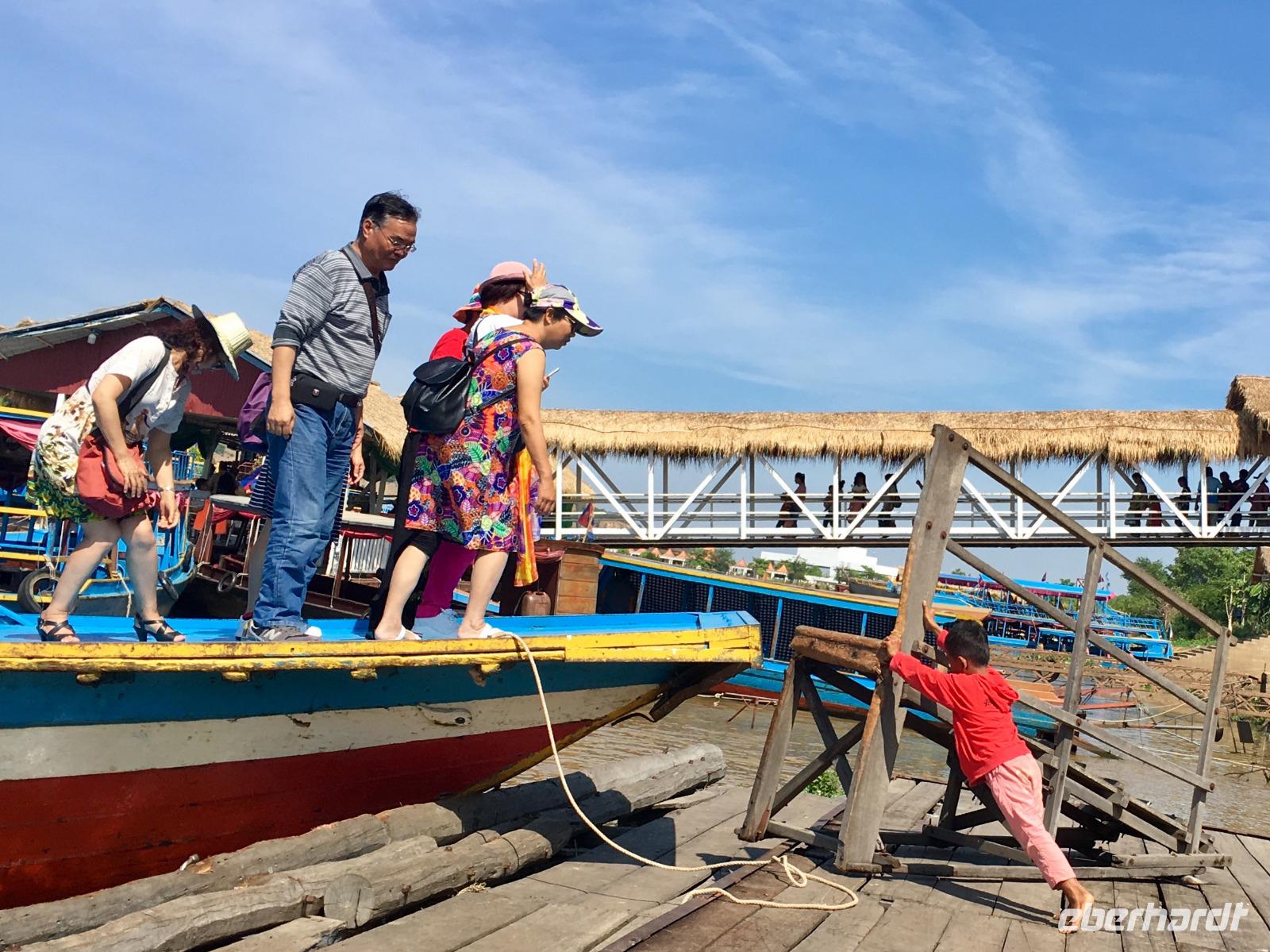 Eigenartig ist es aufzuwachen und zu wissen, dass wir naechstes Mal in unserem eigenen Bettchen erwachen werden. Schnell die Balkontuere auf, damit die Waerme Kambodschas reinkommen kann. Wir fruehstuecken heute etwas ueppiger, da das Mittagessen verspaetet, oder fuer einige ueberhaupt ausfallen wird. Wir haben noch was vor heute morgen also steigen wir frohgemut in unseren Bus ein und fahren hinaus aufs Land immer schoen dem Siem Fluss entlang. Haeuser die hier am Ufer standen wurden 80 Meter zurueckversetzt dank Suedkoreanischer Unterstuetzung. Dies, um das Ufer zu retten. Allzugrosse Verschmutzung haben den Fluss verseucht. Nun sehen wir schoene Wasserraeder und einige Kleingaerten entlang des Flusses, aber nach wie vor, sehr sehr viel Abfall. Der Spaziergang in dem Dorf bringt uns das Leben der Kambodschaner noch naeher, wir gehoeren schon fast dazu, denken wir. Bis wir nicht ein Haus besuchen. Vorne ein Verkaufsstad, dahinter das auf Stelzen stehende Holzhaus. Im unteren Bereich steht ein Tisch mit Stuehle und ein grosses Bett. Es ist ganz vernuschelt mit einer welligen Matratze. Eine nackte Gluehbirne haengt von der Decke, ein Fernseher steht beim Fussbett und ein grosser alter Teddybaer sitzt auf dem Bett inmitten aller Tuecher. Weitergehend, kommt man hinten in einen Innenhof, da sitzen 3 Leute und hantieren mit Fischen, entschuppen, koepfen, filetieren. All dies im Sonnenschein. Eine Treppe fuehrt auf die Mauer, oben angekommen sehen wir die Becken voller Krokodile. Einige trauen sich auf den Steg ohne Gelaender um das hintere Becken mit den Riesen Kroks zu sehen. Achtung bloss nicht stolpern ansonsten landet man in so einem zungenlosen Krokodil ! Das ist nichts fuer Schwindelsuechtige. Nach diesem Abenteuer gehts weiter an der Schule vorbei bis zum Tempel/Kloster. Was fuer ein gnadenloser Prunk hier herrscht. Alles sauber gekehrt, alles bemalt und ueppig, im Kloster See schwimmen Pegasuss und zwei Gaense. Eine schoene Balustrade umgibt den See und Buddah thront in der Mitte der Bruecke. So ein krasser Kontrast. Nun gehts aber mit dem Bus weiter denn wir wollen heute auch noch eine Bootsfahrt auf dem Tonley Sap See unternehmen. Ach wie schoen wird es hier. Was heute noch See ist, kann in einer Woche schon zum Reisfeld werden. Wir fahren mit einer Barge durch Mangroven an schwimmenden Doerfer vorbei bis auf den offenen See. Der Wellengang ist betrachtlich deshalb machen wir kehrt und fahren einen anderen Kanal zurueck. So geht auch dieser schoene Ausflug zu Ende und wir goennen uns noch 2 Stunden im Hotel beim Pool ehe Thol und der Fahrer uns zum Flughafen fahren. Wir verabschieden uns noch von 2 Mitreisenden, denn sie bleiben noch einige Tage hier in Siem Reap, wohl um sich von uns zu erholen ?. Das Einchecken sowie der erste Flug nach Singapore gehen problemlos. In Singapore haben wir etwas Aufenthalt aber der Flughafen ist so gross, dass man viel Zeit braucht um von Terminal 2 zu Terminal 3 zu gelangen der Weg wird auch immer wieder von Esstellen und schoenen, teuren Shops unterbrochen sodass die 3 Stunden schnell vergehen. Es ist endlich Mitternacht und der Flieger tritt unsere Heimreise an. Noch ein hrzliches Kuesschen auf jede Wange in der Hoffnung, dass wir uns wiedersehen und wieder einmal gemeinsam auf so eine lange, schoene Reise gehen koennen.