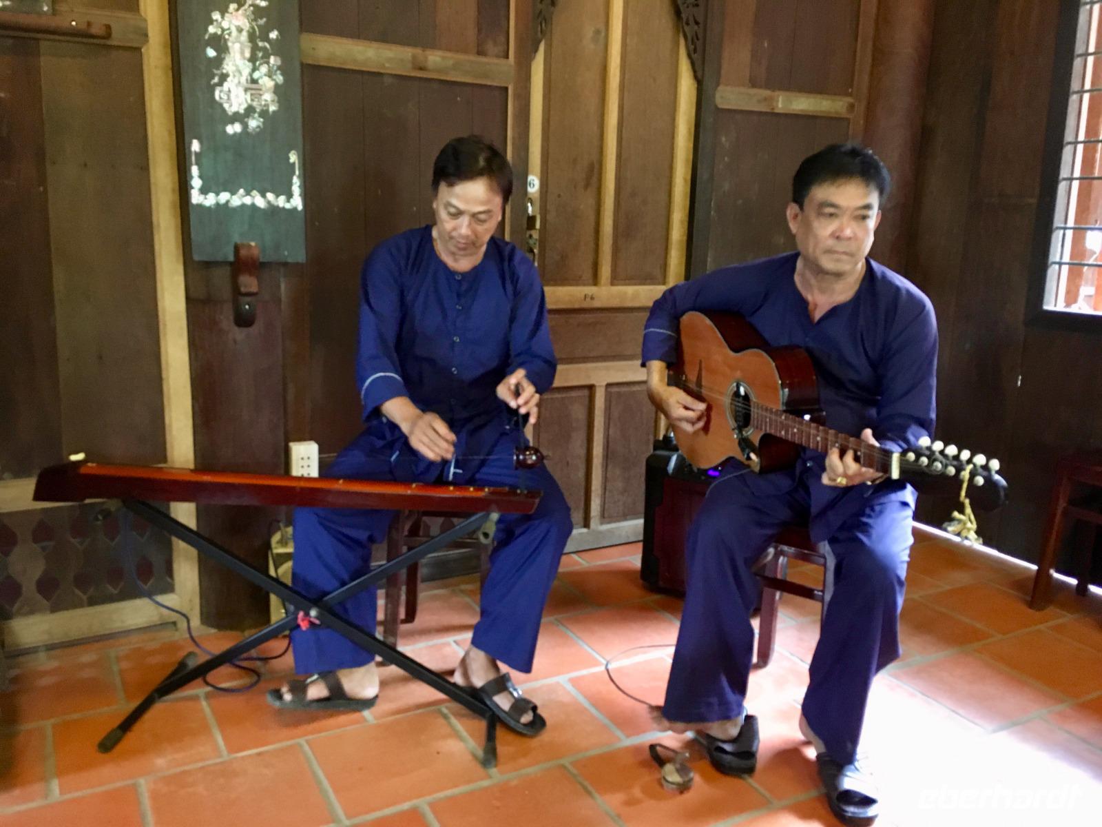 Heute geht es in der Frueh nach einem grossen Fruehstuecksbuffet weiter. Wir fahren in Richtung Nordosten, in den Norden Vietnams, in die Berge. Die Karstberge werden von Huegellandschaft abgeloest und die Strasse wird immer holpriger. Natuerlich fahren wir auch durch viele Doerfer und haben so einen guten Eindruck wie sich ein Leben eines Vietnamesen gestaltet, was er isst, was er einkauft, wie er zur Arbeit faehrt ! und auch wie er heiratet. Denn in einem Dorf welches auf dem Ho Chi Minh Pfad liegt, so heisst unsere Strasse, wird gerade Hochzeit gefeiert. Zwei Restaurants die sich gegenueber liegen sind schoen mit bunten Tuechern und vielen Blumen geschmueckt. Wir halten an und Ot spricht den Onkel, der heute Tuervorsteher spielt, an. Schon sind wir eingeladen. Noch schnell ein schoenes Gastgeschenk an die Braut aus des Reisebegleiters Koffer gezaubert, sitzen wir schon an einem langen Tisch. Auf einmal sind wir zur Attraktion geworden. Gruener Tee wird uns serviert und wir erinnern uns an die Teezeremonie auf dem Schiff, denn da haben wir ja gelernt wie man den Tee auch geniesst. Die Braut ist Aerztin und wird zum Plastischen Chirurgen ausgebildet. Sie ist die zweite Tochter und ihre Mama strahlt vor Stolz in ihrem wunderschoenen roten, besticktem Kleid. Noch ein Gruppenfoto von uns mit der Braut und ihren engesten Angehoerigen und bald sind wir schon wieder unterwegs in unserem roten Bus. Wir lernen heute auch, wie kompliziert das Sterben hier in Vietnam ist. Also fuer die Angehoerigen waere es wesentlich einfacher wenn niemand je sterben wuerde, man muesste fuer die Verstorbenen keine Graeber-exhumierung nach 3 Jahren vornehmen, keine Knochen waschen, kein Mausoleum bauen fuer die gewaschenen Knochen , keine Altaere fuer die Seelen aufbauen und nicht bis zu 5 Generationen zurueck, die Seelen und Mausoleen aller immer wieder ansprechen. Unser Weg in die Ecolodge fuehrt uns tief in die Bergwelt. Karstberge werden immer hoeher, es wird auch immer feuchter, Wald und Urwald wo man hinschaut. Auf einer Passhoehe halten wir auch an zur Mittagspause. Die Bergbevoelkerung gehoeren Minderheiten an und sie bieten hier auch ihre Speisen an. Auf kleinen Schemel sitzend knabbern wir munter Klebreis im Bambusrohr gebacken und auf auf dem Grill hergerichtete Fleisch-Spiesschen. Frische Pampelmousse als Dessert und so haben wir koestlich und authentisch gegessen. Geld sind wir fast keines los geworden und auf die Toiletten haben wir auch gerne verzichtet....bald kommen wir ja in unserem speziellen Hotel an. Und was fuer eine Ueberraschung. Hier muss der Leser schon die Bildergalerie anschauen um es zu glauben. Ein Hotel auf einer Anhoehe, mit Sicht auf Reisfelder und Berge. Ein Schwimmbad wie im Maerchenbuch, lauter freundliche Leute die uns alle wohlwollend zulaecheln. Ein grosszuegiges Zimmer mit eigener Terrasse und hintenhinaus einer Freiluft Dusche in einem privaten Patio. Im Badezimmer eine riesengrosse Holzbadewanne fuer eine ganze Familie und zu guter Letzt noch ein eigenes Schwimmbad im Untergeschoss. Viel sind wir gereist, vieles haben wir gesehen, aber so ein tolles Hotel ist uns noch selten untergekommen. Danke Eberhardt ! Eine Fahrradtour ins Dorf bringt unser Blut wieder in Schwung und unser Portemonnaie wird auch in den vielen Shops ein bisschen von seiner Last erleichtert. Die Tanzvorfuehrung nach dem Abendmahl war auch sehr interessant. Wer will da schon einfach schlafen gehen, es gibt hier so vieles zu erforschen.