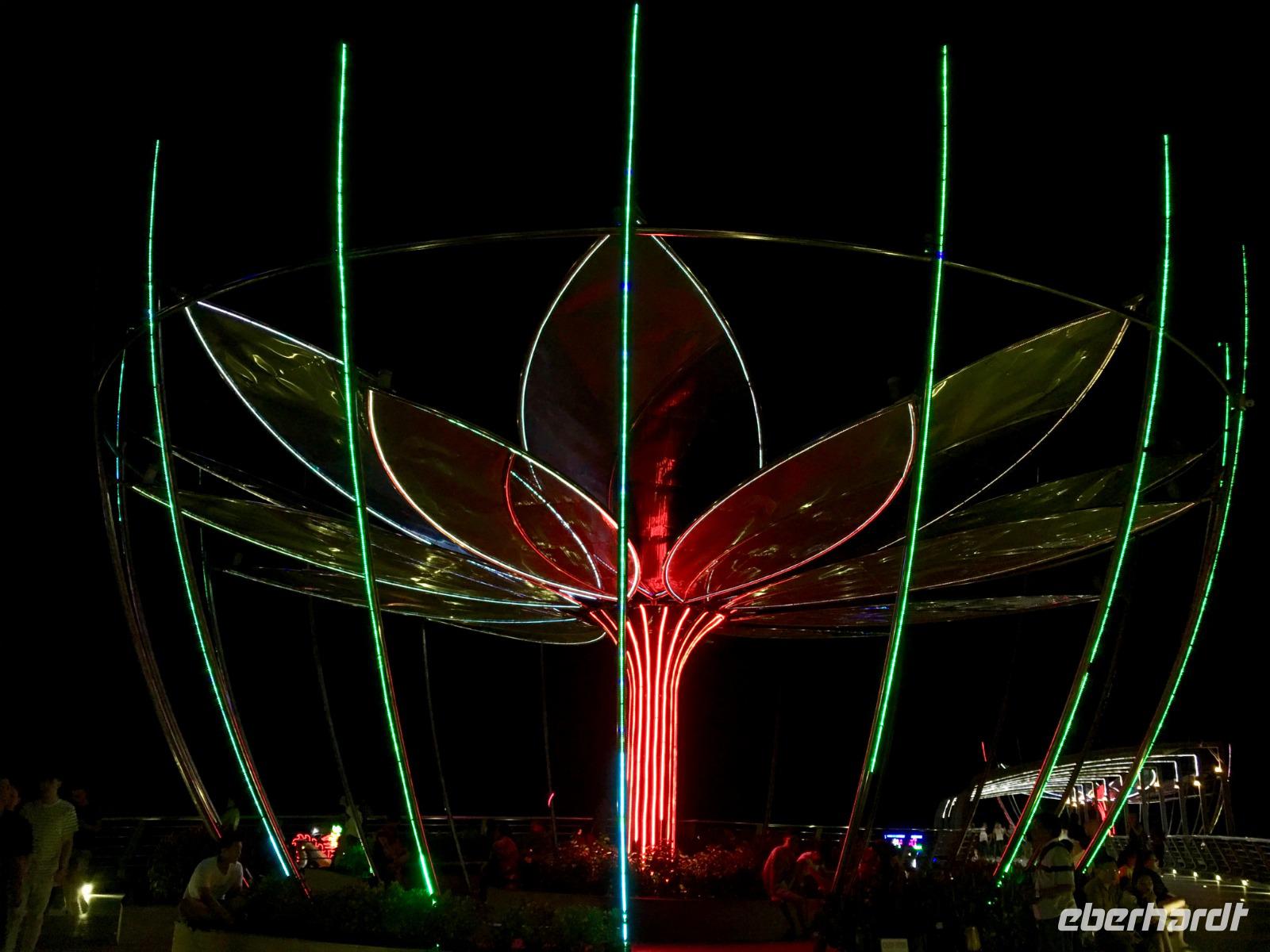 Heute ist Hanoi angesagt. Nach dem schoenen Fruehstueck mit toller Aussicht geht es gemeinsam mit unserem Reiseleiter Ot und dem Roten Bus (viele Touristenbusse sind ROT, haben wir etwas entaeuscht festgestellt aber kein anderer heisst Eberhardt) zu den Ho Chi Minh Gedenkstaeten. Nach 15 Minuten stockendem Verkehr sehen wir ploetzlich auf der rechten Seite ein Park, ein grosses graues Gebaeude, das Mausoleum des grossen Staatschefs, Onkel Ho und viele Leute in 2-er Reihe die zum Eingang marschieren. 10 Minuten spaeter sind wir bereits 3 Kurven und 1 Km weiter und die Schlange bewegt sich auch hier ? Oh je, denkt sich da ein jeder, wir wollen doch sicher auch da hinein. Ja, und siehe da, es geht ja ganz zuegig und geordnet. Weiss gekleidete junge Offiziere stehen stramm der Schlange entlang und weisen ueberholende oder Kaugummi-kauende Touristen zurecht. Ehe wir uns daran gewoehnen, stehen wir bereits im Mausoleum selbst, es ist dunkel, ein bisschen kuehl und im glaesernen Sarkophag liegt der mumifizierte Ho Chi Minh, bewacht von Offizieren und betrachtet von stillen, sich langsam voran bewegenden Touristen. Ein Erlebnis. Nun gehts weiter zum Presidenten Palast der nunmehr als Residenz fuer Staatsbesuche dient. Onkel Ho's Autos, sowie sein erstes und zweites Wohnhaus besuchen wir danach. Die ganze Anlage ist idyllisch und ausgewogen. Ein Spazierweg fuehrt dem See entlang. Er ist gesaeumt von alten, seltenen Baeumen die sich mit ihren Wurzeln spielen. Was knurrt denn da ? Ach ja, Mittag, der Hunger meldet sich und das Restaurant mit 3 Etagen wartet schon auf uns. Koestlich ist die vietnamesische Kueche und das Bier dazu schmeckt auch ganz lecker. So sind wir wieder belebt und bereit fuers Naechste. Wir besuchen eines der vielen Wohnviertel entlang der Eisenbahnschienen. Unwahrscheinlich was da alles los ist. Die Gleise sind in der Mitte der Schotterstrasse, beidseitig draengen sich Haeuser dicht aneinander etwa 2 Meter von den Gleisen entfernt. Auf den 2 Meter passiert das Leben. Kinder, Restaurants-bestuhlung, Jugendherberge-patios, Huehner, Abfall, viele Leute, sogar Mofas und Staender zum Trocknen der vielen Handtuecher der Frisoere beleben diesen Zwischenraum. Was passiert bloss wenn da der Zug vorbeikommt ? Wohin mit alledem ? Die Eingaenge sind sehr eng und eines ist sicher, der Zug, der kommt bestimmt. Sowas Unglaubliches. Schoen, dass wir das Erleben duerfen. Nun aber ab zum naechsten Ereigniss, das Wasserpuppentheater. Ein Theater mit einem Teich als Buehne und einem 7-Mann und Frau Orchester. Es ist unbeschreiblich faszinierend, lustig, eigenartig, einfallsreich und ich empfehle einfach so eine Reise zu buchen um es selbst sehen zu koennen ! Nun sind wir aber bereit ins Hotel zurueck zu kehren, denn bald gehts zum schicken Abendessen in einem wunderschoenen und beruehmten Restaurant. Zum Aperitif laedt uns Eberhardt auf einen Reisschnaps ein. Wir stossen auf eine gute Reise an und geniessen.