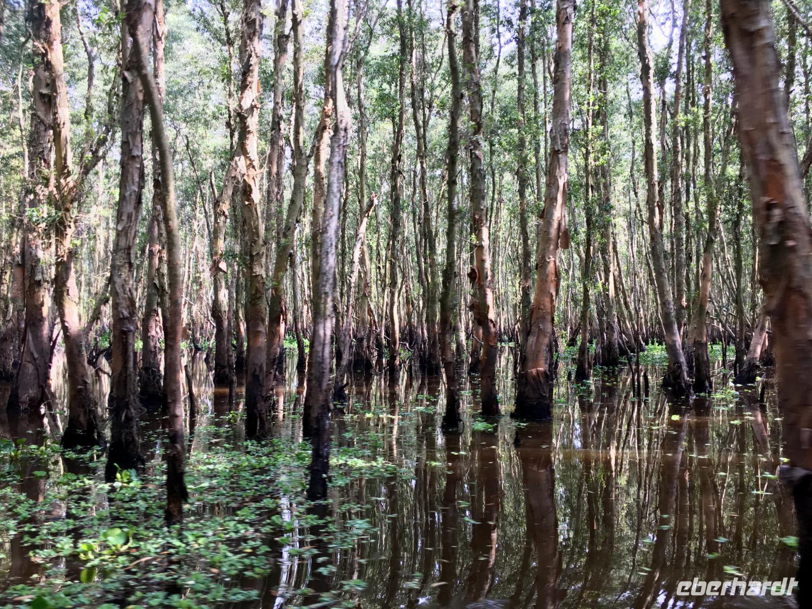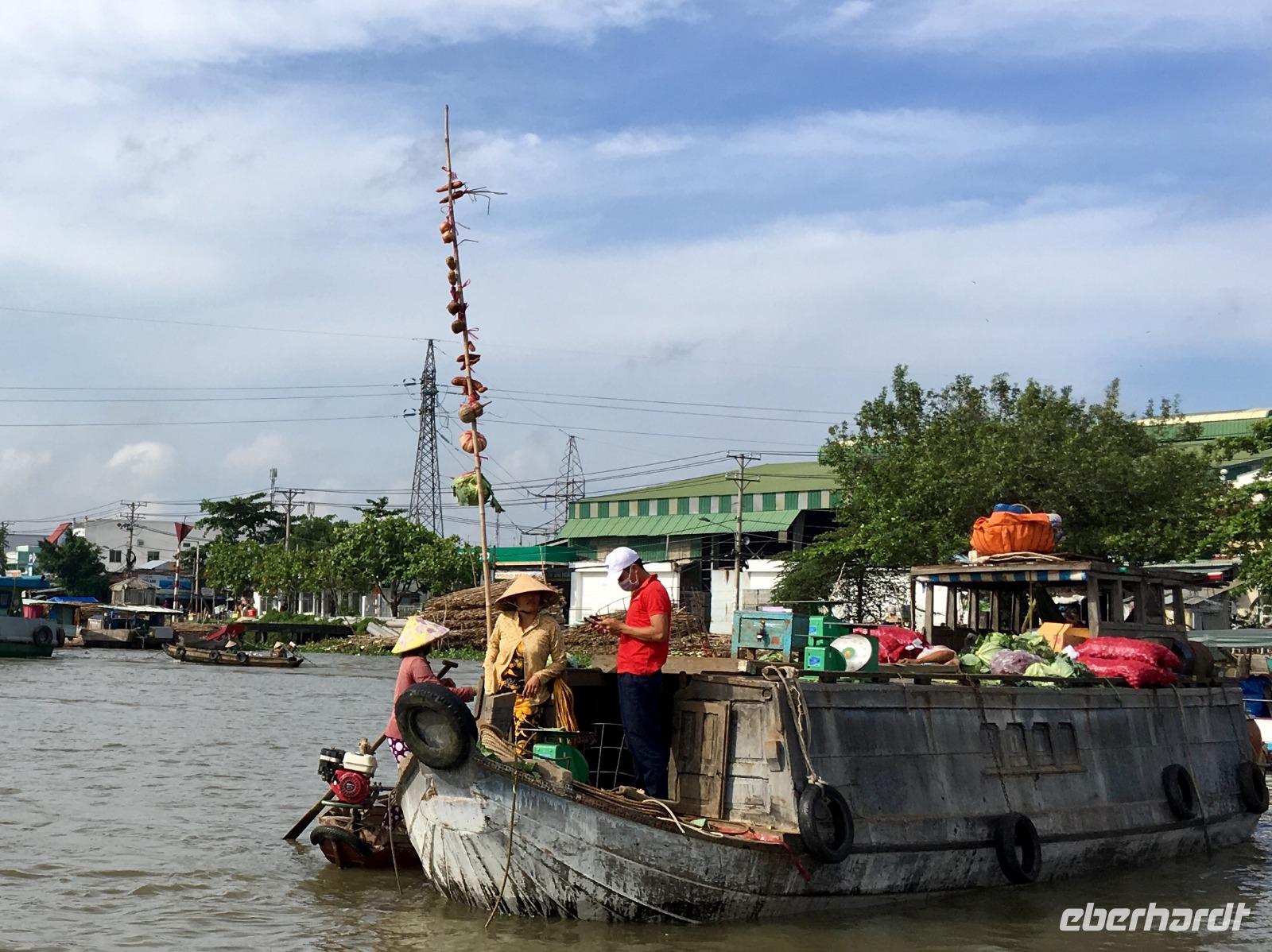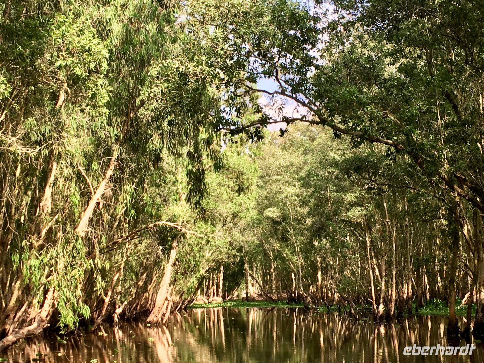 Guten Morgen, alle Vietnamesen sind schon fleissig unterwegs wenn wir in aller Herrgottsfruehe - um 7:30 Uhr - unsere Koffer in den Bus verladen. Ja, die Koffer fahren Bus, wir aber, werden per pedes zum Flussufer spazieren. Noch ein bisschen lokalen Mueckenspray fuer unsere kurze Waldwanderung heute einkaufen und schon sind wir bei unserem Langboot. Auf dem Mekong wollen wir heute einen schwimmenden Markt besuchen, deshalb das zeitige Aufstehen. Es wimmelt nur so von Schiffen und Booten, alle wollen an den taeglichen Markt, zahlreiche Touristen inbegriffen. Unser Boot ist voll beladen mit unserer Gruppe und wir werden immer wieder von anderen, leichteren Booten uebeholt, also stehen wir heute nicht auf dem Bootsrennen Podium. Schade, wuerde Mr. Ngoc nun sagen, ihr habt keine Chance !! Das Marktgetriebe ist aufregend und interessant. Es gibt hier richtig grosse Schiffe, die Ware anbieten, dann gibt es kleinere Schiffe mit einer Stange, an welcher ein Prototyp der angepriesene Ware ersichtlich aufgespiesst ist. Das sind die Mittel-haendler, welche die Ware bei den Produzenten, grosse Schiffe /Grosshaendler, eingekauft haben. Zwischendurch paddeln Frauen auf ihren Sampan herum und kaufen Ware bei den Mittel-haendler um es danach in die Seitenarme des Mekongs zu rudern und es dort an Private oder Kleingeschaefte weiter zu verkaufen. Es schaut bloss alles wie ein riesen Durcheinander aus, aber da geht es ganz schoen geregelt zu und her. Wir knipsen natuerlich viele farbenfrohe Fotos. Danach gibt es noch einen Halt an einem Land-Markt wo alles zwischen Kroeten, Fisch und Fleisch bis zu Guertel, Medizin und Pijamas verkauft wird. Besonders das feine, frische Gemuese schaut sehr appetitlich aus. Nun gehts aber wieder zu unserem klimatisierten Bus, entlang vielen Nebenarmen und durch viele Doerfer. Wir sehen Reisfelder in welchen soeben der Spreu weggetragen wird, Gemuesefelder die bestellt werden, Pagoden mit ihren grossen Statuen, viele Boote und Schiffe aller groessen und Bruecken, immer wiede Bruecken. Vietnamesen sind Massen-Brueckenbauer von den kleinen Affenbruecken aus Bambus angefangen bis hin zu betonierten Strassenbruecken gibt es keine 10 Minuten Fahrtstrecke ohne Bruecke ! Mittagspause ist heute auf einer Krokodilfarm und einige mutige unter uns versuchen auch Krok-fleisch, welches einem Kalbs-Huehnchenfleisch aehnelt ! Nein, nein, das Krokodil kommt schon tot und gebraten auf den Tisch ! Auf der Fahrt zu unserem naechsten Ziel, ChouDoc, horchen wir der Legende des Klebreis's zu und lernen allerhand ueber Krokodile. Das Mittagsschlaefchen tut auch sehr gut und beim erwachen sehen wir, dass es ploetzlich wieder Berge gibt und Kuehe weiden. Mais, Gemuese und Reis stehen in voller Bluete, haben wir so lange geschlafen ? Bald heisst es wieder aussteigen, denn nun geht es in den Park des Tran Su Waldes. Ein herrlicher Ausflug erwartet uns hier. Wasser, durchzogen von Mangroven, Wasserhyazinthen und Lotusblumen. Eine Art Deich wurde fuer Eukalyptusbaeume angelegt, scheint jedoch vernachlaessigt zu sein und so stehen nun viele Ezkalyptusbaeume im Wasser. Es ist wie ein verzauberter Wald. Nach der Fahrt mit einem motorisierten Boot, steigen wir in Ruderboote um. Alles wird still, nur das leichte plaetschern der Ruder untermalt diese Idylle. Die Mangroven spiegeln sich im Wasser, kleine schwarze Laufvogegel gehen schnell auf den Wasserhyazinthen, Kraniche verstecken sich hinter Baumstaemme und Stoerche sitzen oben auf der Krone. Es zwitschert und plaetschert gemuetlich dahin. Koennte dieser Moment doch stillstehen ! Aber bald gehts auf einen kleinen Spaziergang zu einem schoenen Aussichtspunkt ehe wir wieder zurueckfahren mit dem Motorboot. Was fuer ein schoener Ausflug, das Hotel jedoch ist gar nicht so schoen, wie wir das nun gewoehnt sind in Vietnam. Immer hatten wir fast Tanzsaeaele von Zimmer in herrlichen Hotels, heute muessen wir etwas leiden in dem 3 Sterne Hotel. Das Bett ist hart, das Zimmer sauber aber schmucklos. Wir haben auch nicht viel Zeit hier zu weilen (Gott Sei Dank) sondern morgen in der Frueh gehts schon weiter.