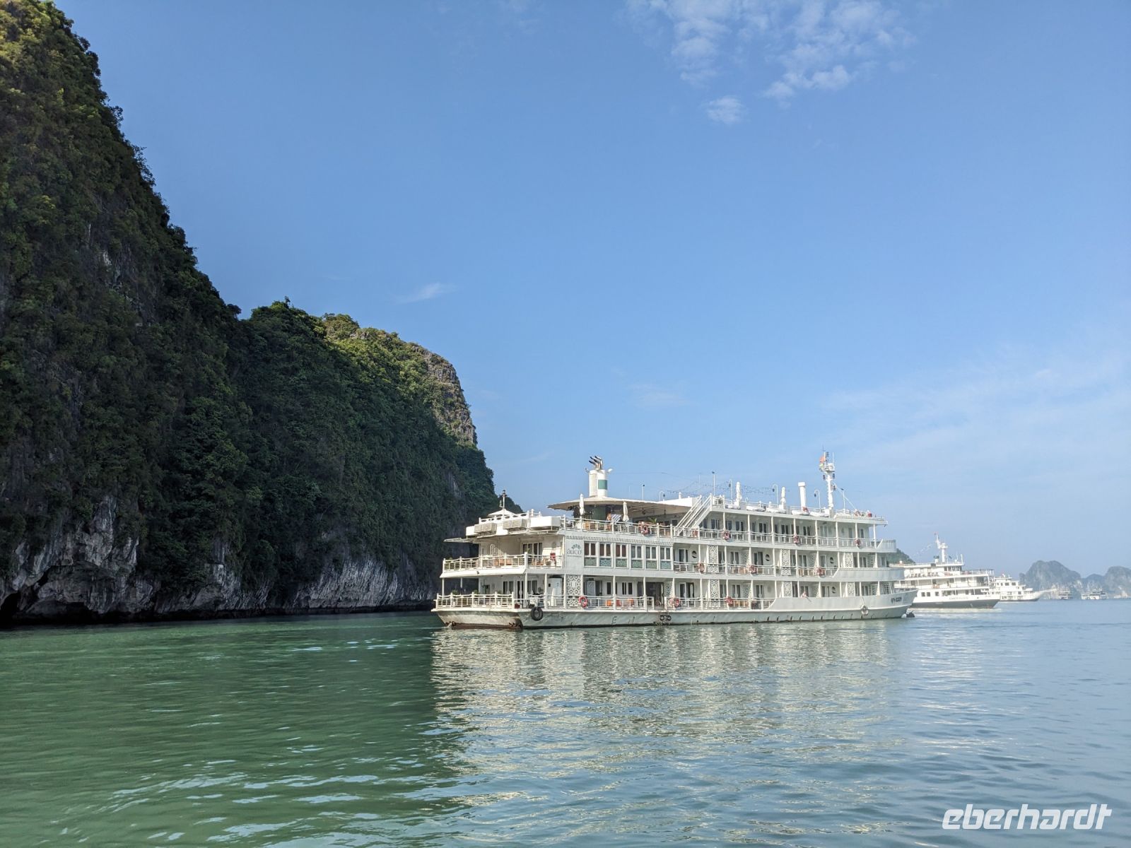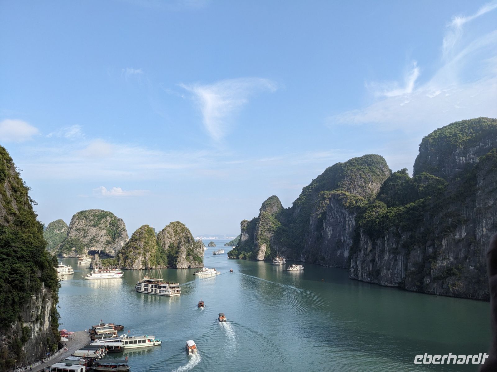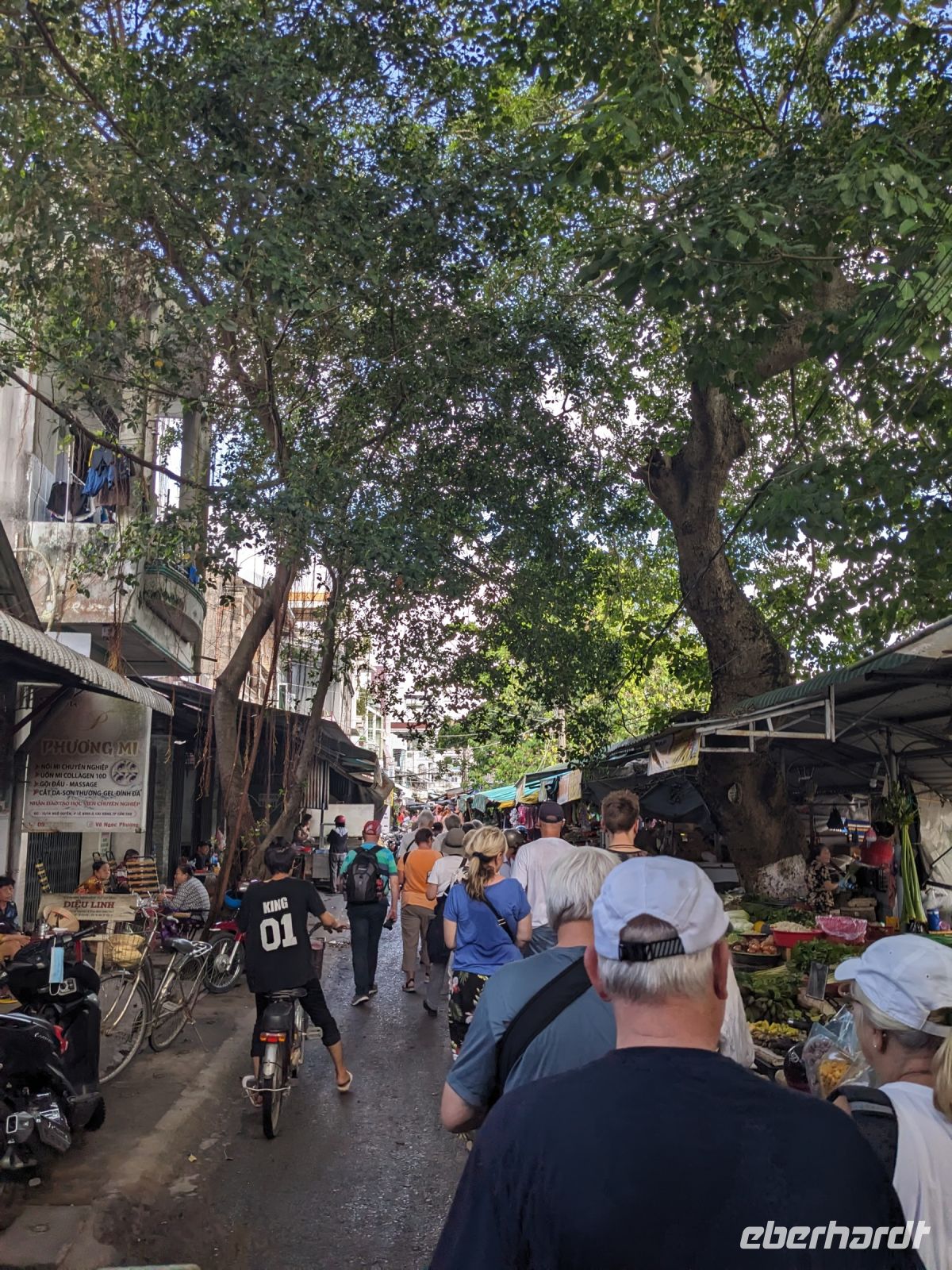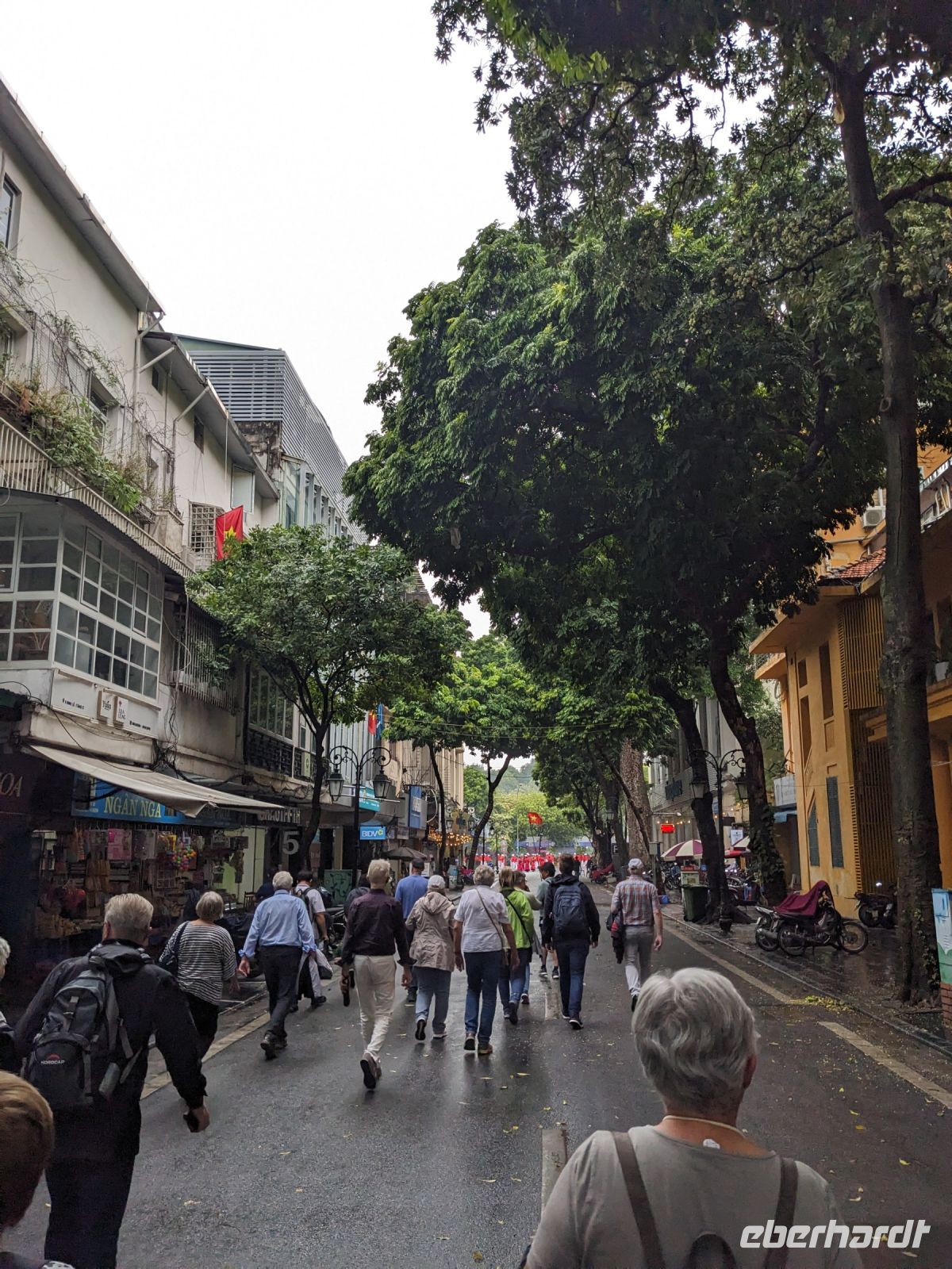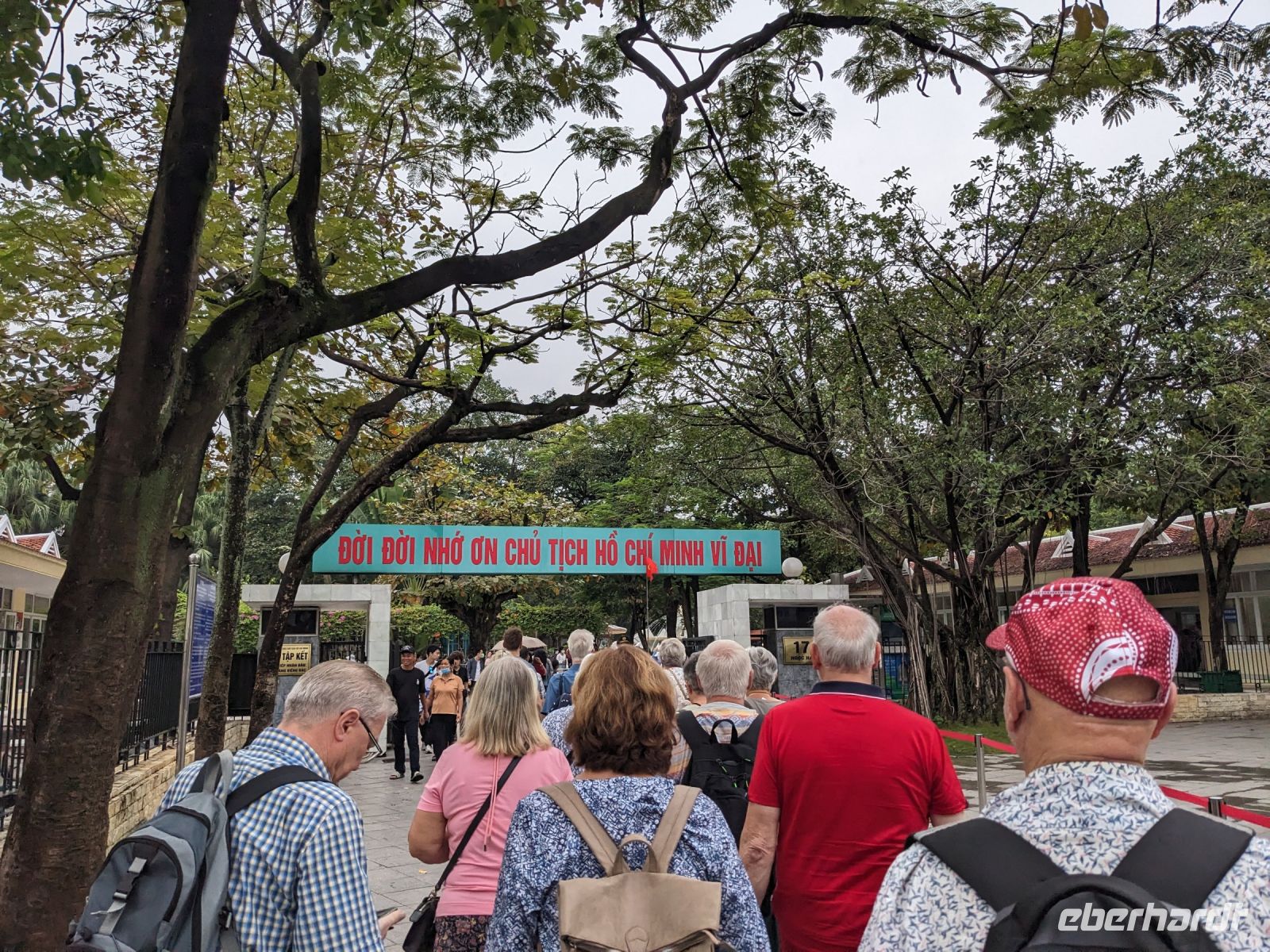 Schon früh am Morgen kamen wir in Hanoi an und fuhren zunächst erstmal zum Hotel, doch aufgrund der frühen Stunde waren unsere Zimmer noch nicht fertig und so machten wir uns nur kurz frisch und zogen dann los auf einen Stadtspaziergang. Noch leicht übermüdet von dem langen Flug kamen hier sehr viele Eindrücke zusammen: der Verkehr, die Wärme, die Gerüche - wo waren wir denn hier gelandet? Es musste also erstmal ein Eierkaffee, eine vietnamesische Spezialität, her. Am Hoan-Kiem-See dann ein Menschenauflauf - und alle in rot. Unser Reiseleiter Lang erklärte uns, dass hier gerade ein Festival stattfindet. In der Innenstadt bestand auch die Möglichkeit für diejenigen, die noch nicht Geld getauscht hatten, dies hier zu tun - als mehrfache Multimillionäre verließen wir dann die Wechselstube - ein schönes Gefühl. Zurück im Hotel blieb noch etwas Wartezeit und schließlich konnten wir unsere Zimmer beziehen - eine Wohltat nach der Anreise! Am Abend trafen wir uns zum Abendessen wieder und anschließend suchten wir noch eine Gasse auf. Aber keine gewöhnliche Gasse natürlich! Hier führten Bahnschienen entlang und bei einem Getränk im Namen von Eberhardt TRAVEL rauschte der Zug nur wenige Zentimeter an uns vorbei - eine unbeschreibliche Erfahrung und wäre hier in Deutschland auf jeden Fall niemals zulässig. Aber genau für solche Momente verreisen wir ja, nicht wahr?