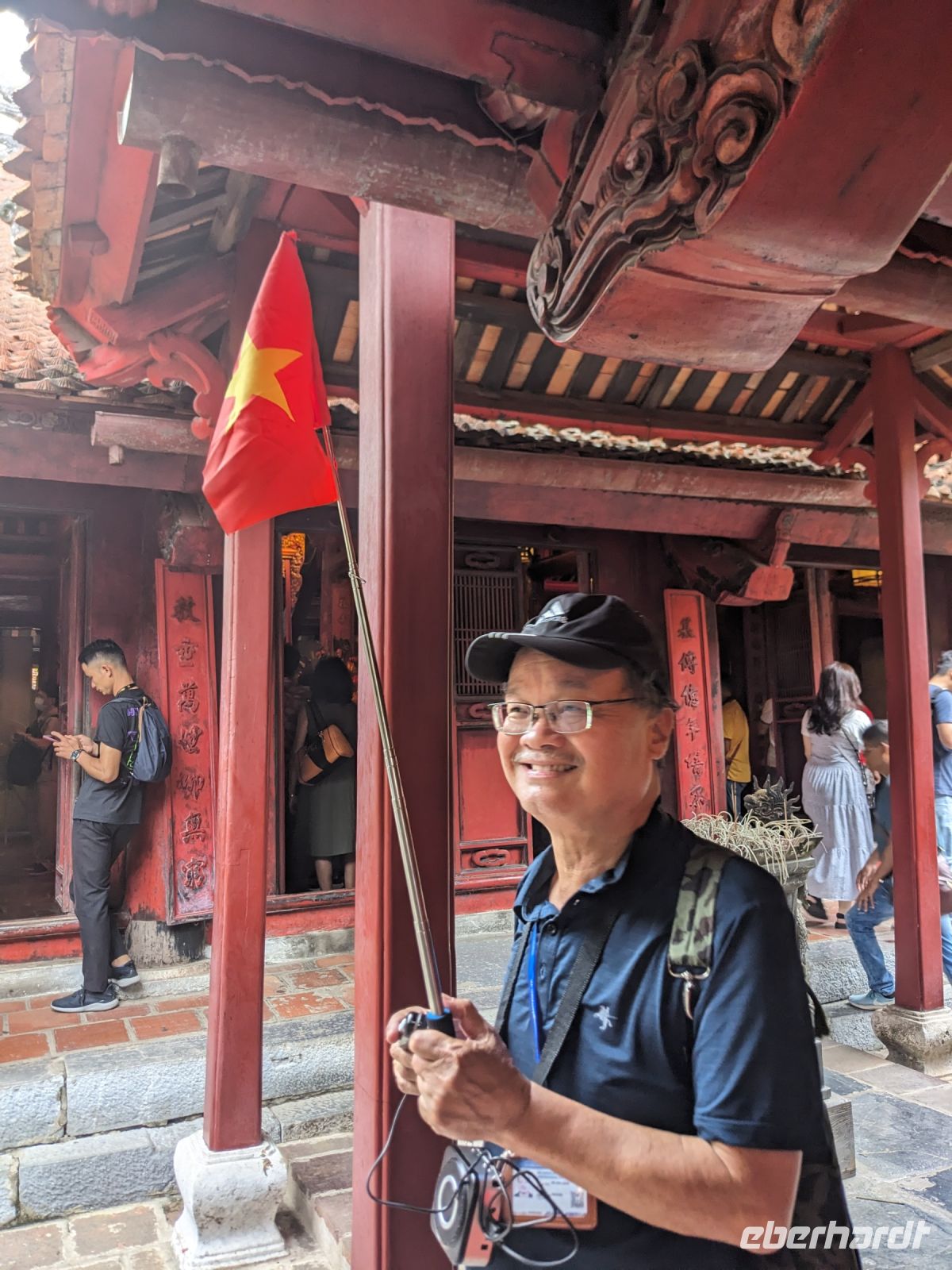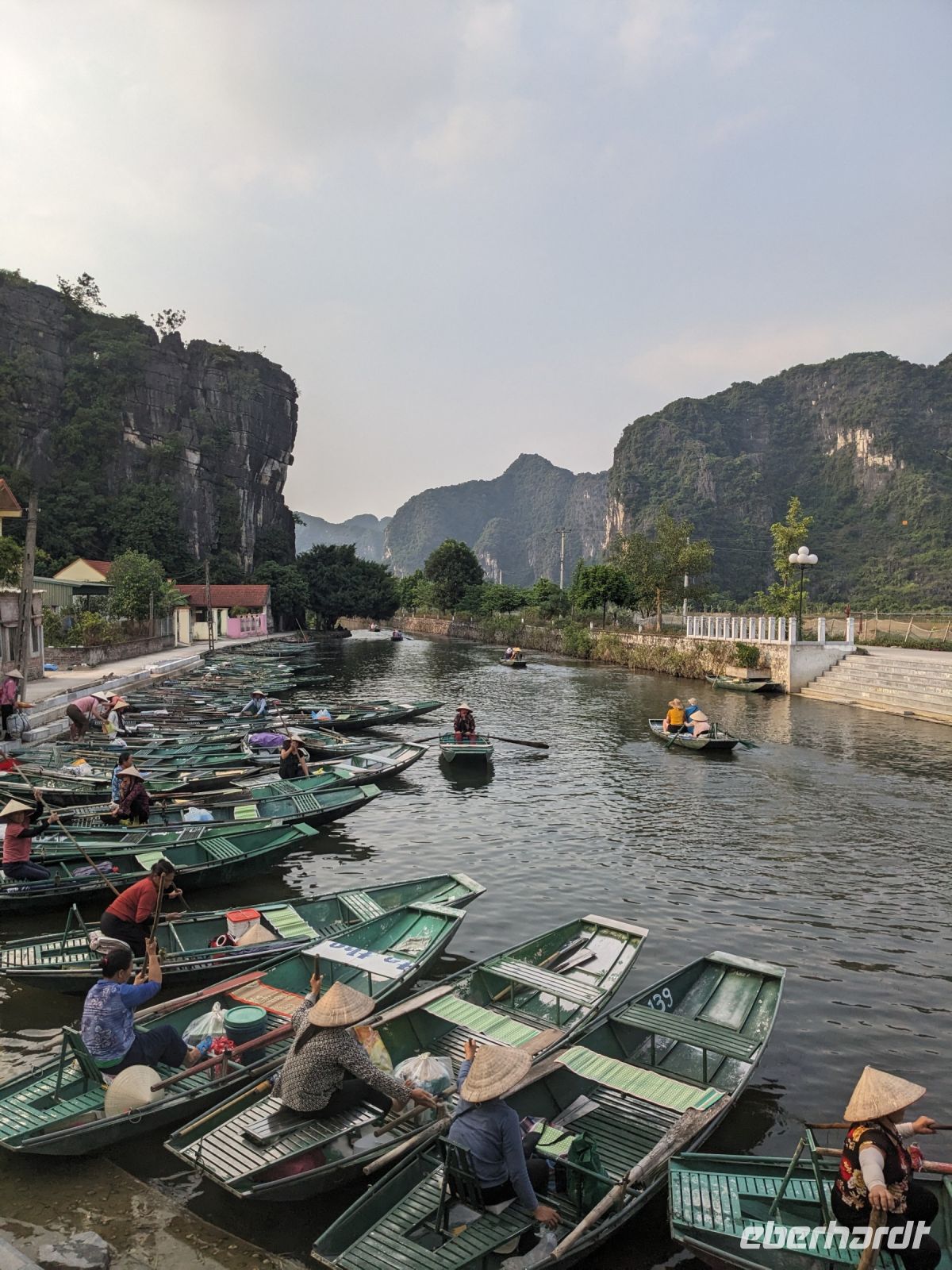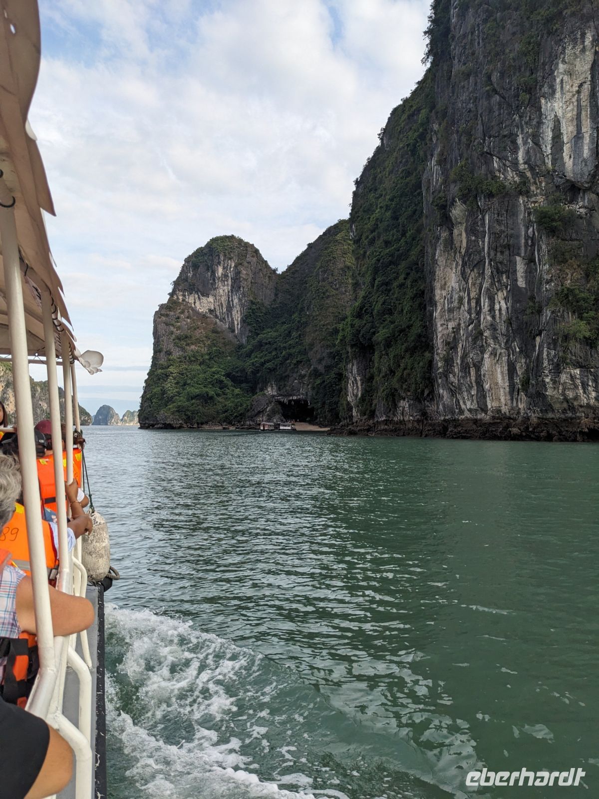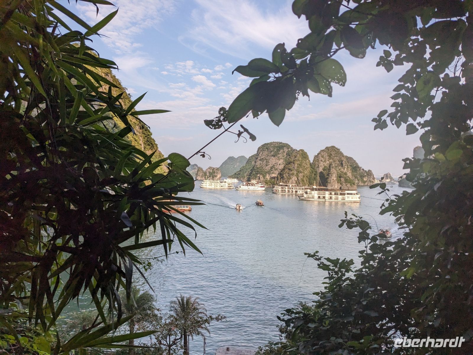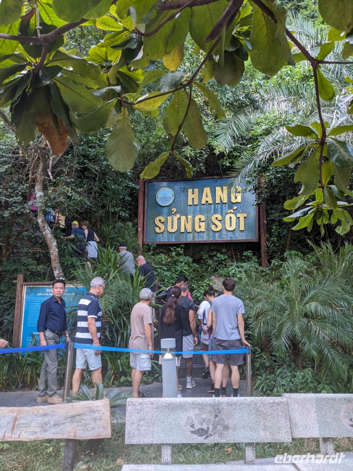 Schon früh am Morgen kamen wir in Hanoi an und fuhren zunächst erstmal zum Hotel, doch aufgrund der frühen Stunde waren unsere Zimmer noch nicht fertig und so machten wir uns nur kurz frisch und zogen dann los auf einen Stadtspaziergang. Noch leicht übermüdet von dem langen Flug kamen hier sehr viele Eindrücke zusammen: der Verkehr, die Wärme, die Gerüche - wo waren wir denn hier gelandet? Es musste also erstmal ein Eierkaffee, eine vietnamesische Spezialität, her. Am Hoan-Kiem-See dann ein Menschenauflauf - und alle in rot. Unser Reiseleiter Lang erklärte uns, dass hier gerade ein Festival stattfindet. In der Innenstadt bestand auch die Möglichkeit für diejenigen, die noch nicht Geld getauscht hatten, dies hier zu tun - als mehrfache Multimillionäre verließen wir dann die Wechselstube - ein schönes Gefühl. Zurück im Hotel blieb noch etwas Wartezeit und schließlich konnten wir unsere Zimmer beziehen - eine Wohltat nach der Anreise! Am Abend trafen wir uns zum Abendessen wieder und anschließend suchten wir noch eine Gasse auf. Aber keine gewöhnliche Gasse natürlich! Hier führten Bahnschienen entlang und bei einem Getränk im Namen von Eberhardt TRAVEL rauschte der Zug nur wenige Zentimeter an uns vorbei - eine unbeschreibliche Erfahrung und wäre hier in Deutschland auf jeden Fall niemals zulässig. Aber genau für solche Momente verreisen wir ja, nicht wahr?